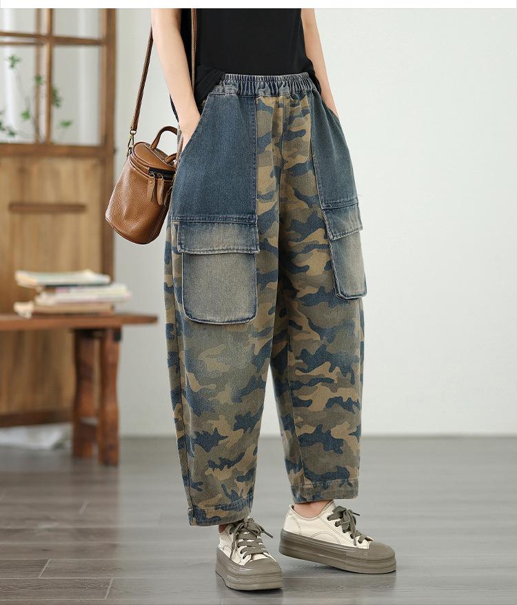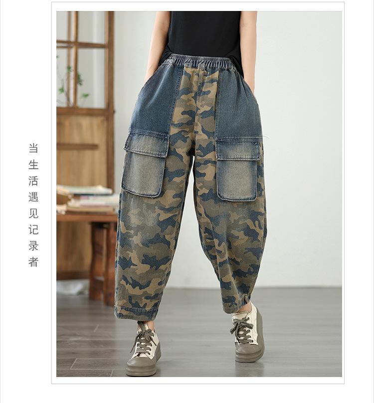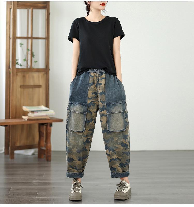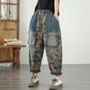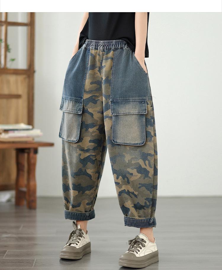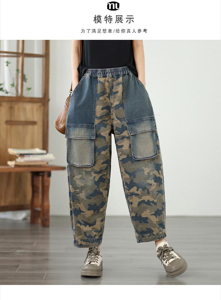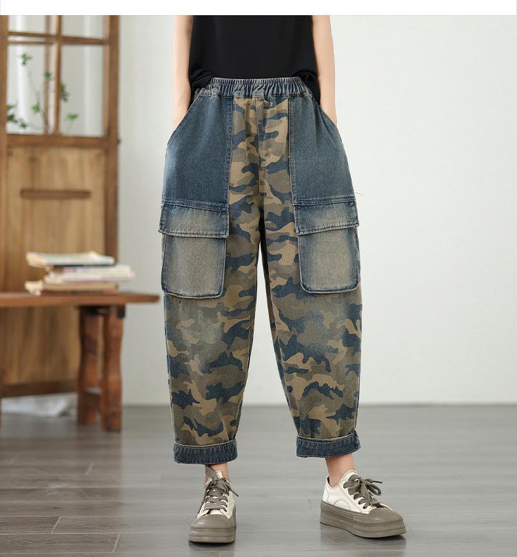 Pantalones Harem de Mezclilla de Talla Grande en Stock Color Camuflaje Bloque de Color Multibolsillos Cintura Elástica
