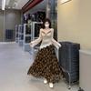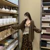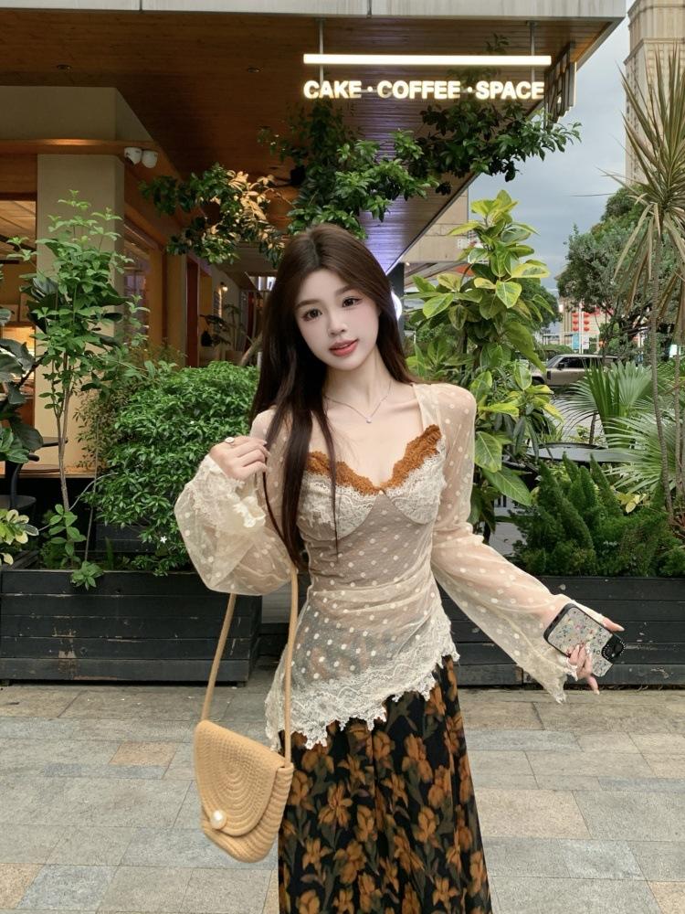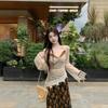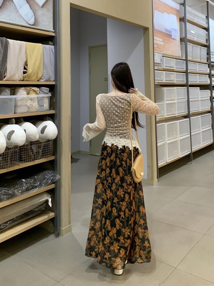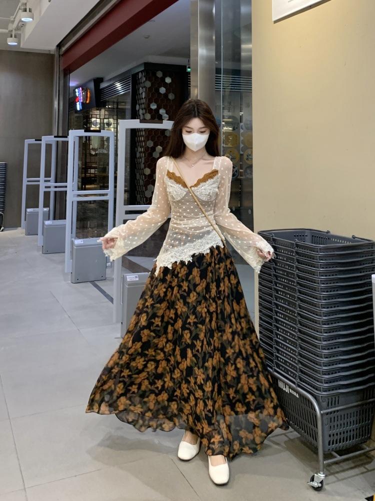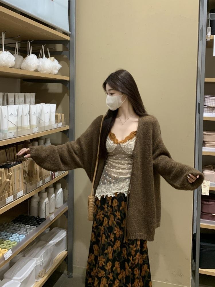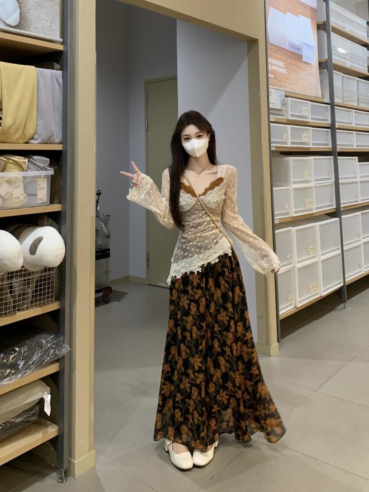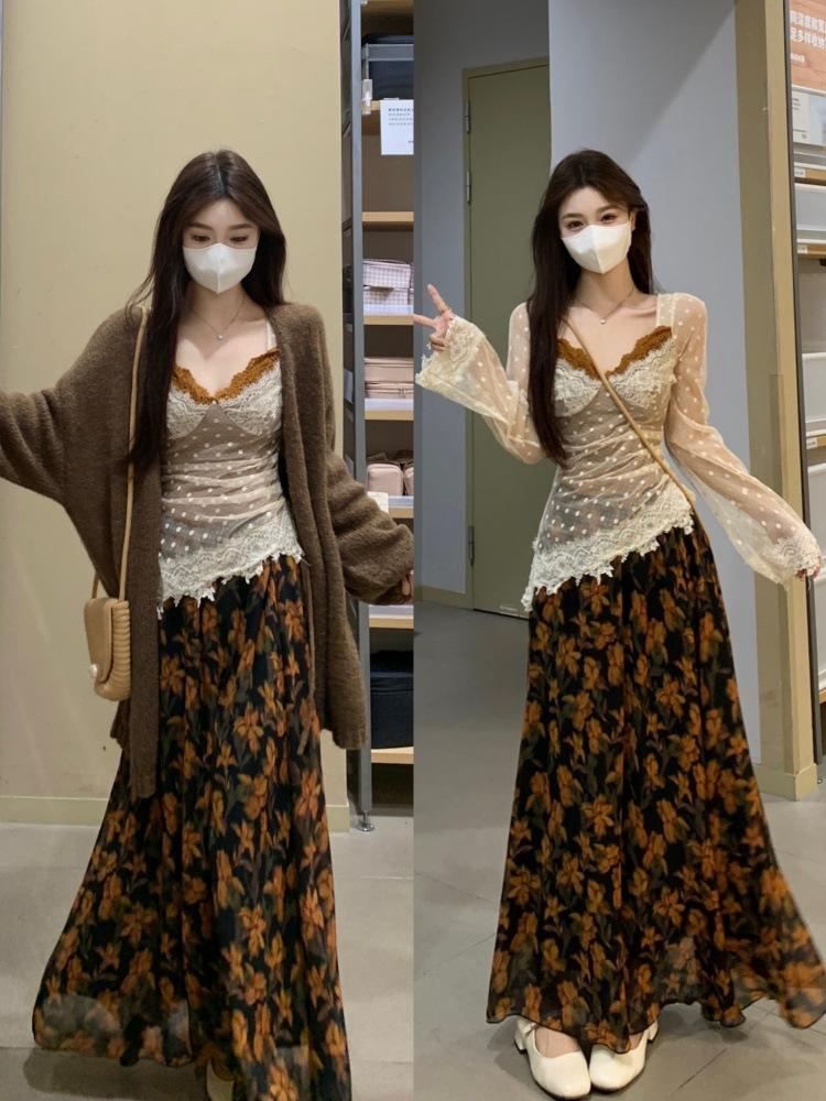 Cárdigan suéter de diseño nuevo Otoño/Invierno 2025 + Top de manga larga de encaje de imitación de dos piezas + Conjunto de falda midi estampada floral