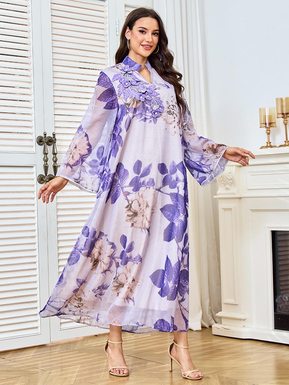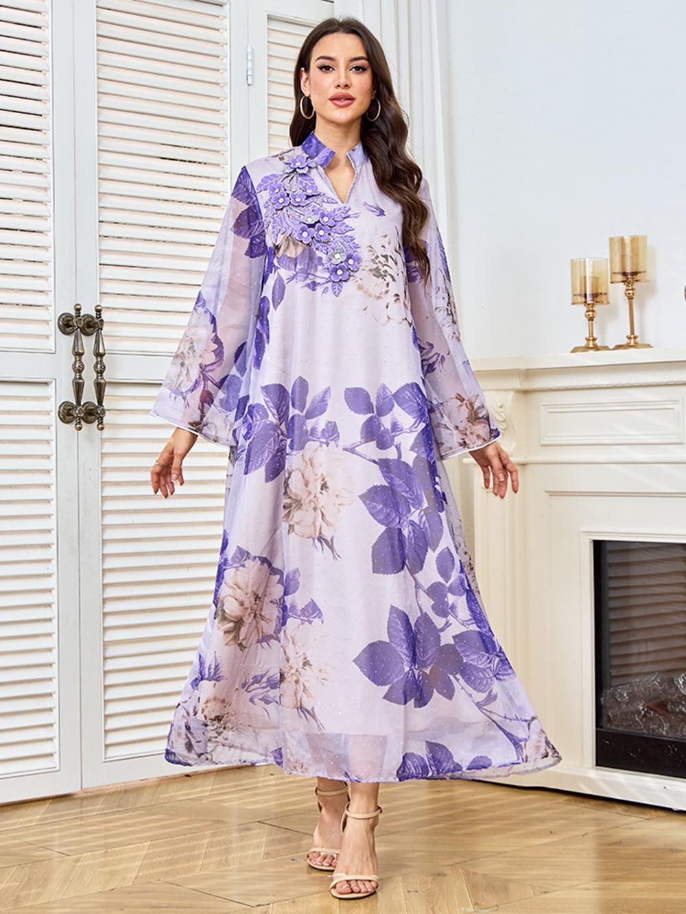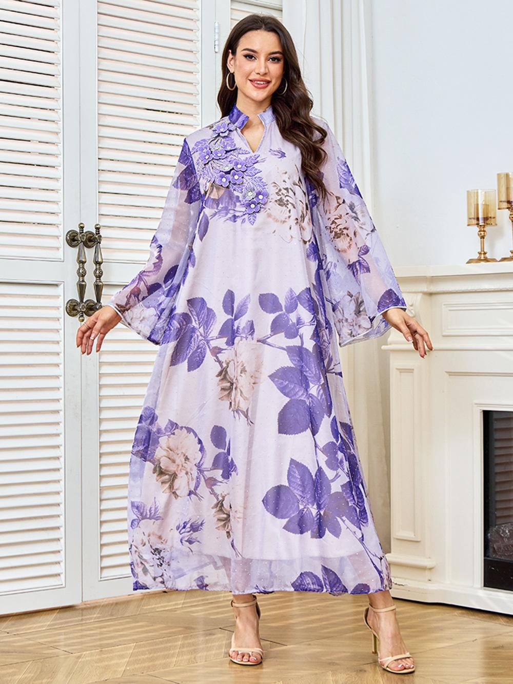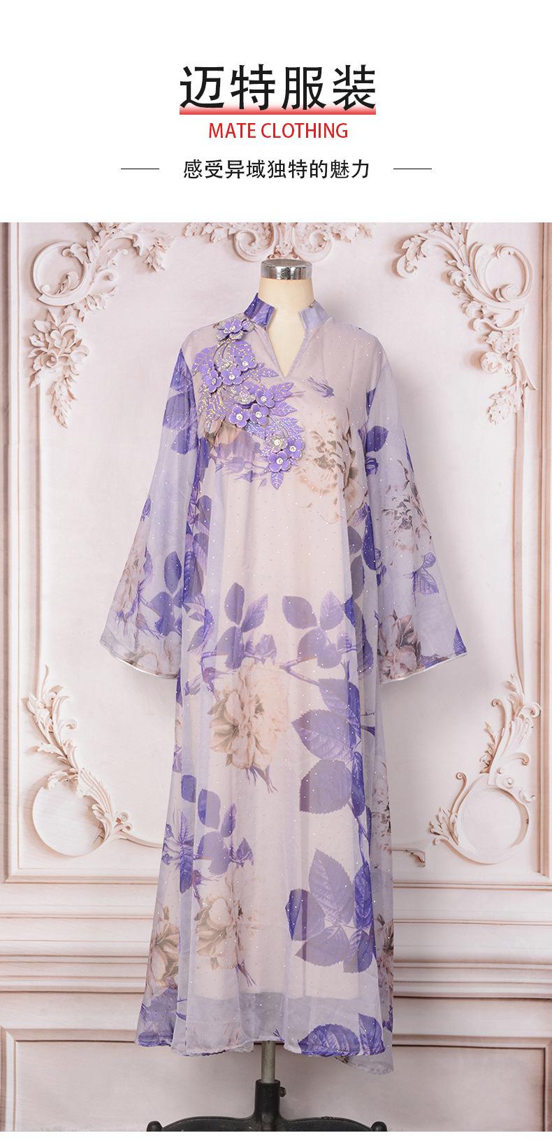 Comercio transfronterizo de Medio Oriente Bata musulmana de Dubái Moda Cuello en V Morado Elegante Vestido con pedrería caliente Ropa de mujer Vestido largo