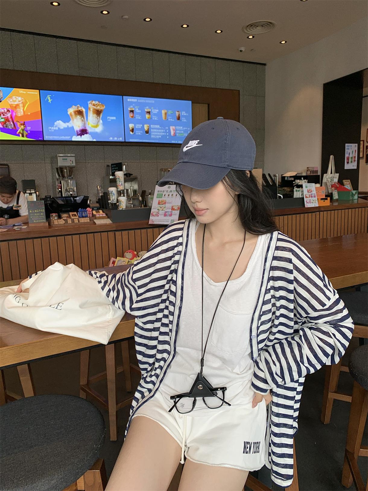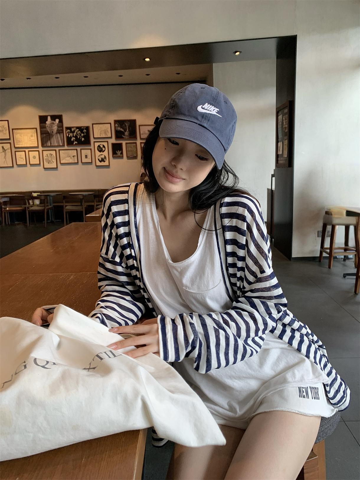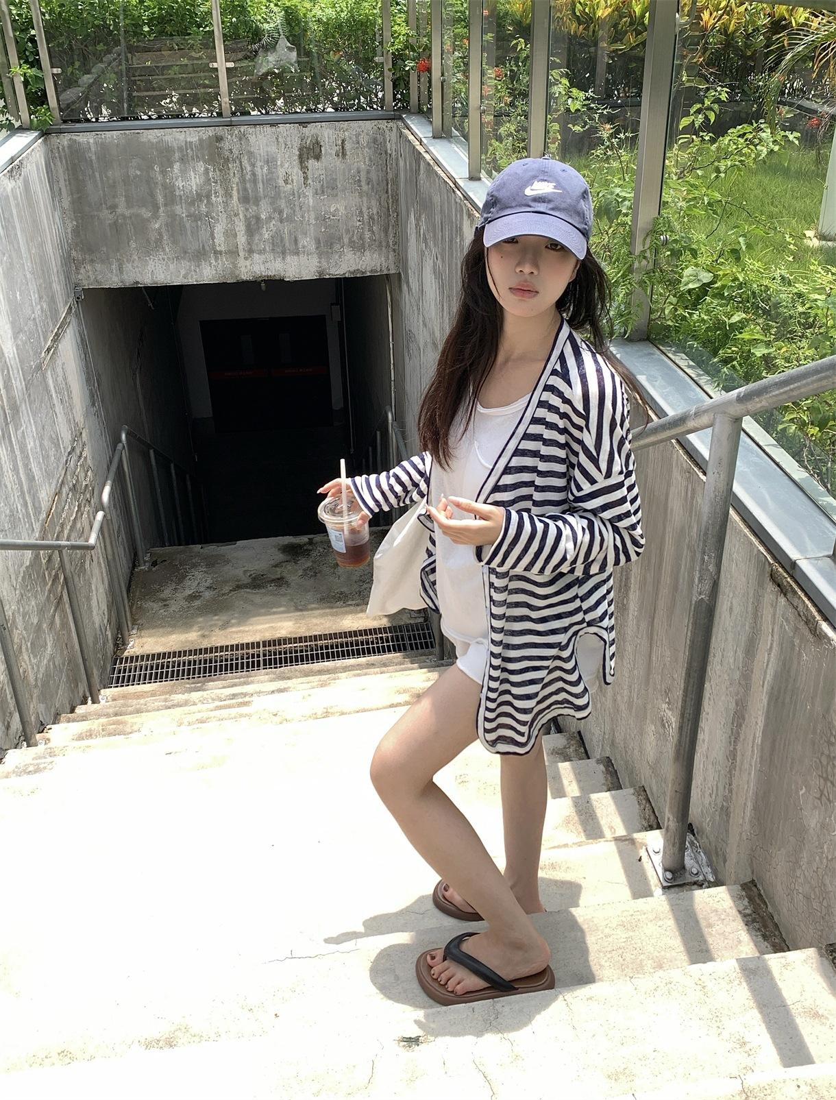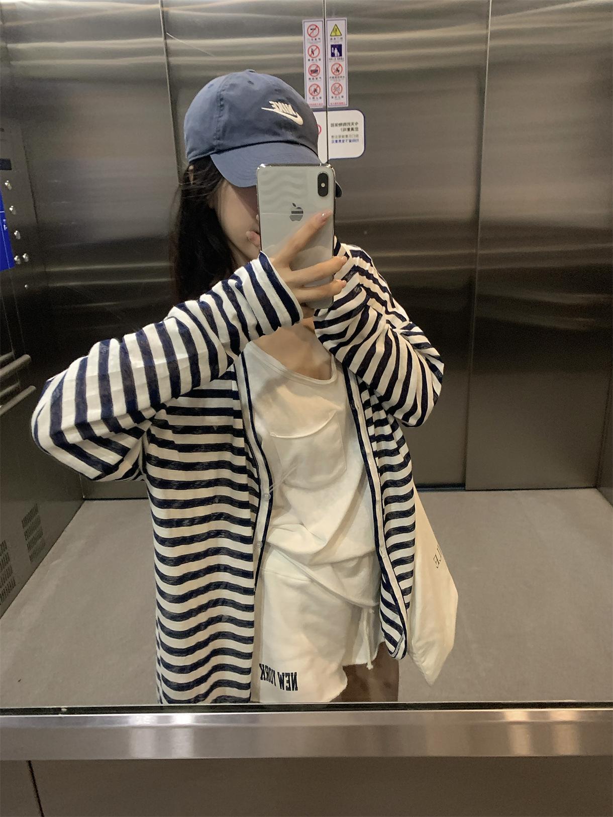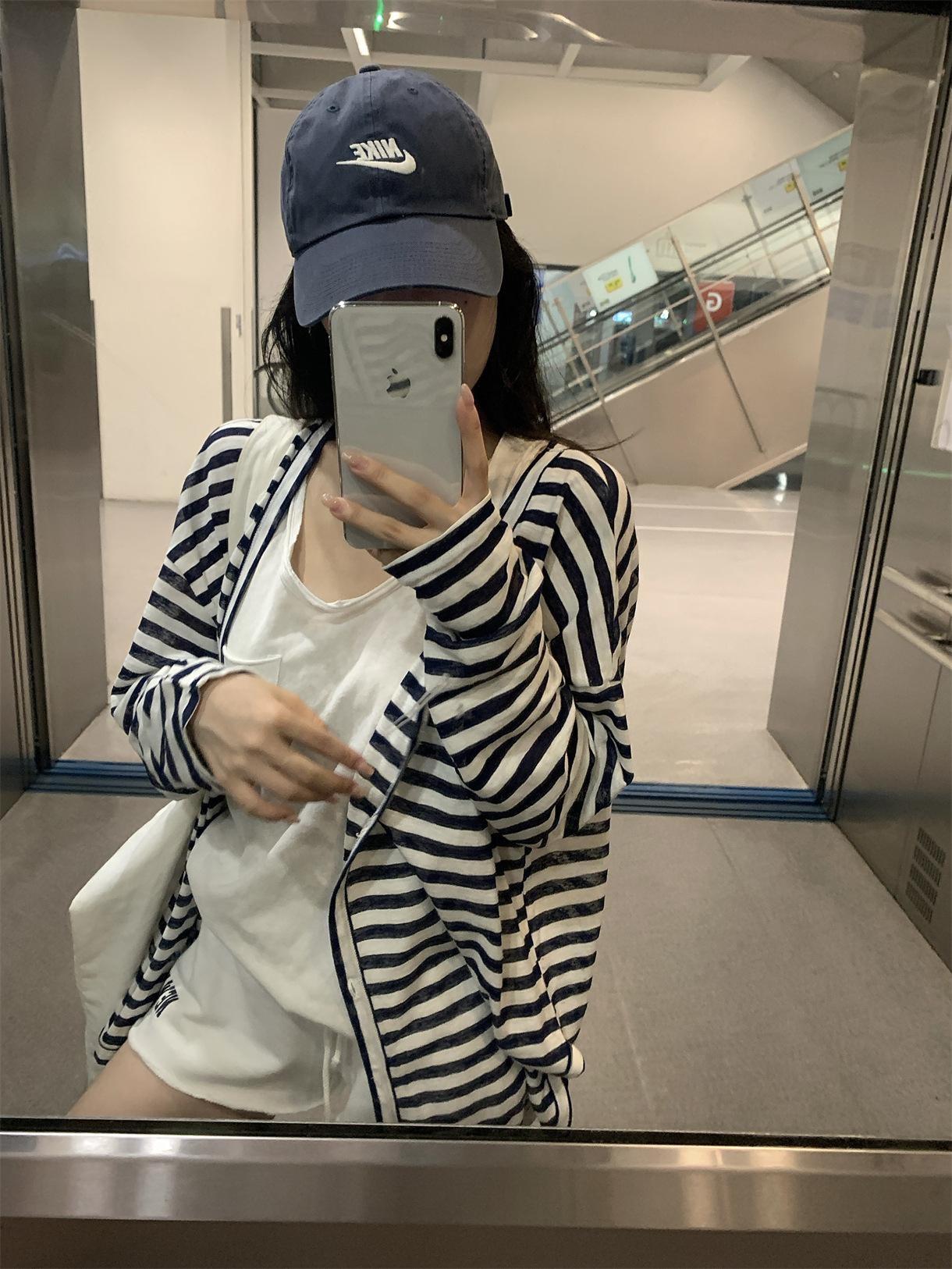Cárdigan Casual Holgado Adelgazante Estilo Perezoso Protección Solar Manga Larga Primavera Otoño Diseño de Rayas con Bloque de Color Top Versátil Mujeres ins
