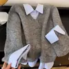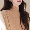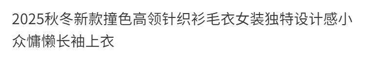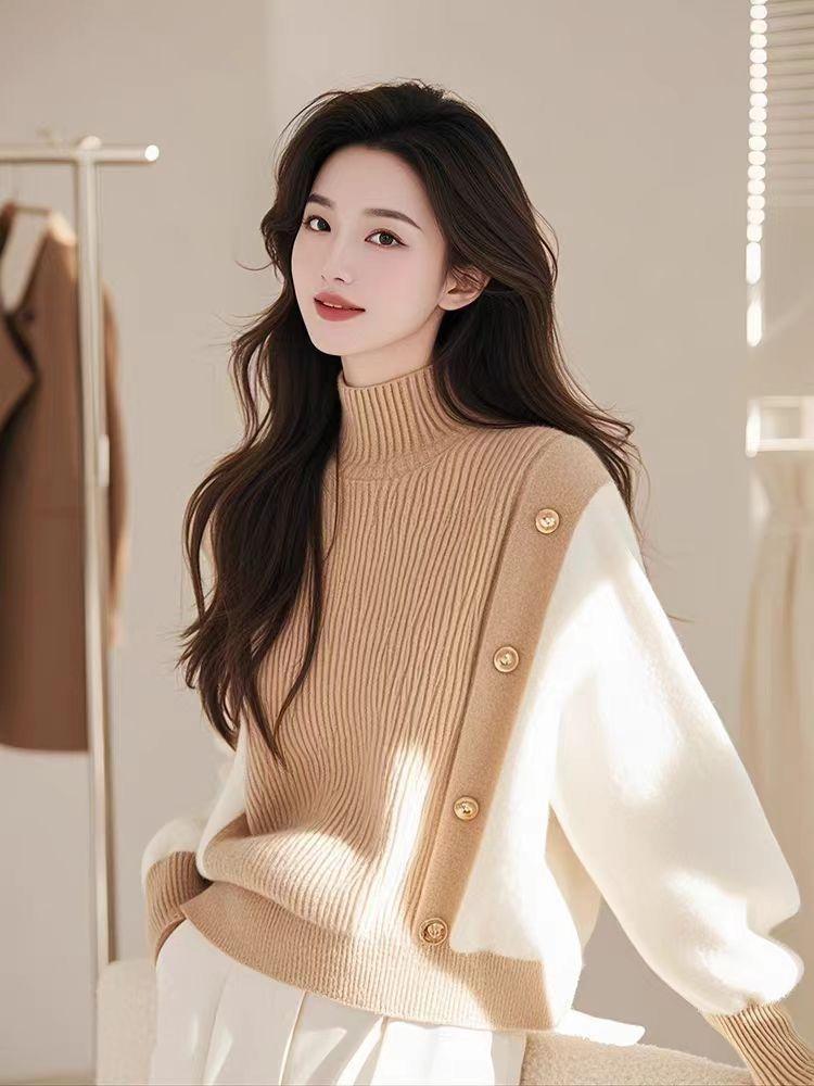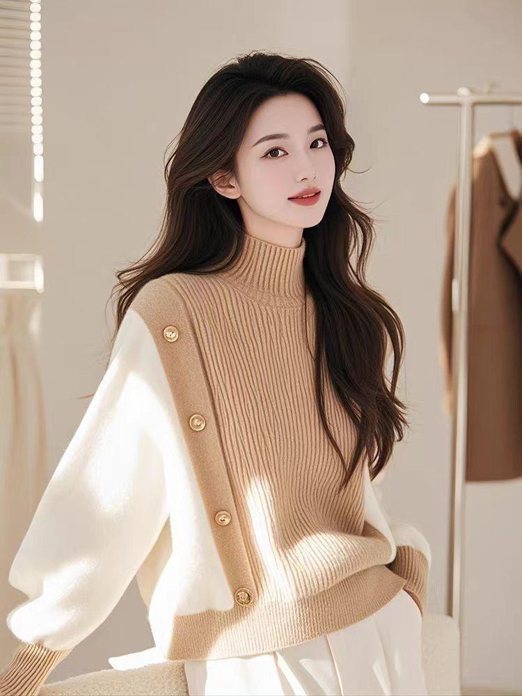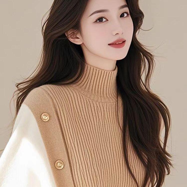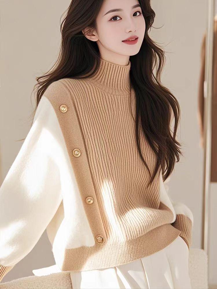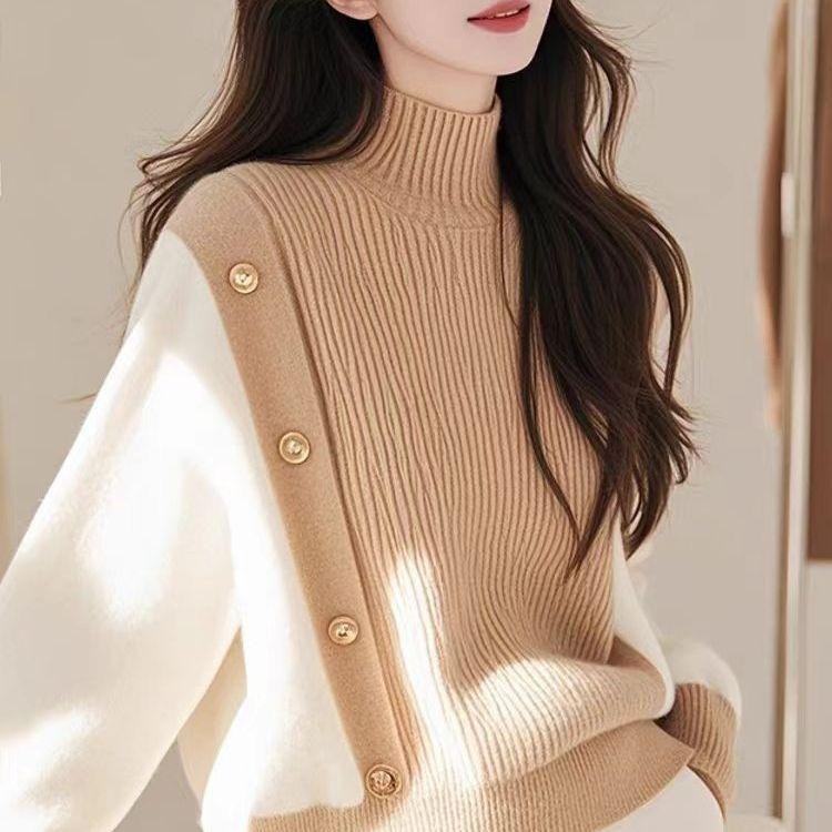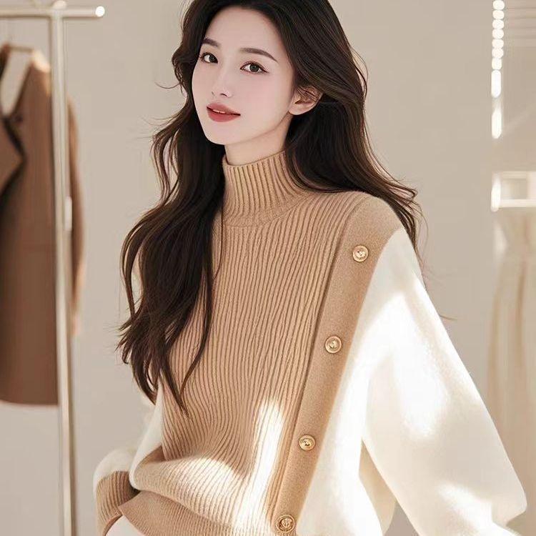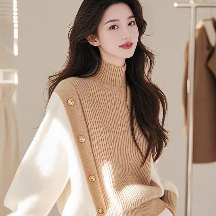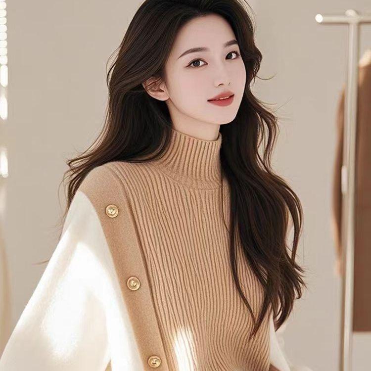 Suéter de Punto de Cuello Alto con Bloque de Color Nuevo Otoño/Invierno 2025 para Mujer Diseño Único Niche Holgado Manga Larga
