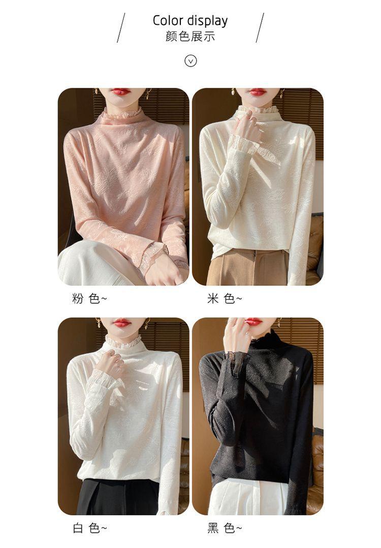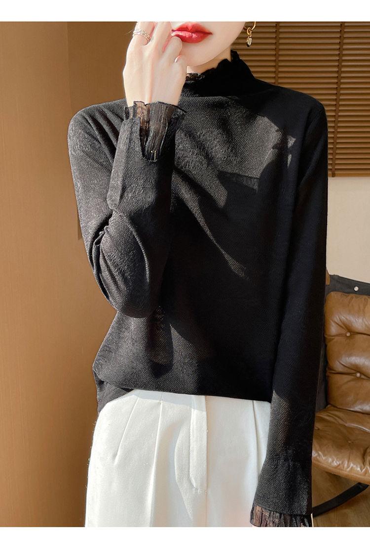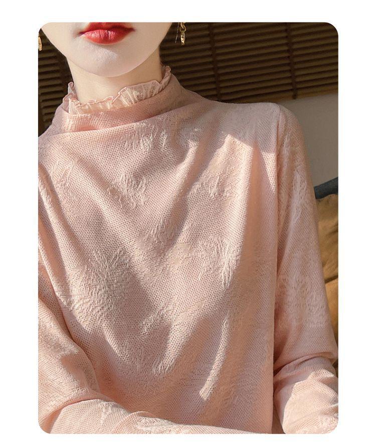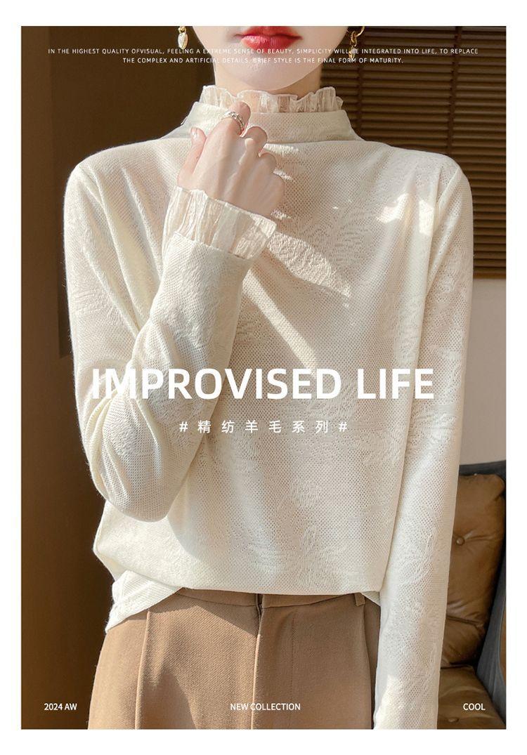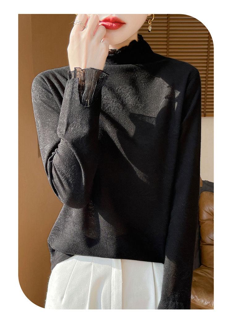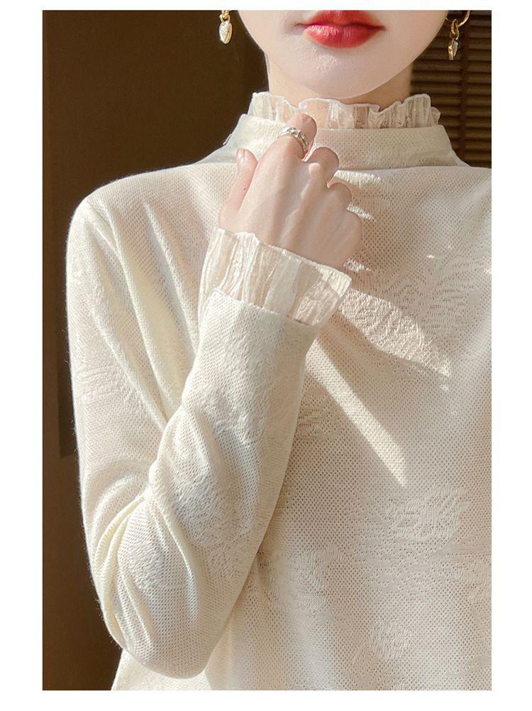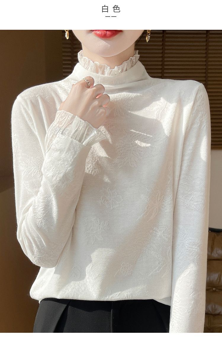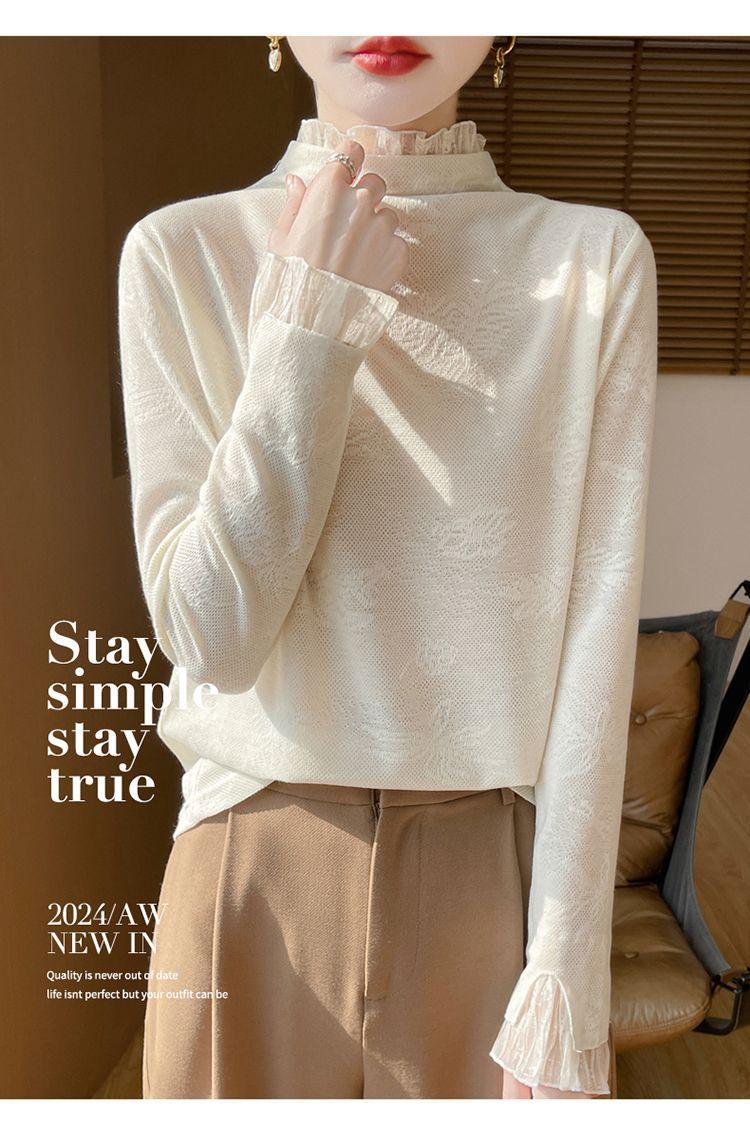 Nueva Primavera y Otoño Elegante Camisa Básica con Dobladillo de Volantes para Mujer Top Tejido Calado Suave de Alta Gama Reductor de Edad Adelgazante Manga Larga