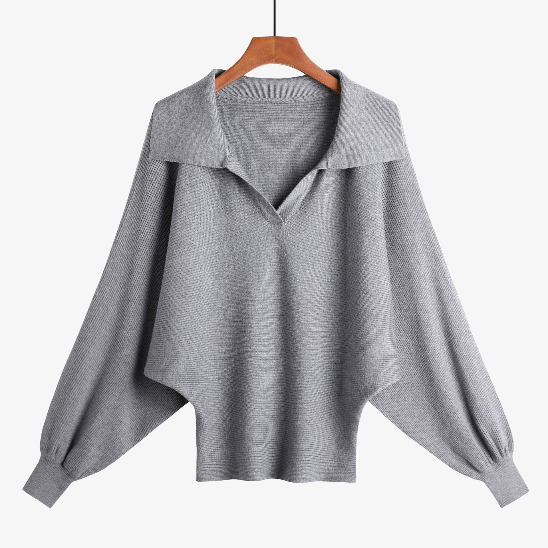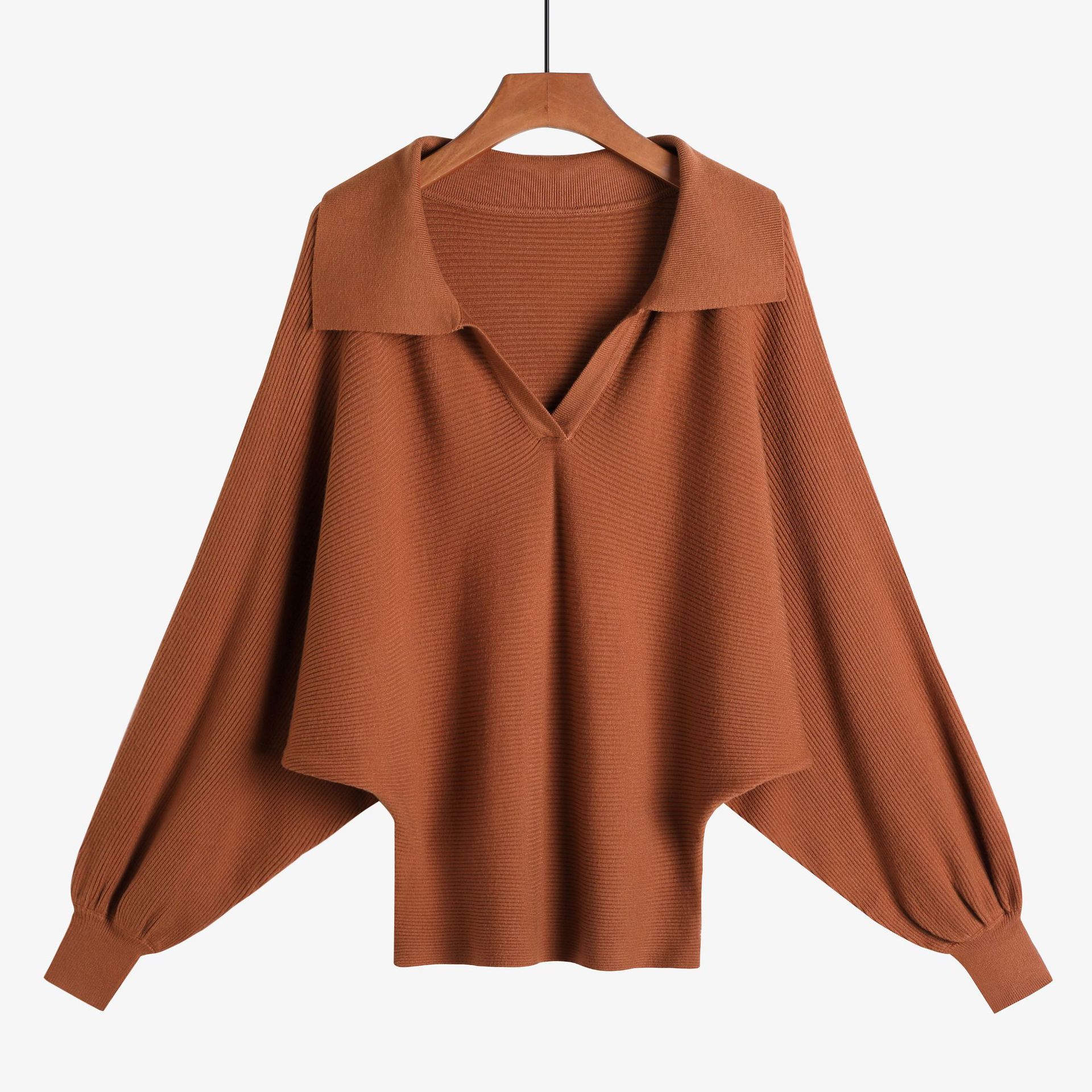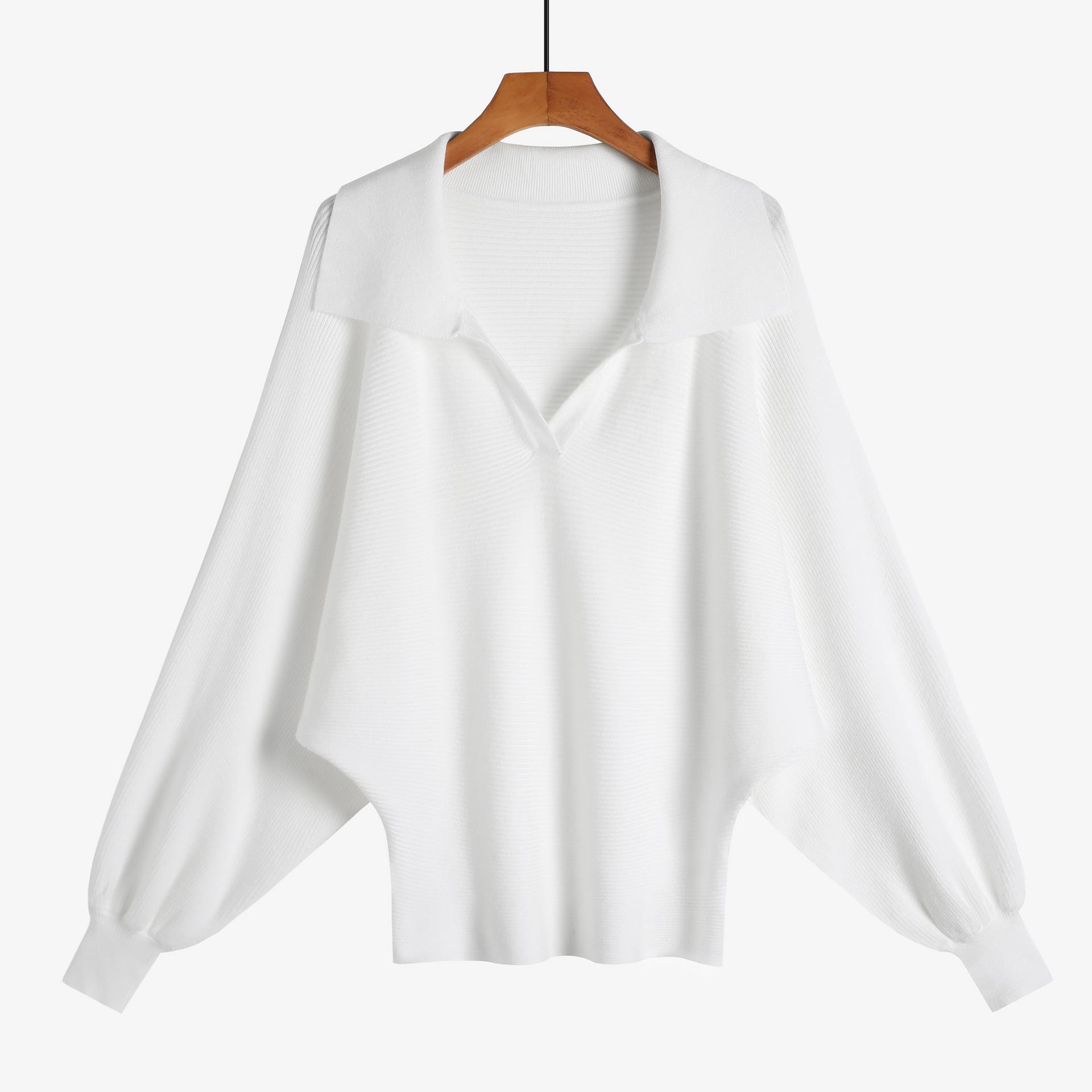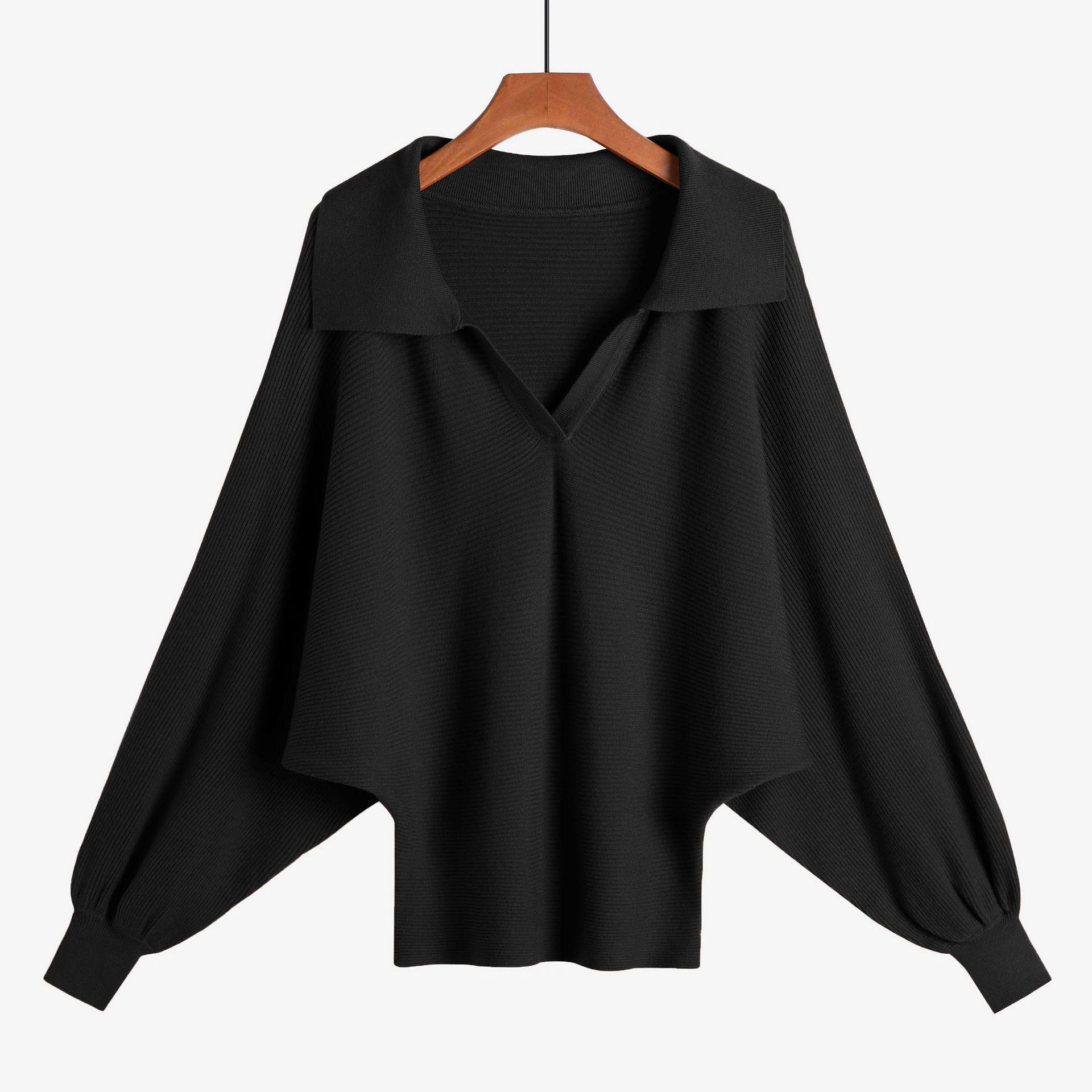 Suéter de Color Sólido Europeo y Americano Otoño/Invierno 2025 para Mujer, Suelto, Tejido, Manga Linterna, Cuello Polo, Talla Grande, Suéter Murciélago