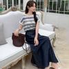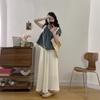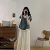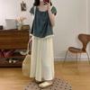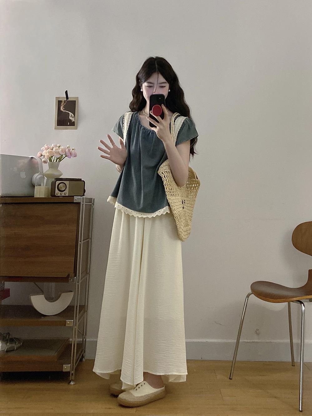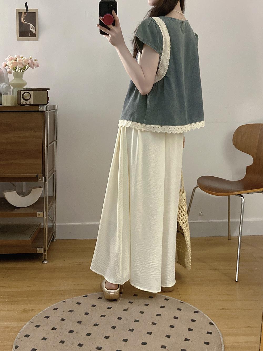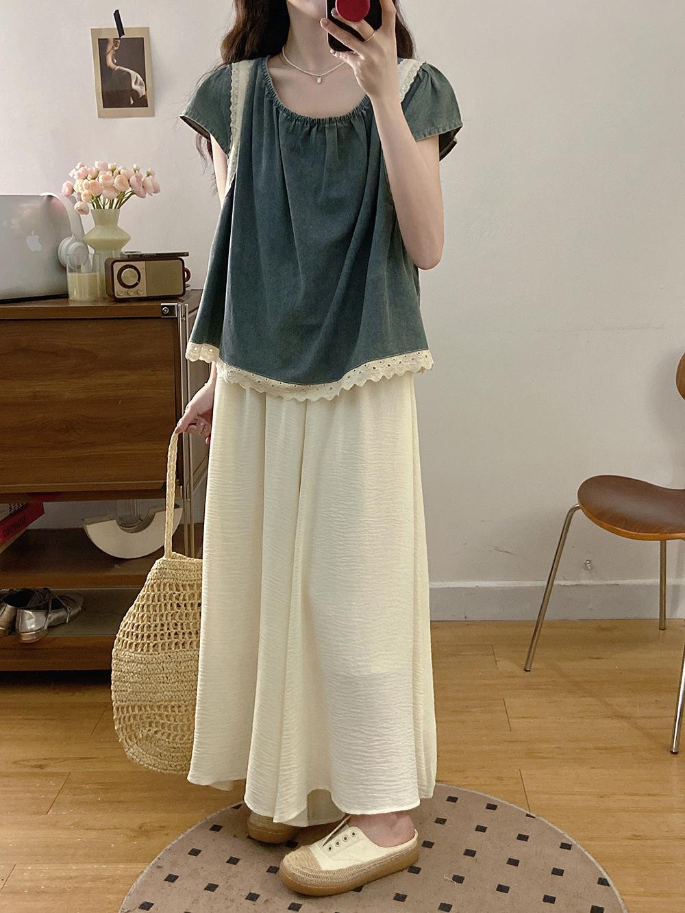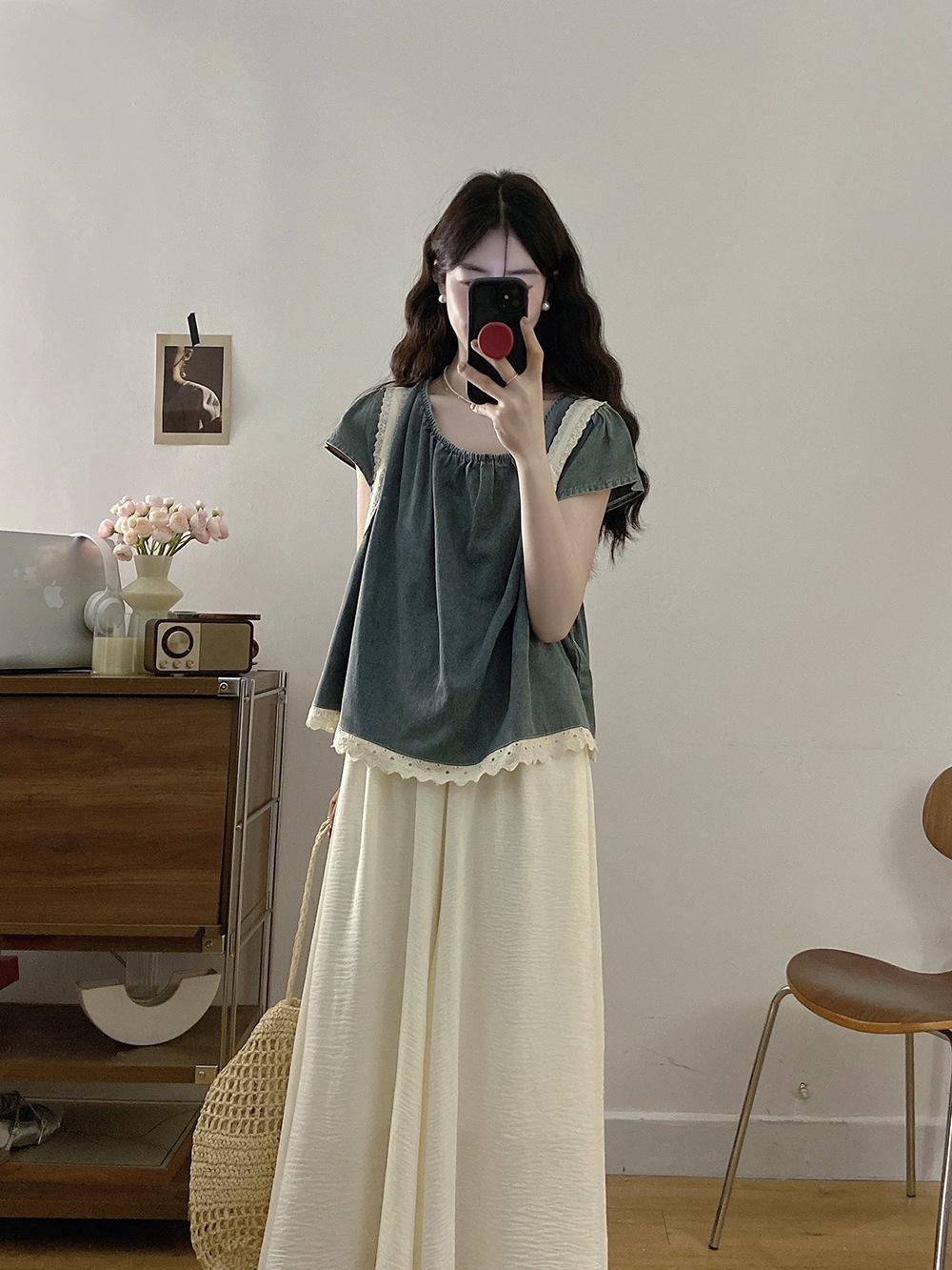 Top de Manga Corta de Mezclilla con Encaje Retro de Verano 2025 + Pantalones de Pierna Ancha y Falda Conjunto de Dos Piezas