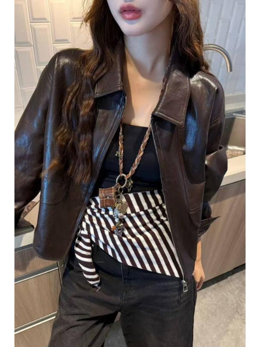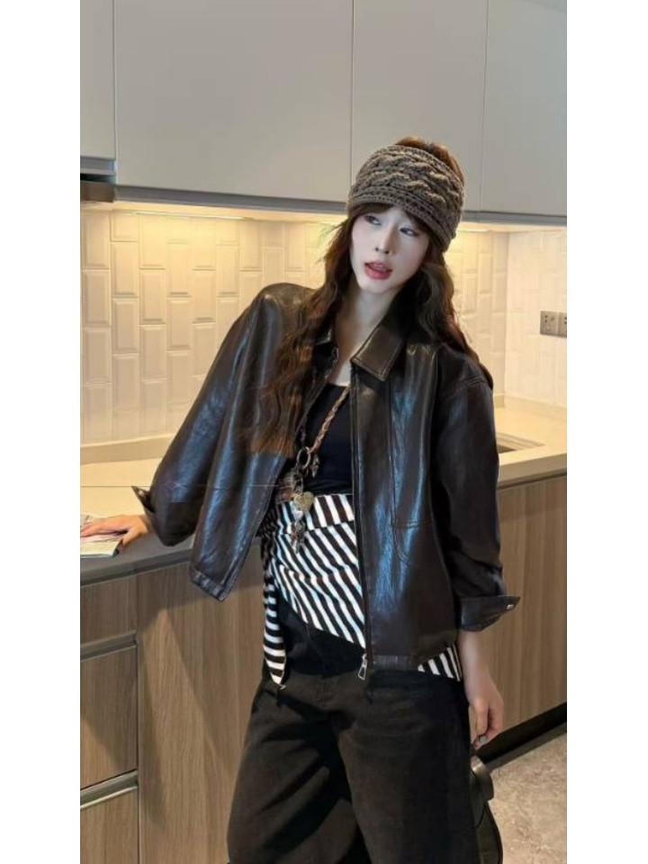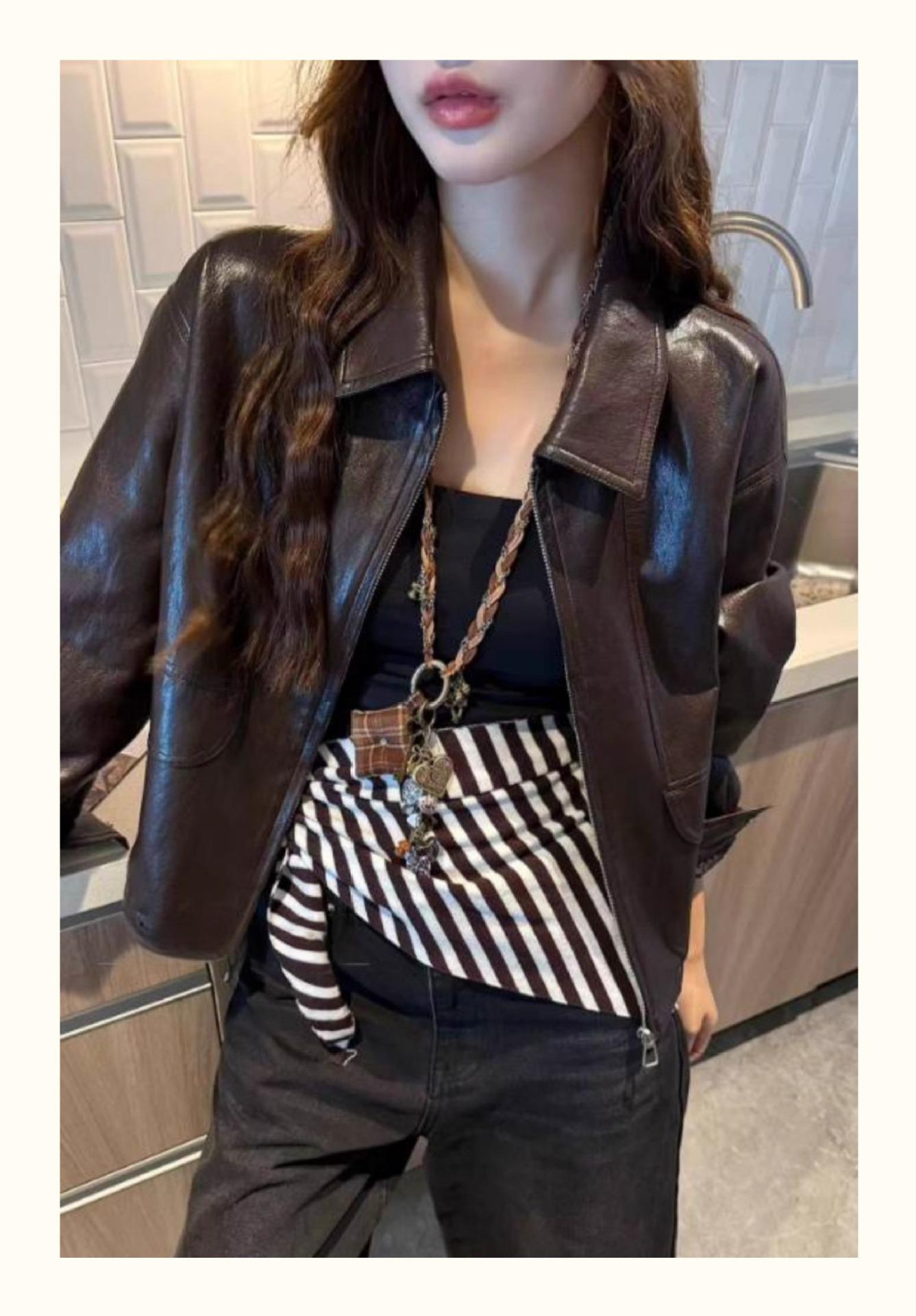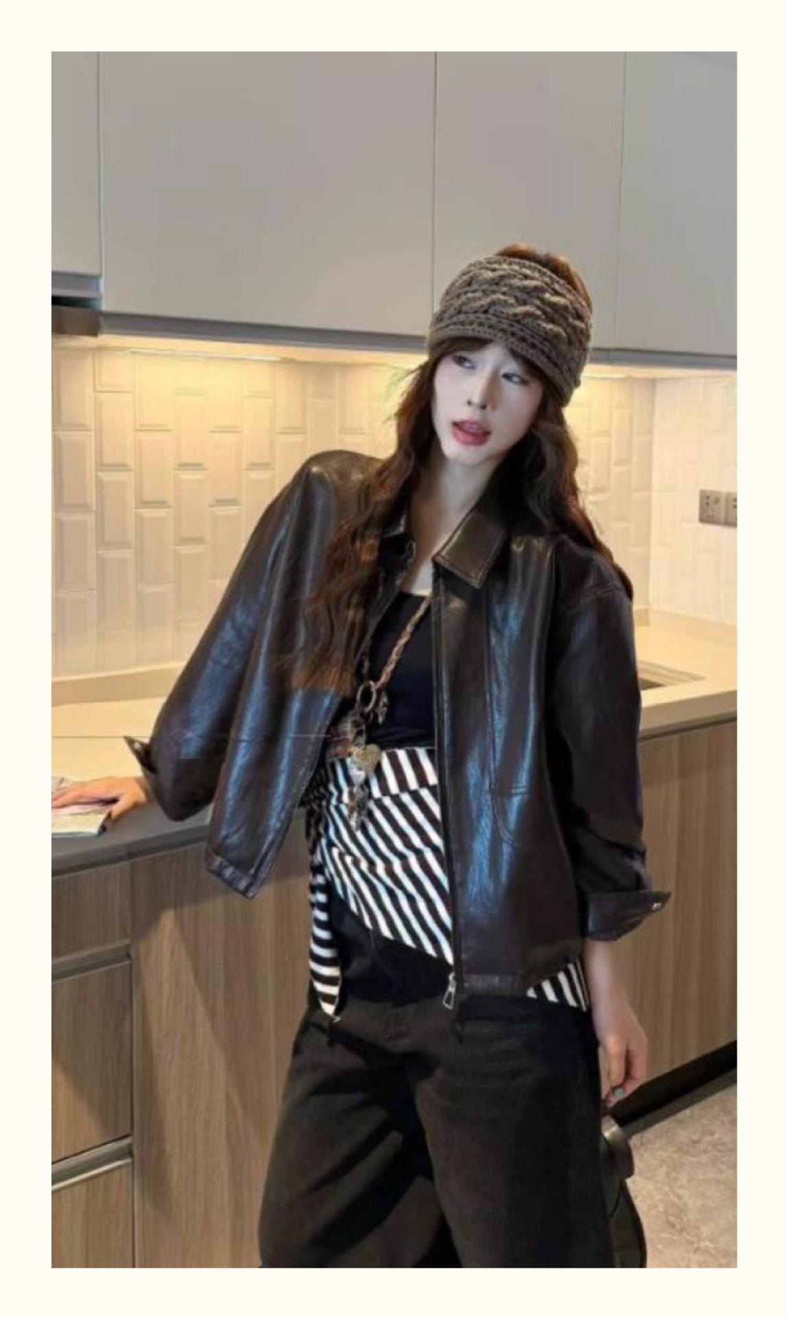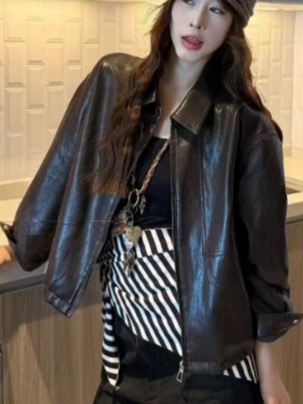 Chaqueta Corta de Cuero Retro Estilo Coreano Abrigo Mujer 2025 Otoño Nuevo Casual Temperamento Manga Larga Cuero PU Chaqueta de Motociclista Mujer