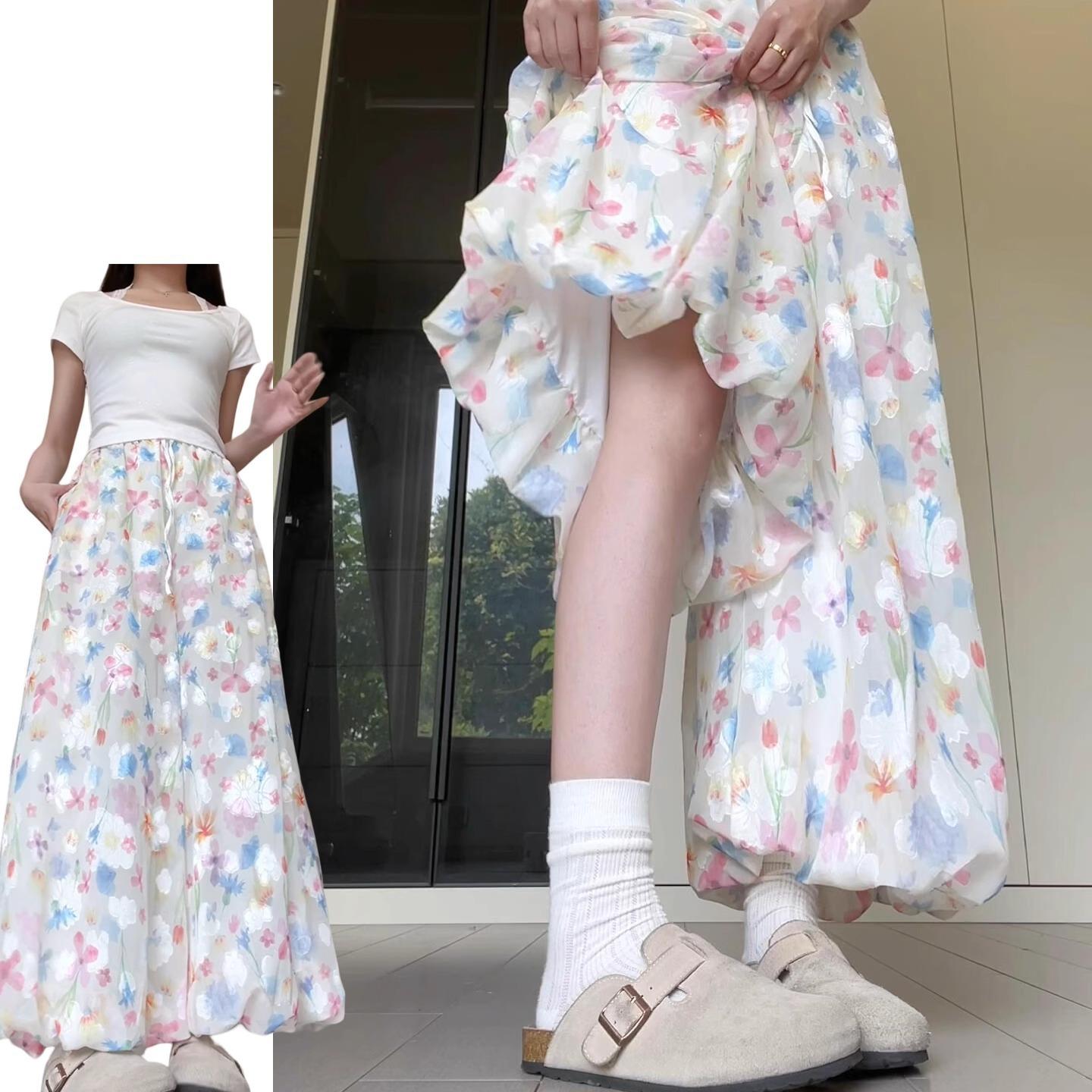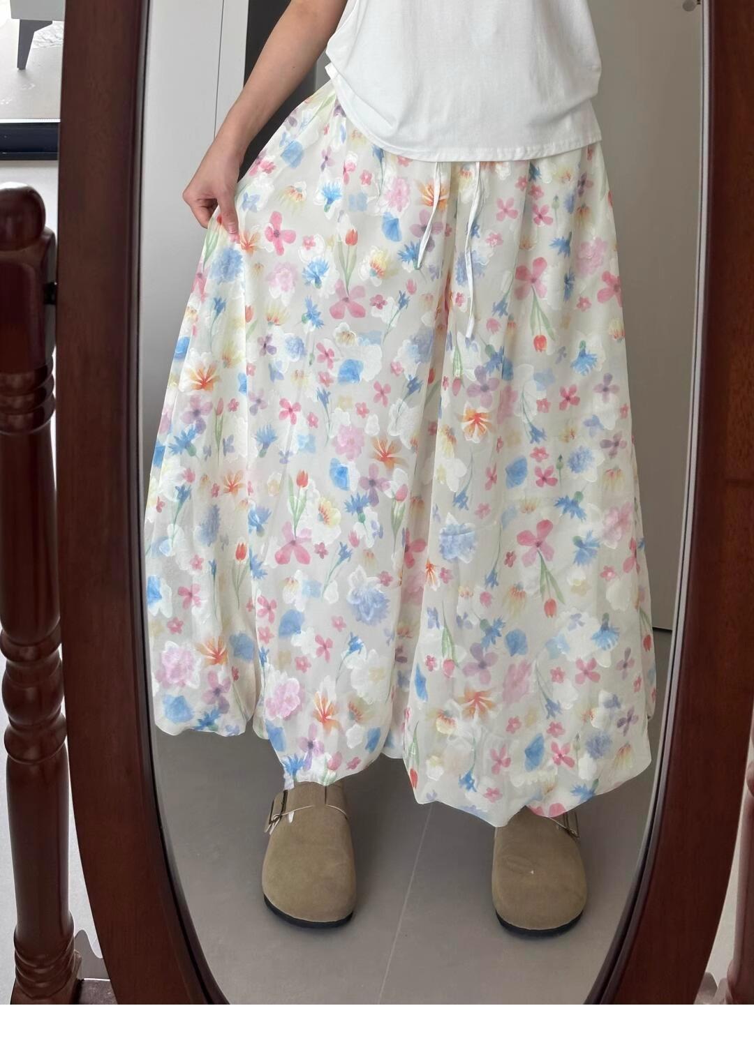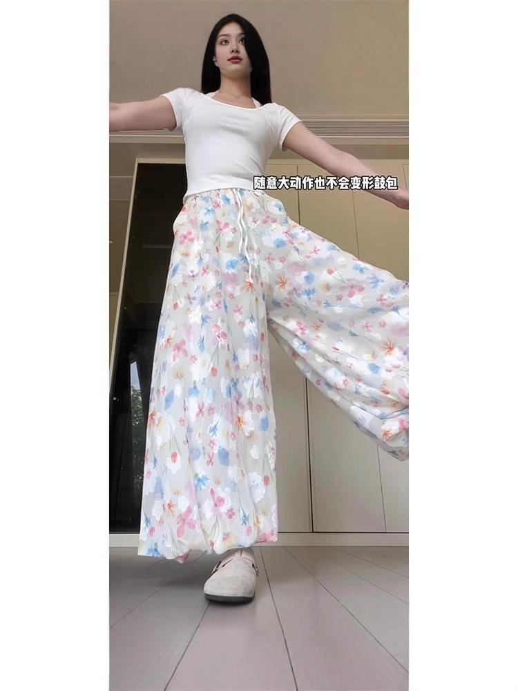 Pantalones florales tipo tulipán estilo coreano para mujer 2025 verano nuevo diseño para persona pequeña sentido suelto drapeado casual pantalones de pierna ancha