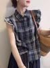 Camisa a cuadros con mangas pequeñas voladoras para mujer, Verano 2025 Nuevo cuello polo francés, Top único y hermoso de alta gama