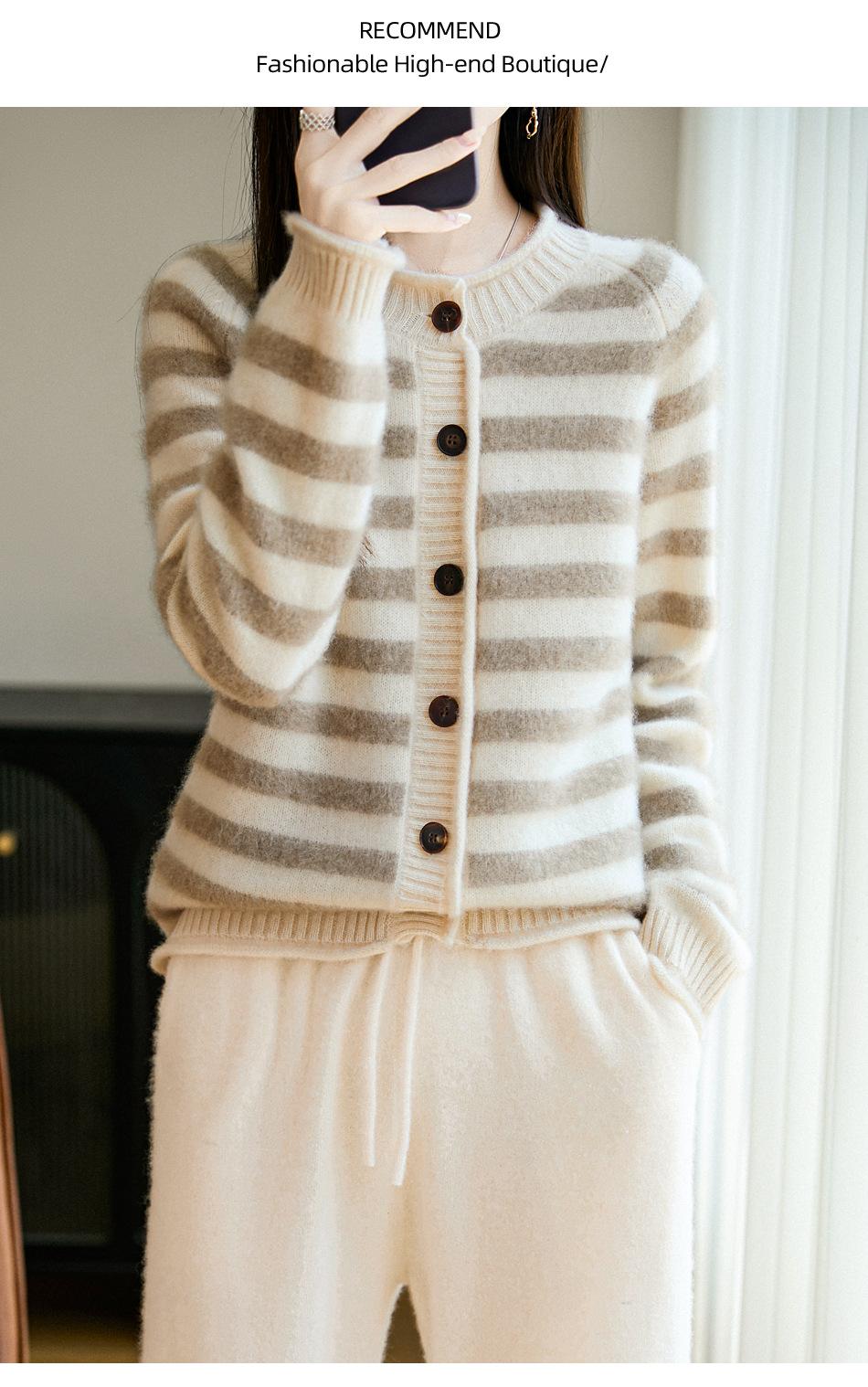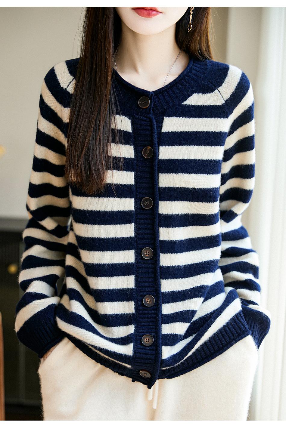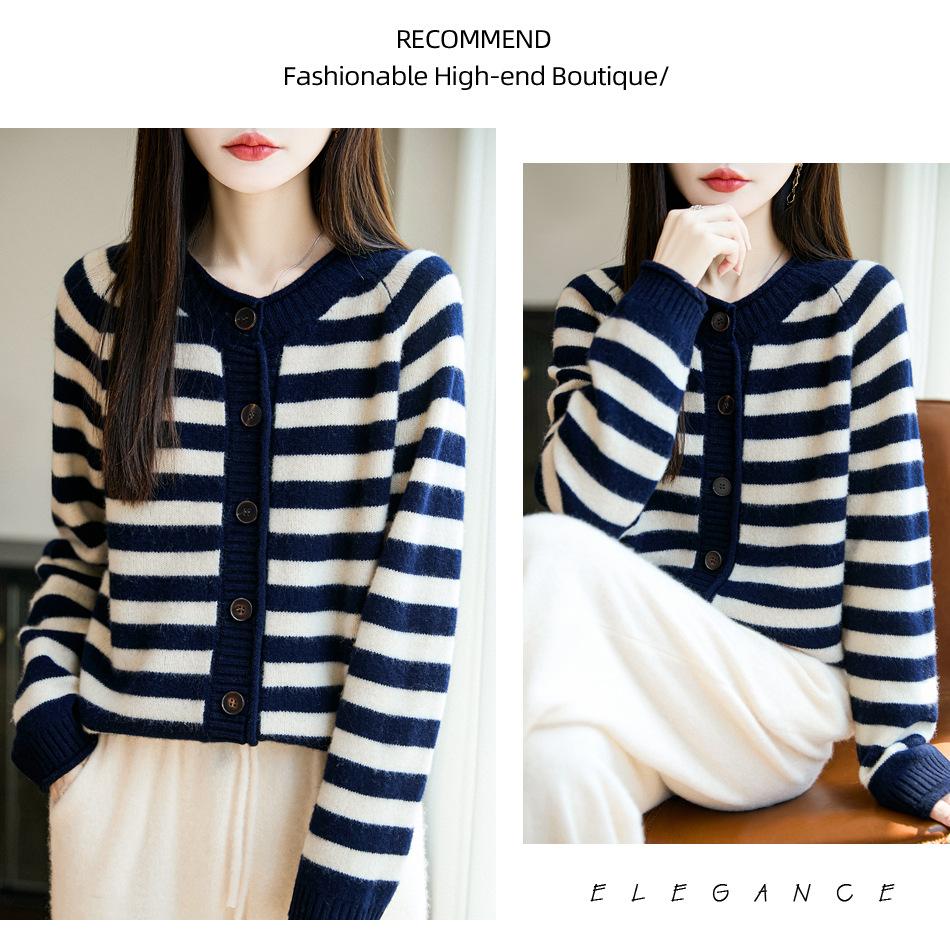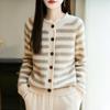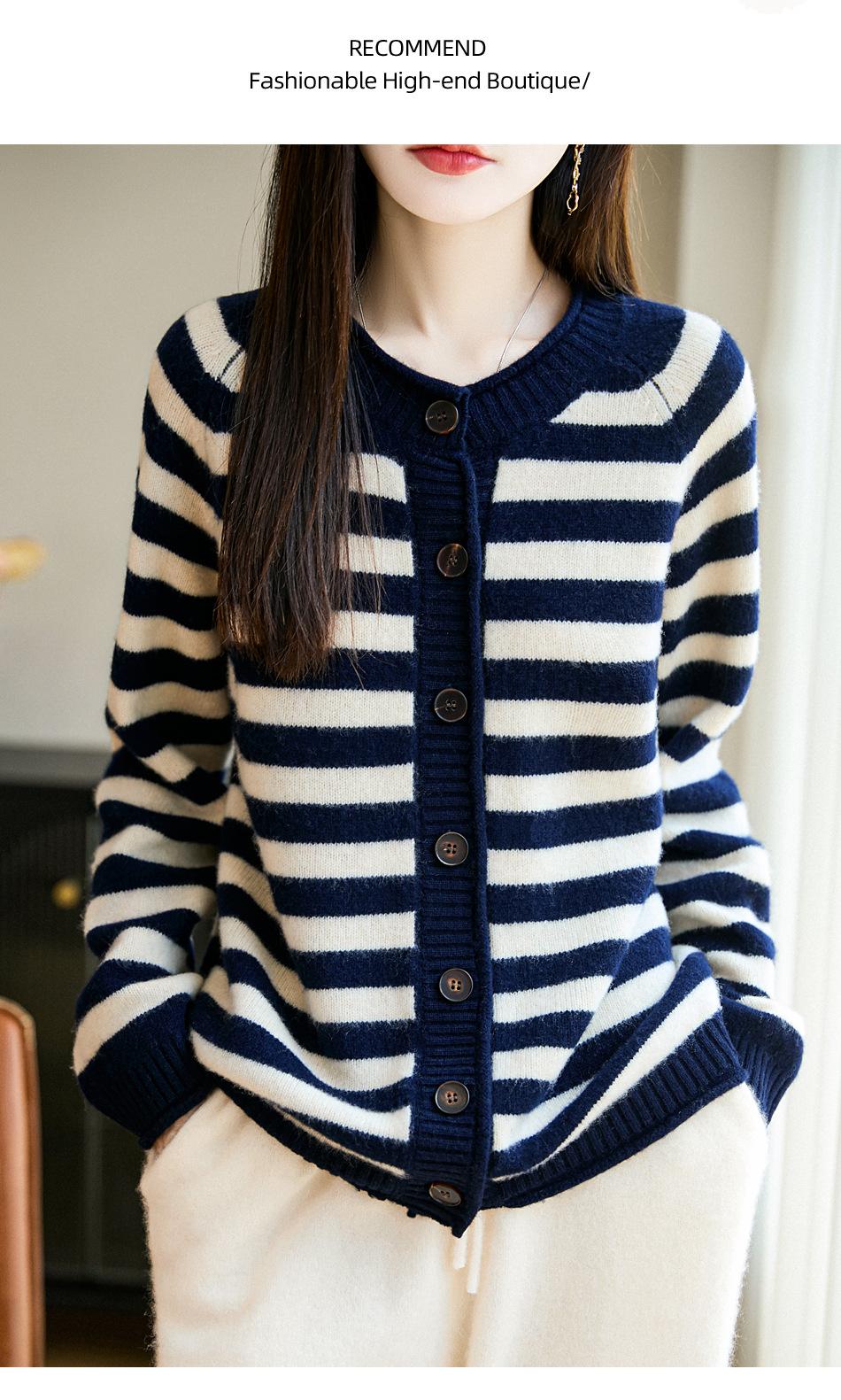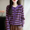 Cárdigan de Punto de Lana Pura de Nuevo Estilo Otoño/Invierno 2025 para Mujer Cuello Redondo Bloque de Color Rayado Suelto Manga Larga Abotonado Abrigo Grueso