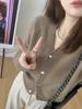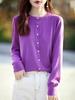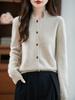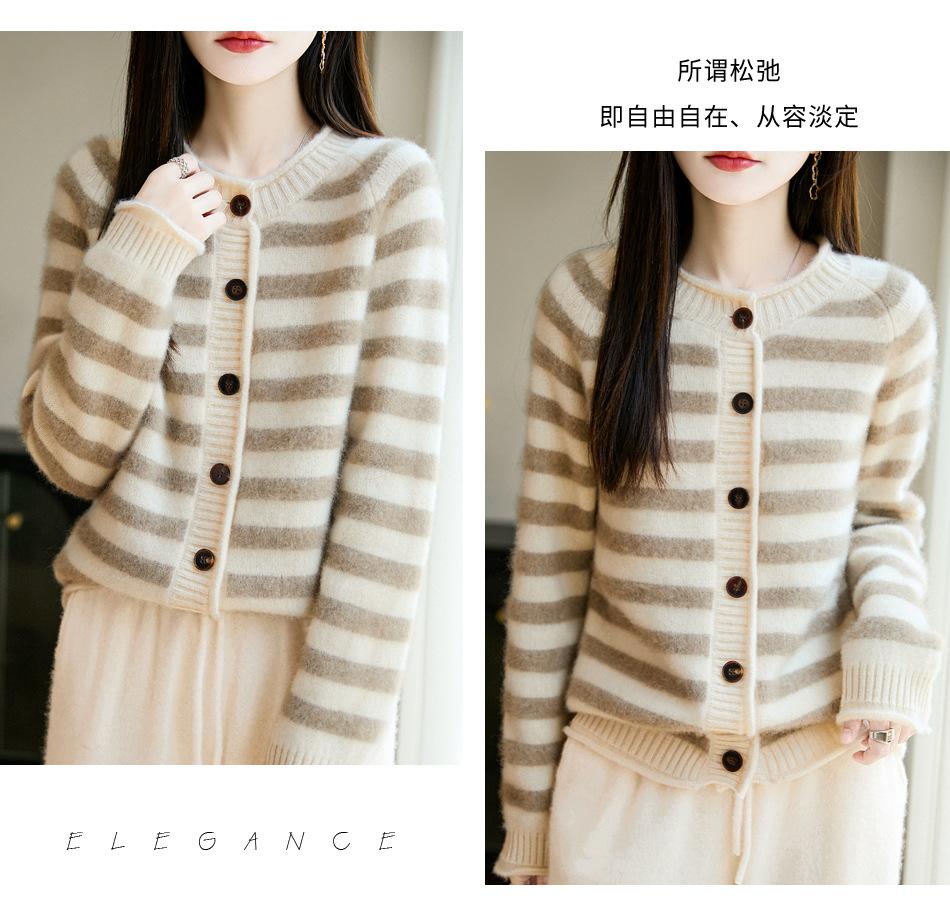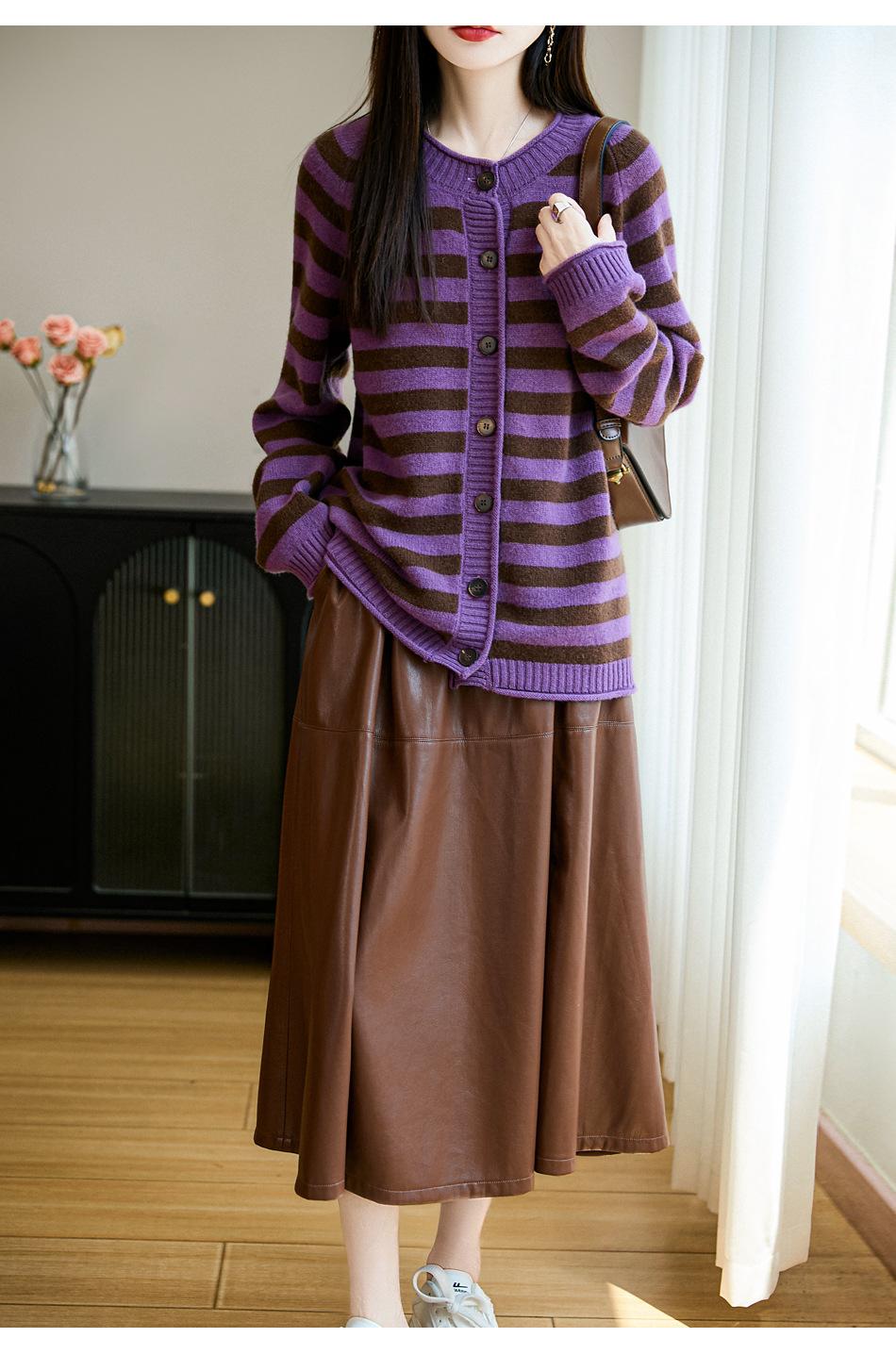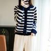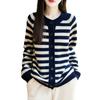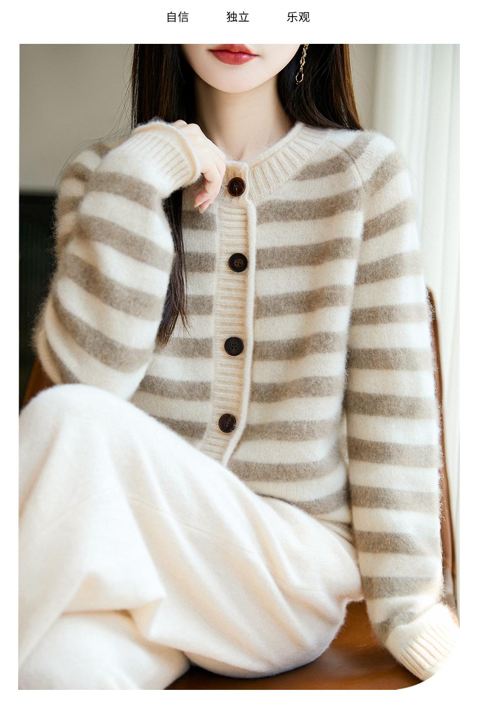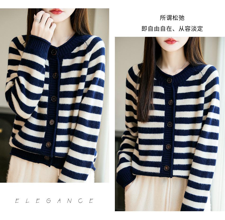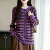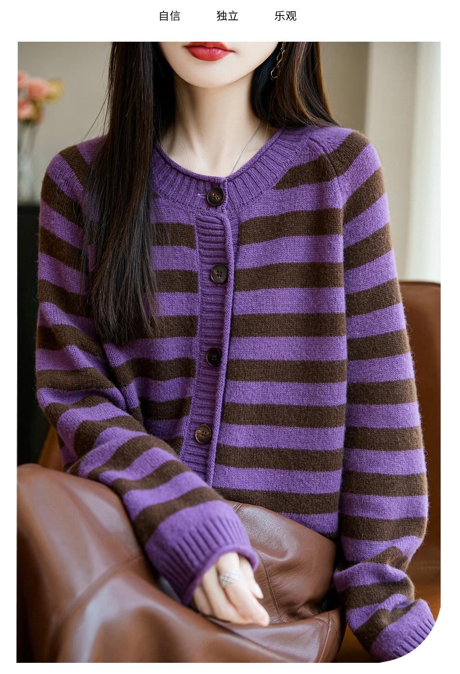Cárdigan de Punto de Lana Pura de Nuevo Estilo Otoño/Invierno 2025 para Mujer Cuello Redondo Bloque de Color Rayado Suelto Manga Larga Abotonado Abrigo Grueso