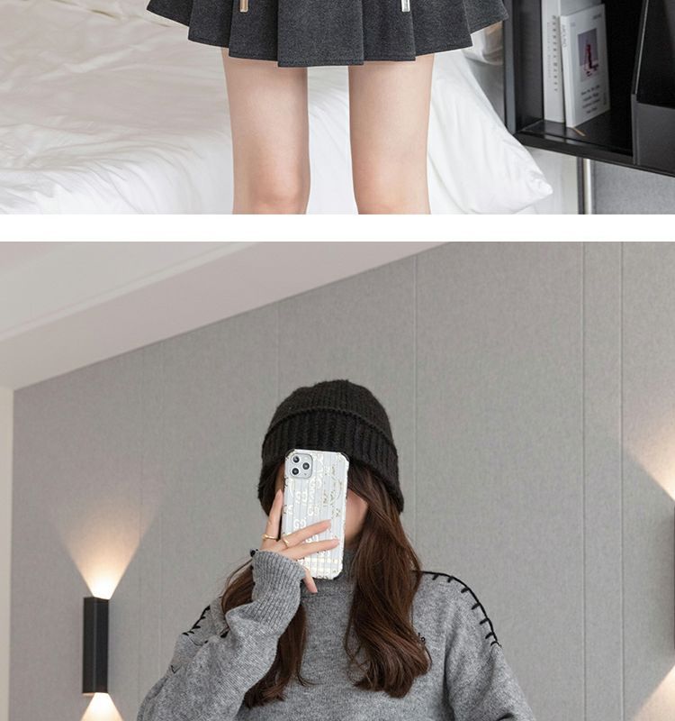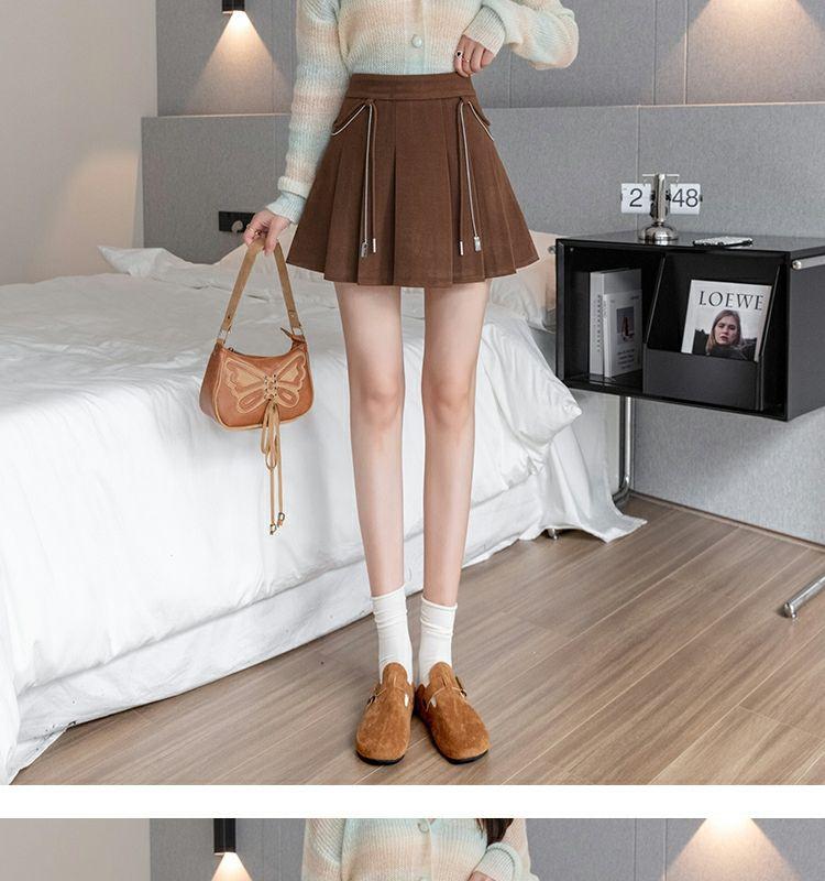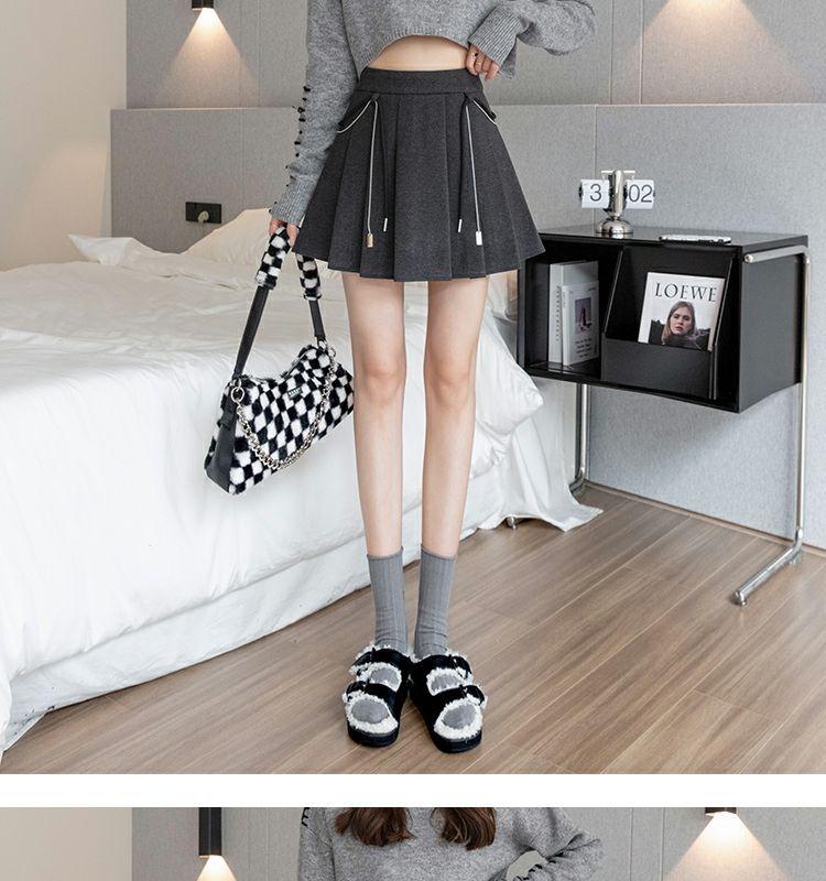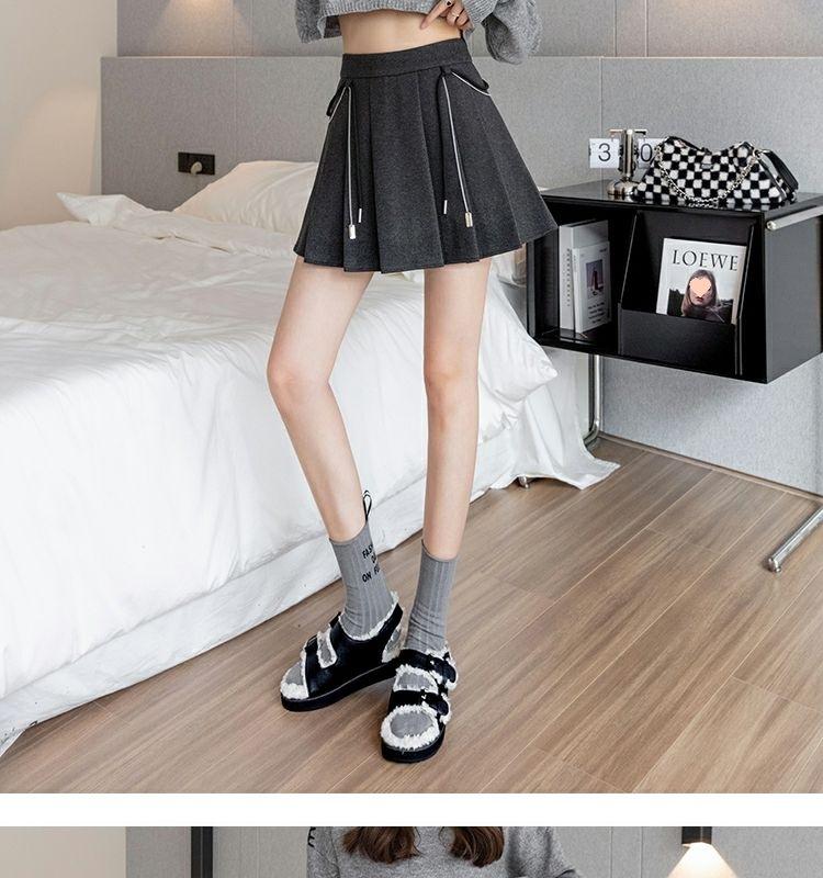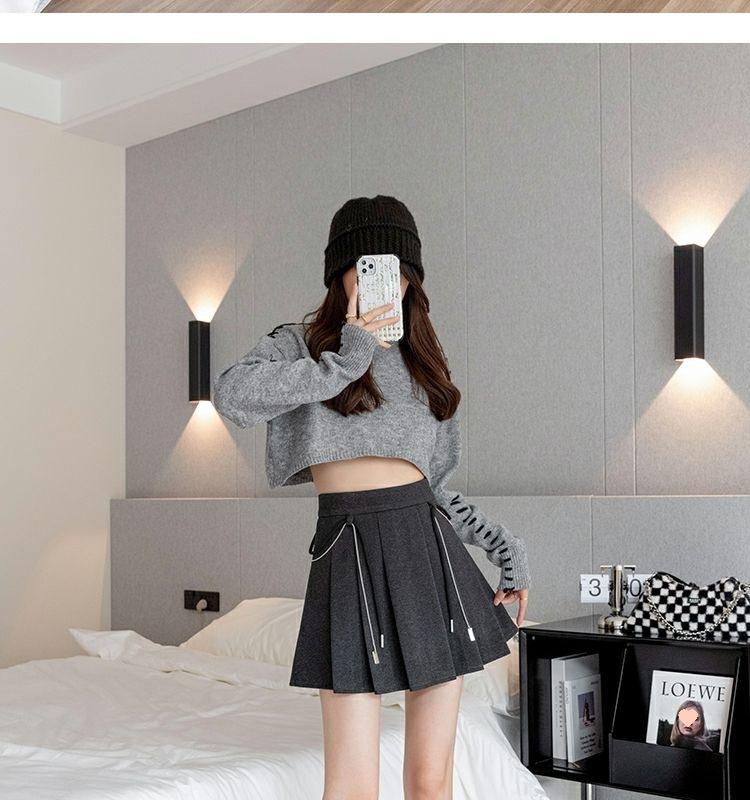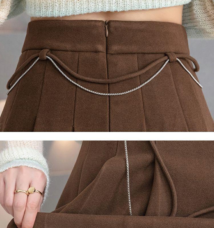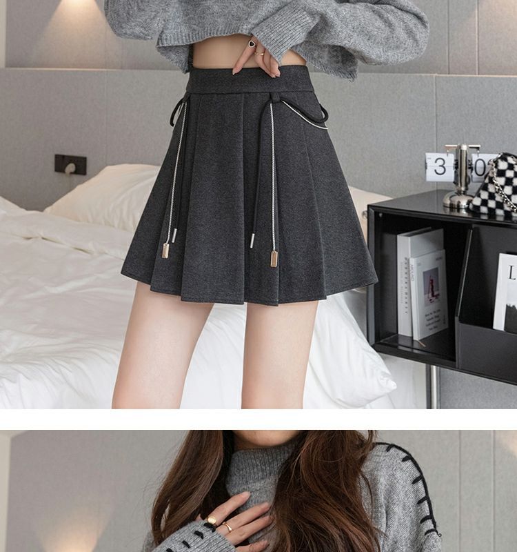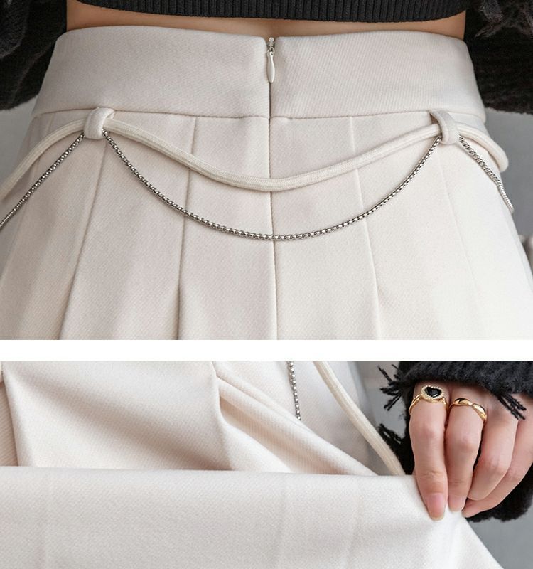 Falda Plisada Gruesa Gris Oscuro para Mujer Primavera y Verano Cadena Cintura Alta Falda Línea A Falda Pequeña Ajustada de Lana