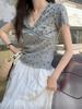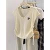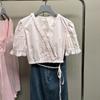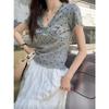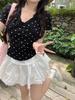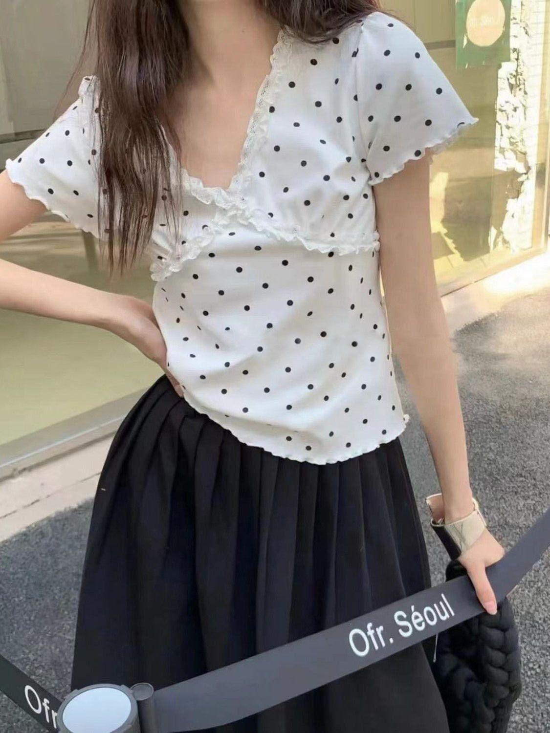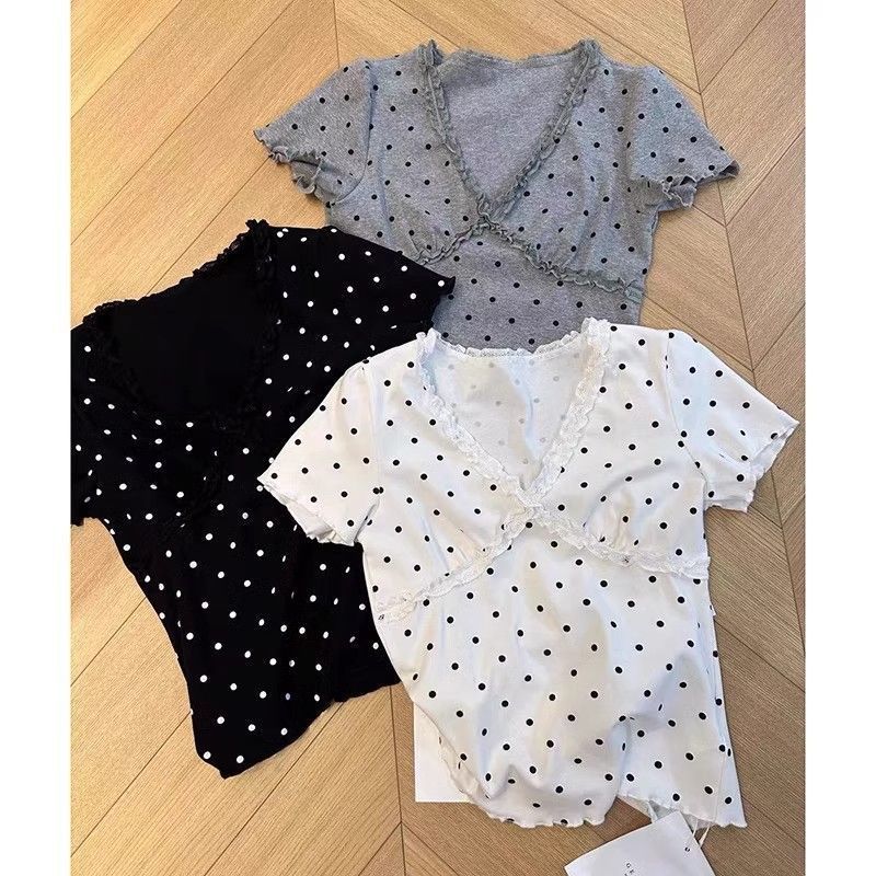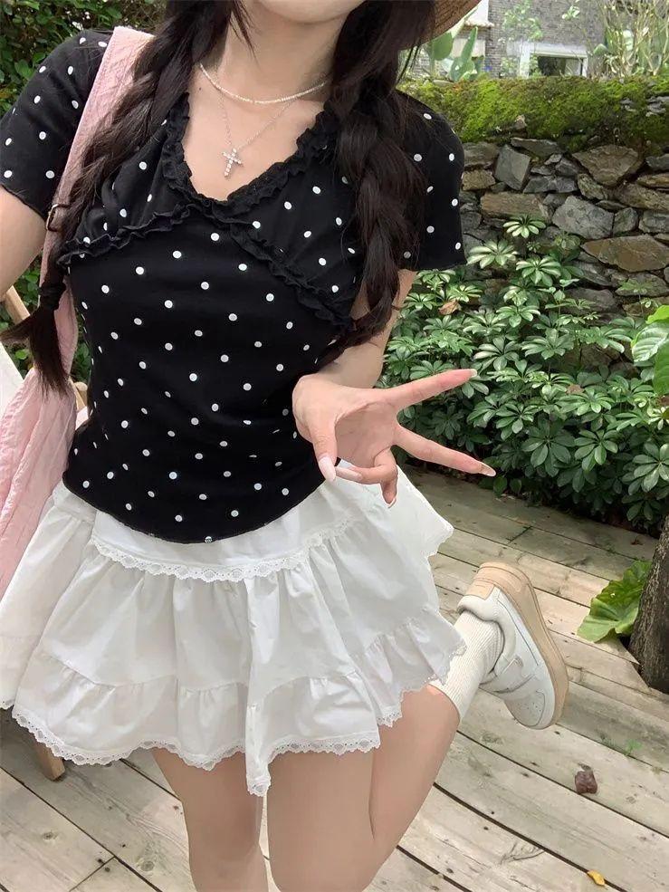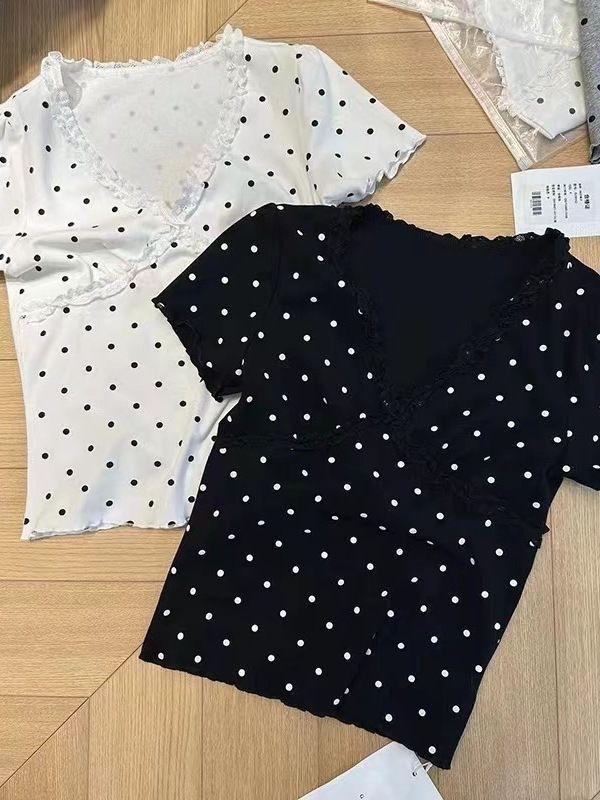Estilo Dulce y Picante Camiseta de Manga Corta con Cuello en V y Encaje de Lunares Negros para Mujer Verano Nueva Ajustada Corta Versátil Top Tendencia