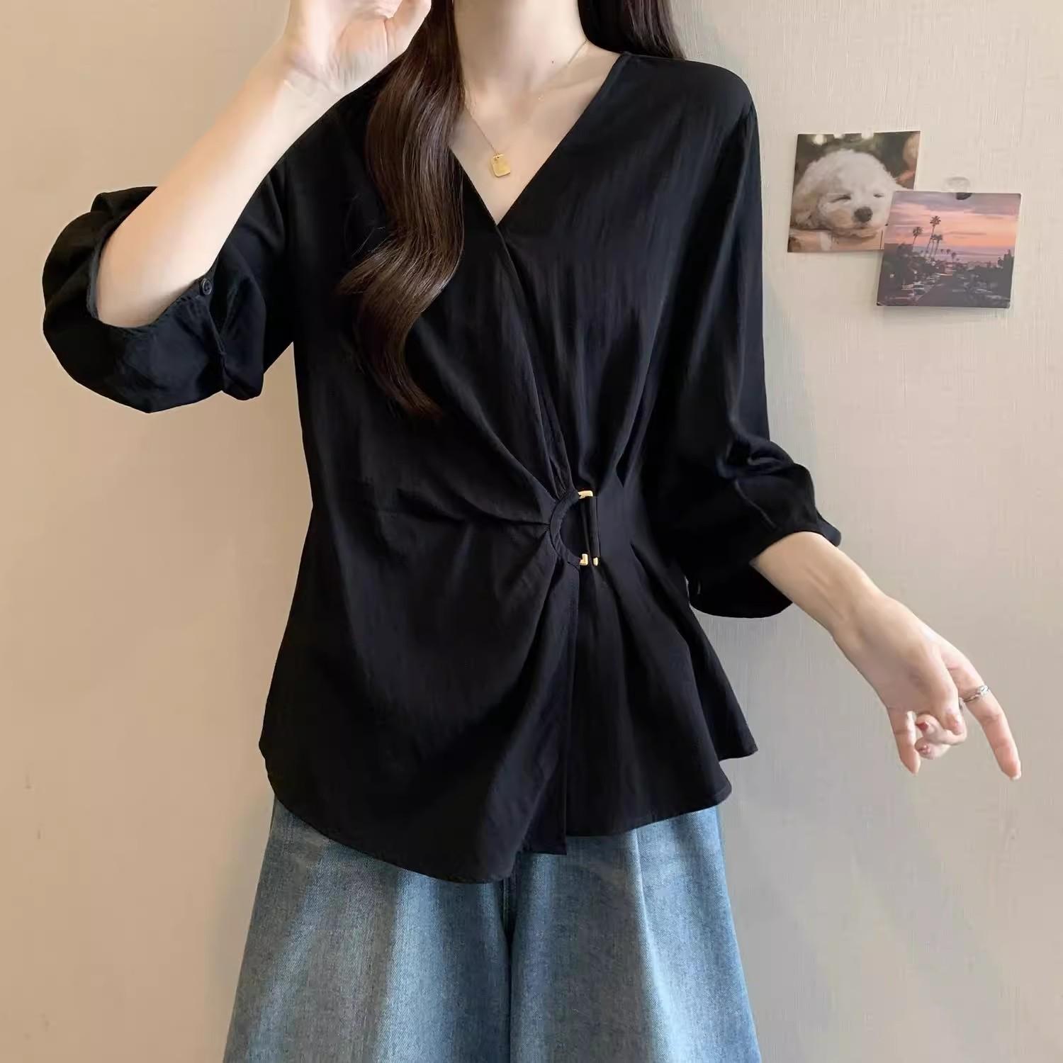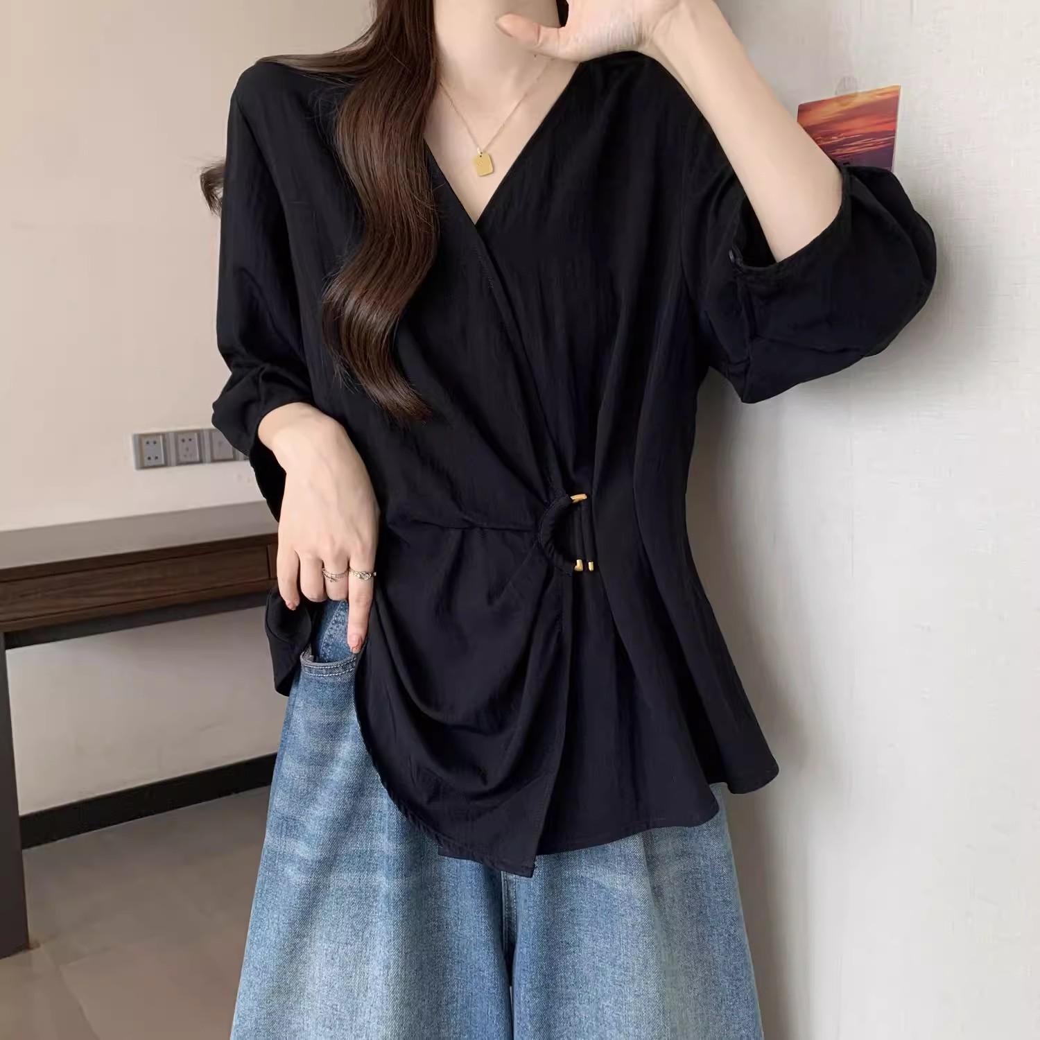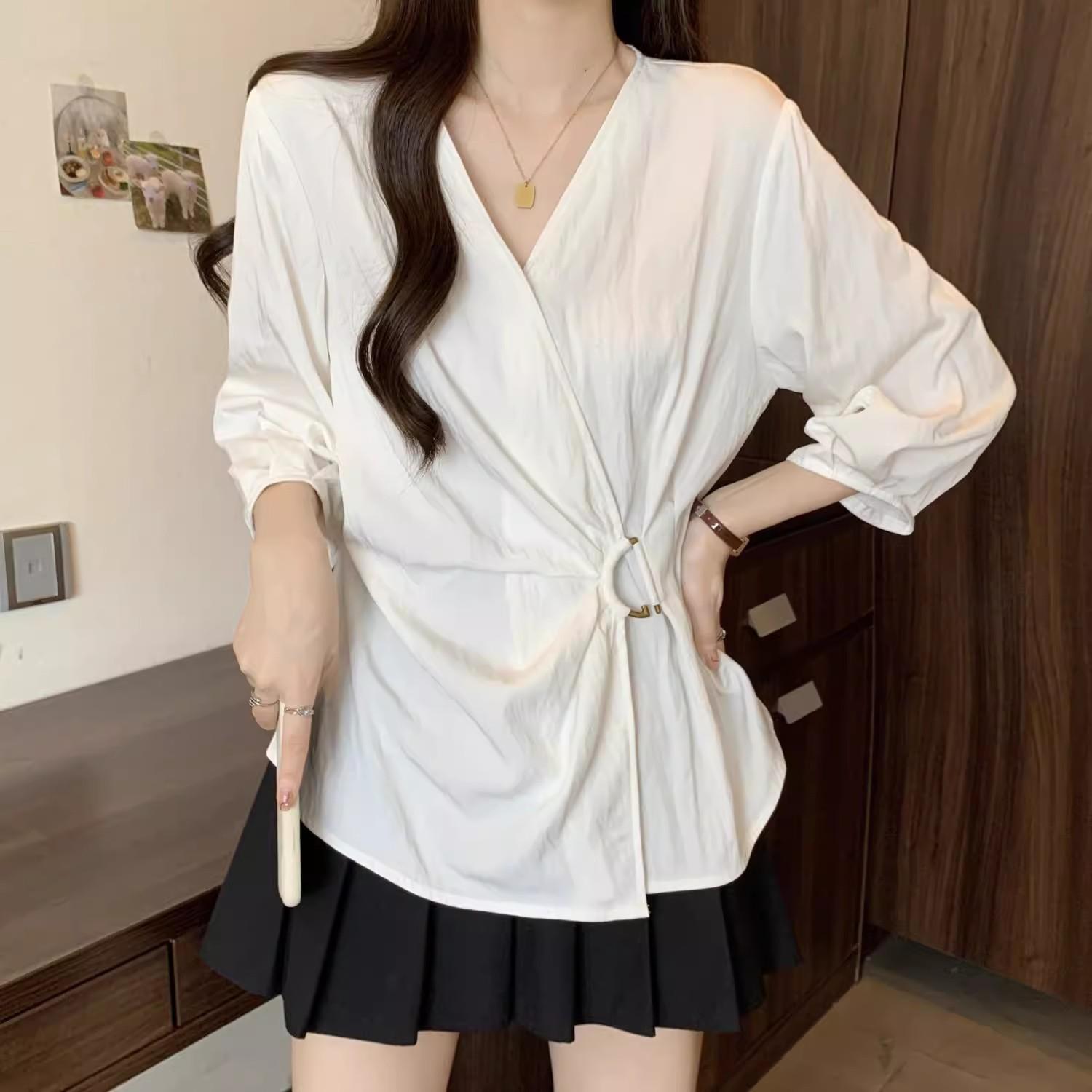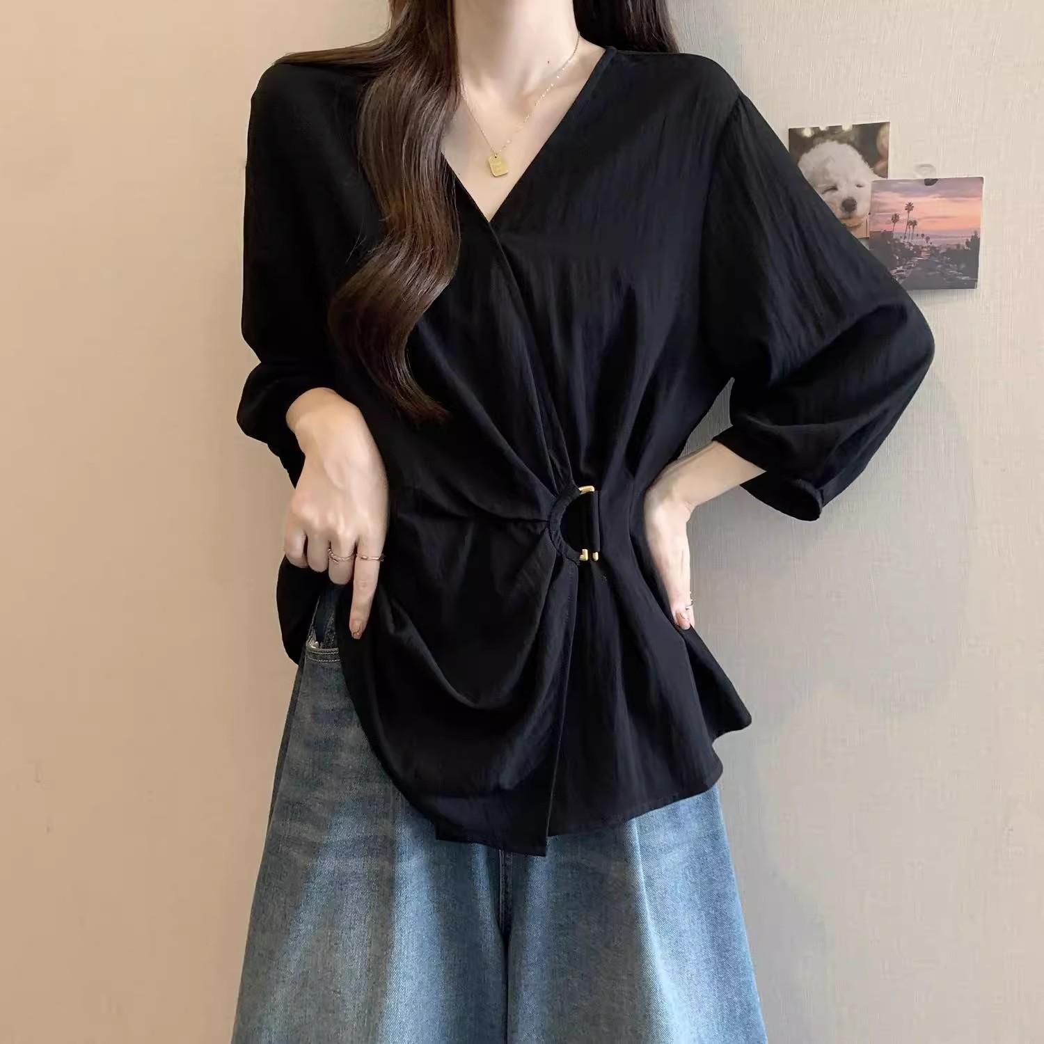 Temperamento Francés Diseño Entallado Camisa de Manga Larga con Cuello en V Mujer Estilo Primavera y Otoño 2025 Talla Extra Cubre Vientre Top