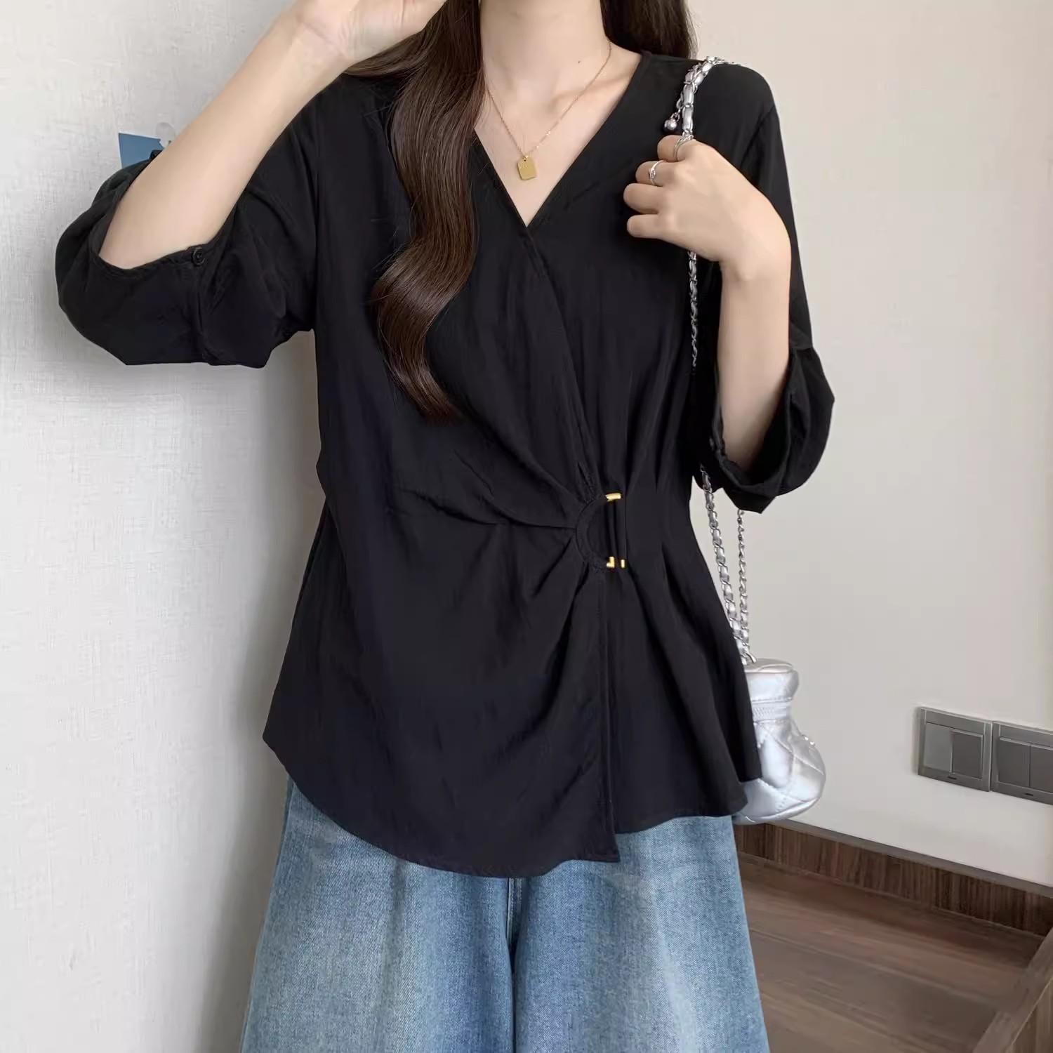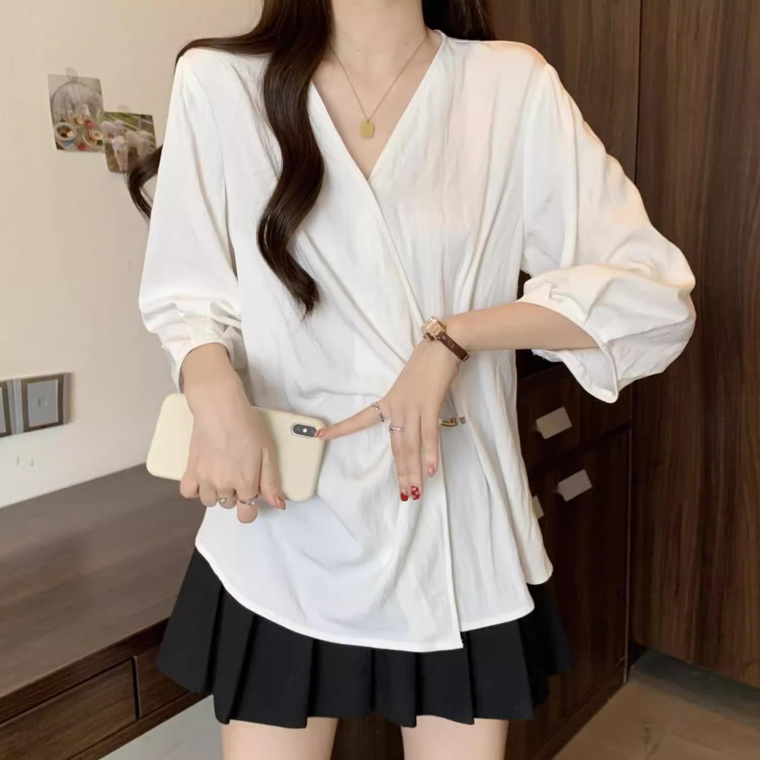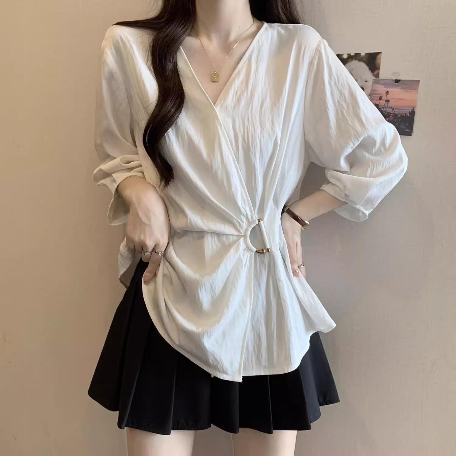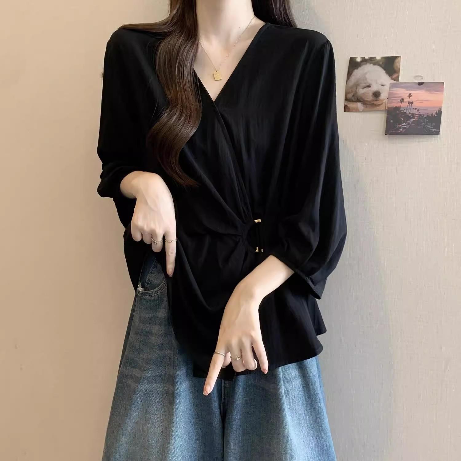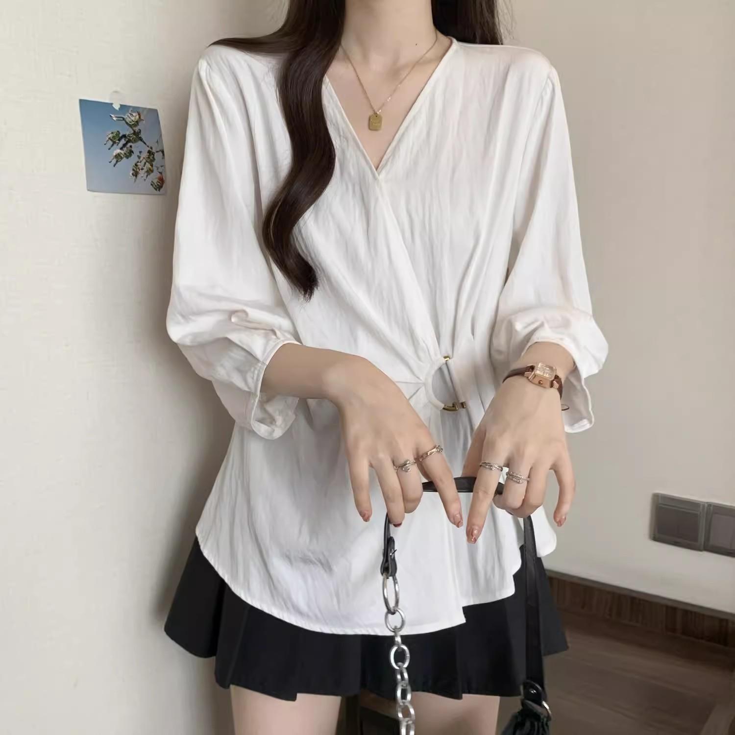 Temperamento Francés Diseño Entallado Camisa de Manga Larga con Cuello en V Mujer Estilo Primavera y Otoño 2025 Talla Extra Cubre Vientre Top