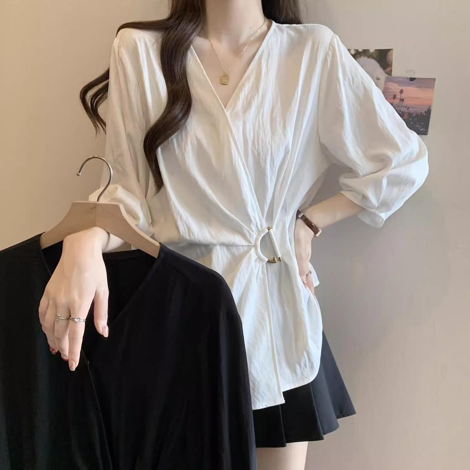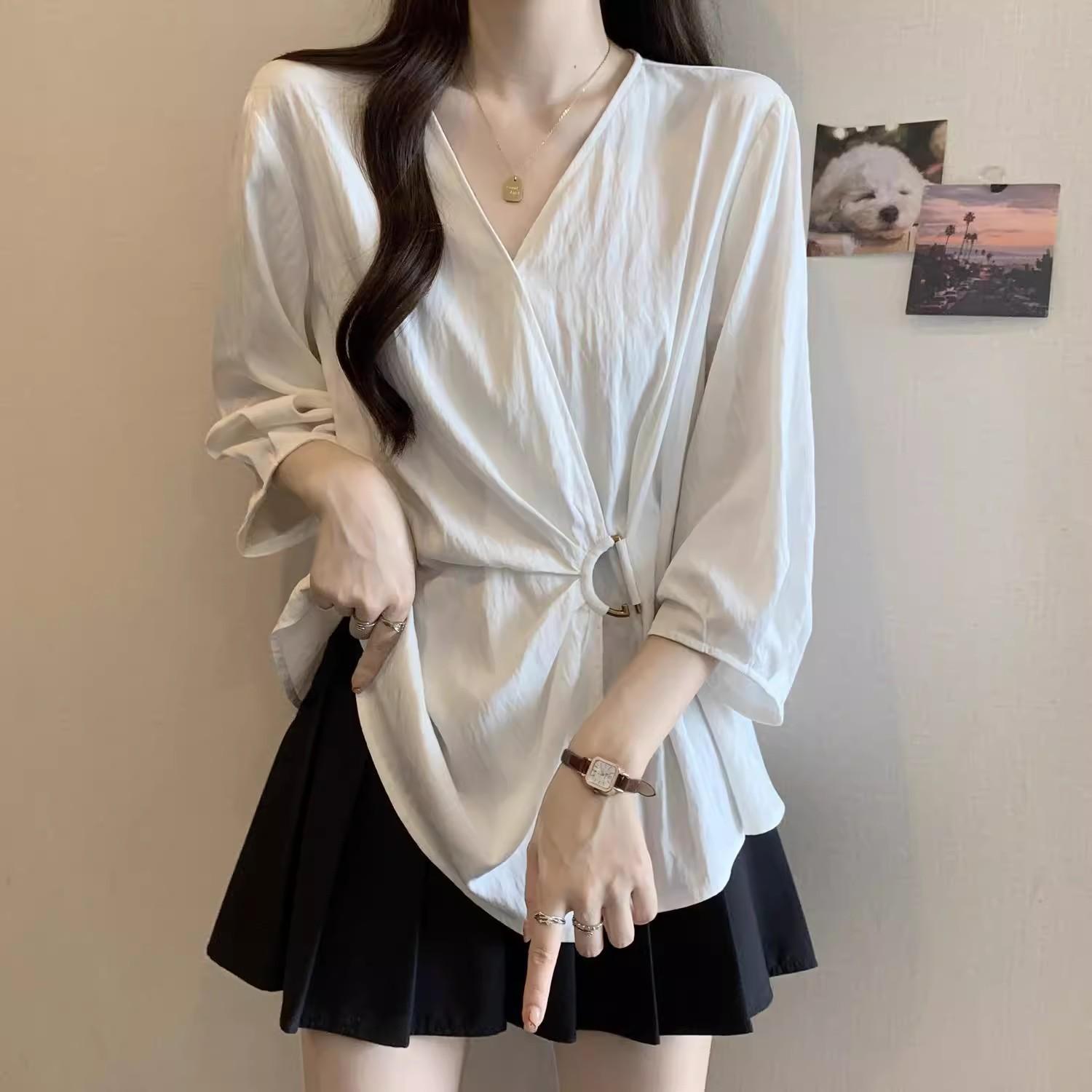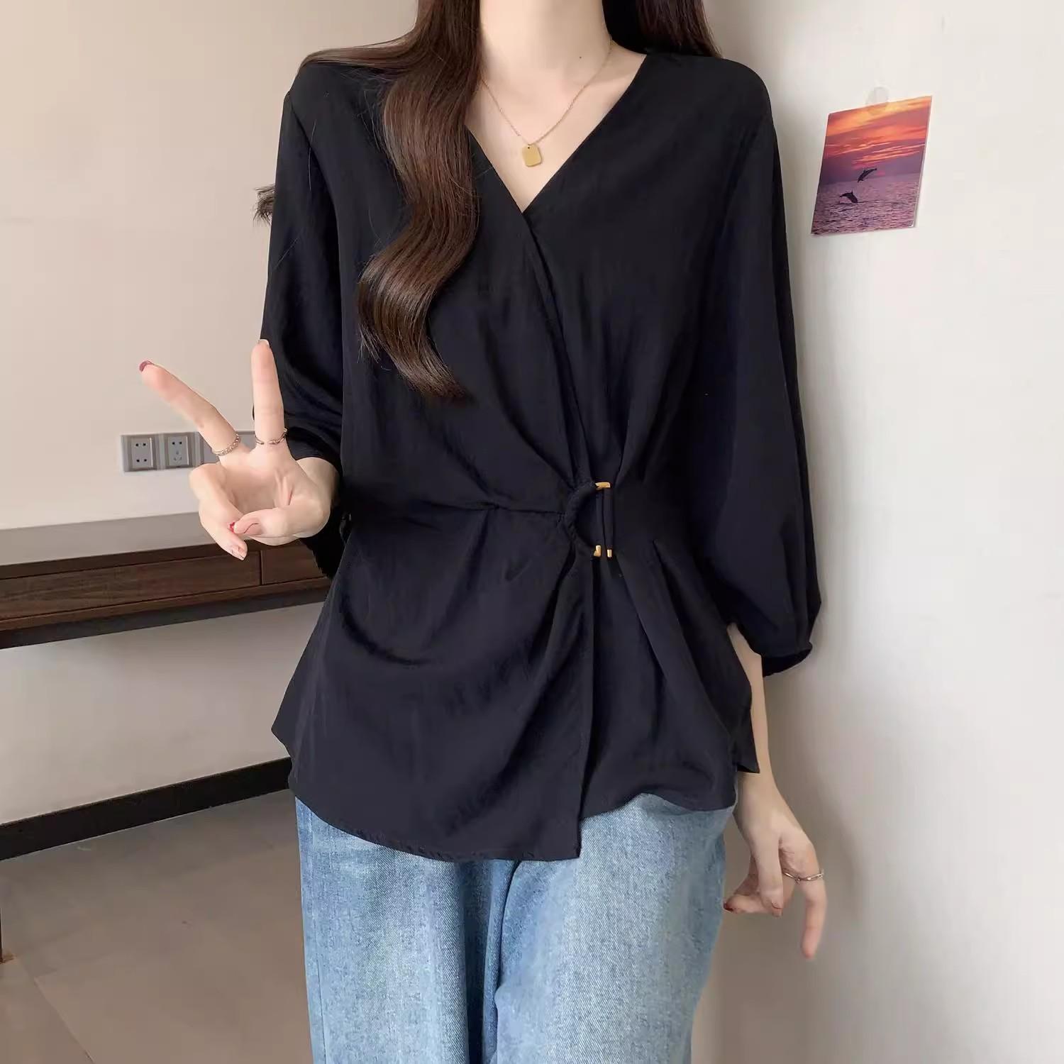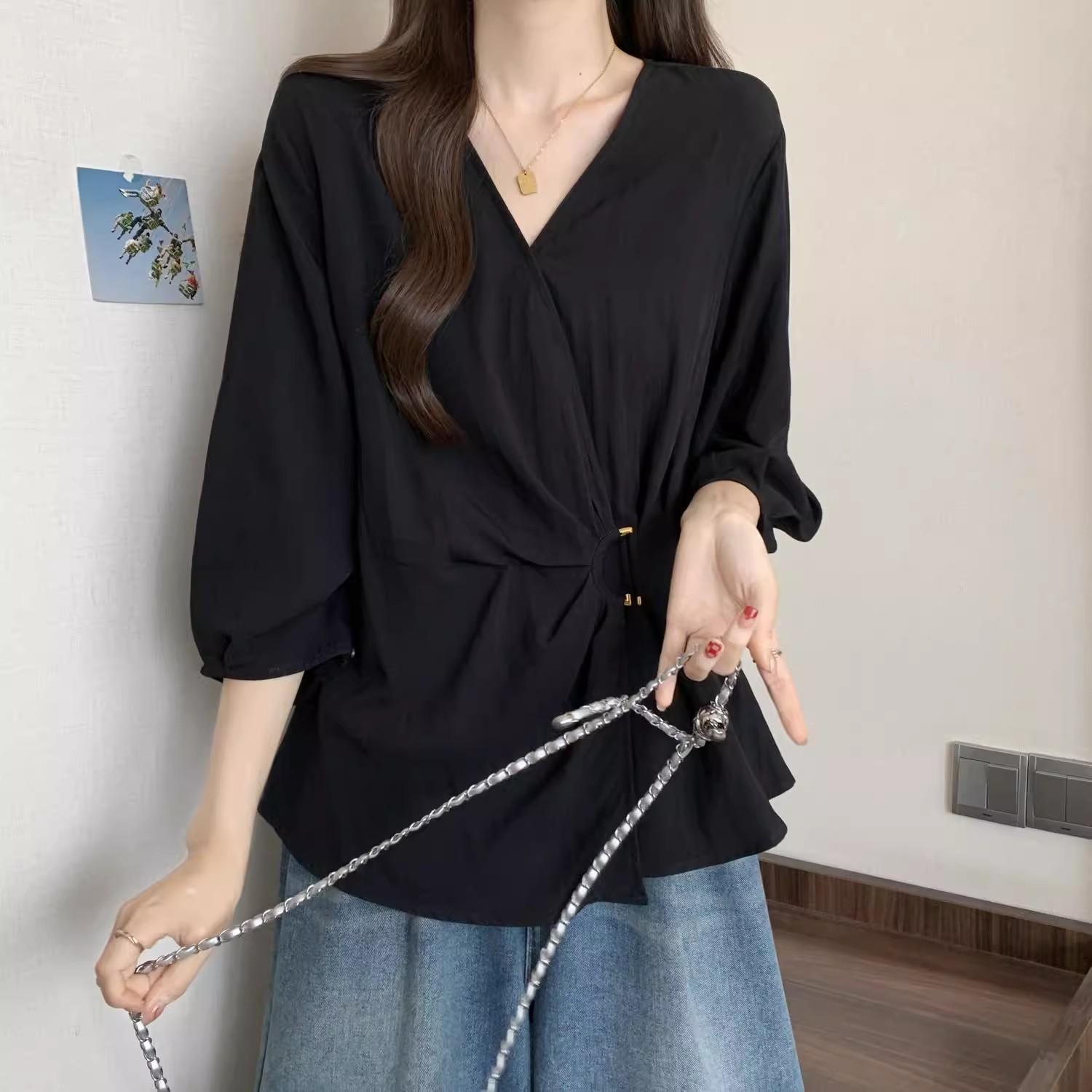 Temperamento Francés Diseño Entallado Camisa de Manga Larga con Cuello en V Mujer Estilo Primavera y Otoño 2025 Talla Extra Cubre Vientre Top