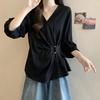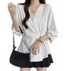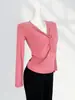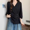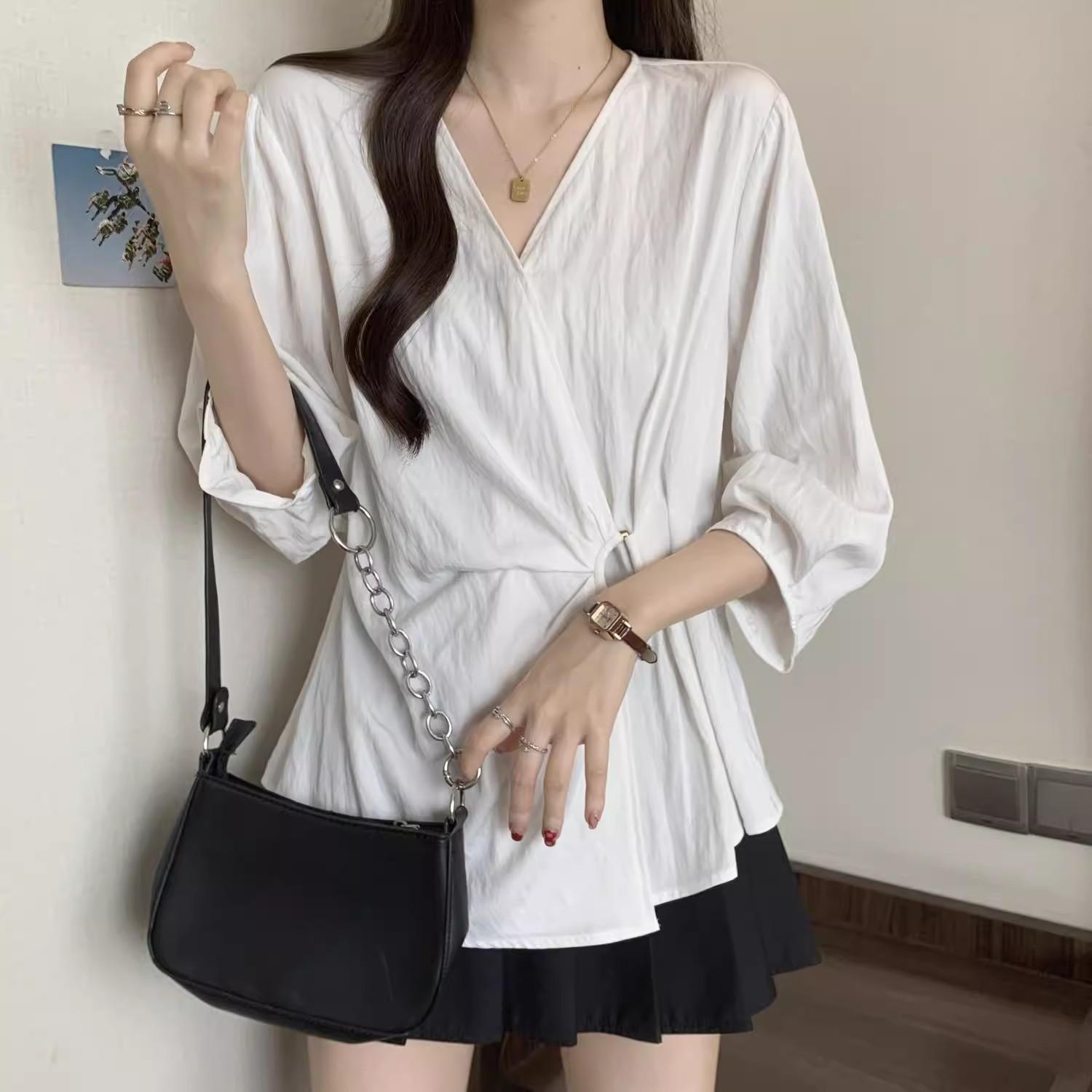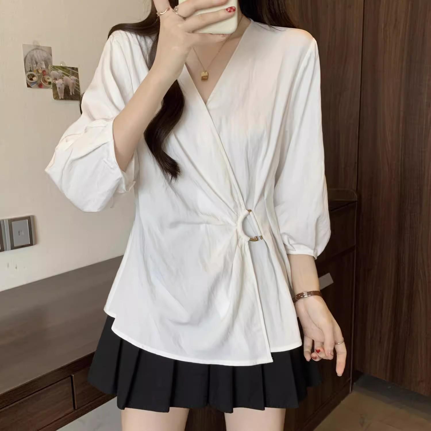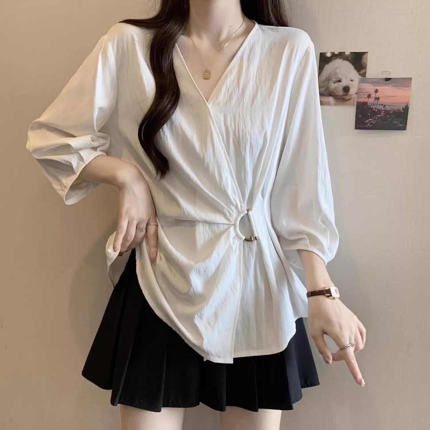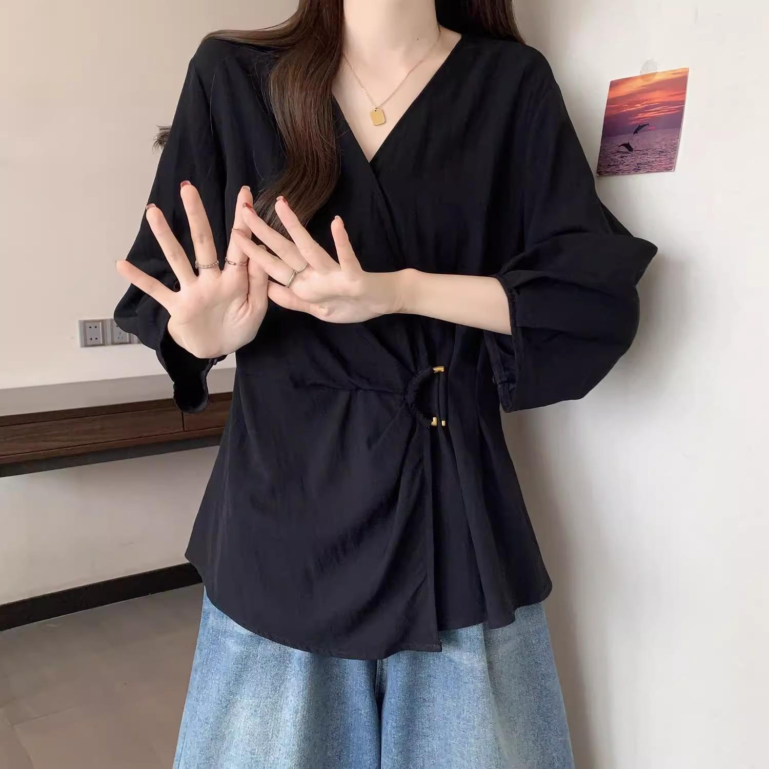 Temperamento Francés Diseño Entallado Camisa de Manga Larga con Cuello en V Mujer Estilo Primavera y Otoño 2025 Talla Extra Cubre Vientre Top
