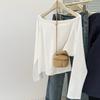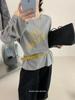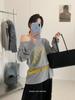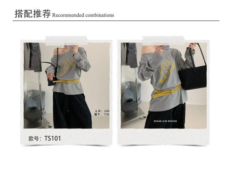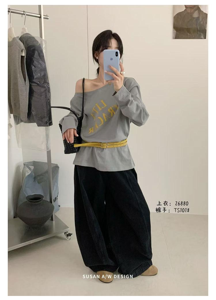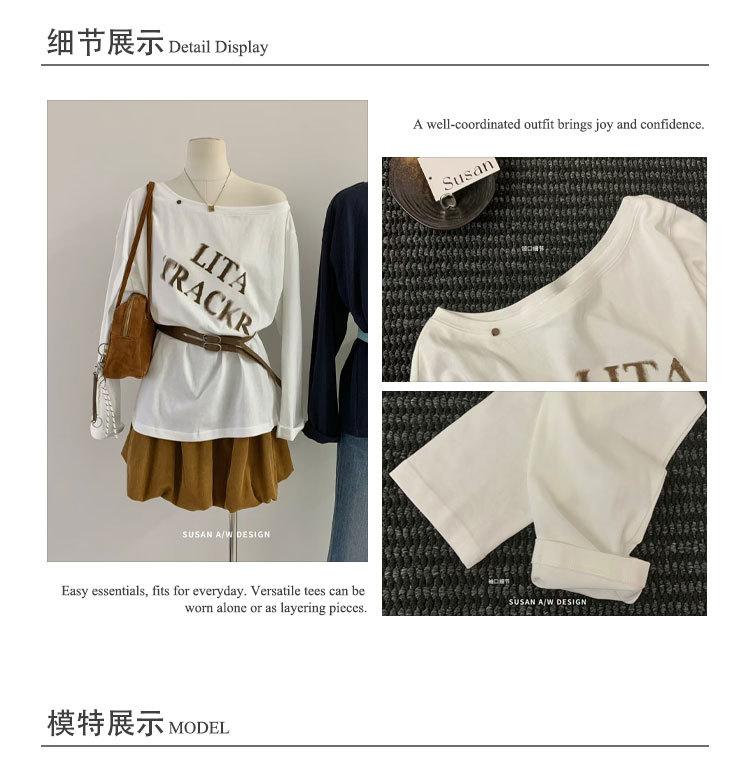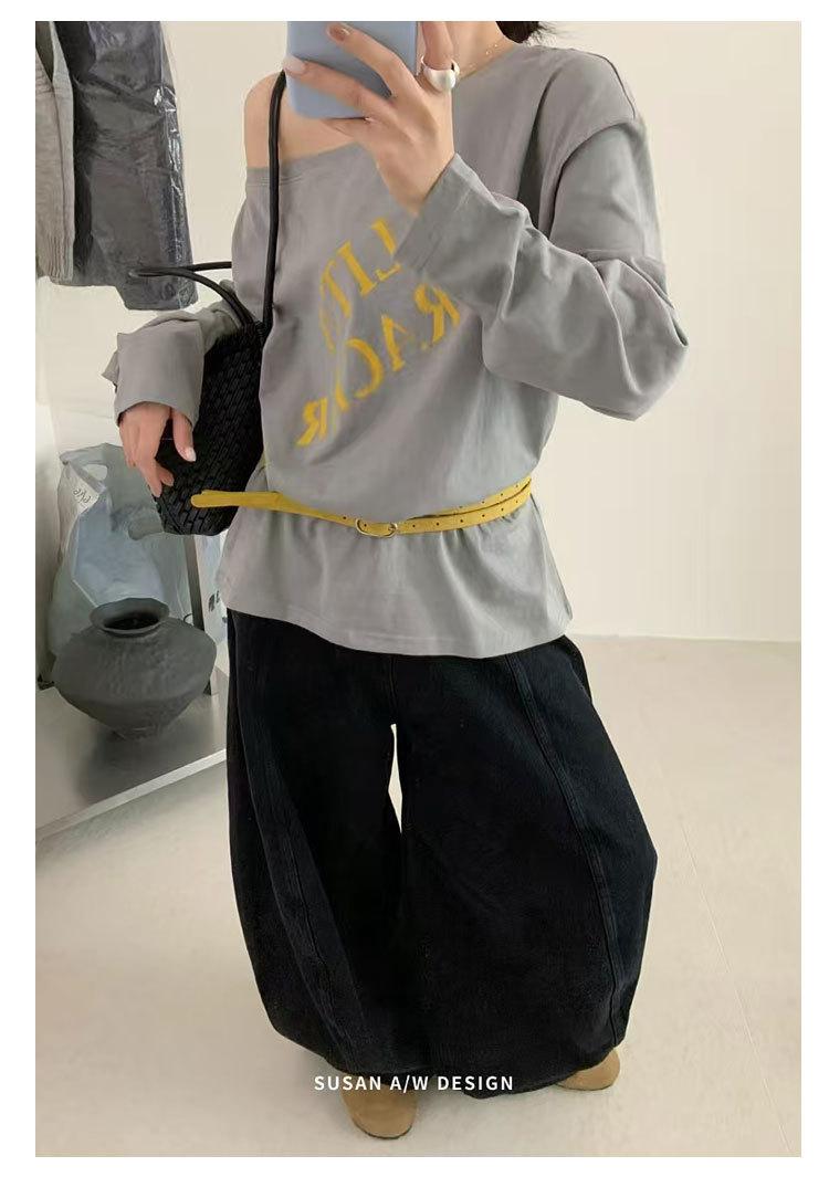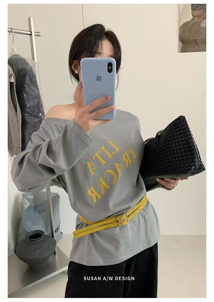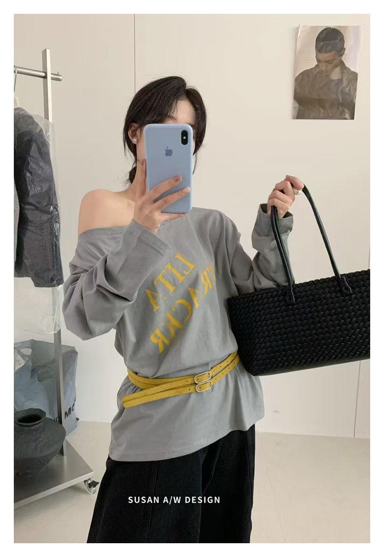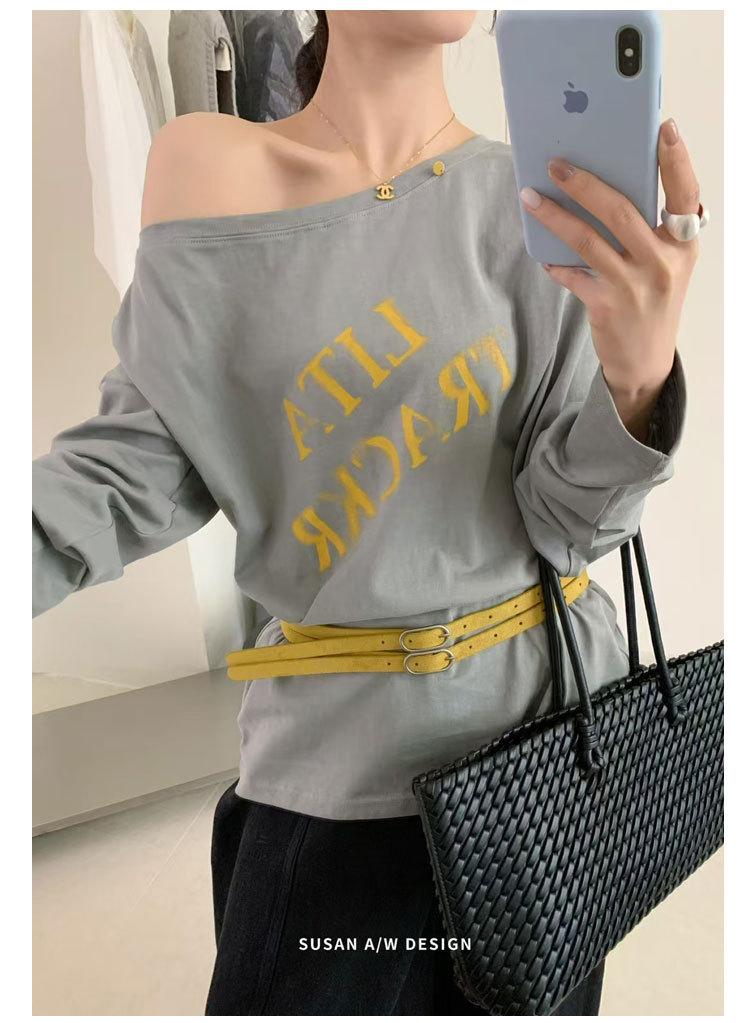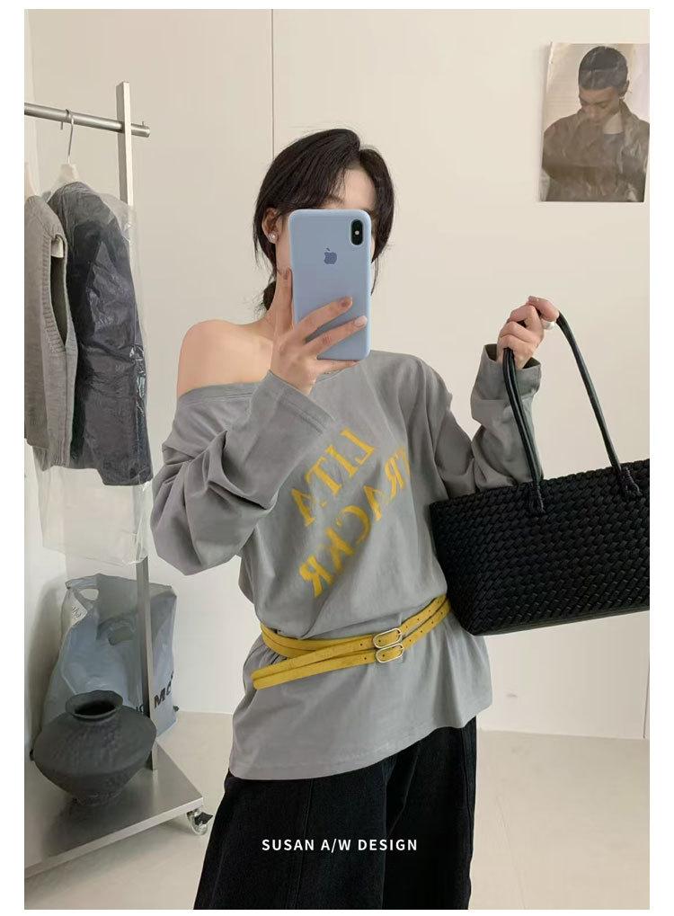 8.21 Camiseta de Estilo Coreano con Estampado de Letras, Hombro Descubierto, Manga Larga 2025 Colección Otoño Top Holgado con Cinturón 26880