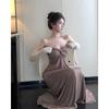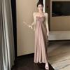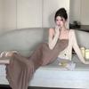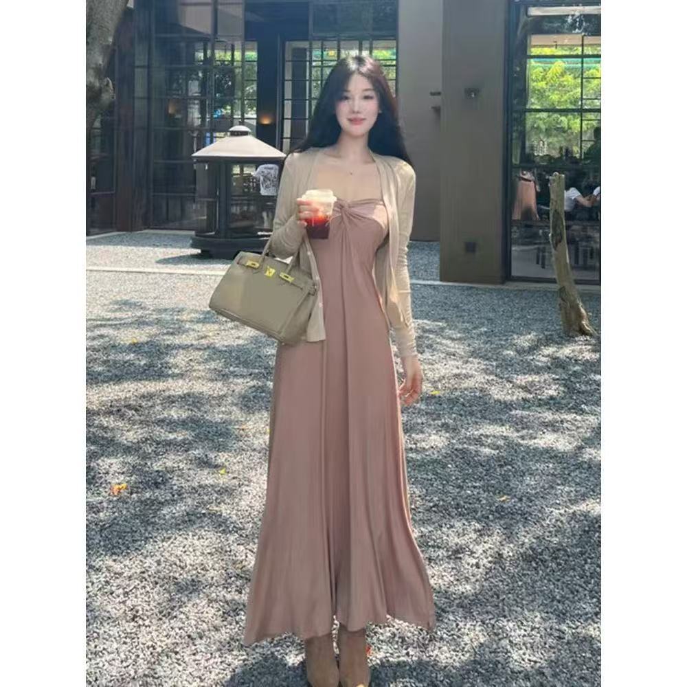 Vestido de dos piezas adelgazante de atmósfera de estilo suave para mujer, principios de otoño, deseo puro, corte ajustado, cárdigan corto de manga larga, conjunto de vestido largo