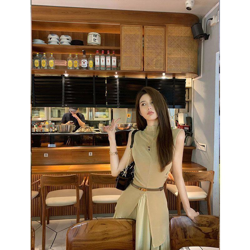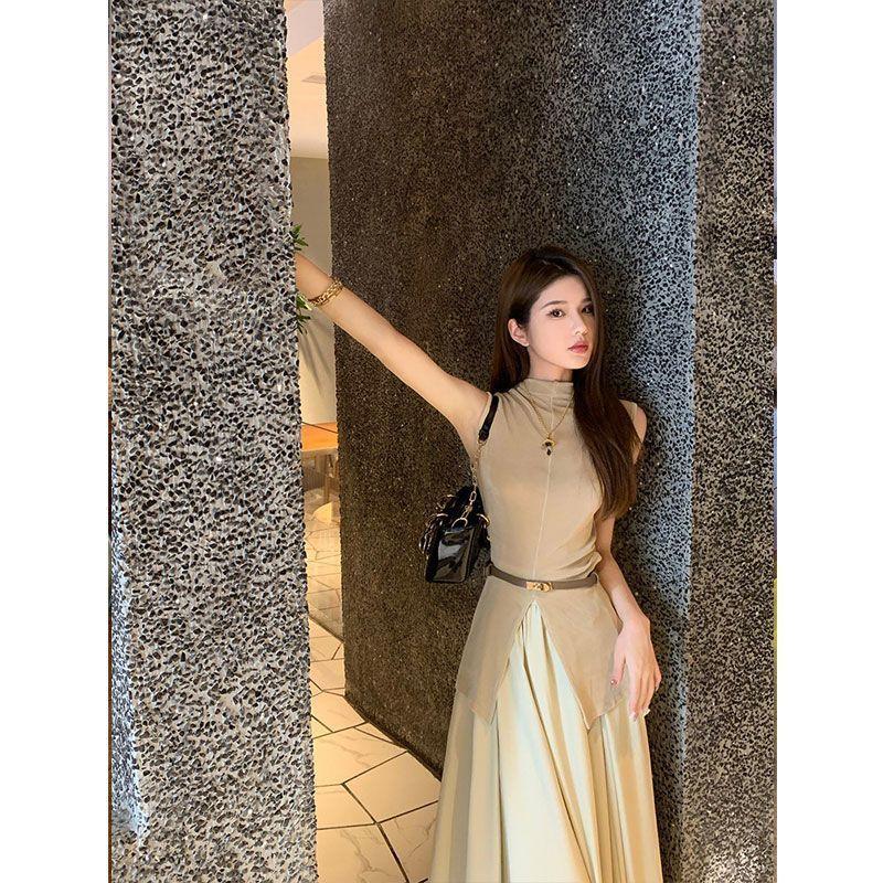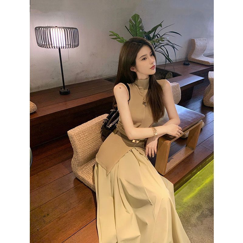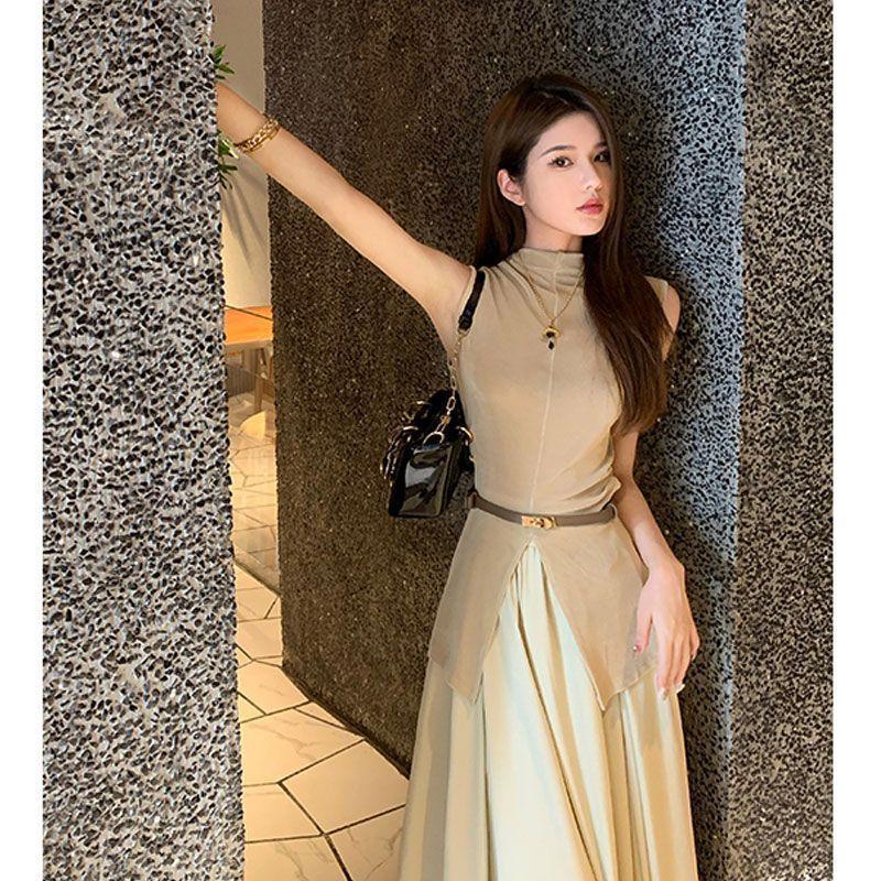 Traje de Falda Elegante Casual para Mujer Francés Slim Cuello Alto Abertura Irregular Top sin Mangas Falda con Cintura Elástica Verano