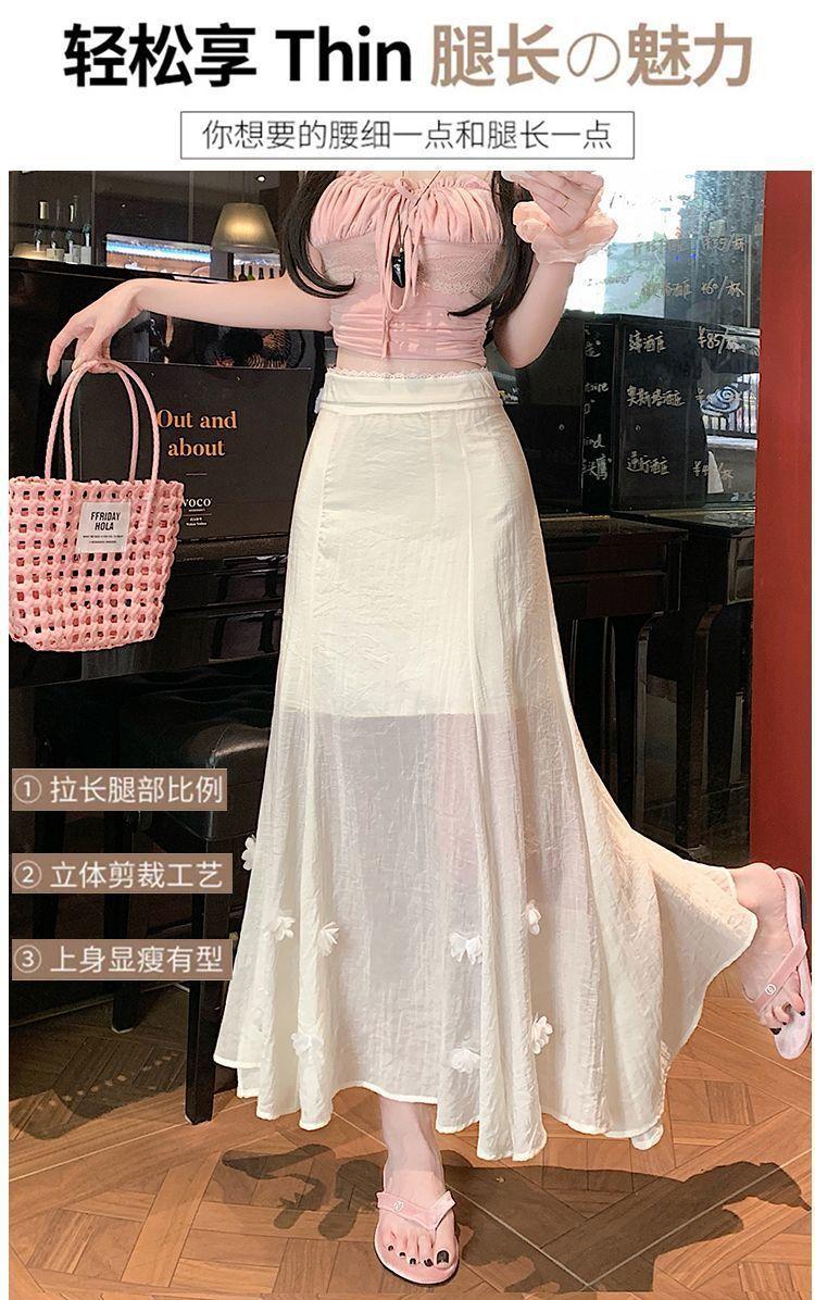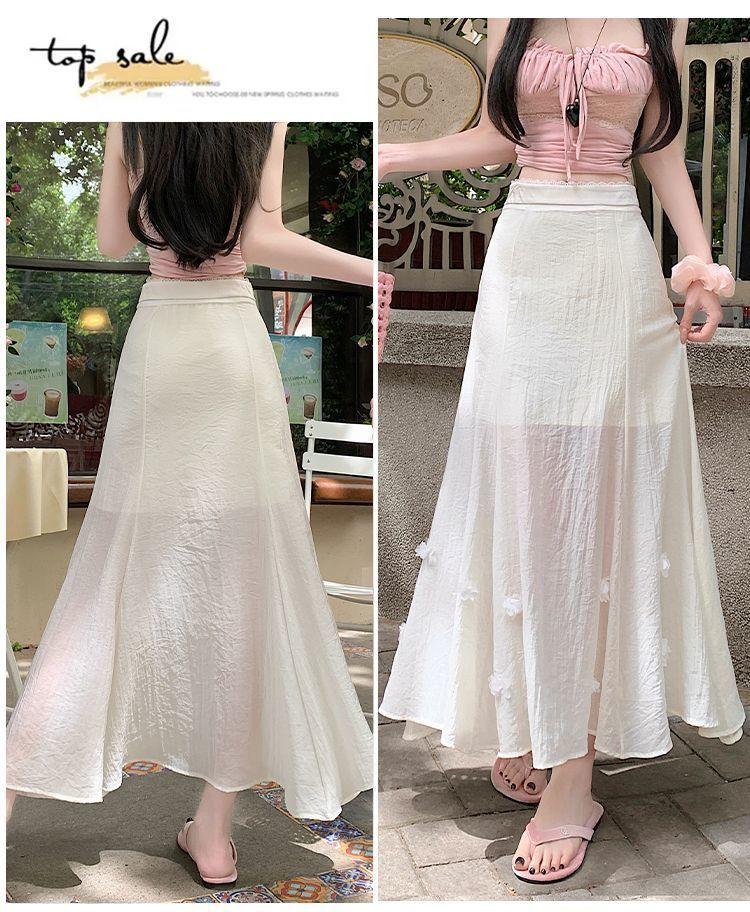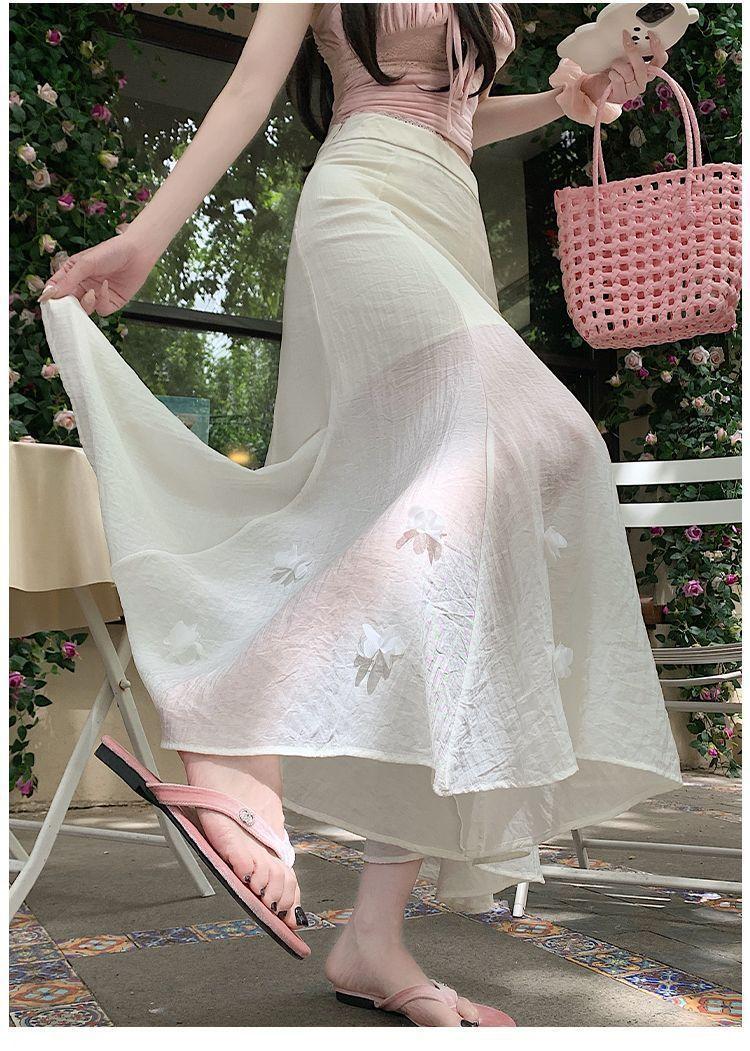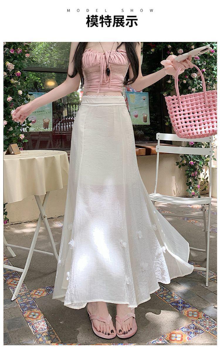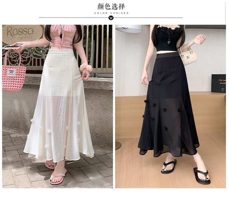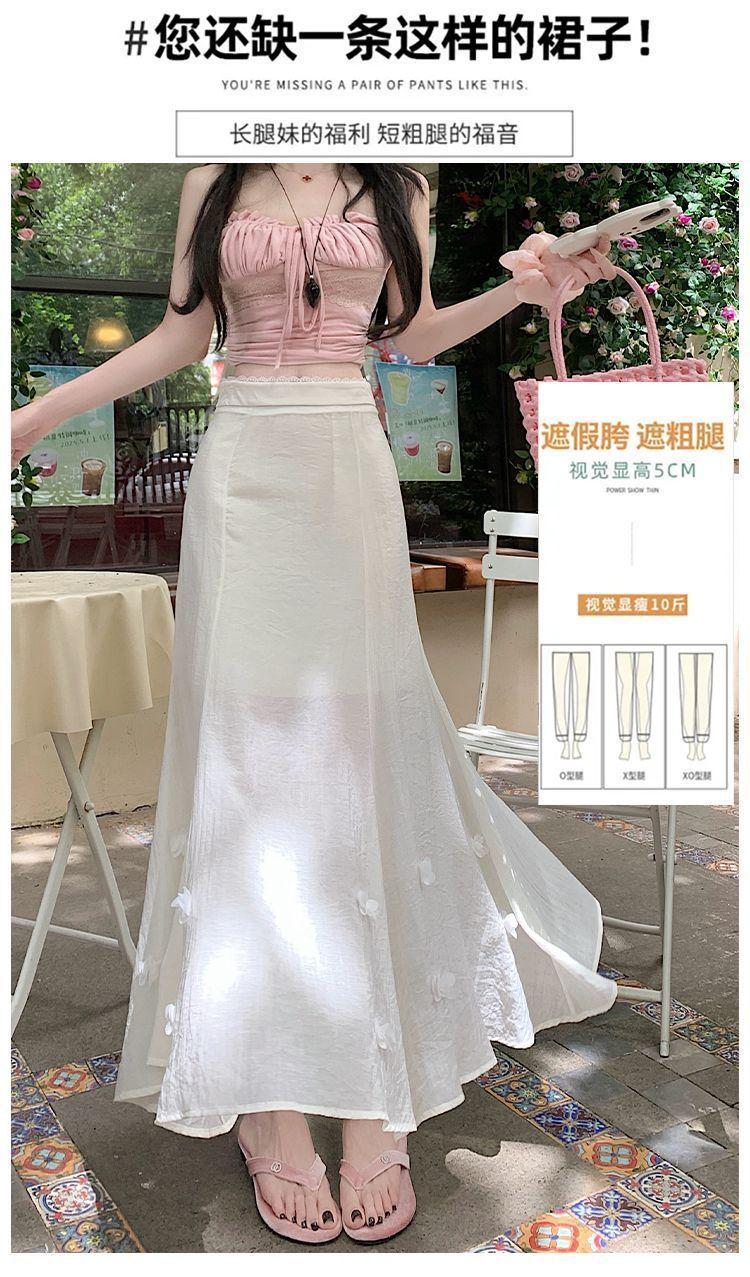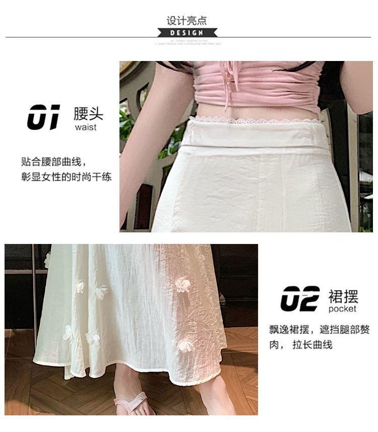 Falda Midi Acampanada Floral 3D Blanca Mujer Verano Temperamento Francés Falda Paraguas Yamamoto Cintura Alta Adelgazante Cola de Pescado Falda Larga