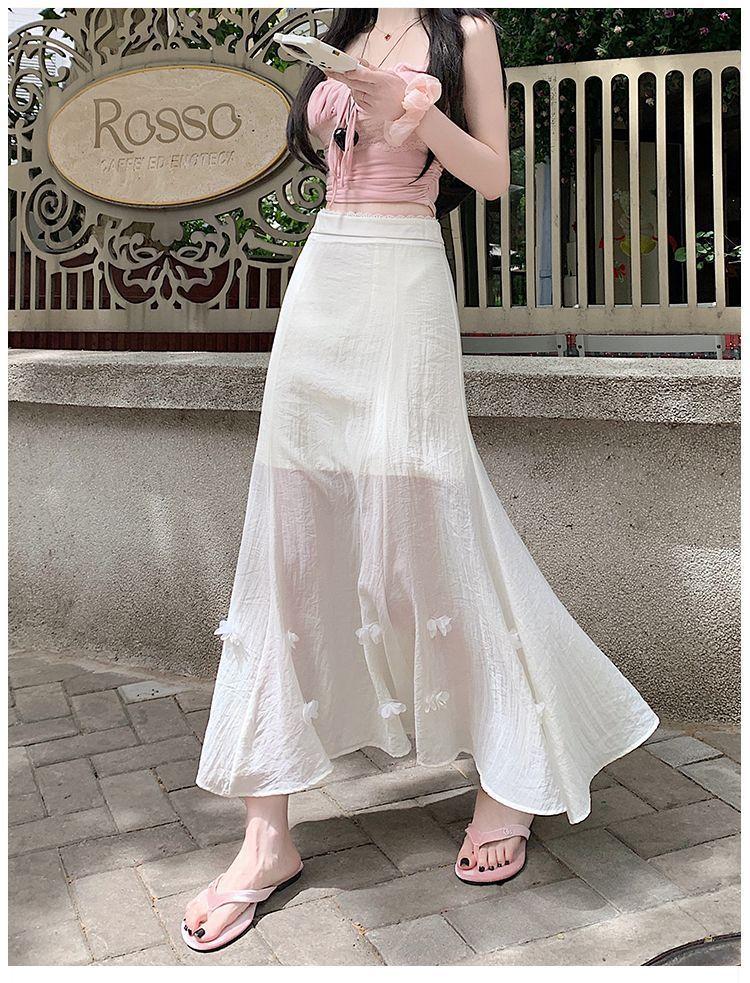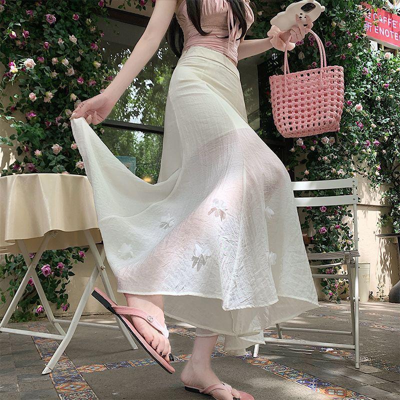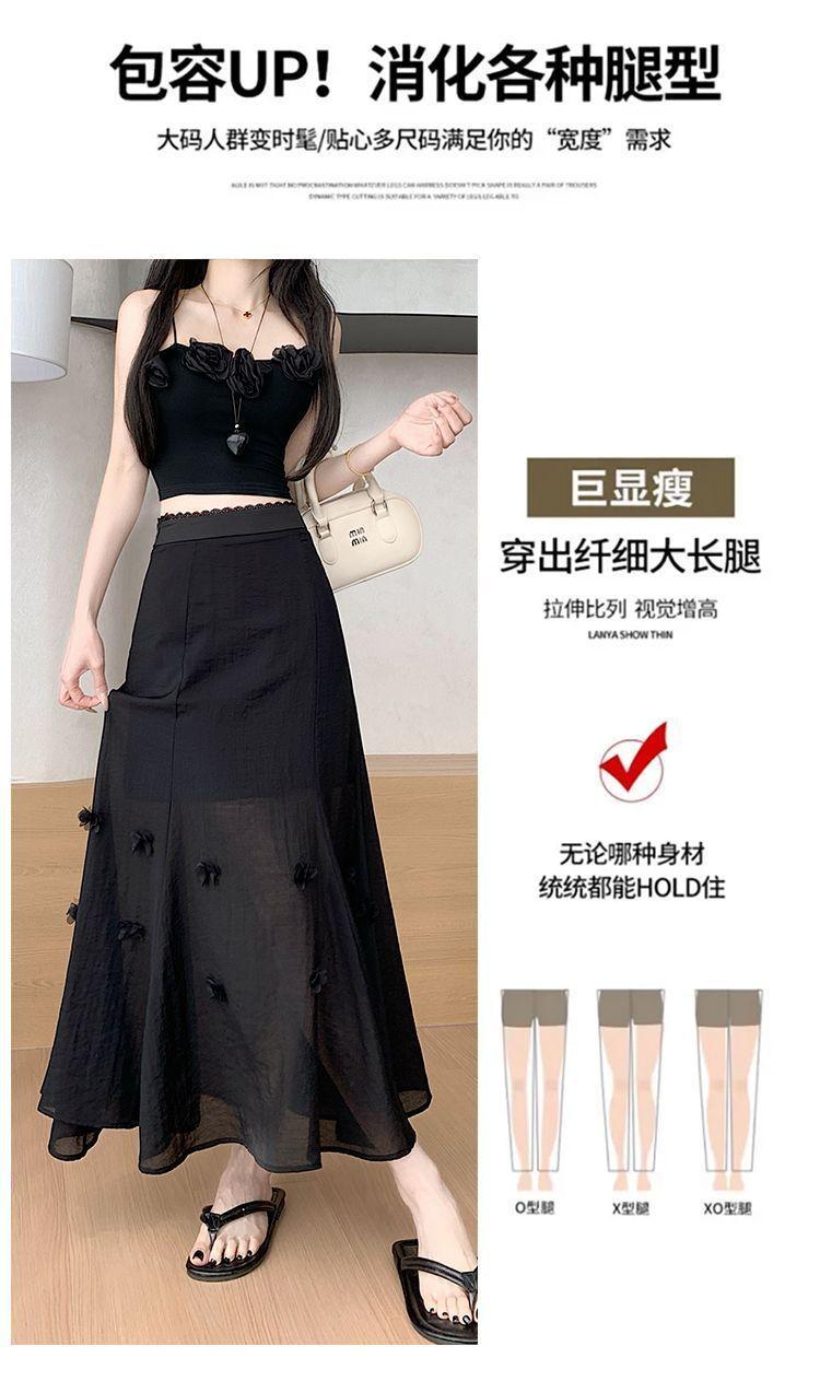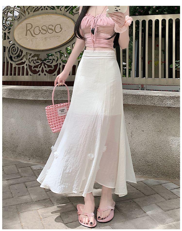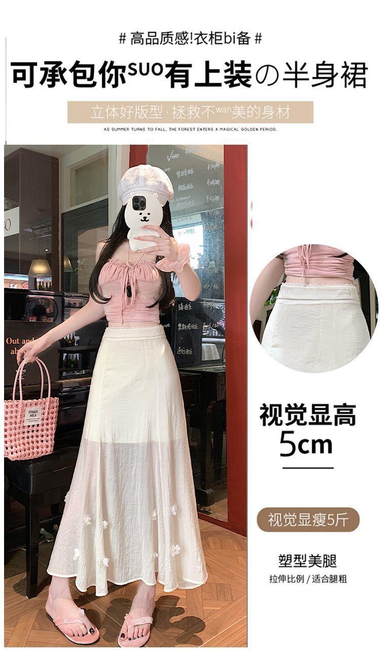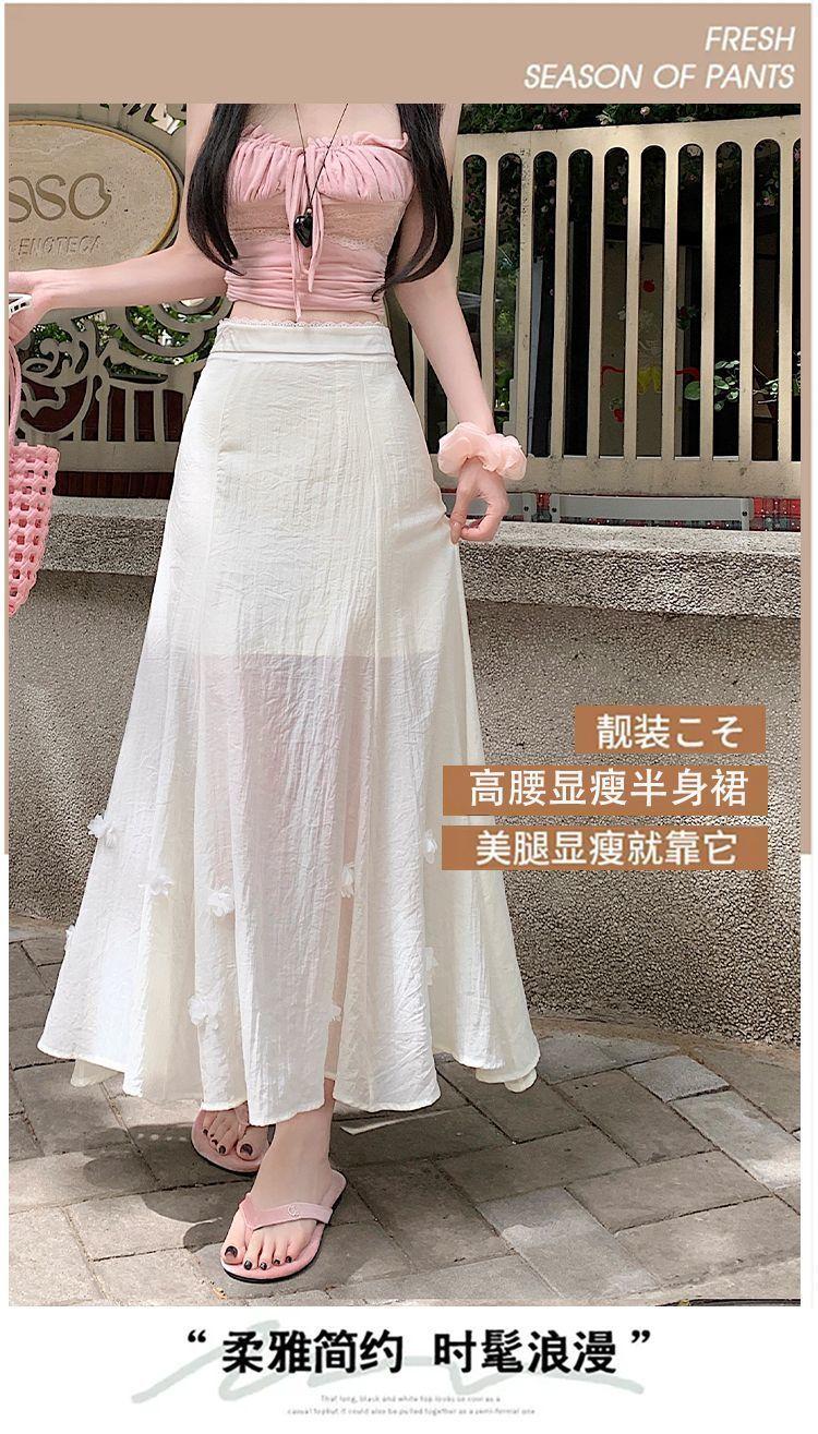 Falda Midi Acampanada Floral 3D Blanca Mujer Verano Temperamento Francés Falda Paraguas Yamamoto Cintura Alta Adelgazante Cola de Pescado Falda Larga