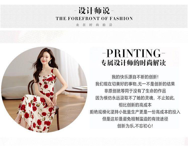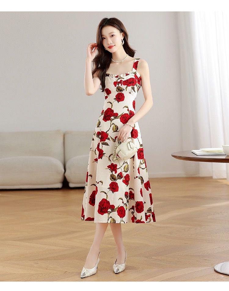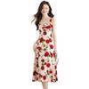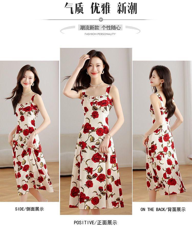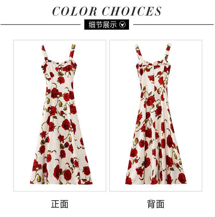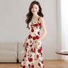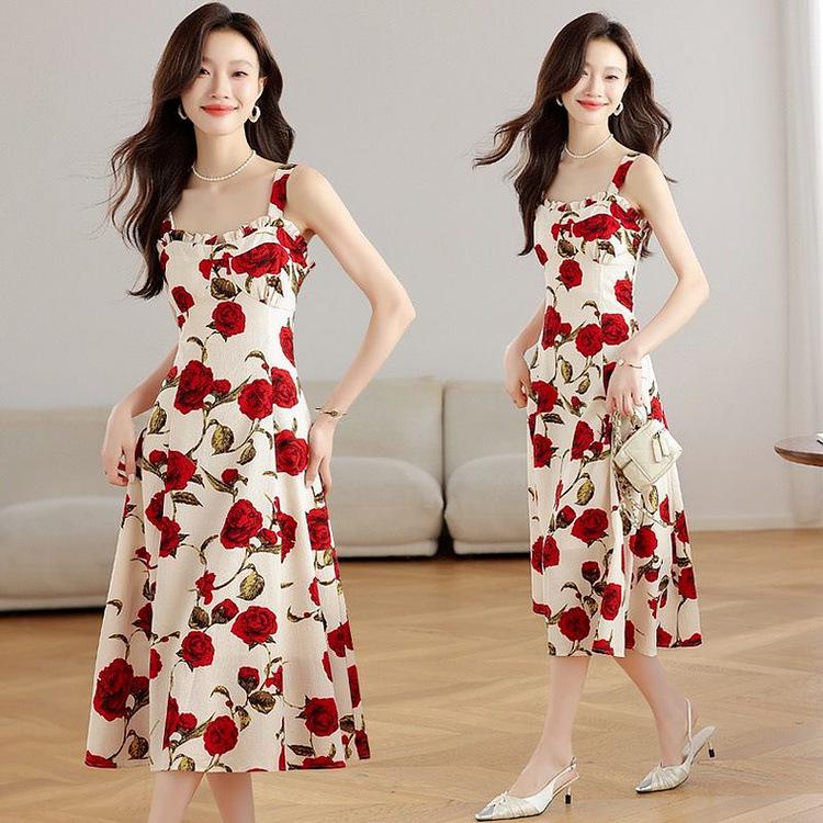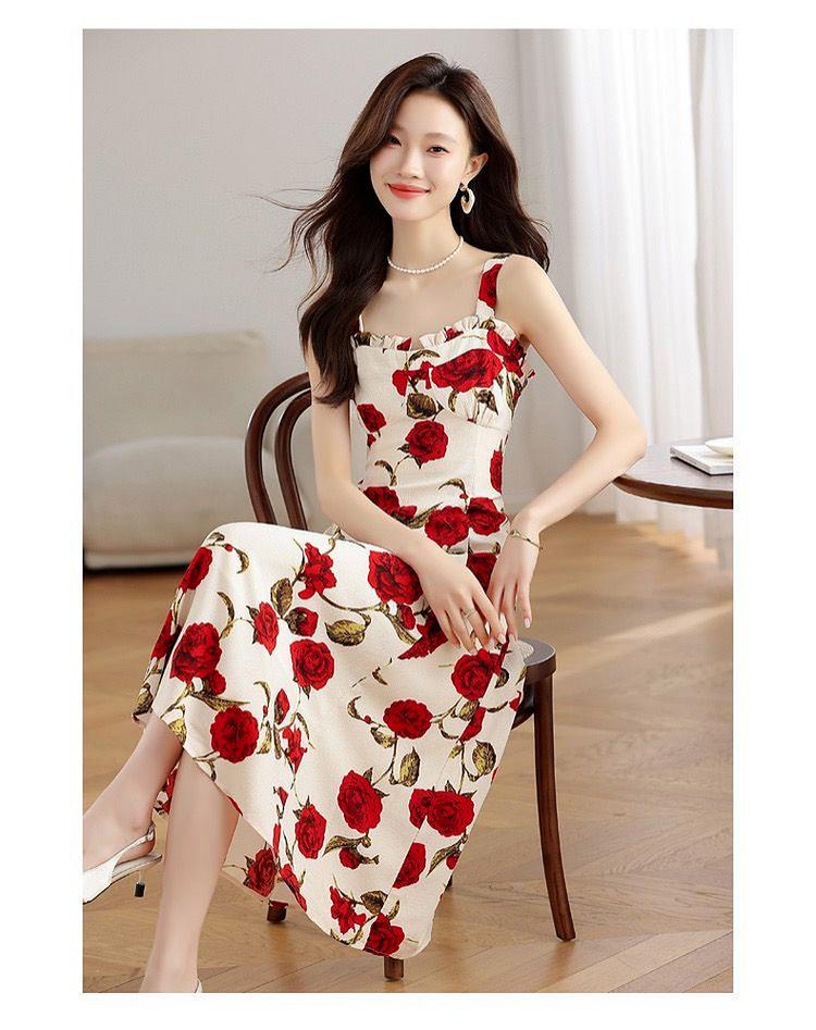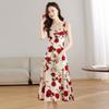 Vestido Floral Rosa Roja para Mujer Verano 2025 Nuevo Vacaciones Junto al Mar Francés Tirantes Falda Ajustada Falda Larga