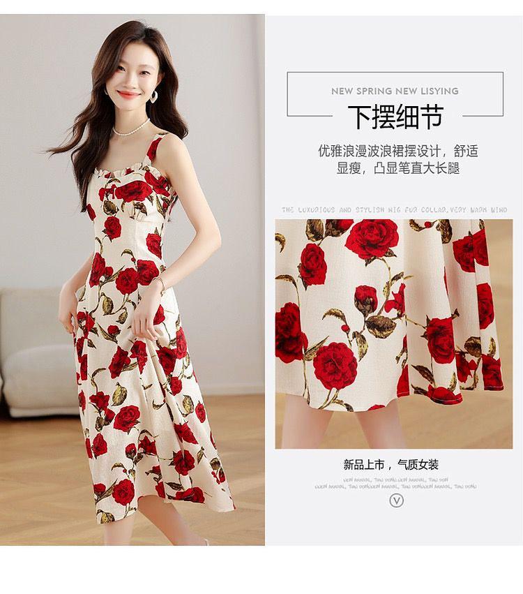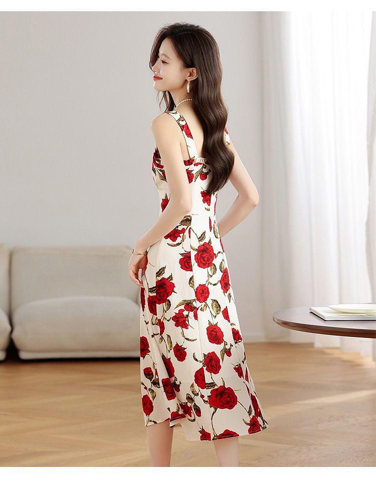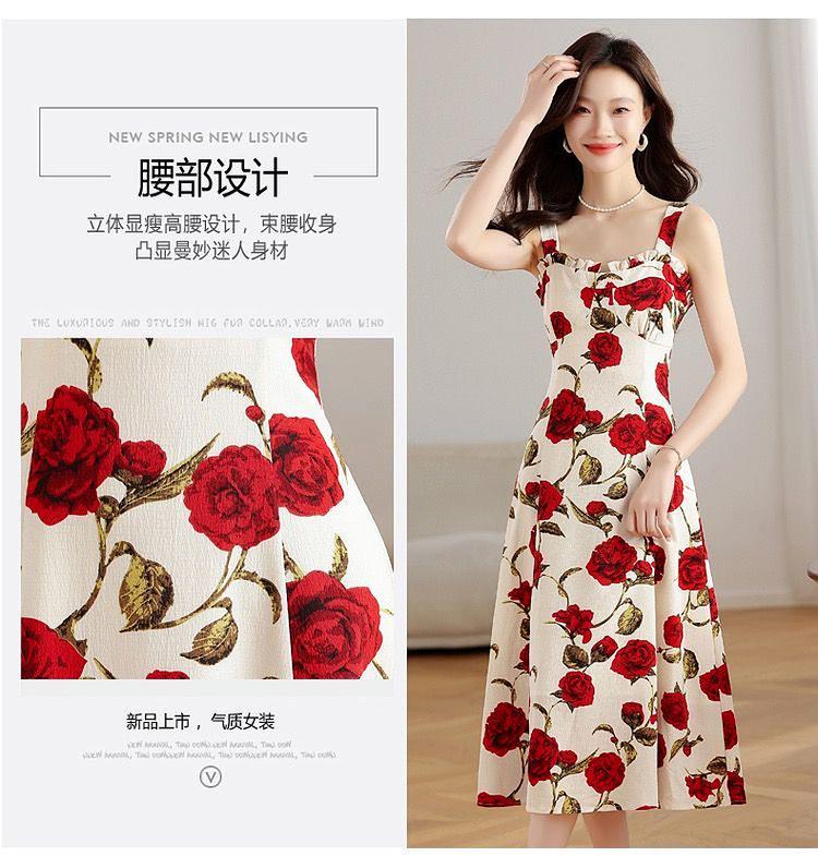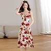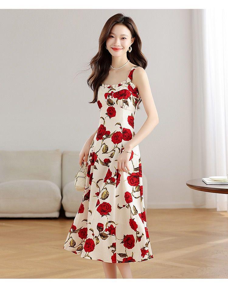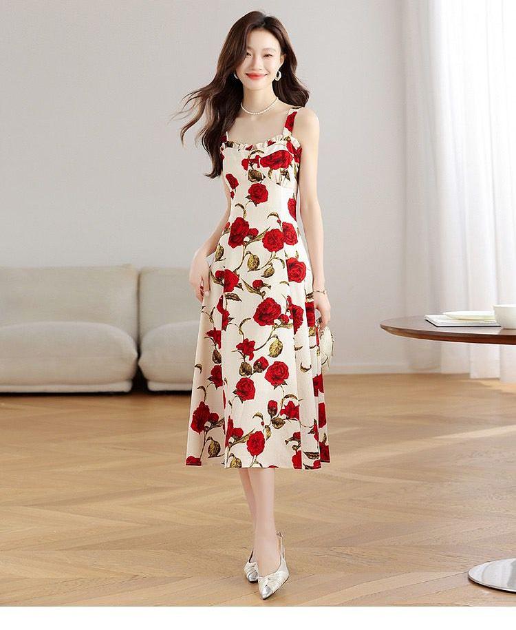 Vestido Floral Rosa Roja para Mujer Verano 2025 Nuevo Vacaciones Junto al Mar Francés Tirantes Falda Ajustada Falda Larga