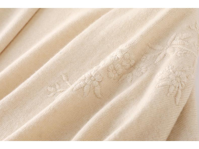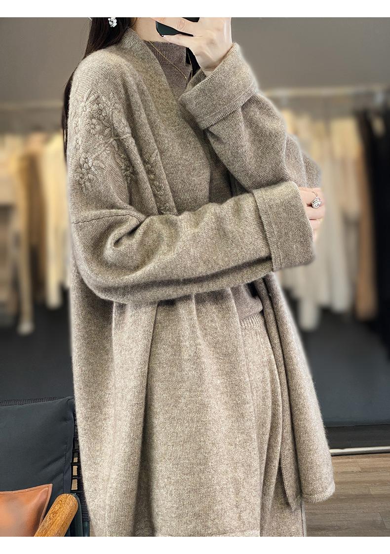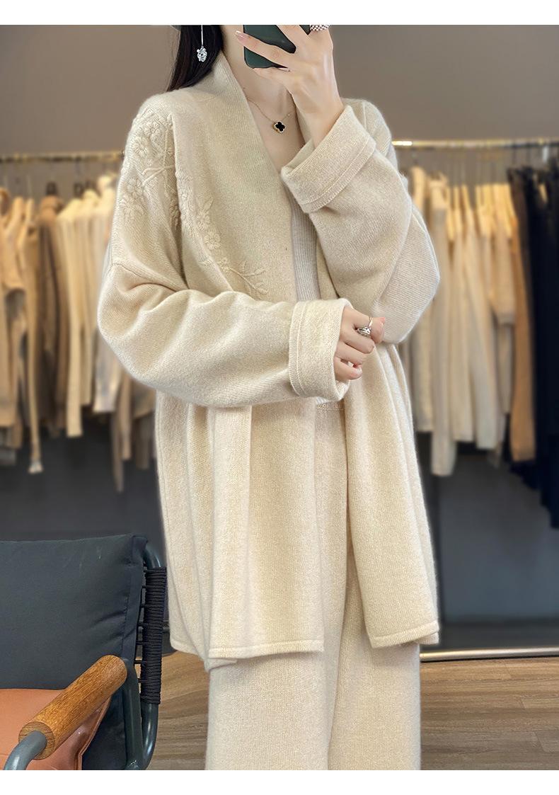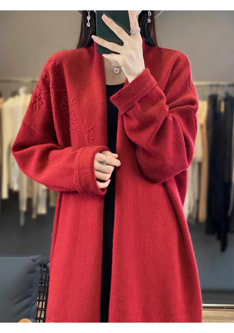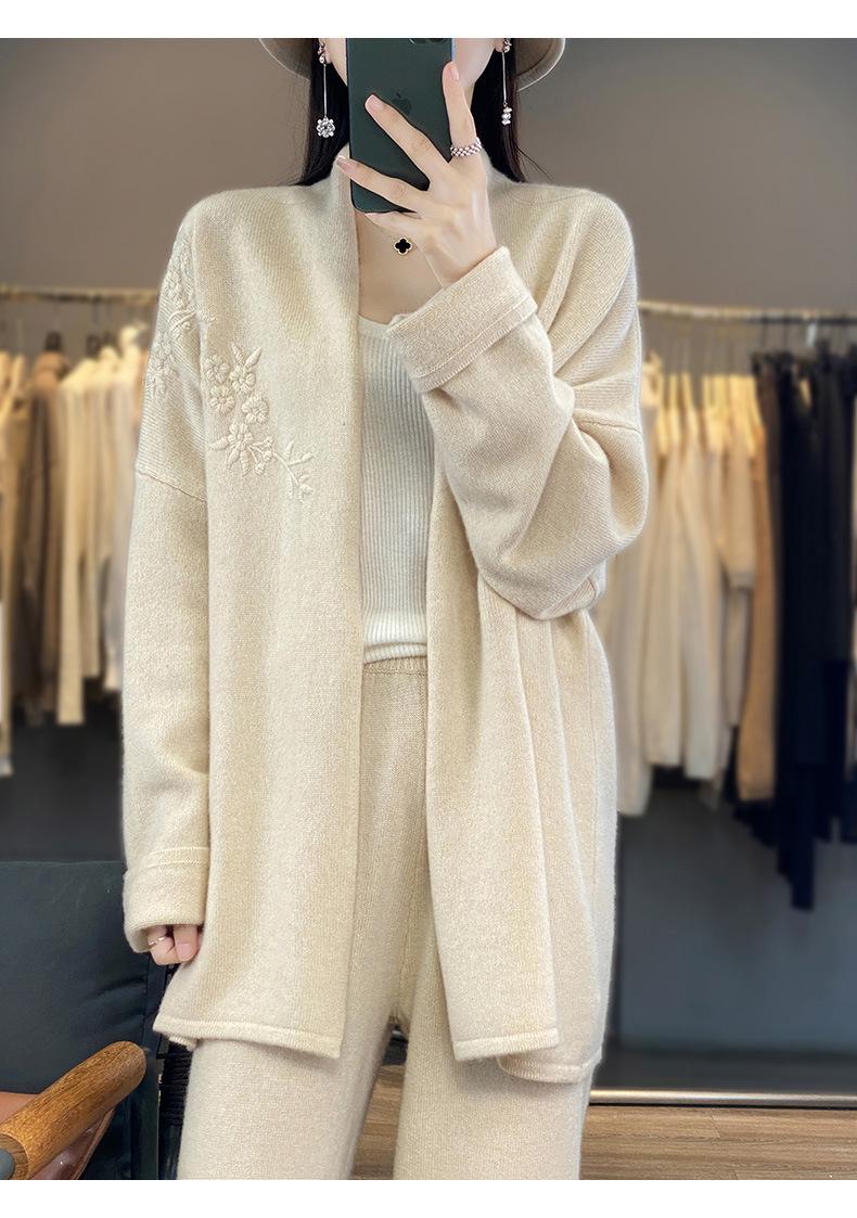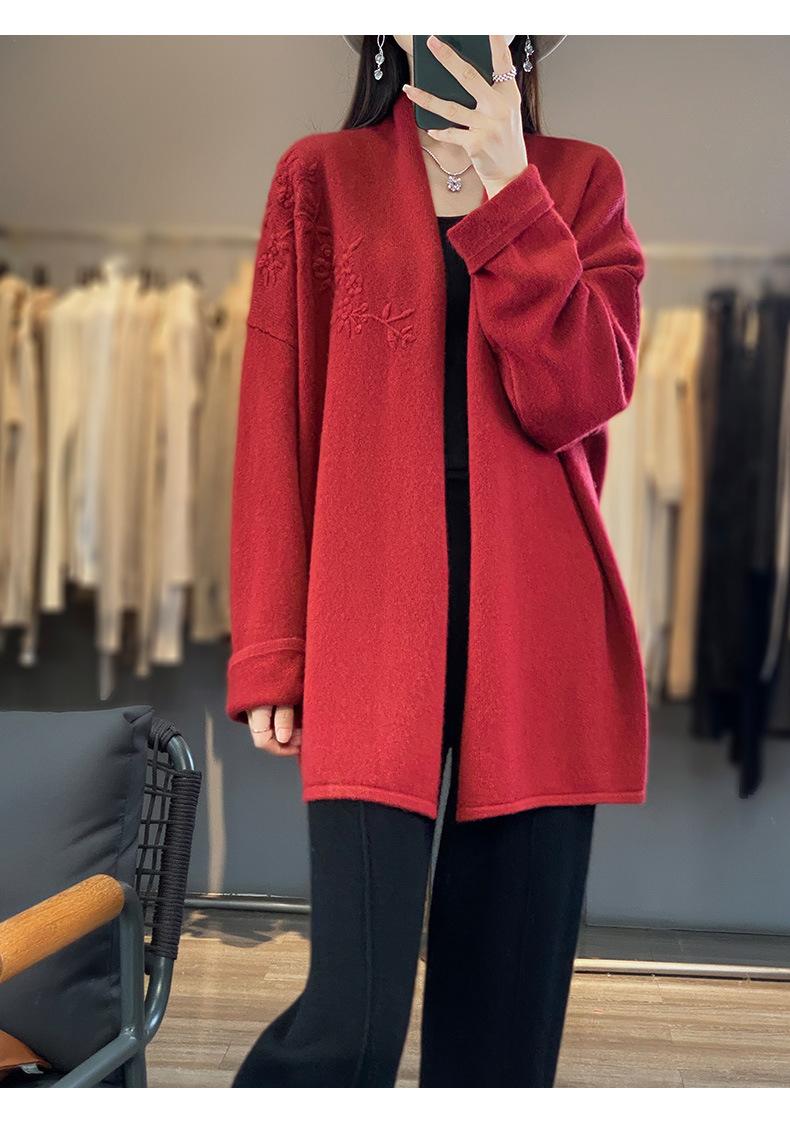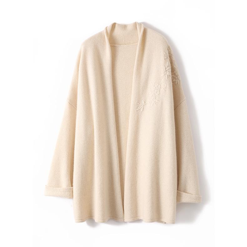 2025 Nuevo Cárdigan de Punto de Lana Pura con Cuello en V para Mujer, Bordado, Holgado, Casual, Color Sólido, Sin Botones, Largo Medio, Chal Grande