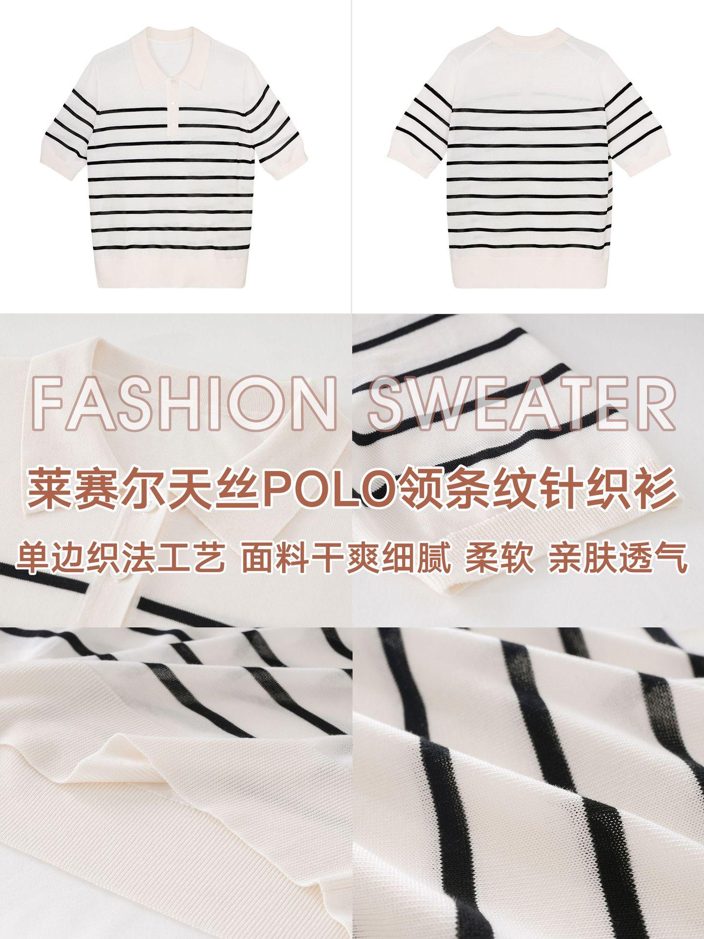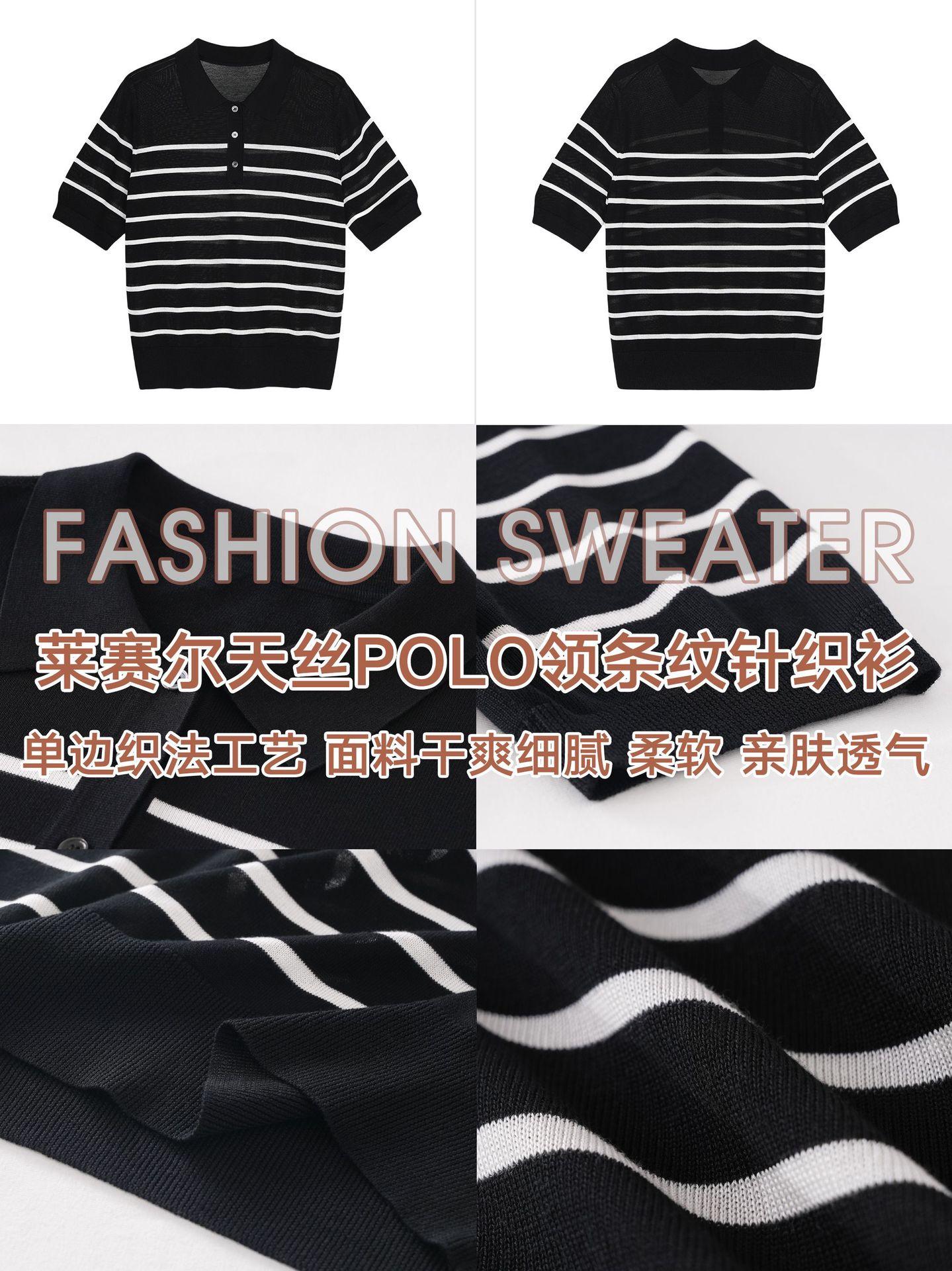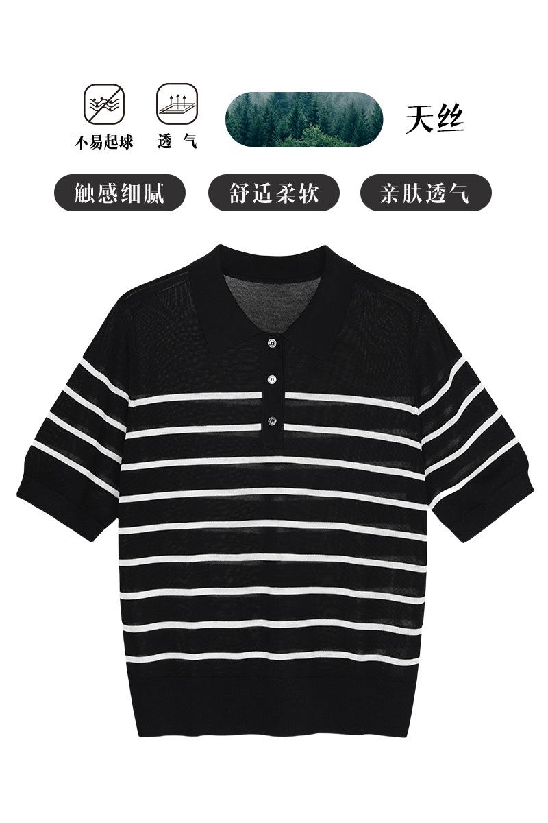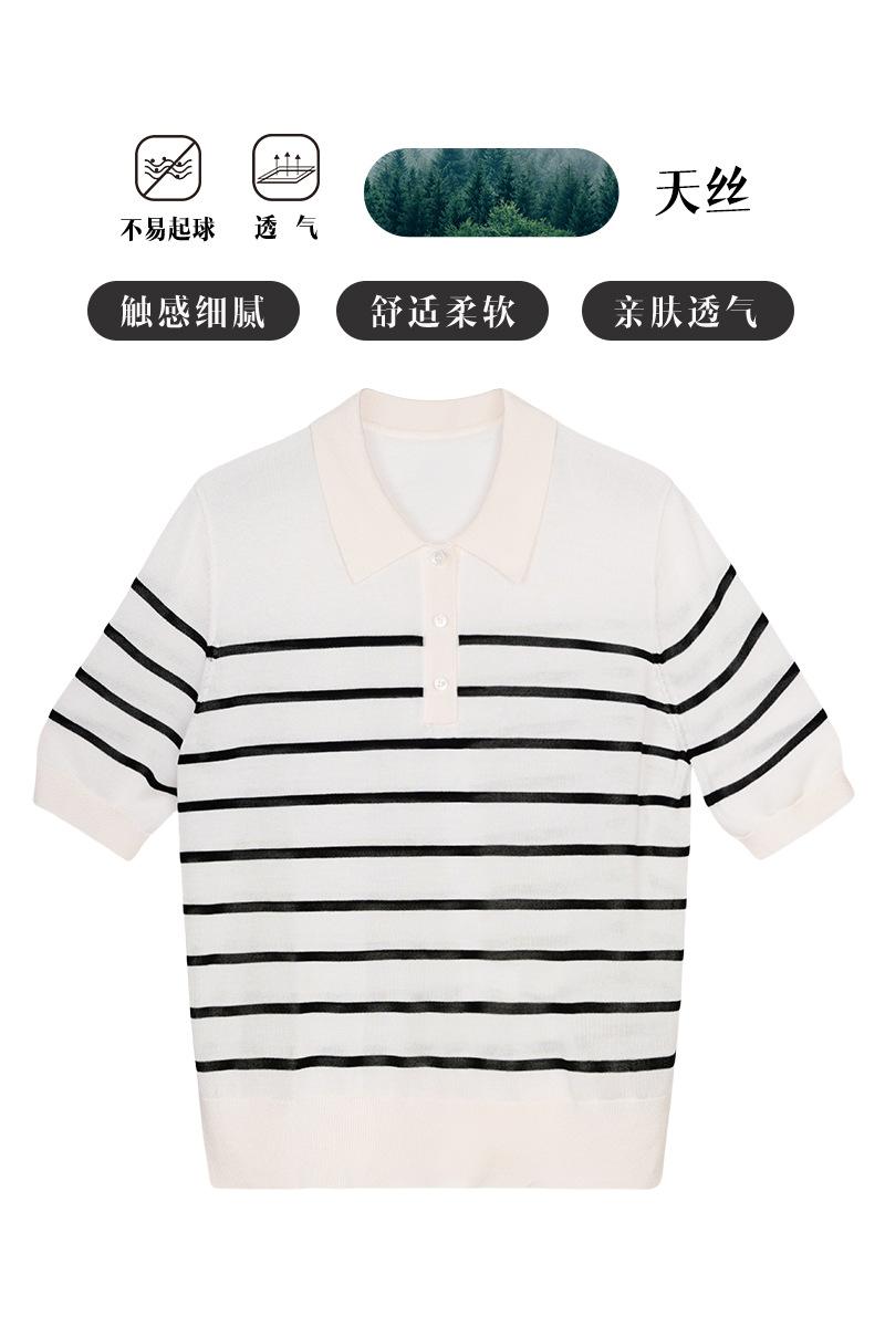 Suéter de Punto Clásico a Rayas 100 Tencel Lythel para Mujer Verano Delgado Ligero Maduro Estilo Dinero Manga Corta Cuello Polo Top
