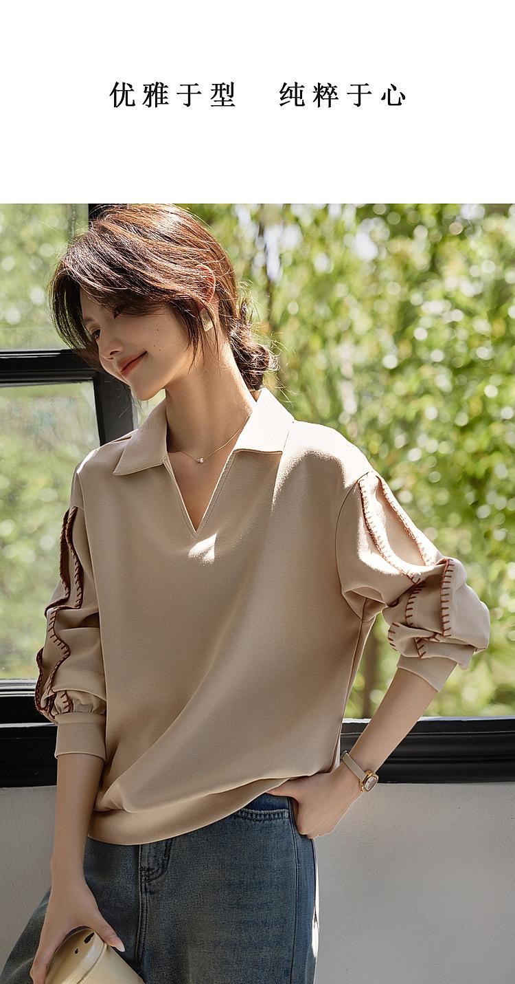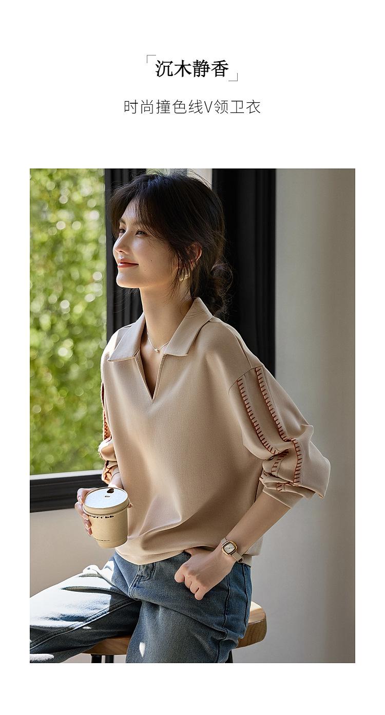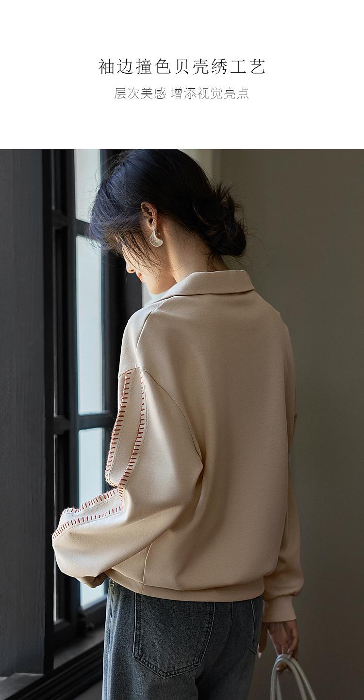 Sudadera de Moda Casual con Bloque de Color y Bordado de Concha para Mujer Primavera 2025 Algodón Cuello en V Estilo Lazy Top Chic