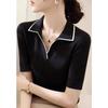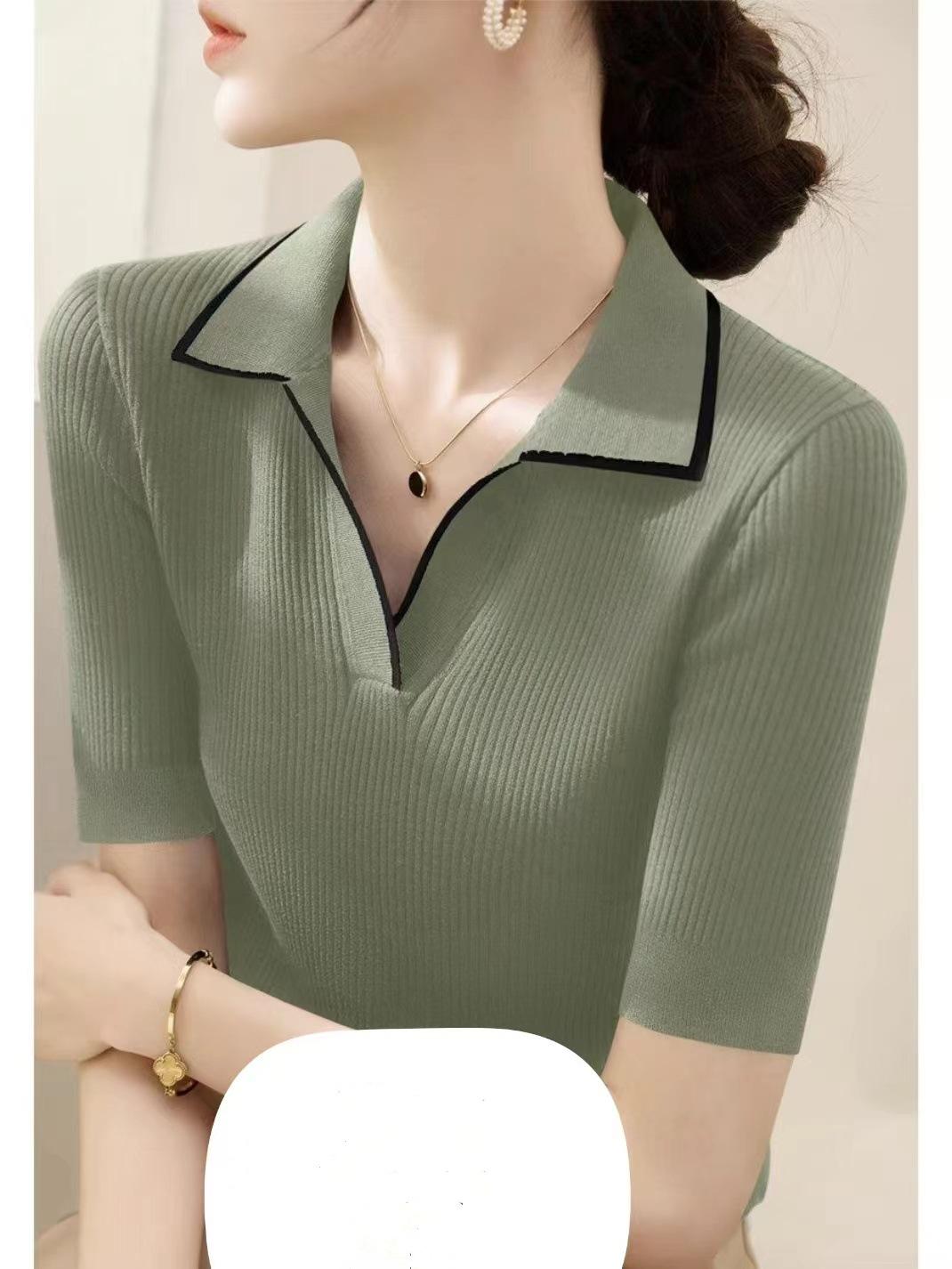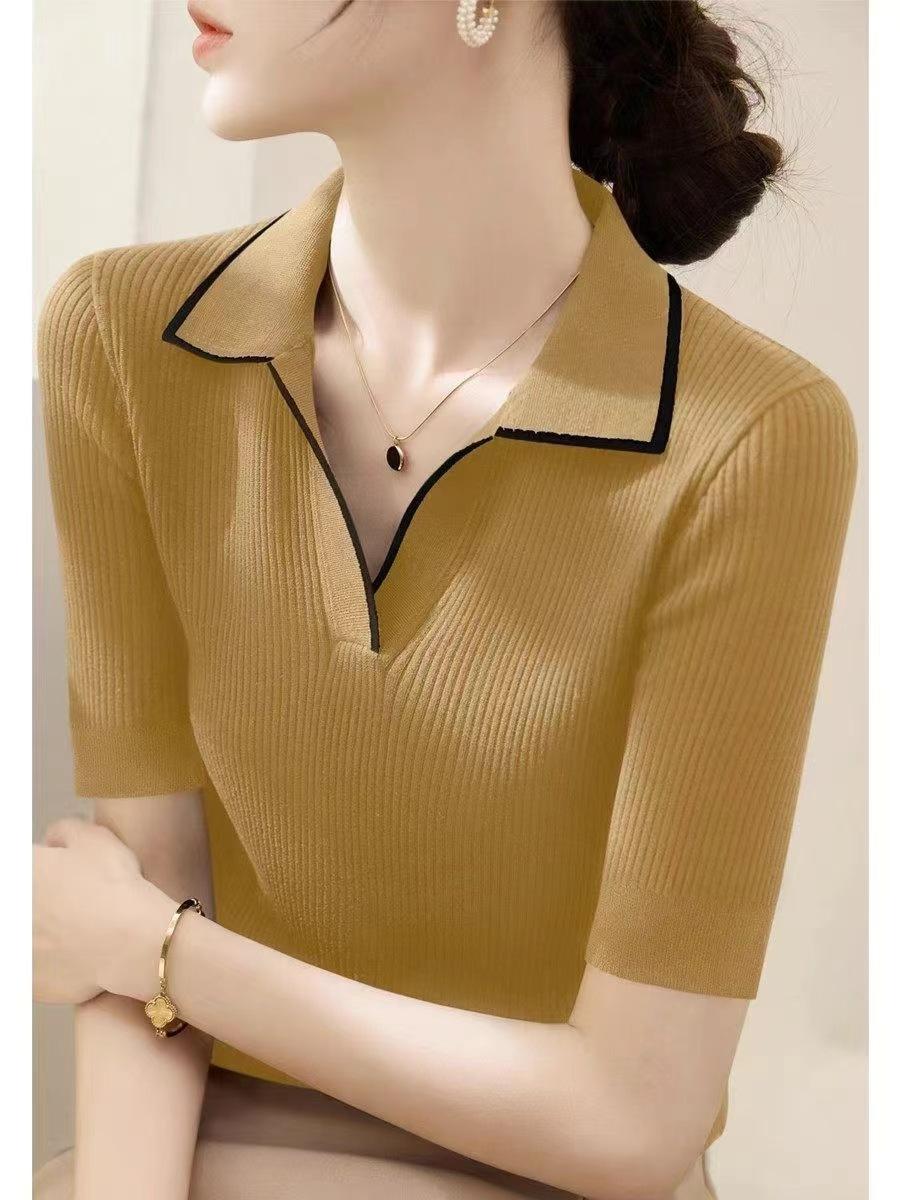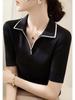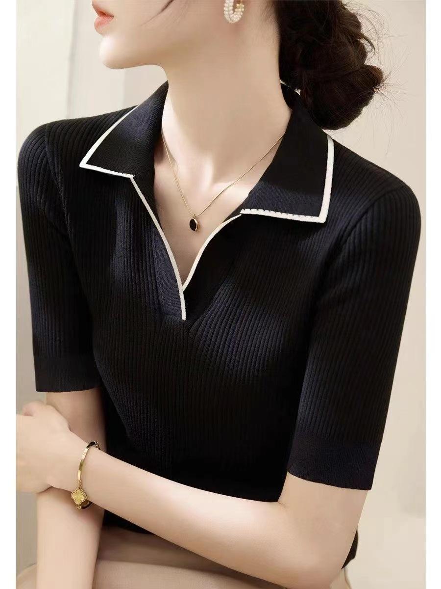 2025 Verano Nuevo Camiseta de Punto de Manga Corta Adelgazante de Corte Ceñido para Mujer Negra Chic Color-block Cuello Polo Camiseta Top