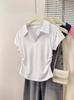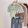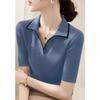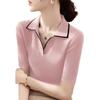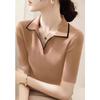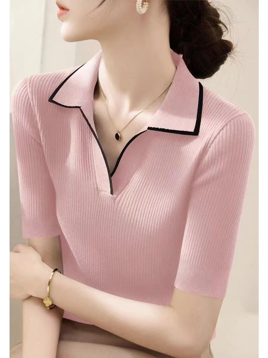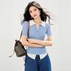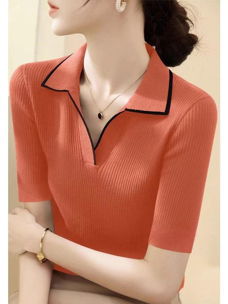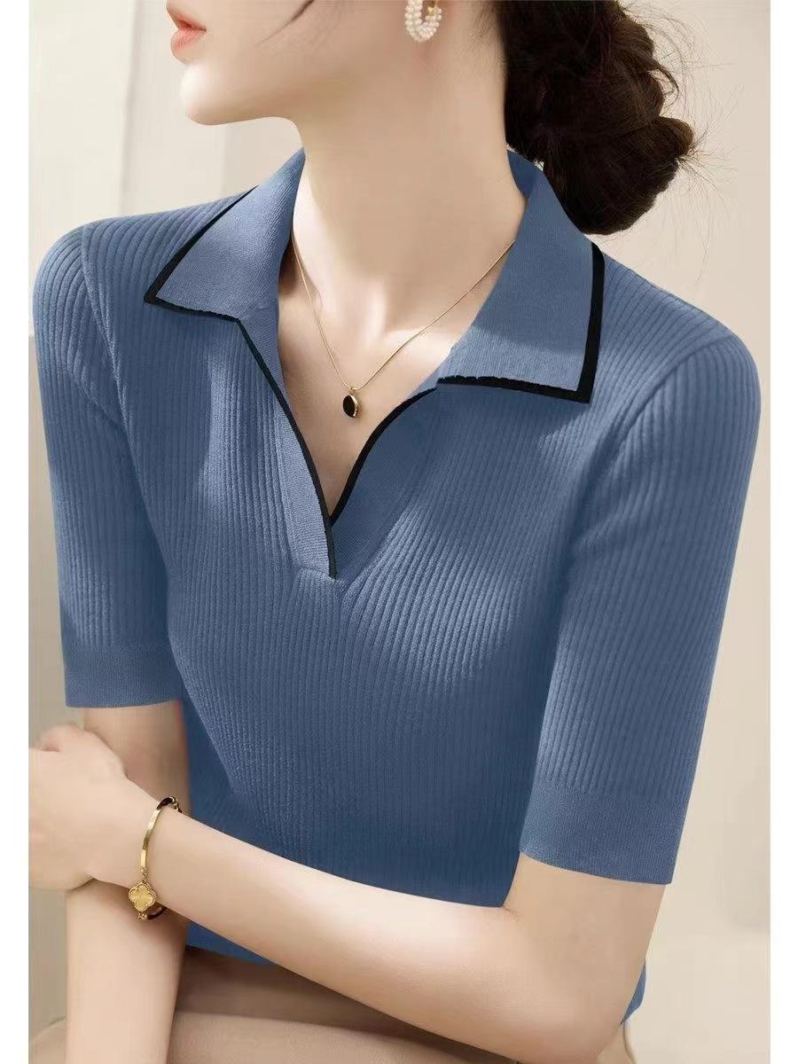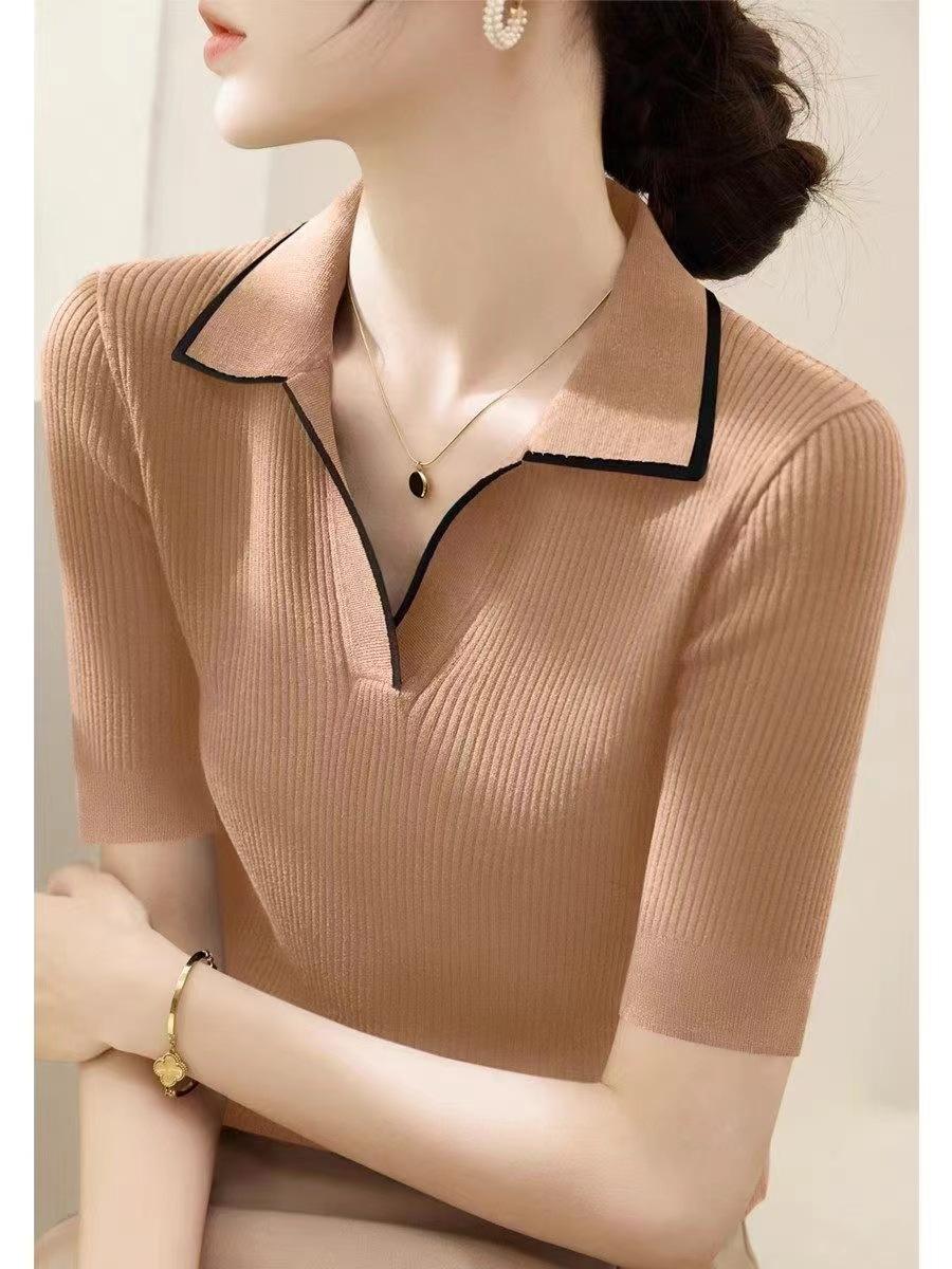 2025 Verano Nuevo Camiseta de Punto de Manga Corta Adelgazante de Corte Ceñido para Mujer Negra Chic Color-block Cuello Polo Camiseta Top