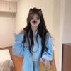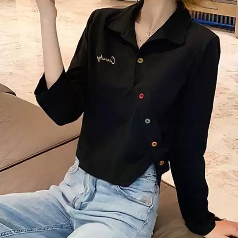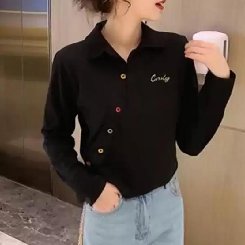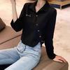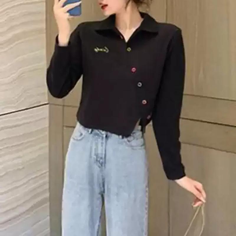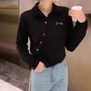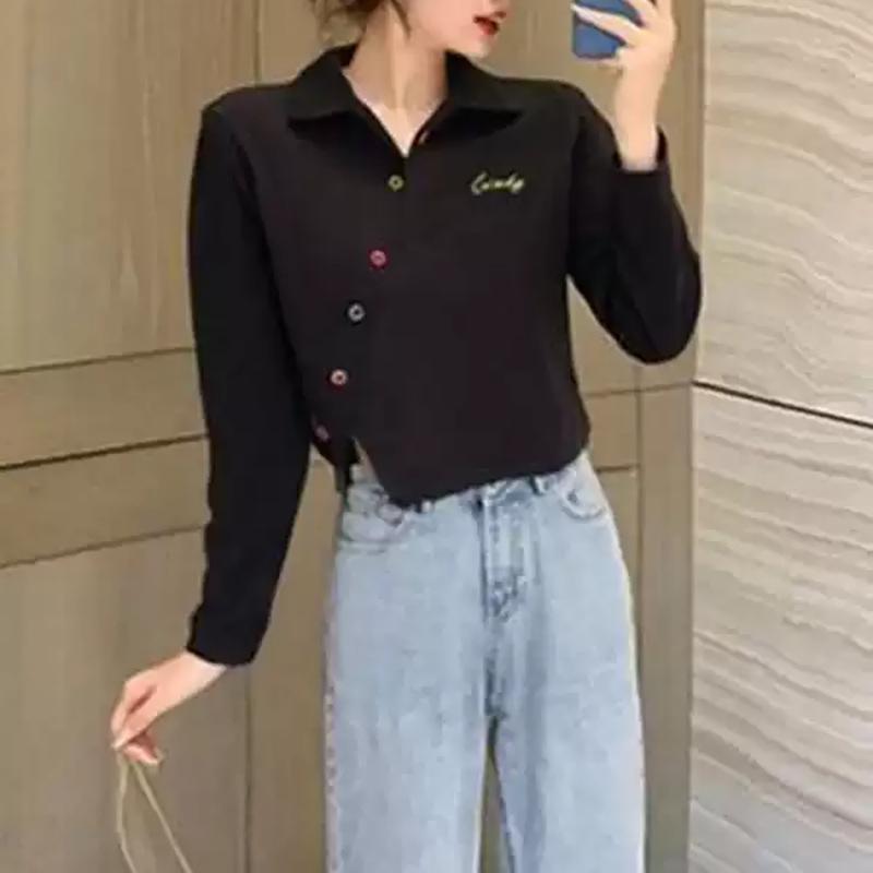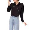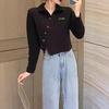 Top estilo coreano otoño y primavera versátil negro solapa diseño nicho camiseta corta de manga larga para mujer adelgazante