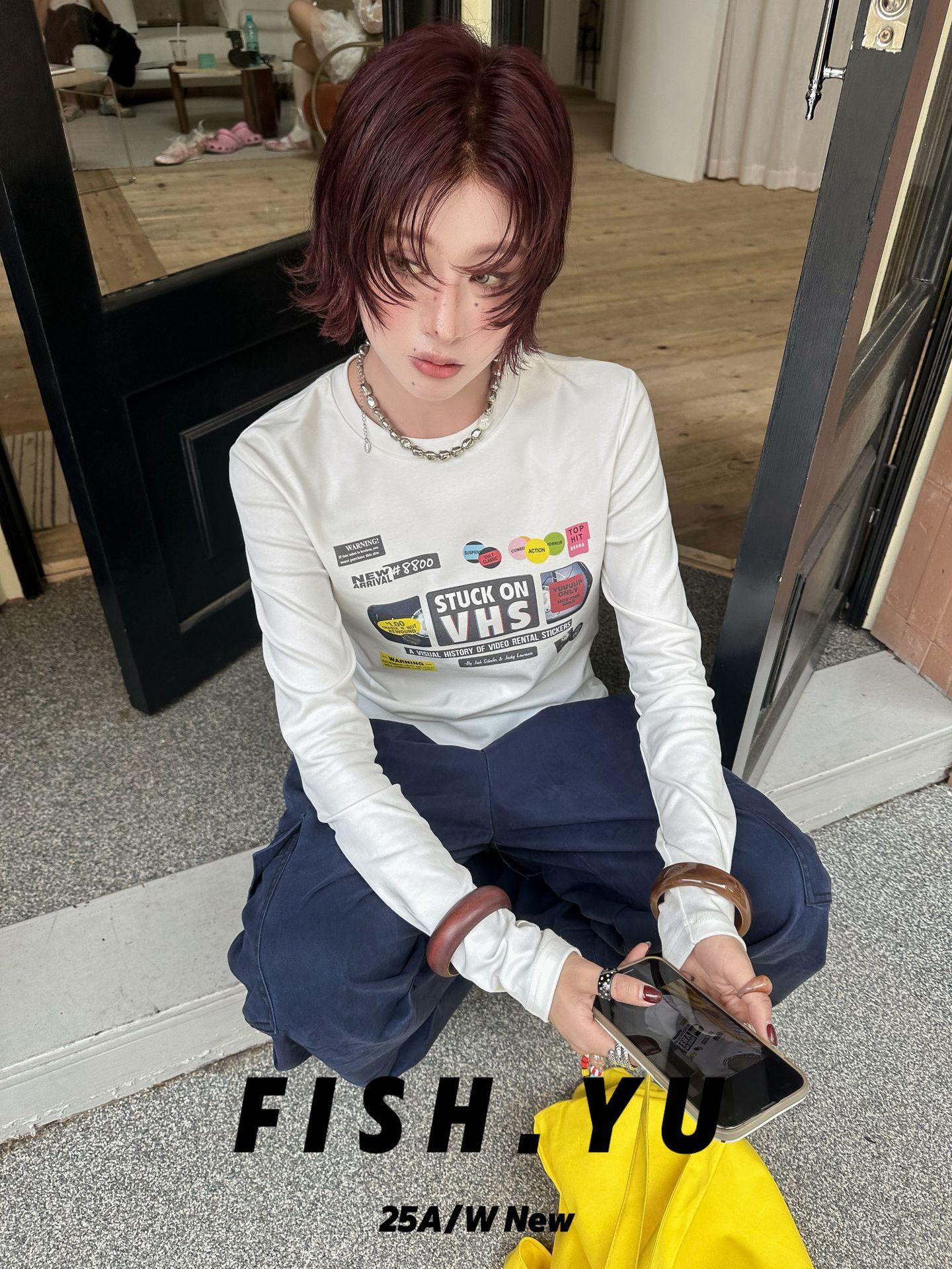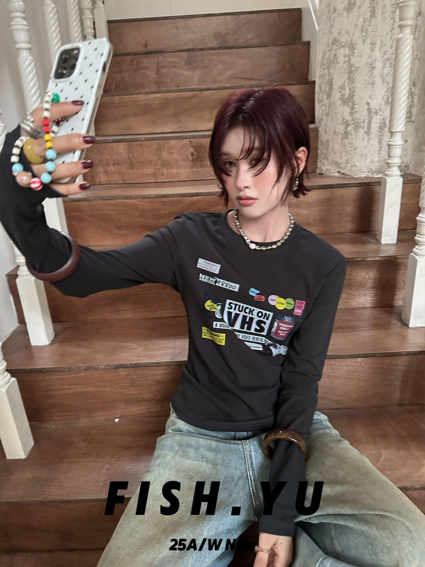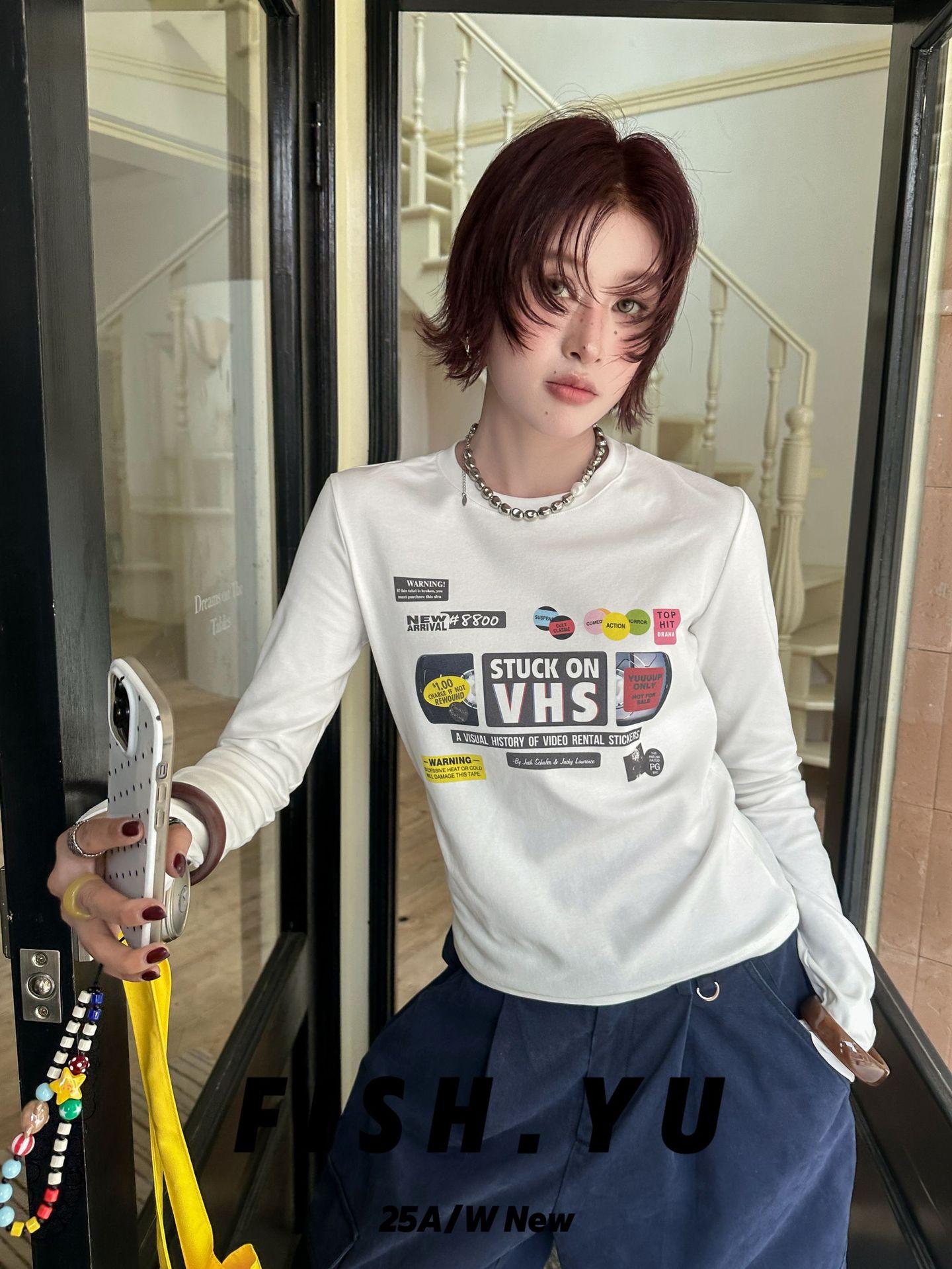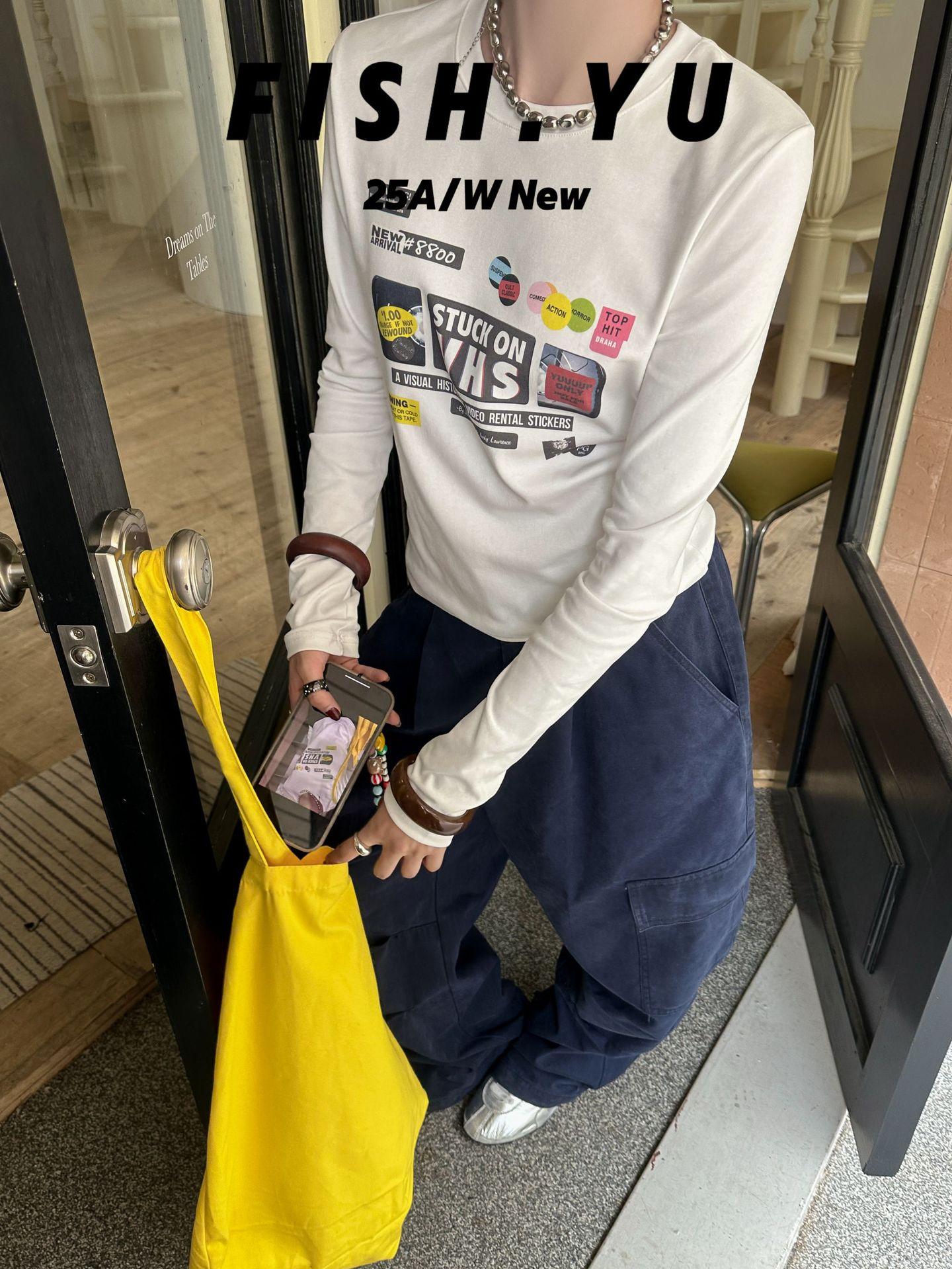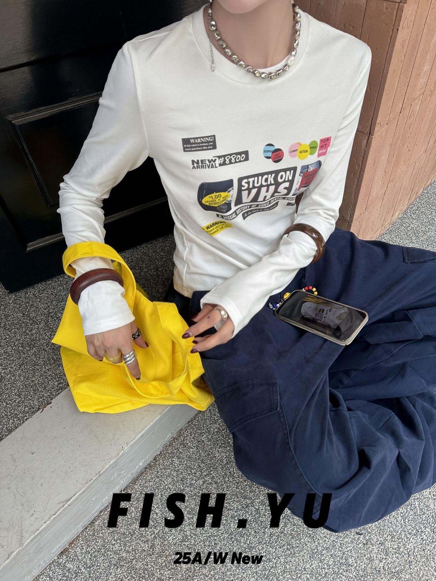 FISHYU Trece Líneas Principios de Otoño Nuevo Americano Retro Estampado de Letras Stretch Recto Hombro Pequeña Versión Camiseta Manga Larga 25589