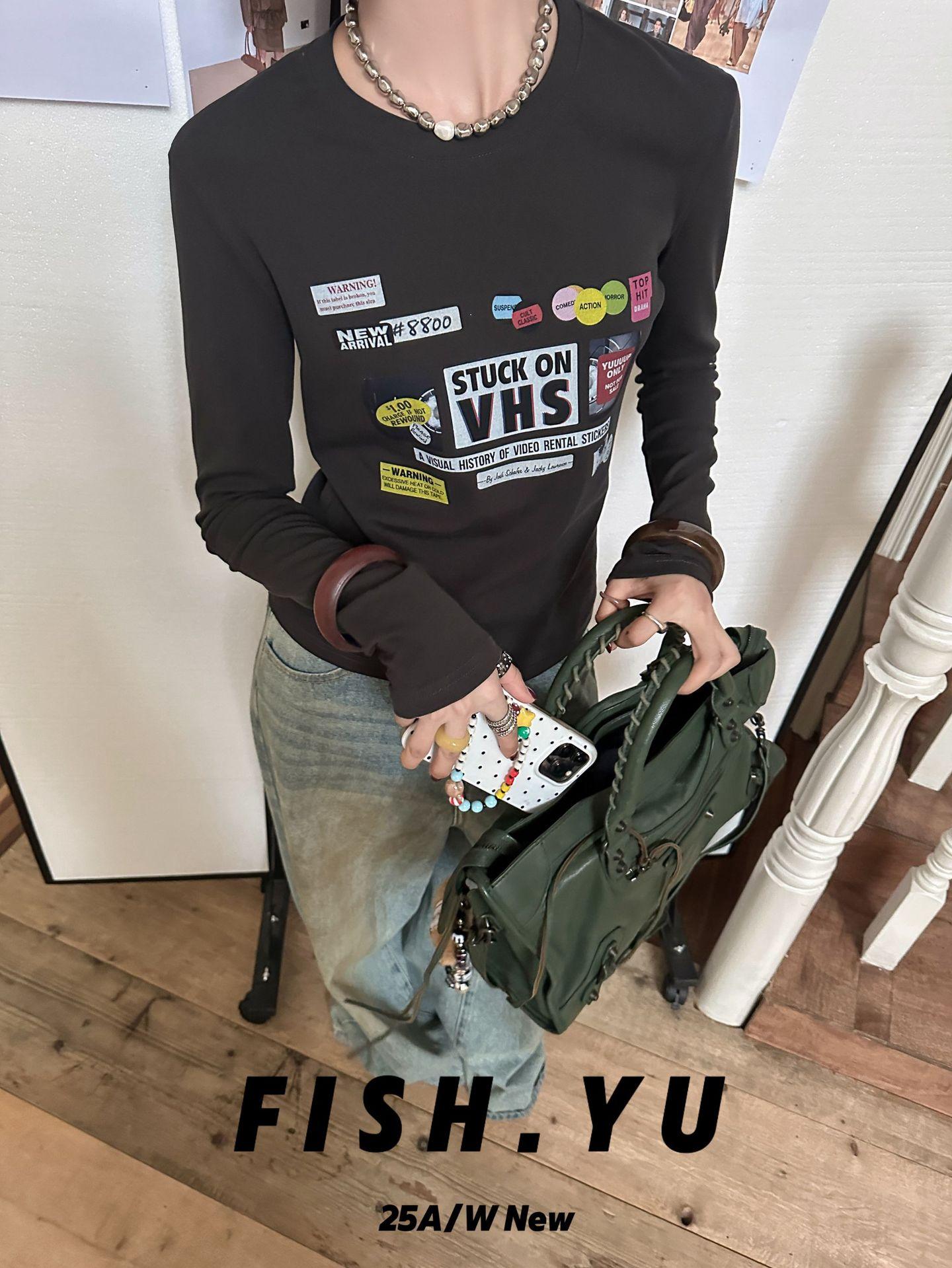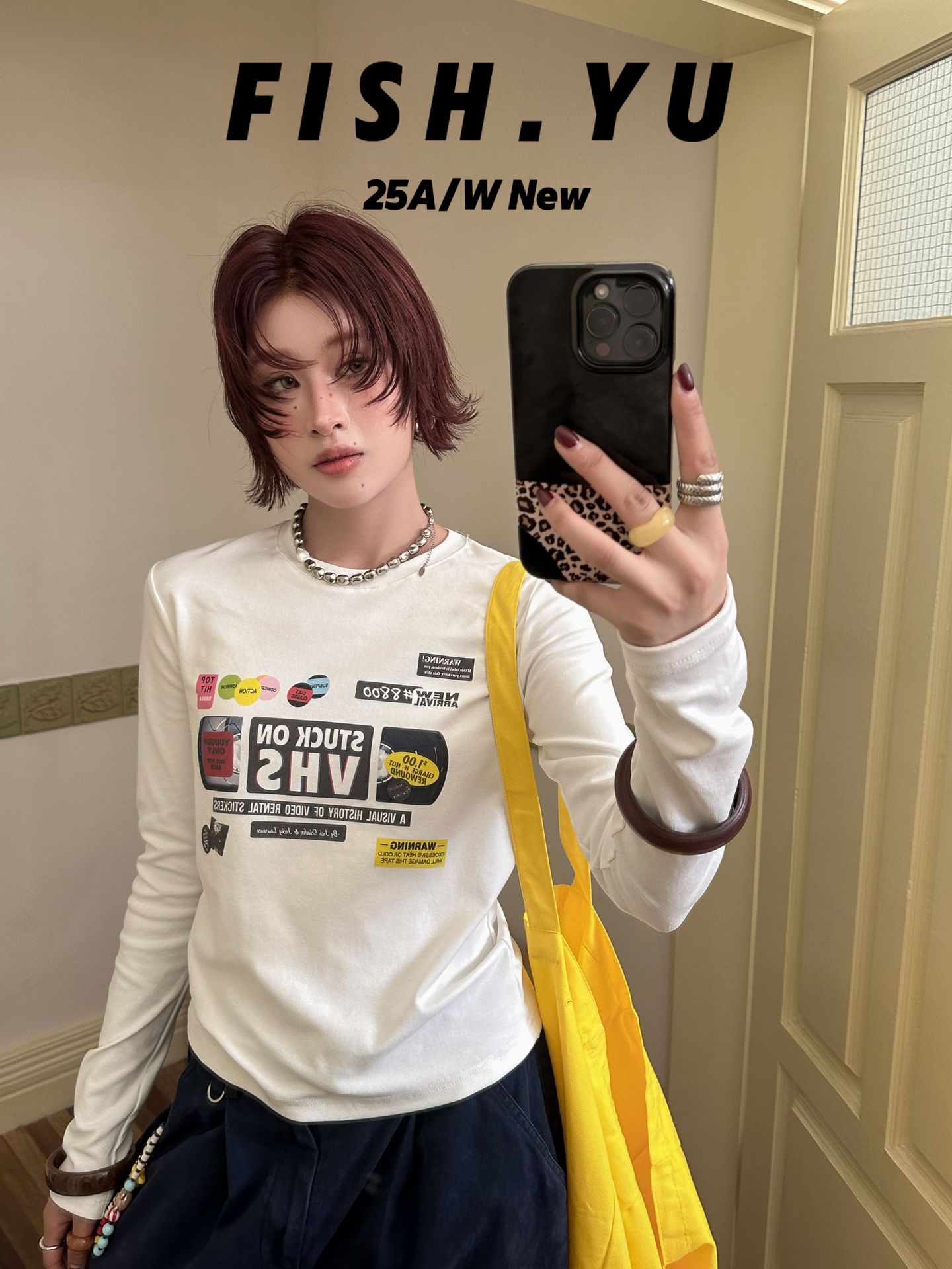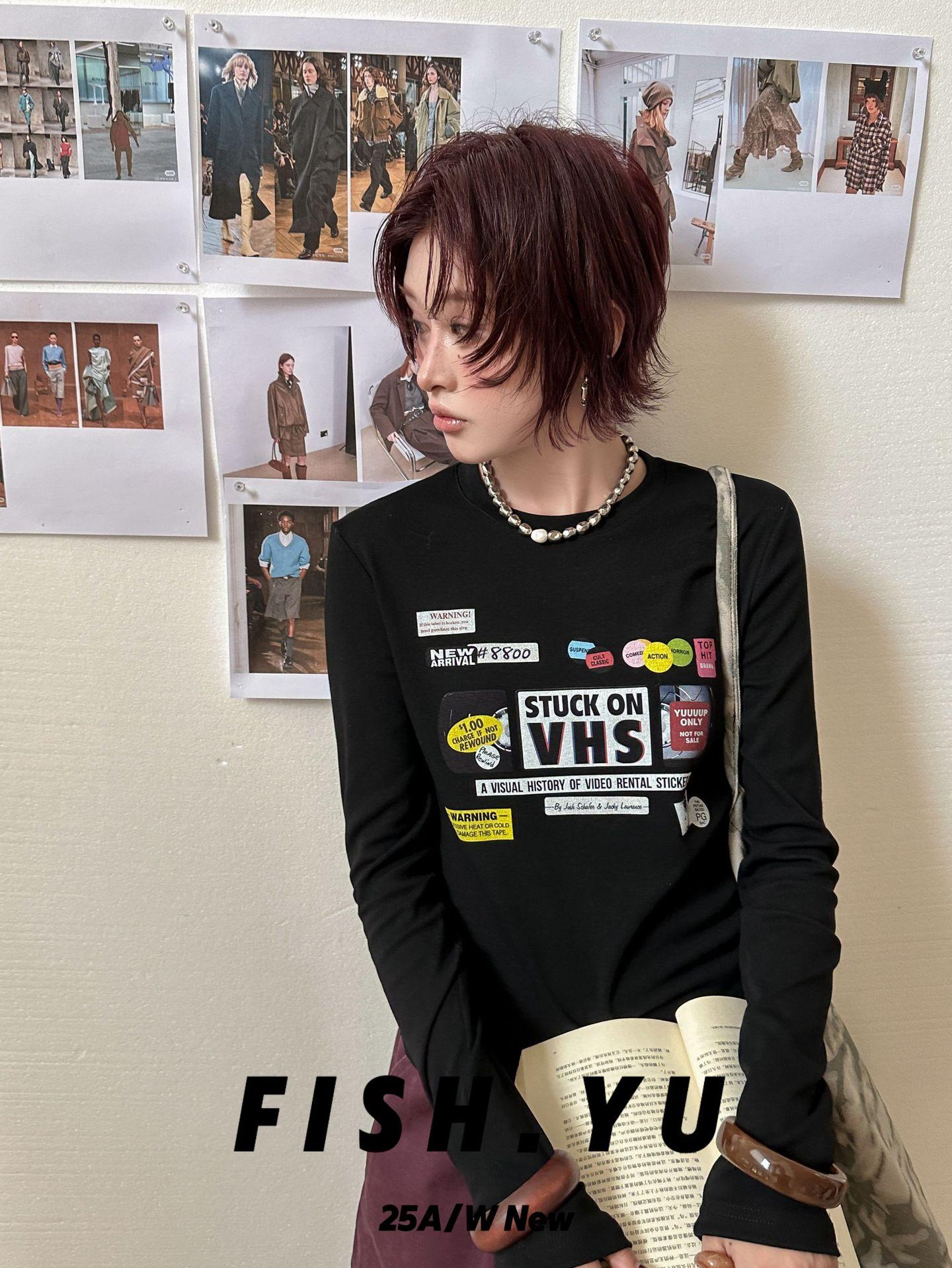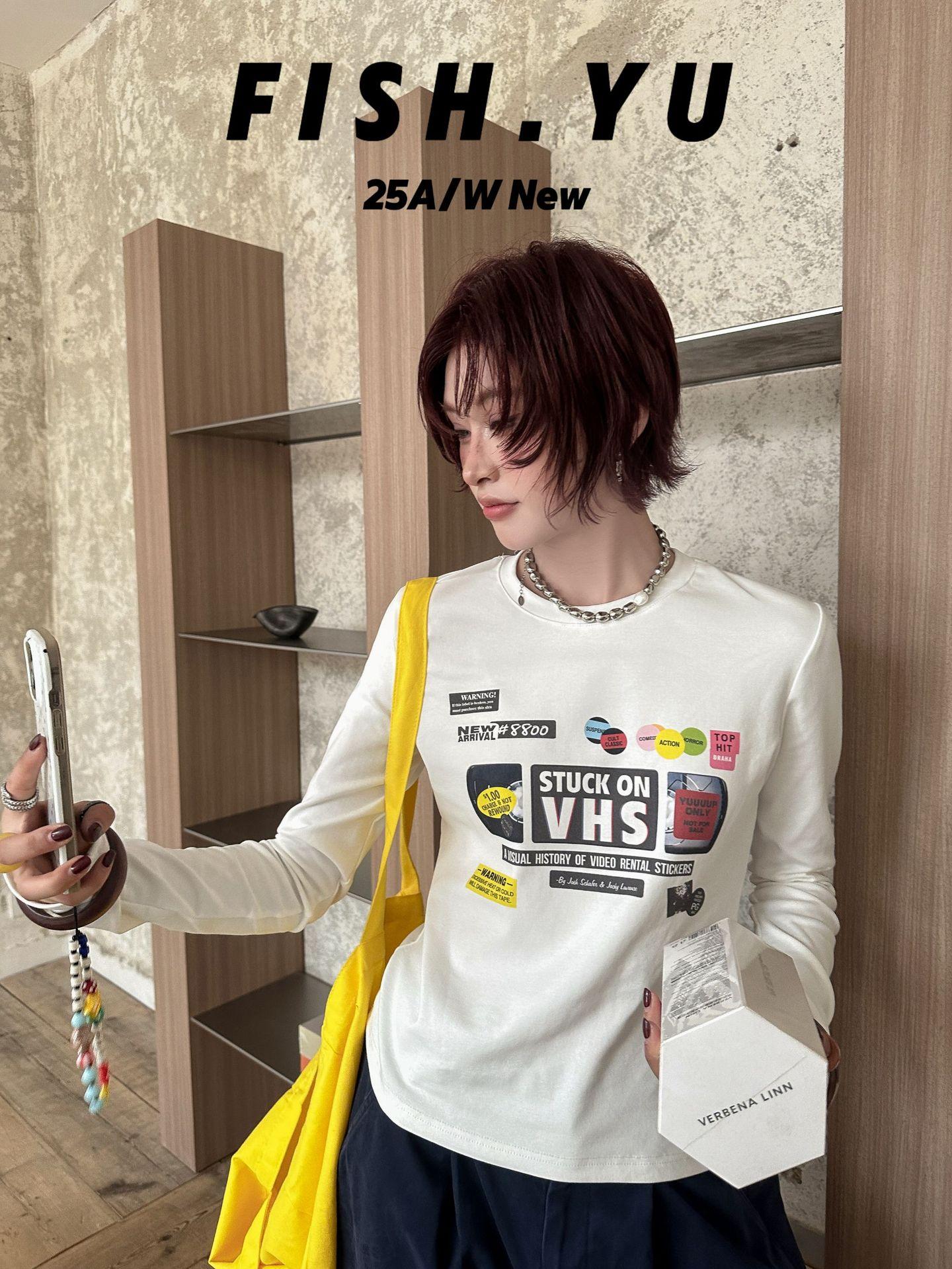 FISHYU Trece Líneas Principios de Otoño Nuevo Americano Retro Estampado de Letras Stretch Recto Hombro Pequeña Versión Camiseta Manga Larga 25589