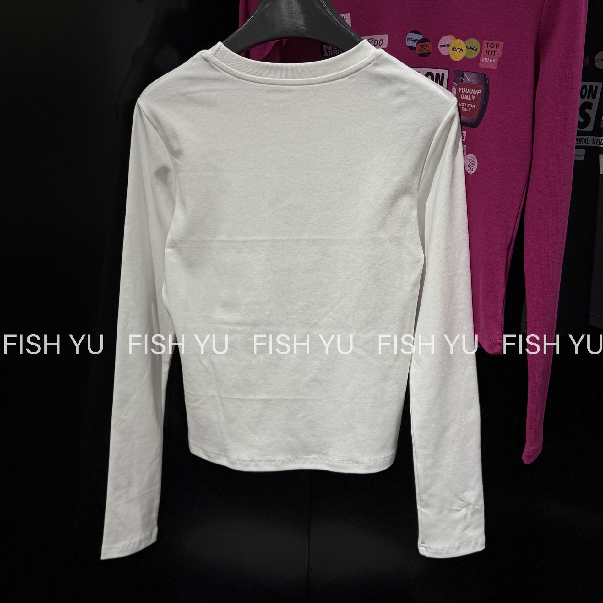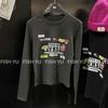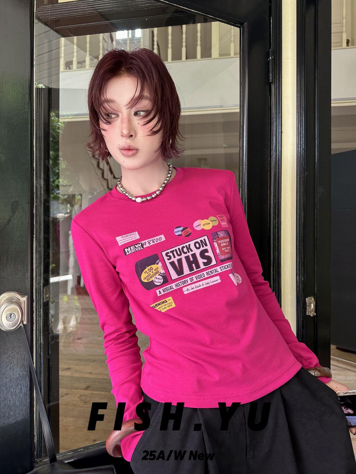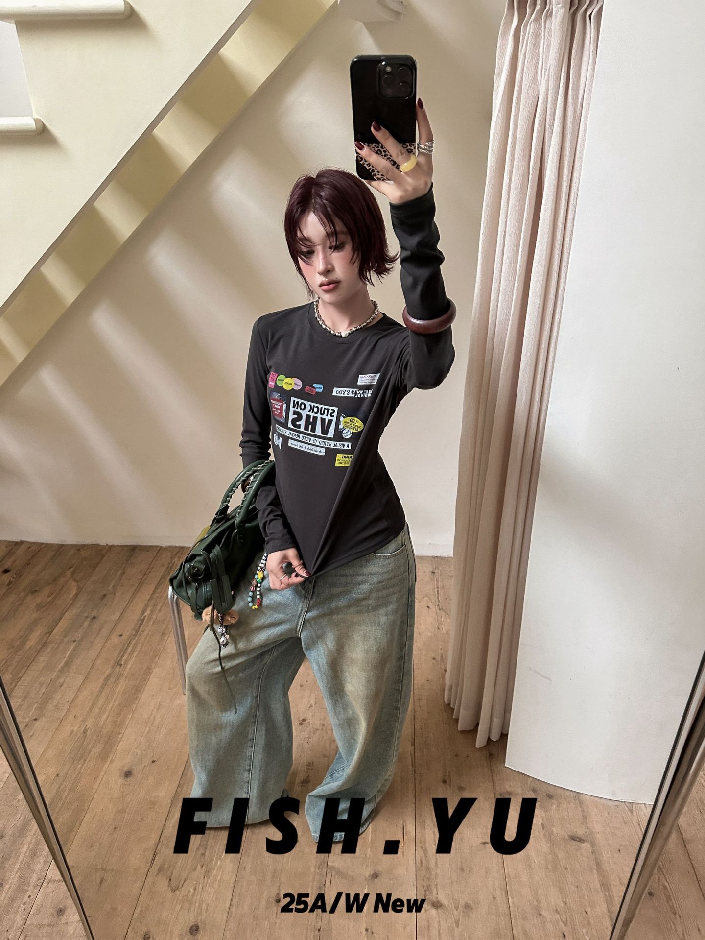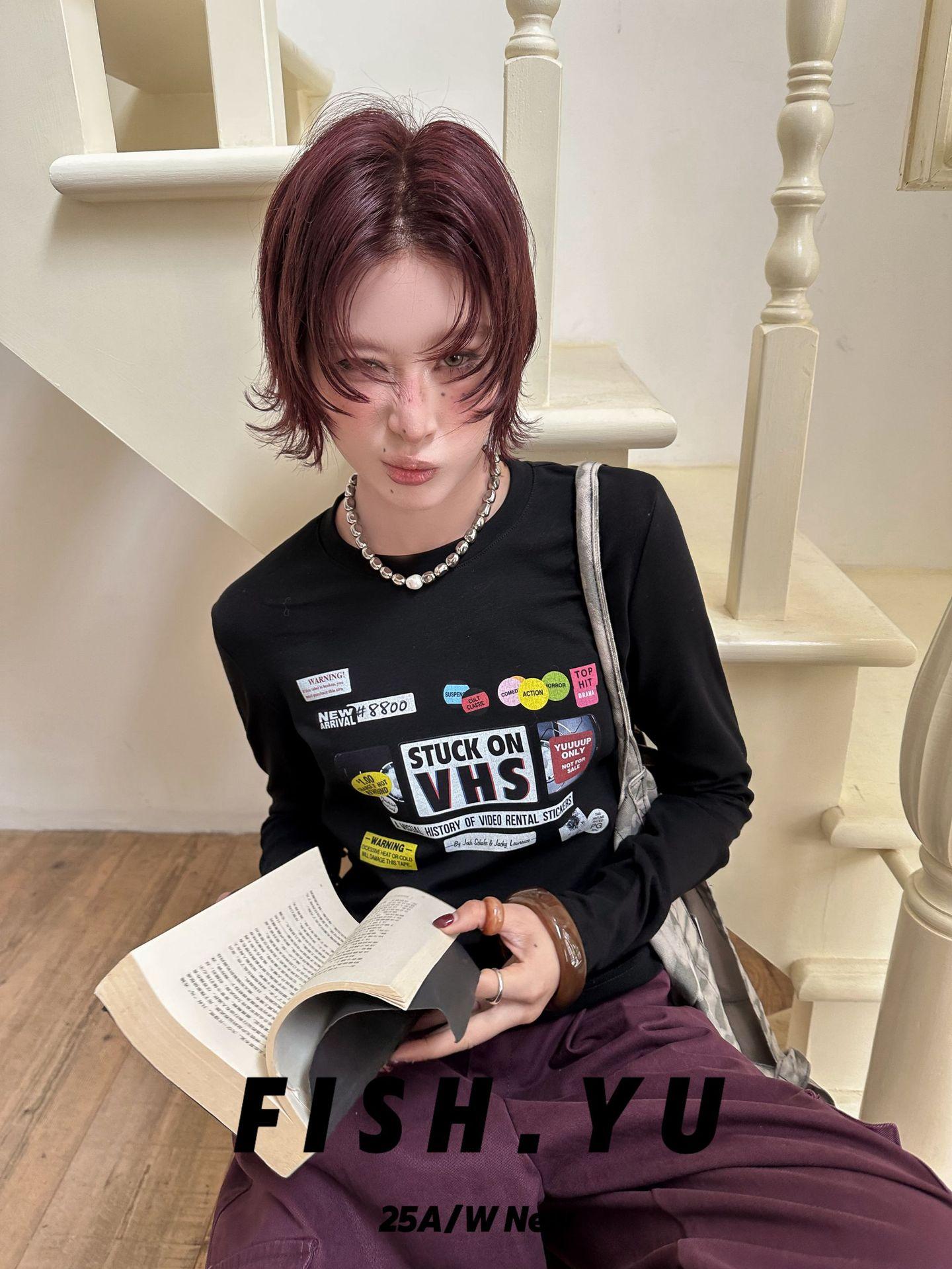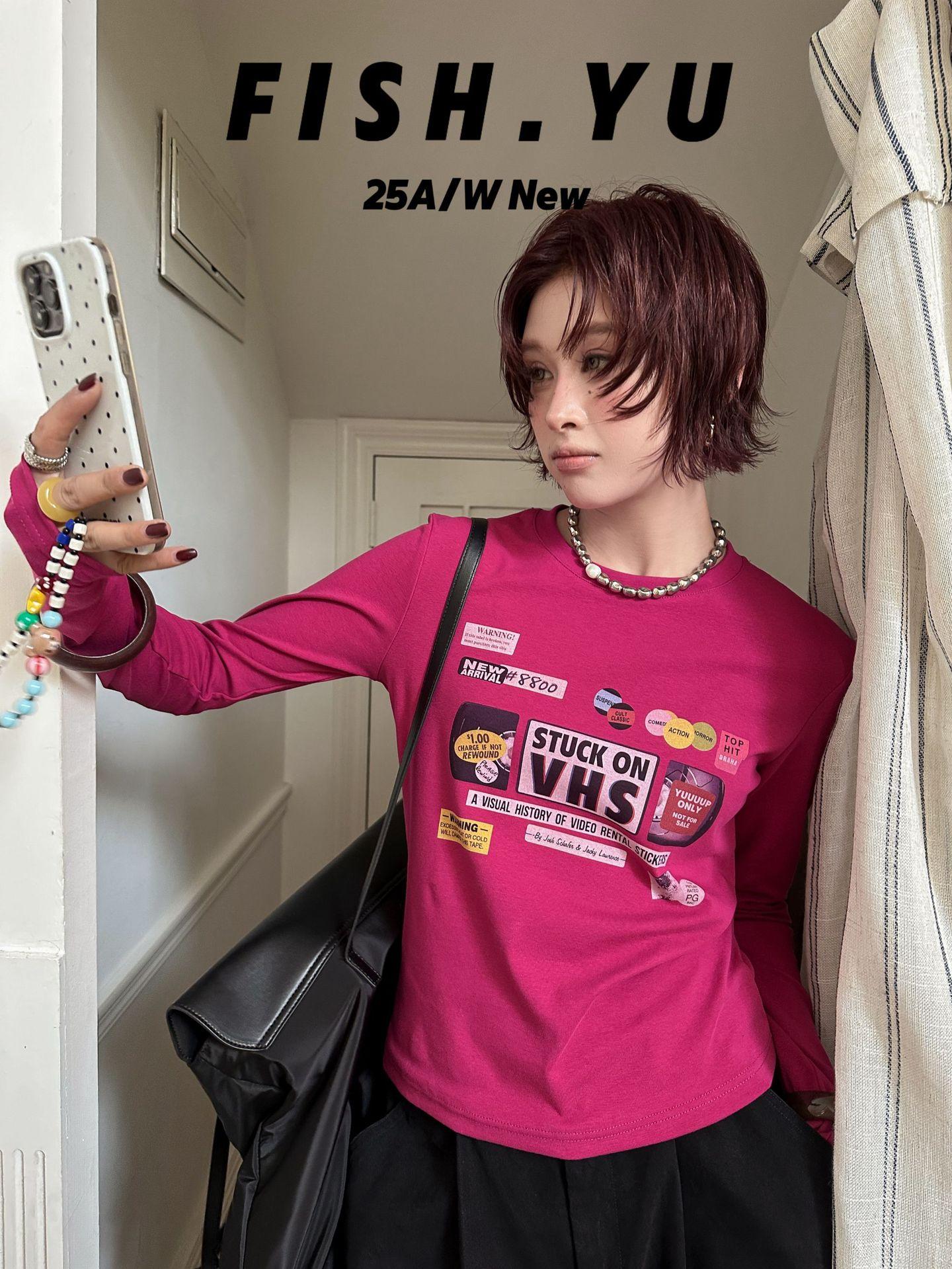 FISHYU Trece Líneas Principios de Otoño Nuevo Americano Retro Estampado de Letras Stretch Recto Hombro Pequeña Versión Camiseta Manga Larga 25589