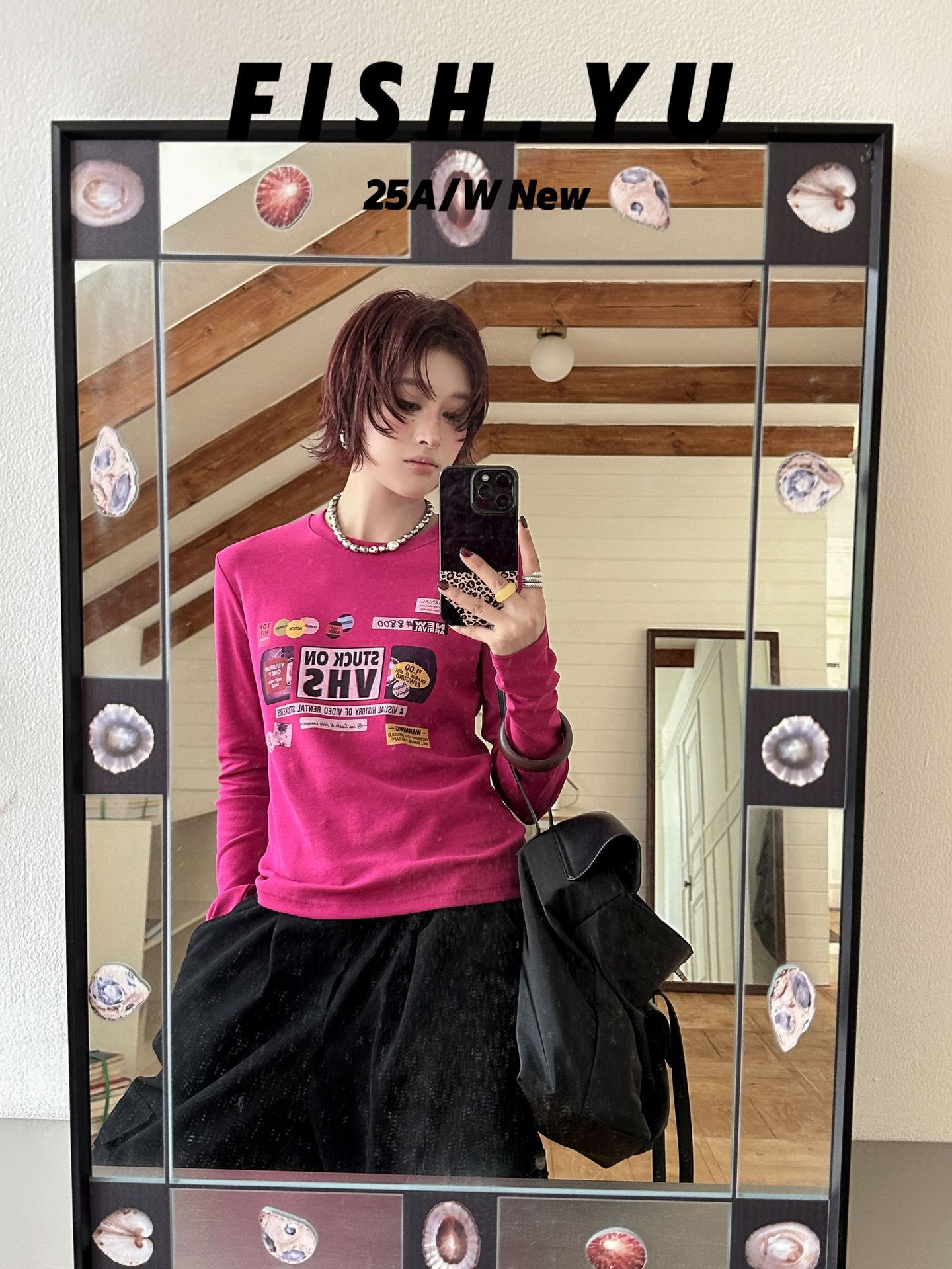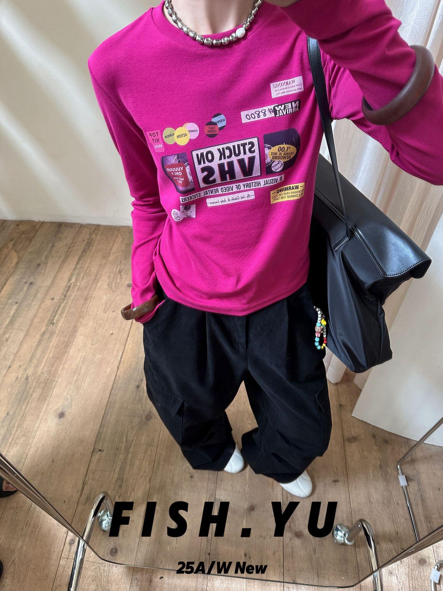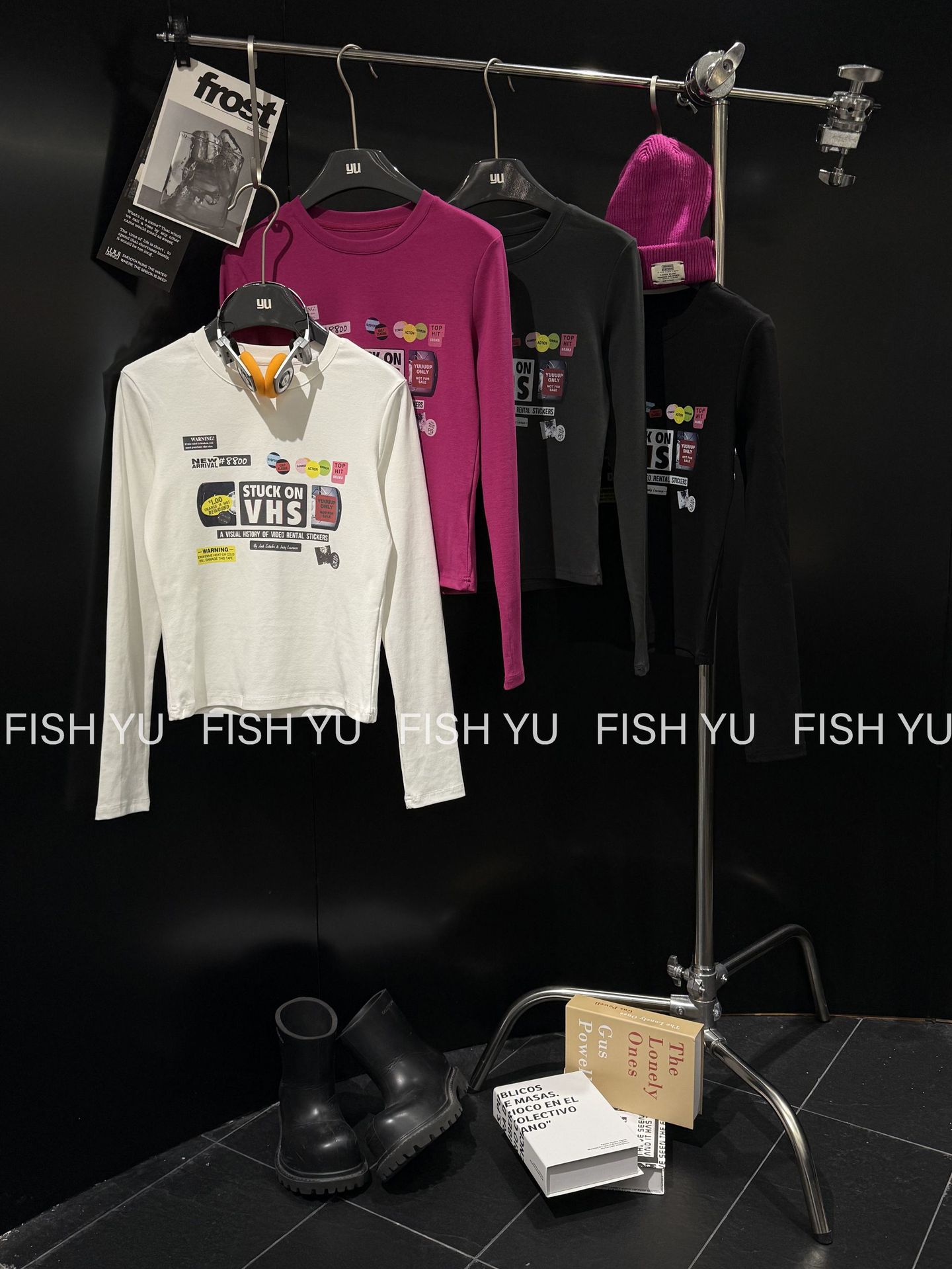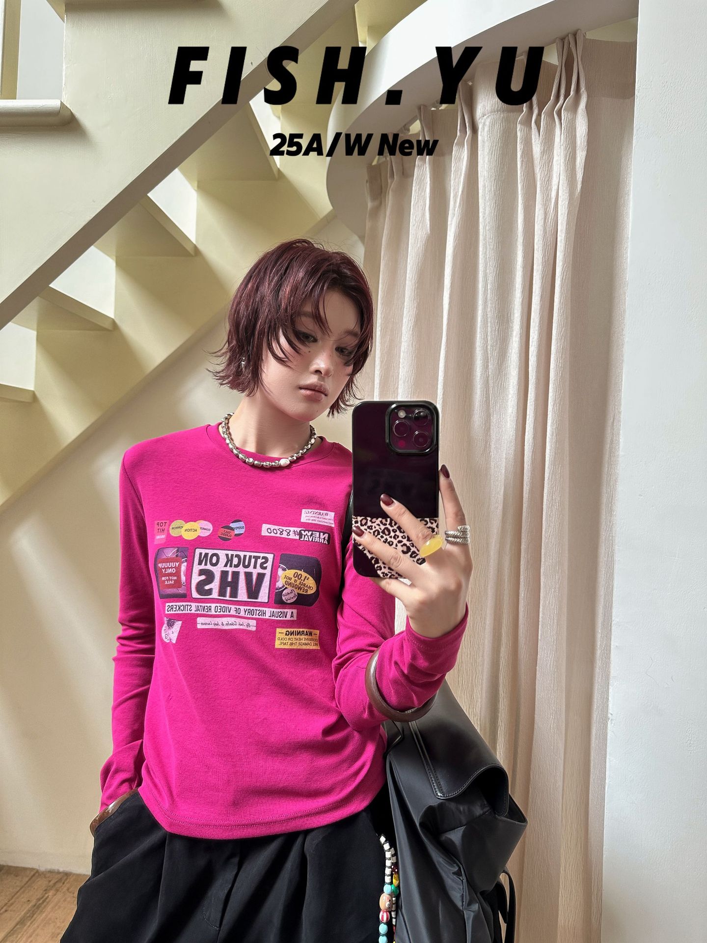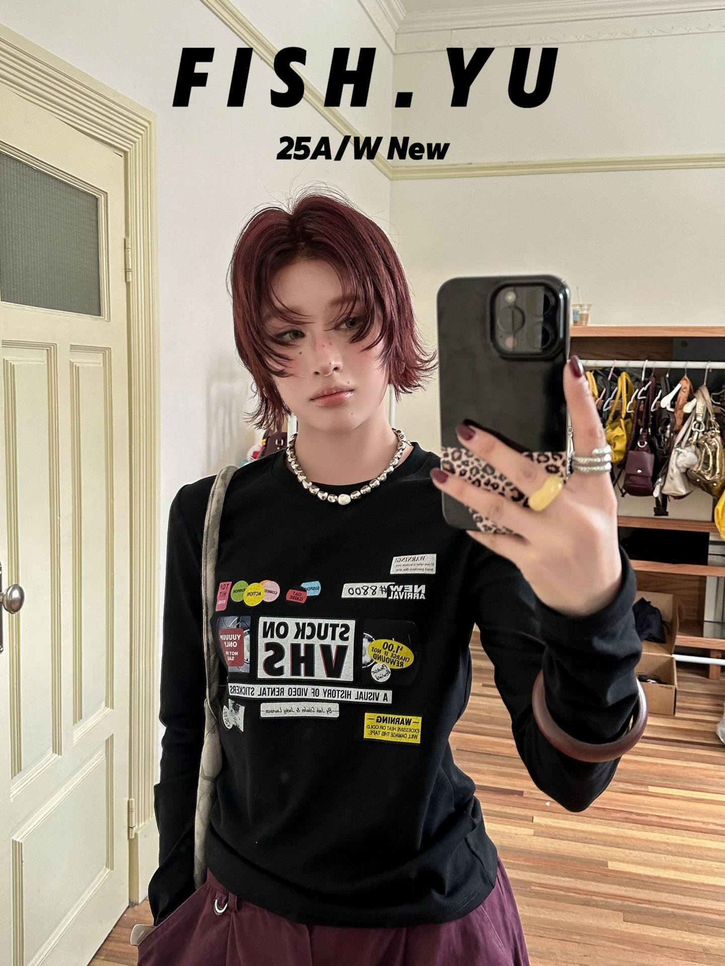 FISHYU Trece Líneas Principios de Otoño Nuevo Americano Retro Estampado de Letras Stretch Recto Hombro Pequeña Versión Camiseta Manga Larga 25589