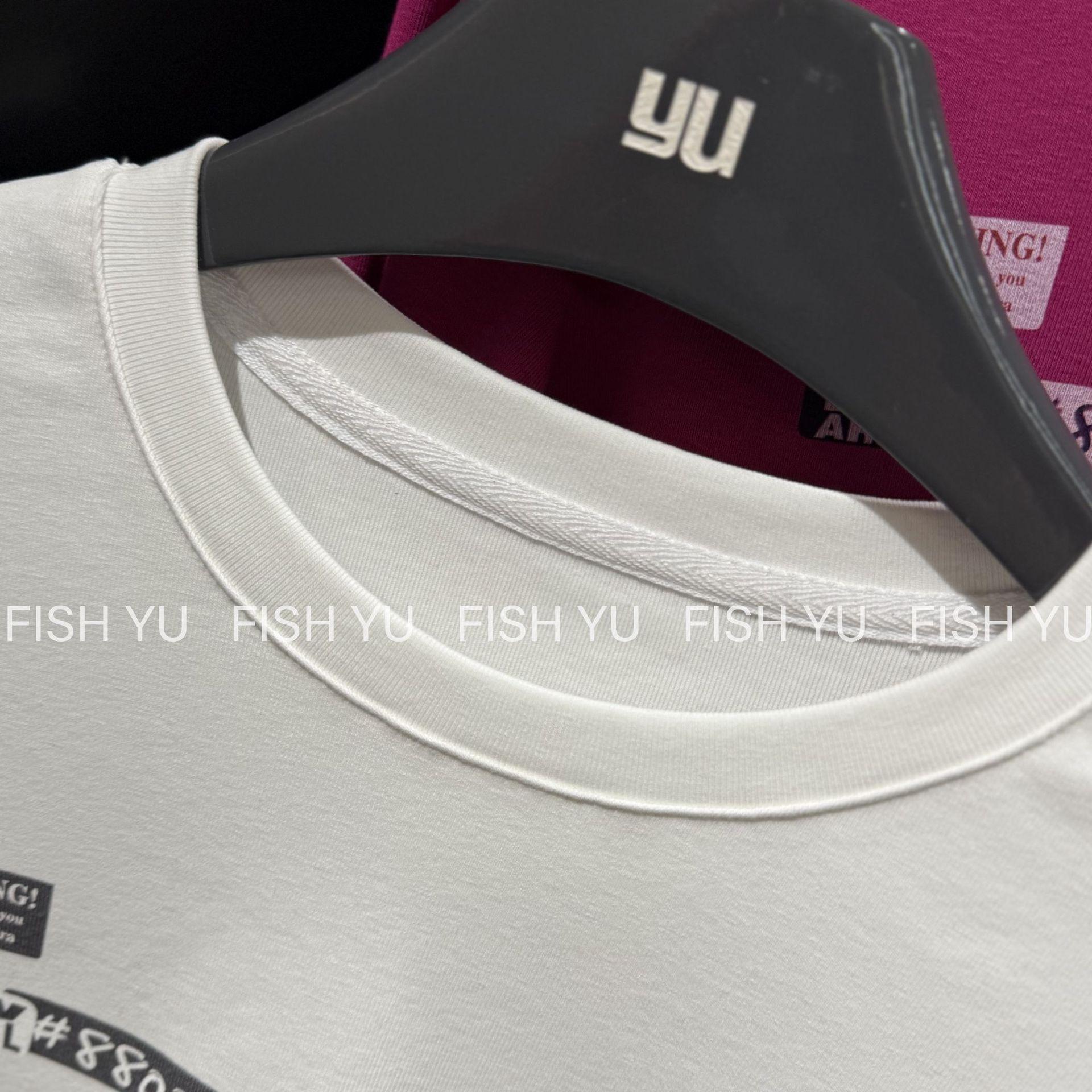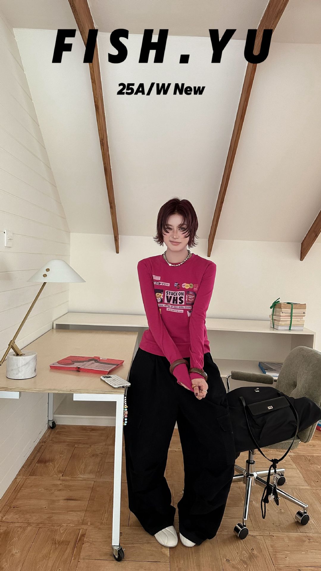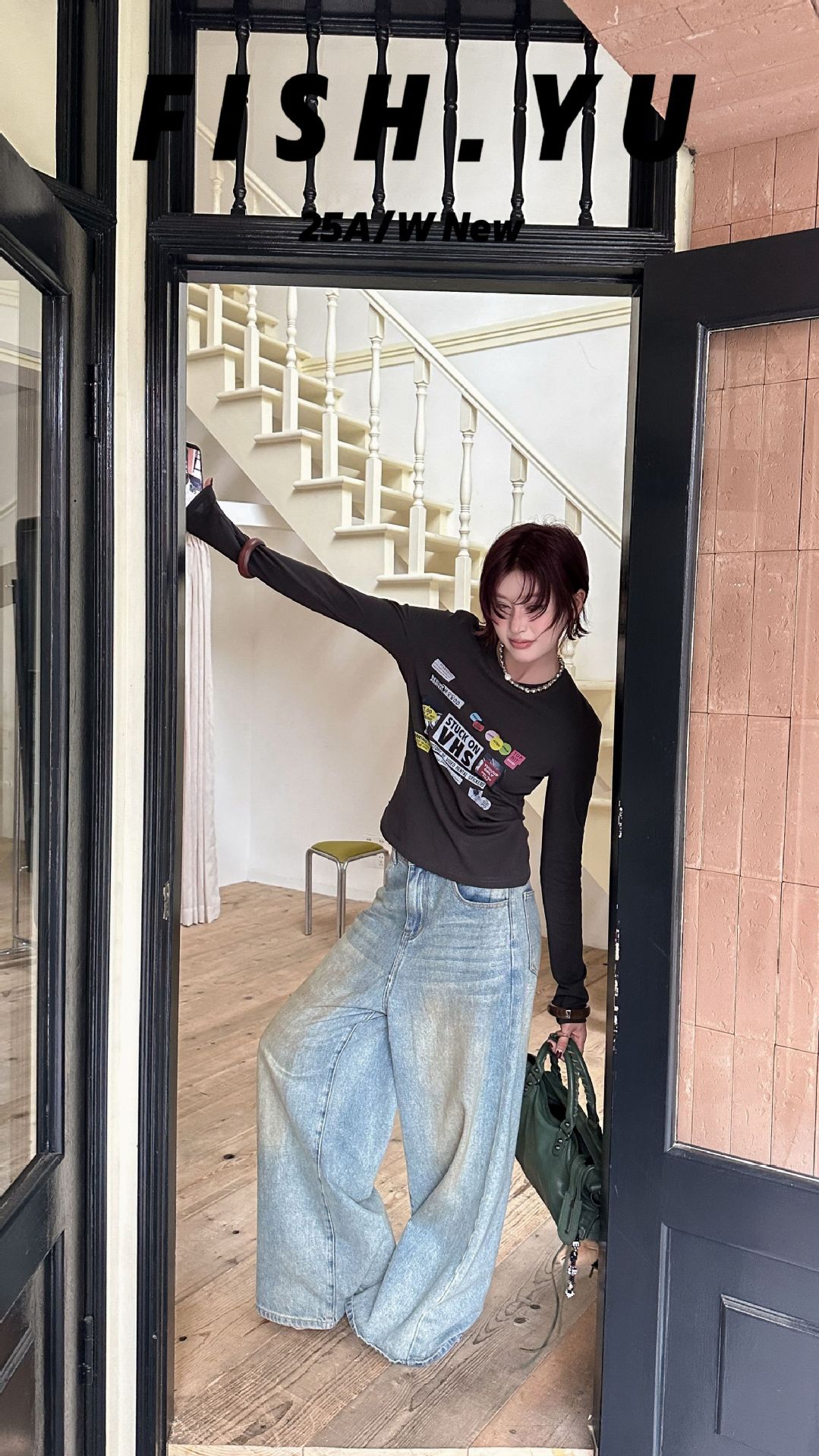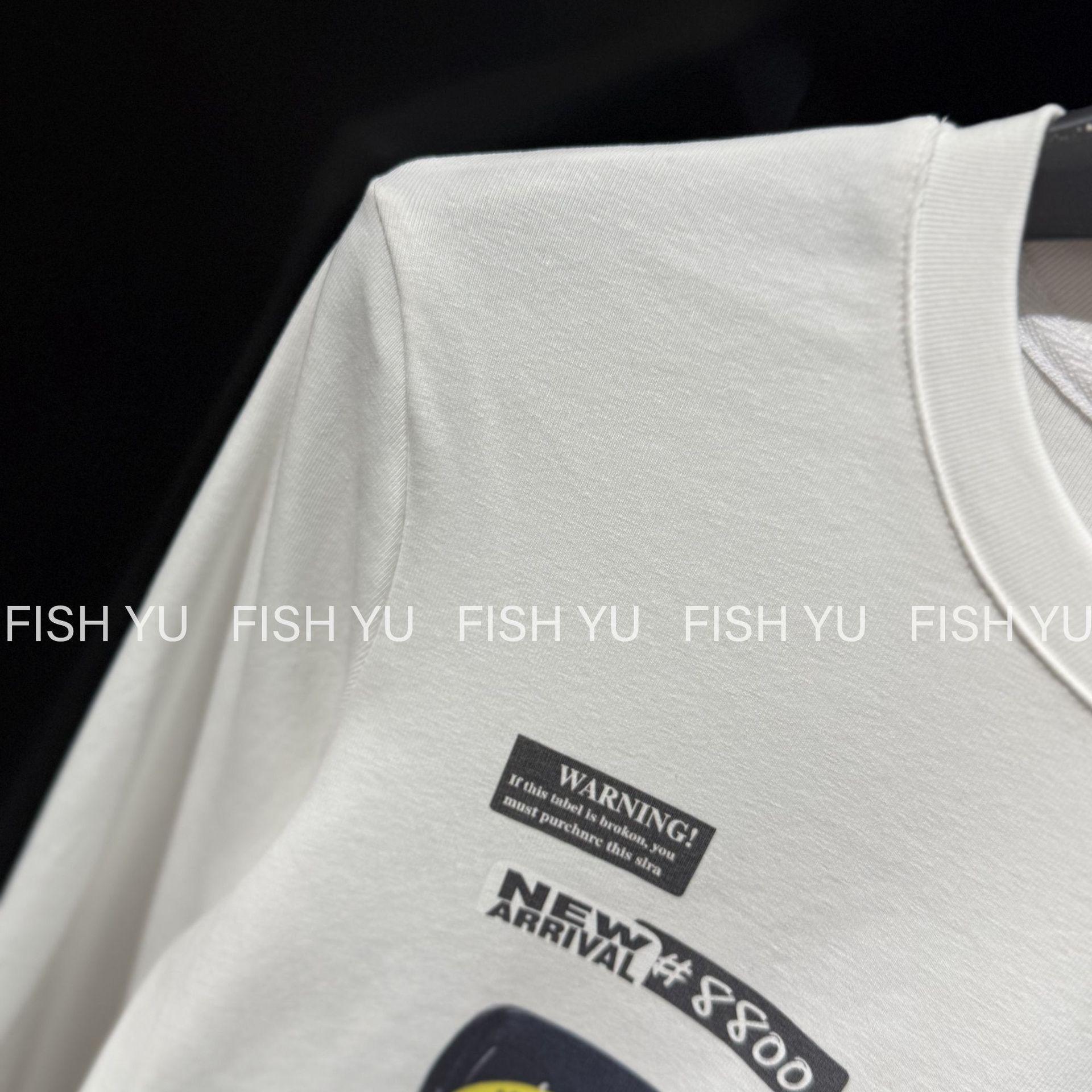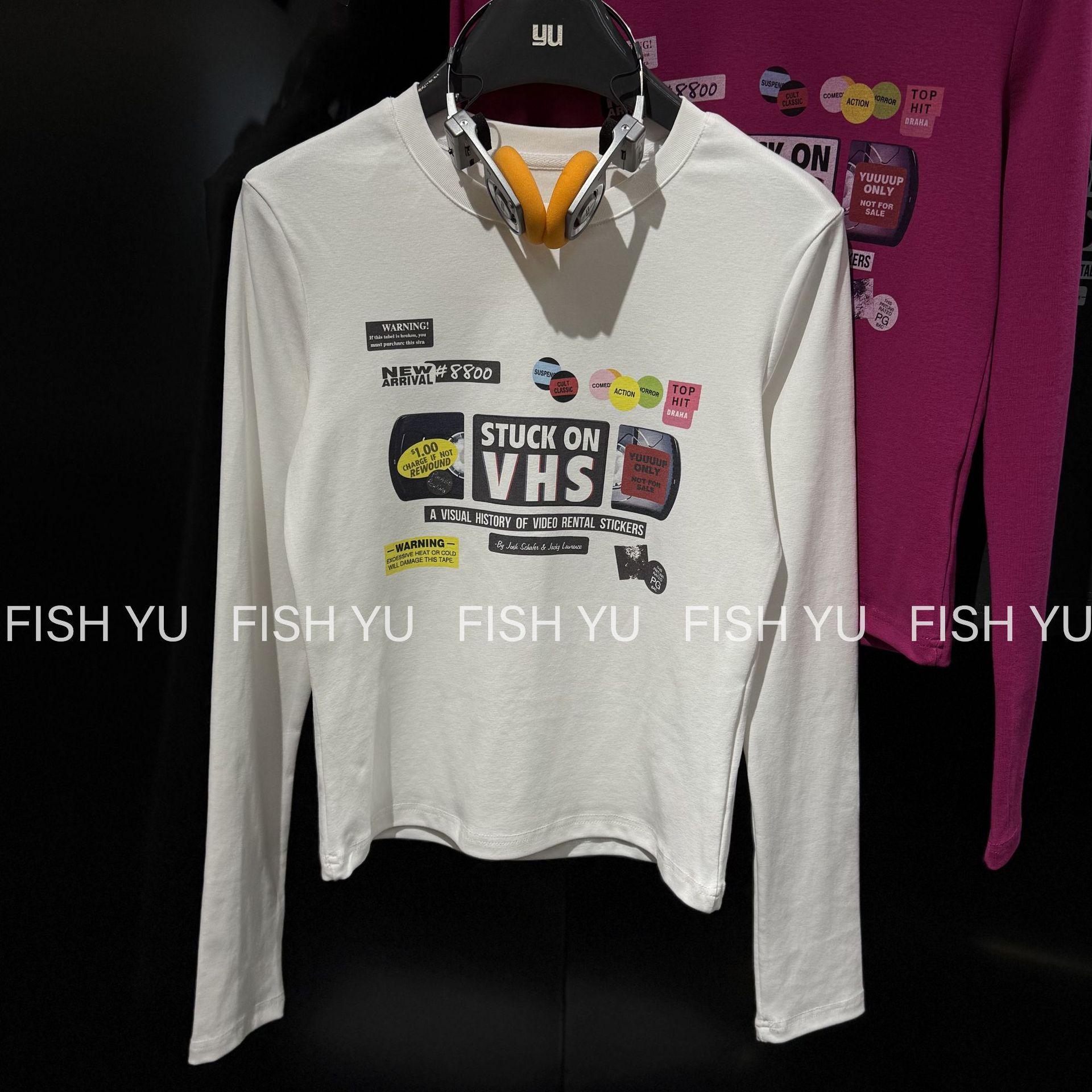 FISHYU Trece Líneas Principios de Otoño Nuevo Americano Retro Estampado de Letras Stretch Recto Hombro Pequeña Versión Camiseta Manga Larga 25589