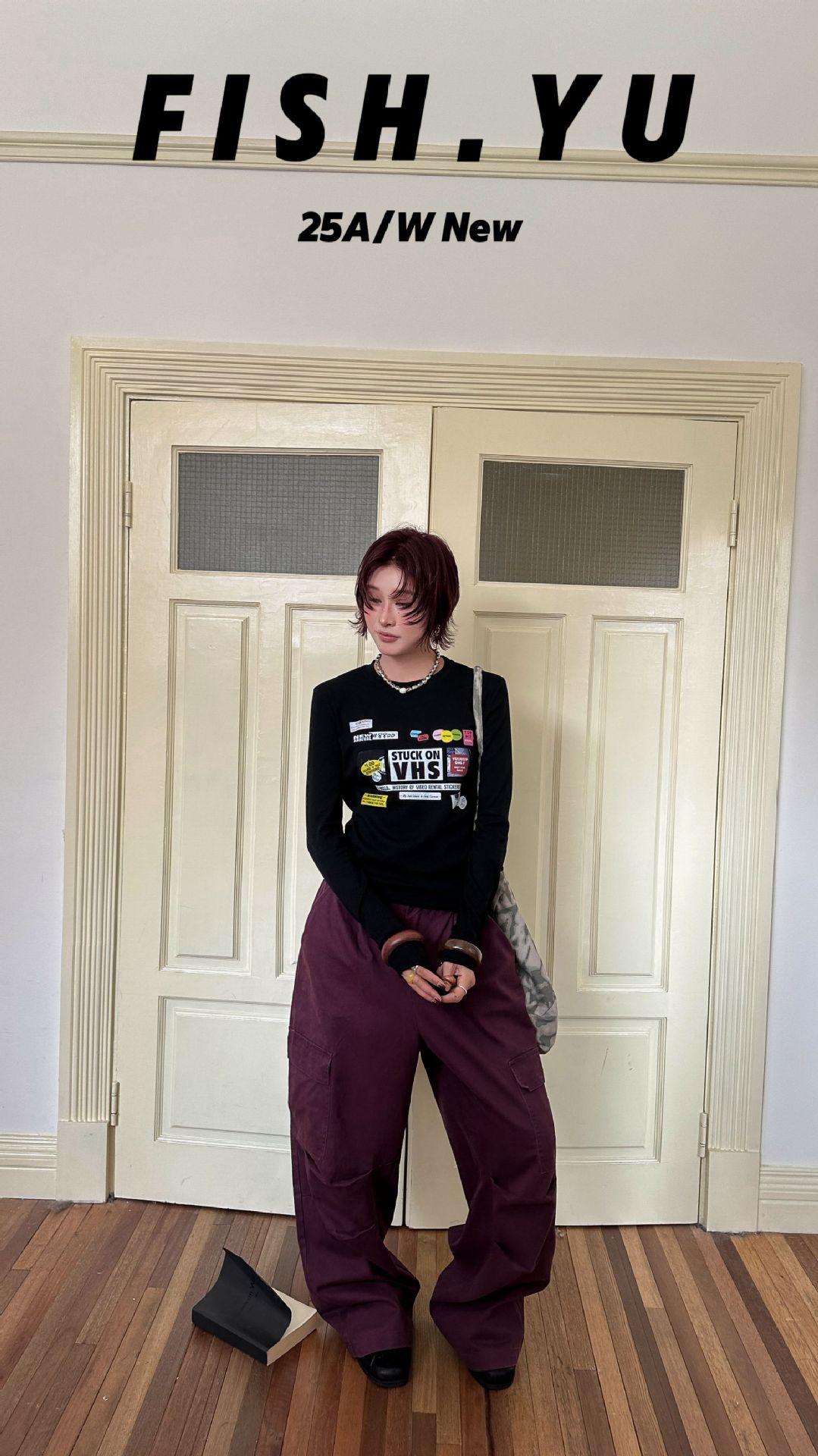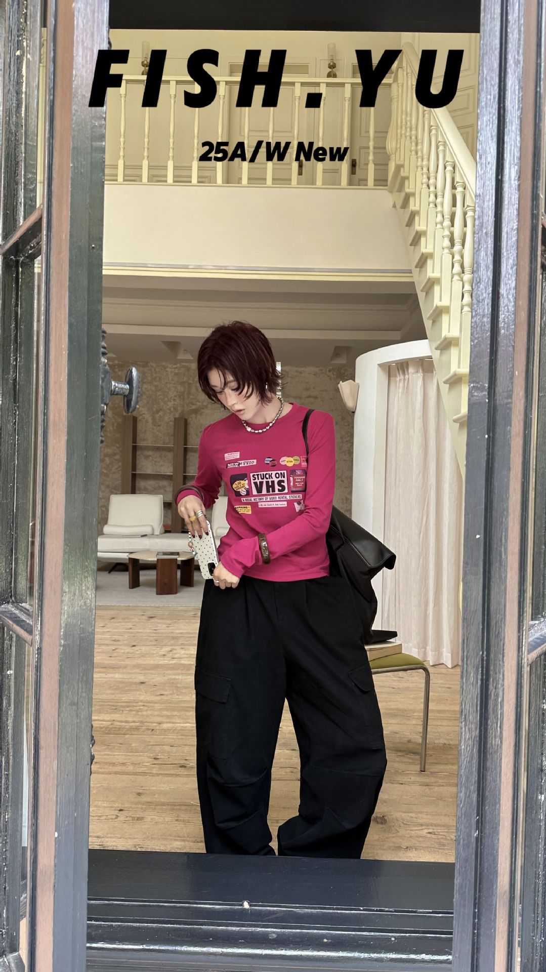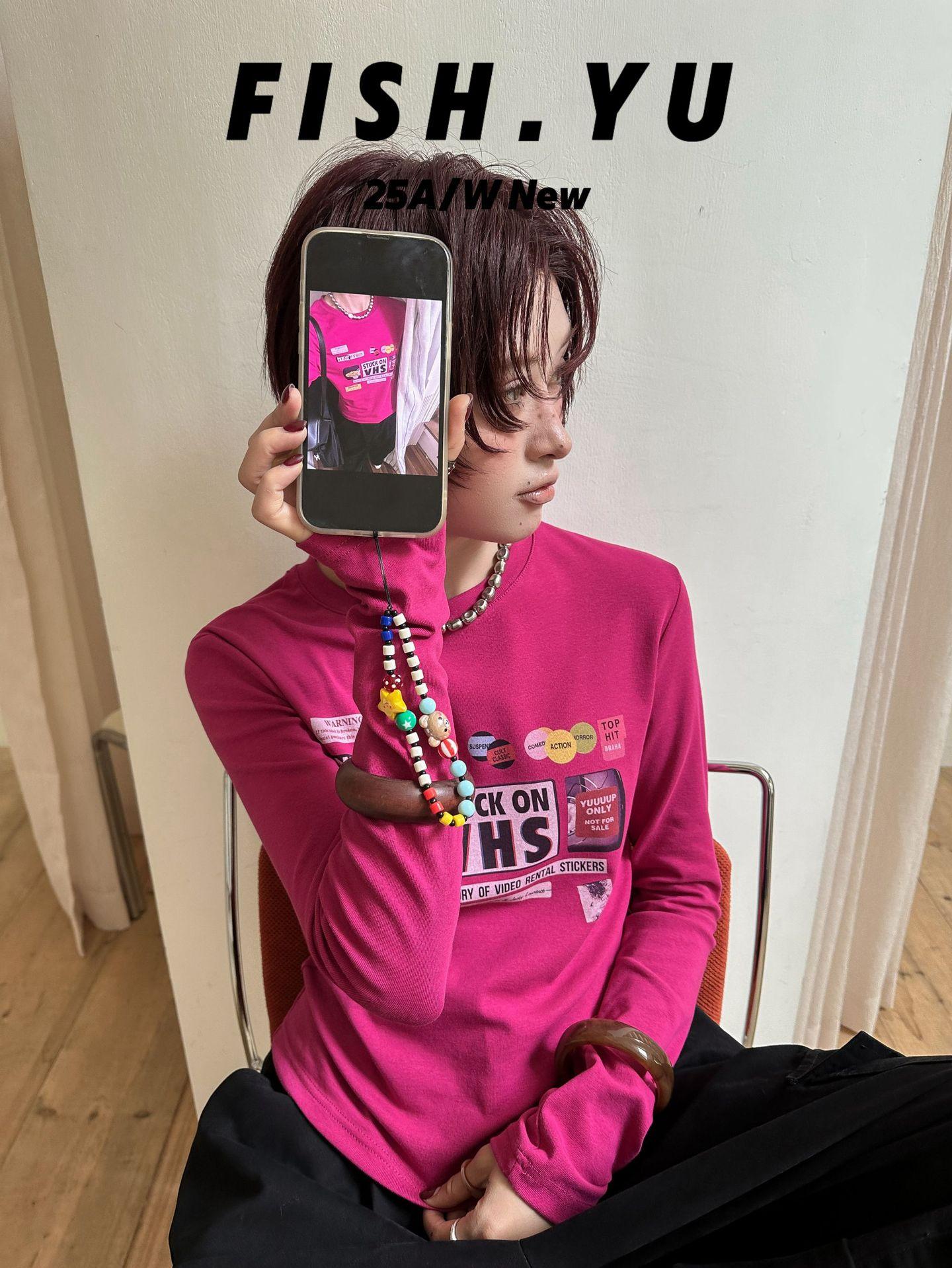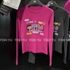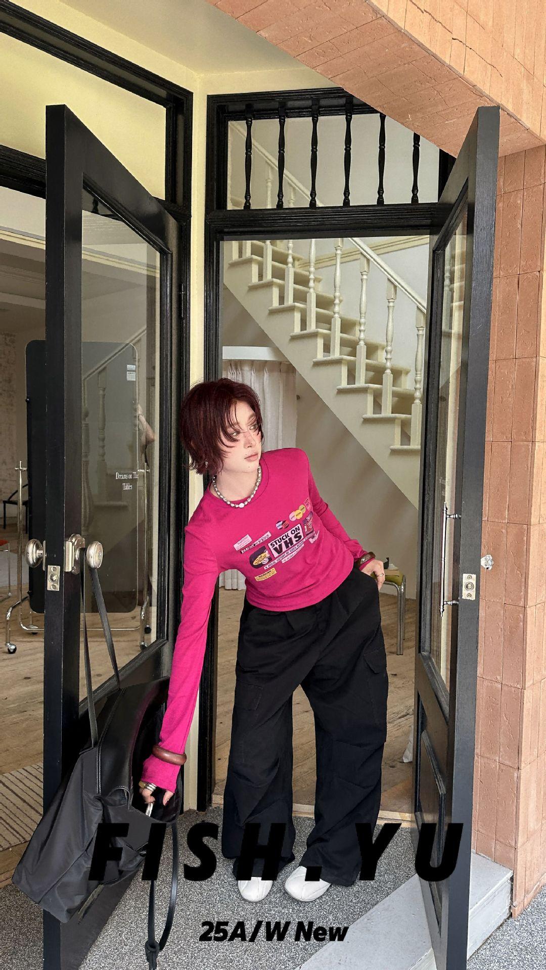 FISHYU Trece Líneas Principios de Otoño Nuevo Americano Retro Estampado de Letras Stretch Recto Hombro Pequeña Versión Camiseta Manga Larga 25589