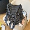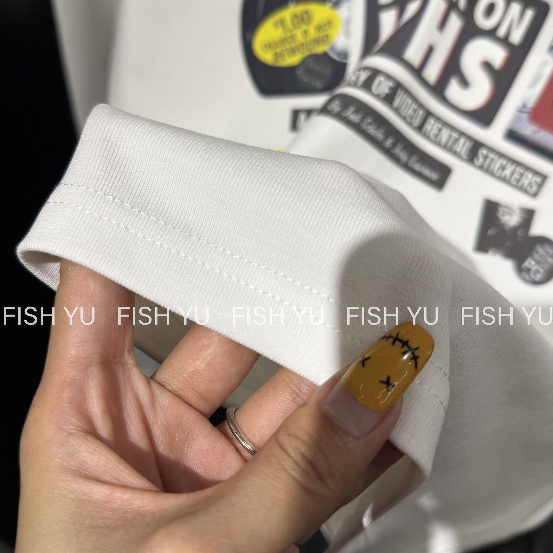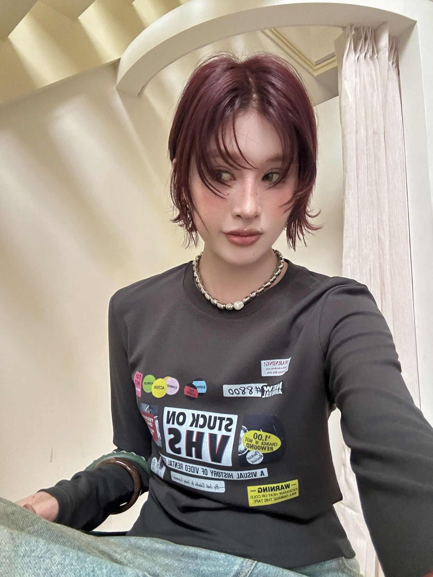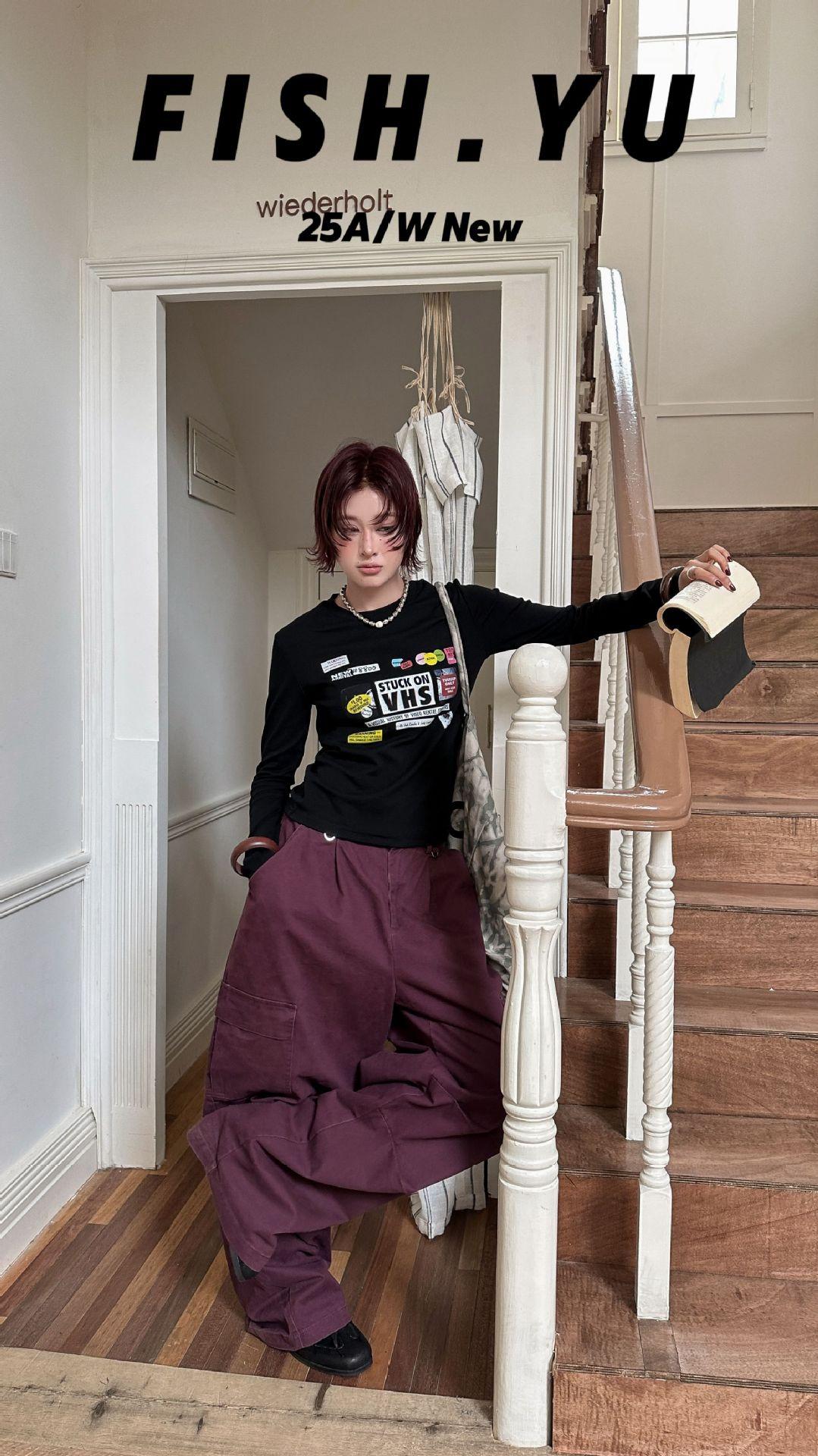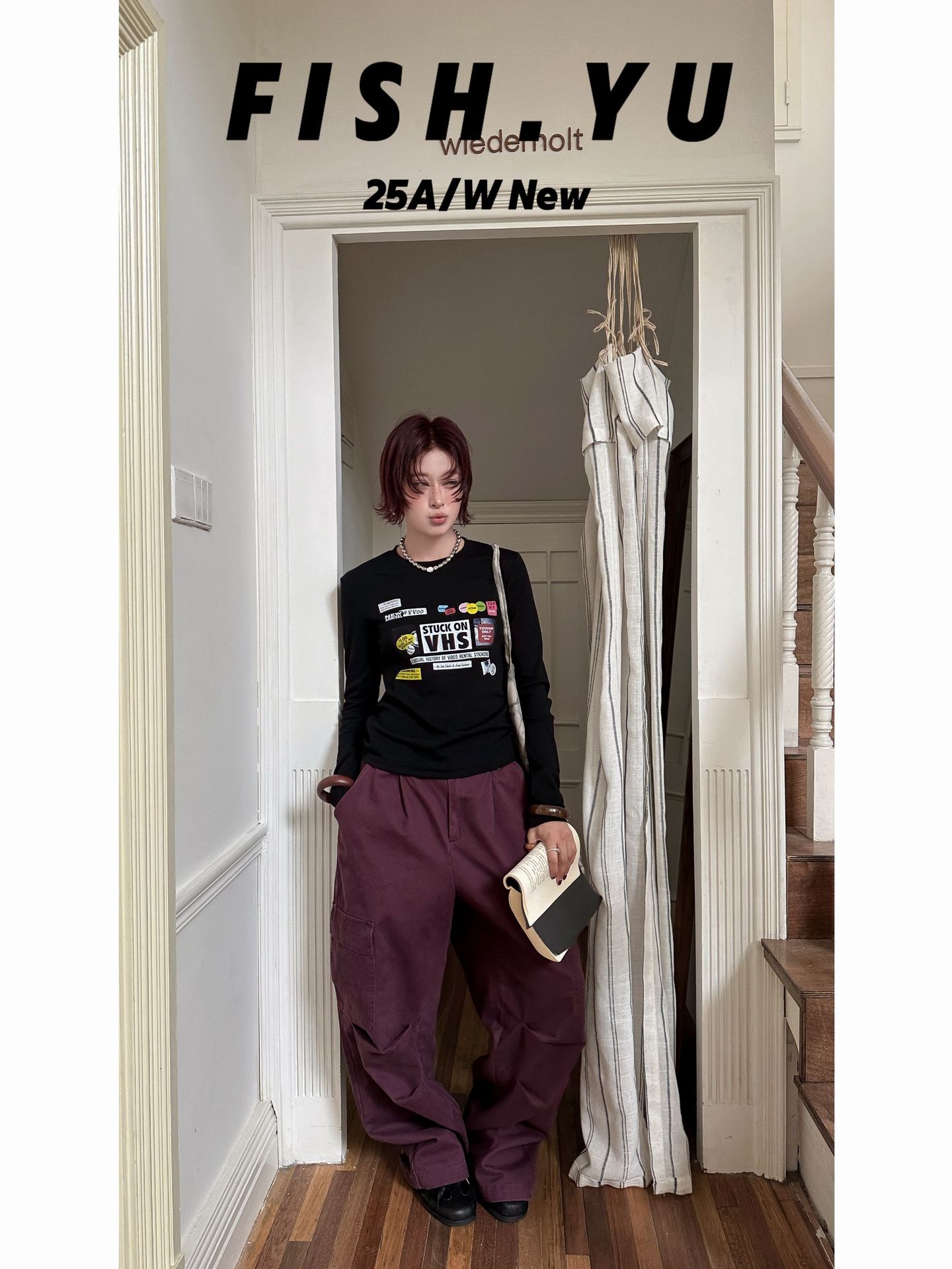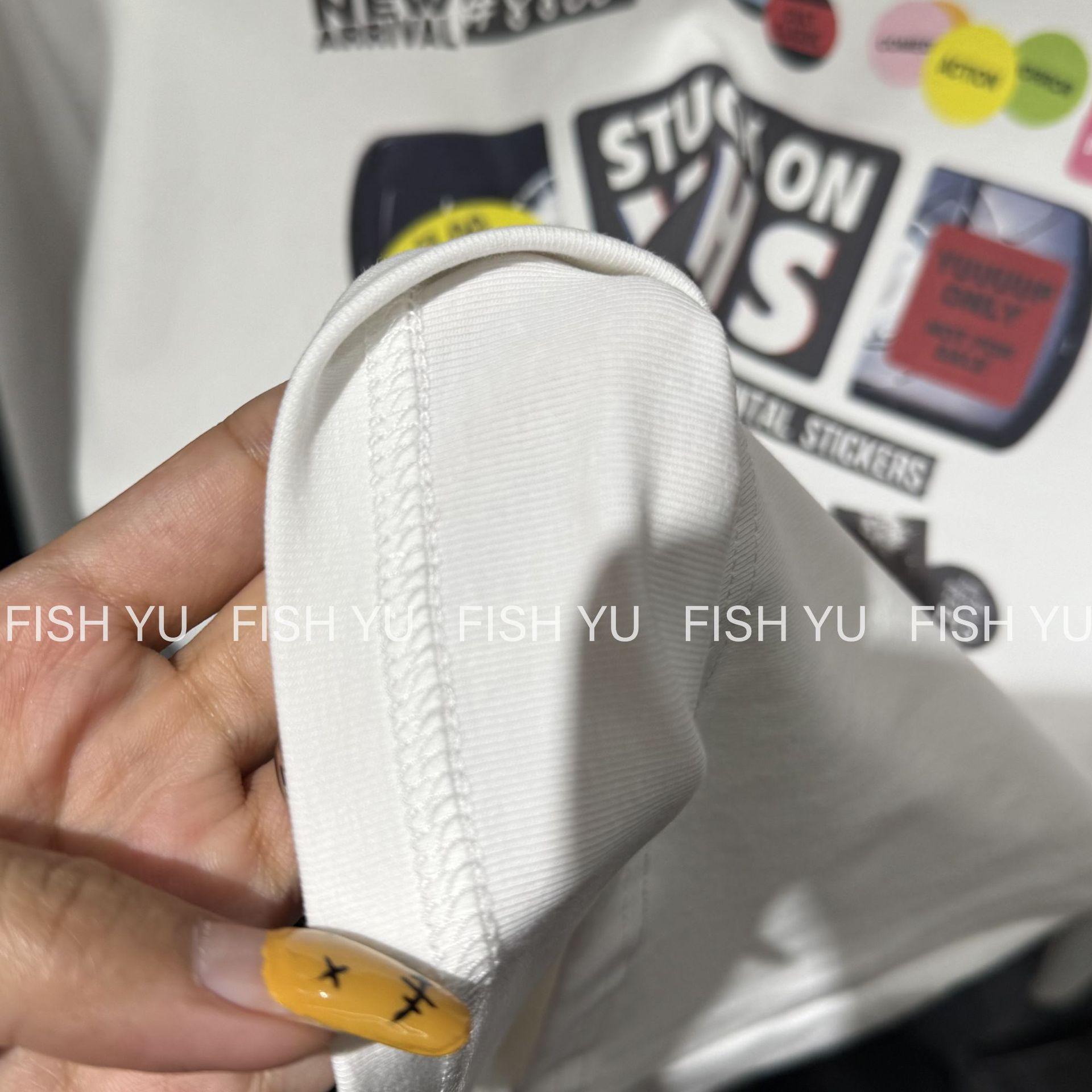 FISHYU Trece Líneas Principios de Otoño Nuevo Americano Retro Estampado de Letras Stretch Recto Hombro Pequeña Versión Camiseta Manga Larga 25589