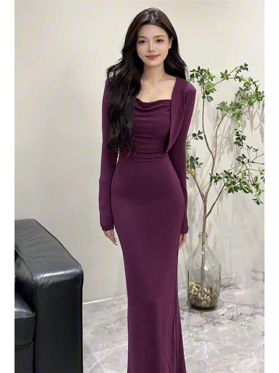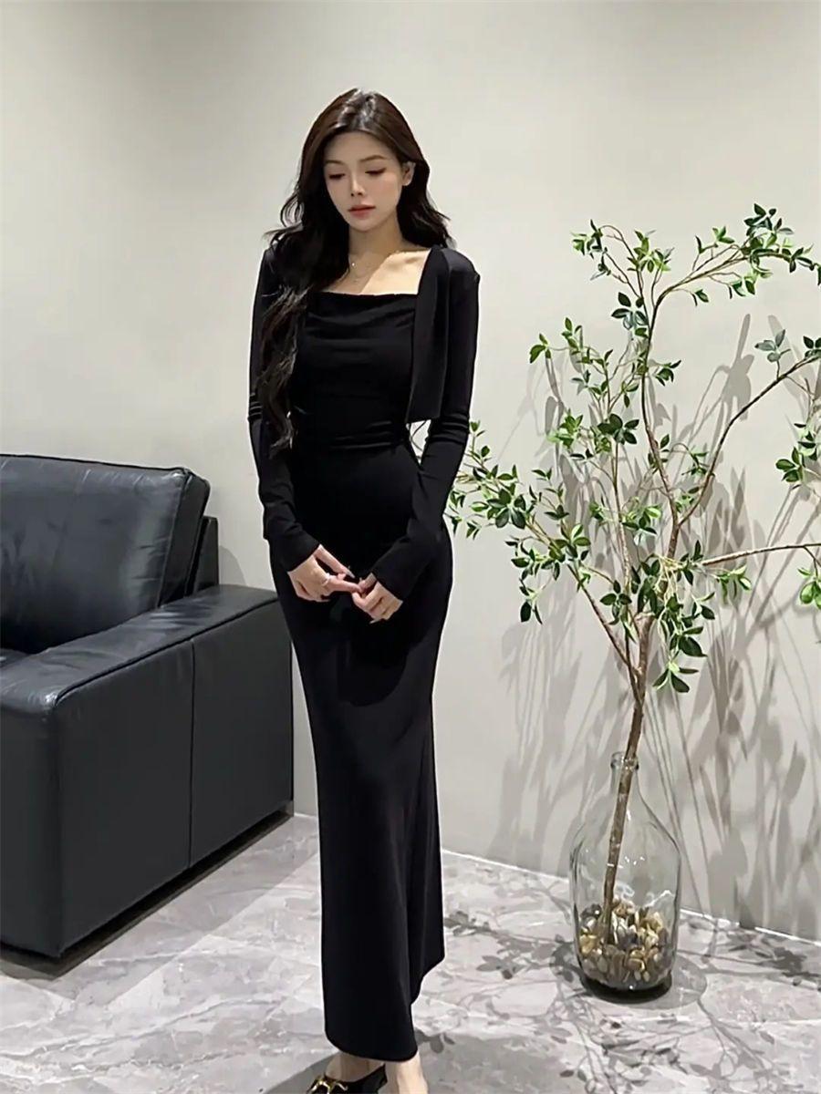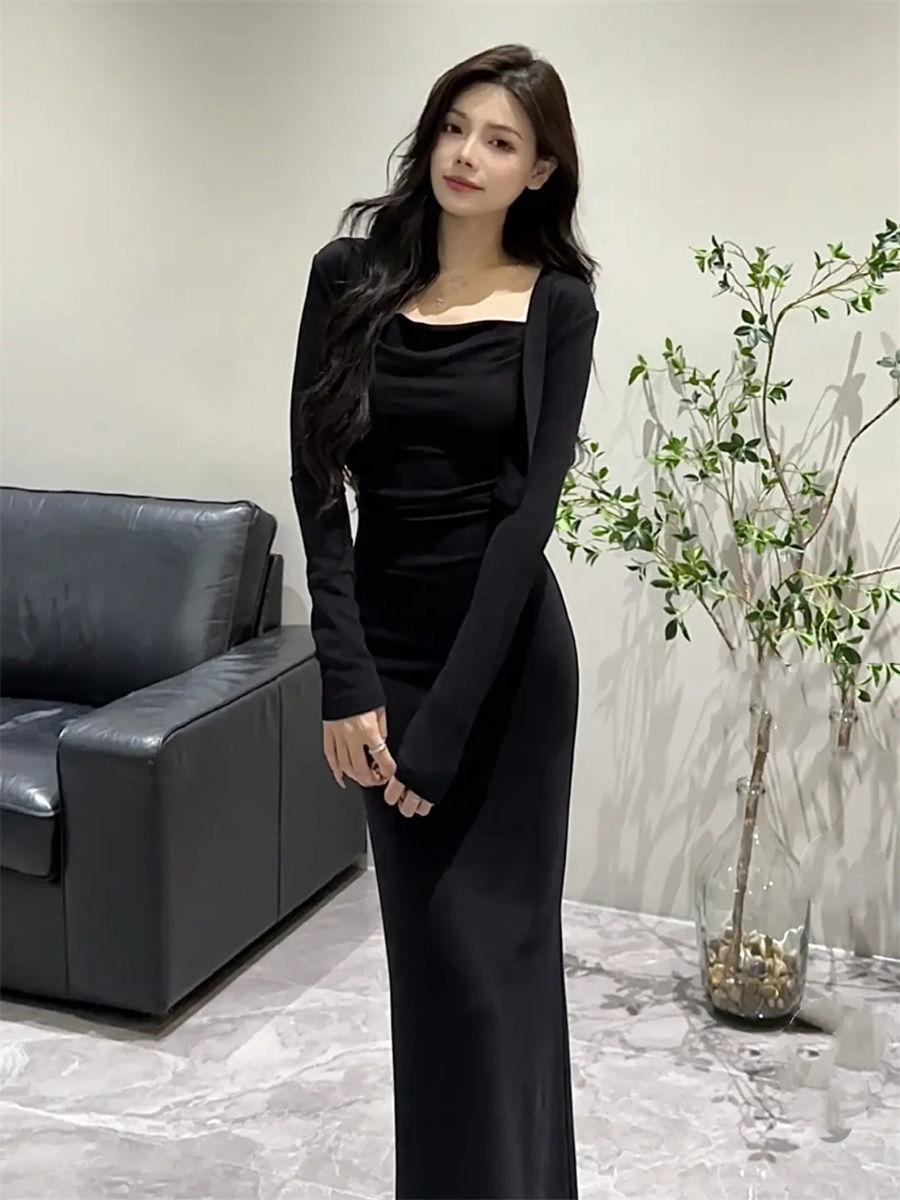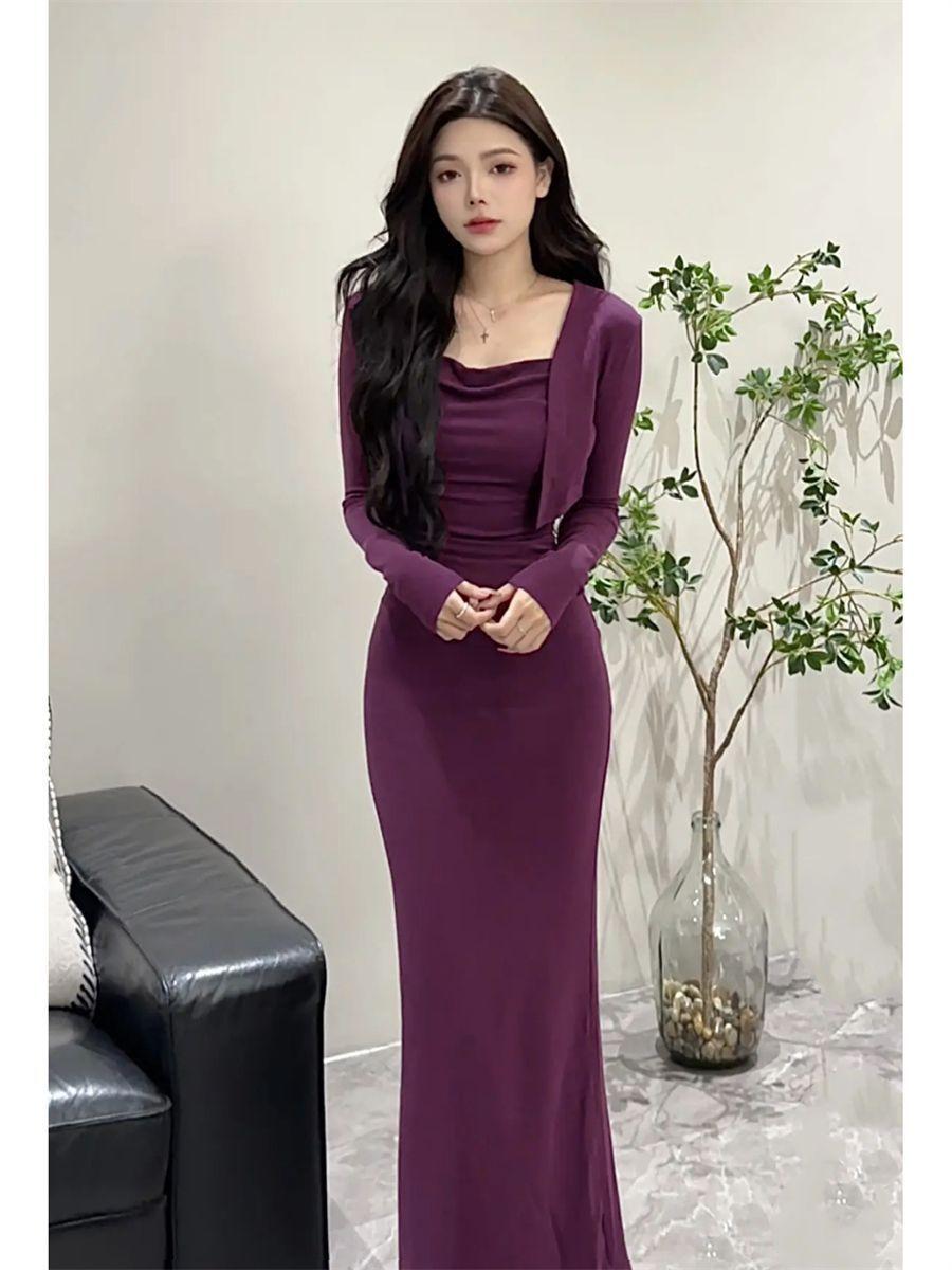 Conjunto de dos piezas de cárdigan y camisola para mujer madura atractiva, vestido largo de cola de pez adelgazante de verano nuevo 2025