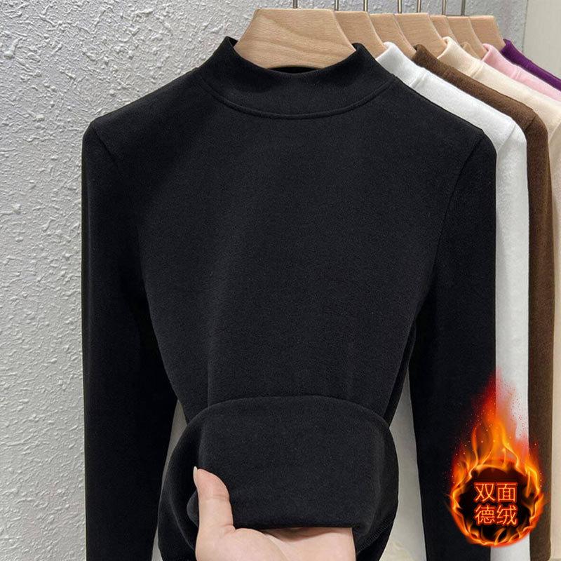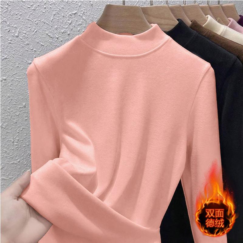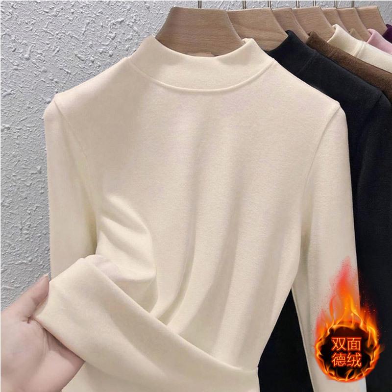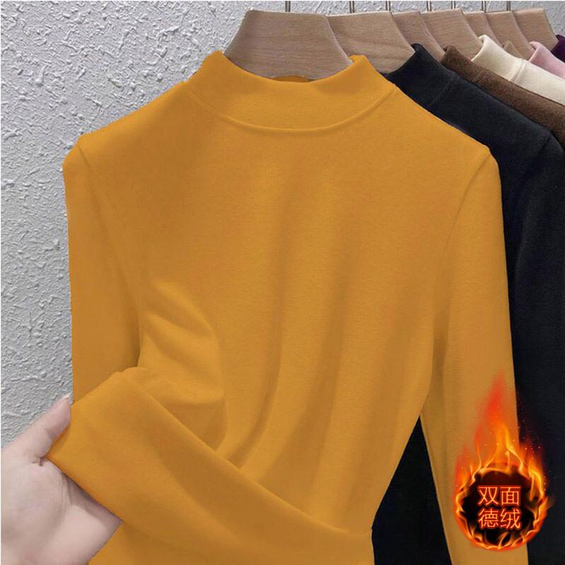Cuello Alto Cachemira Cálido Forro Polar Grueso Capa Base Superior Otoño Invierno Ajustado Moderno Versátil Camiseta Manga Larga Mujer