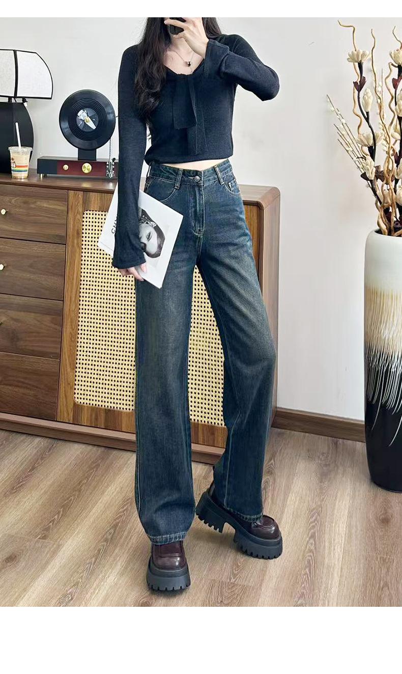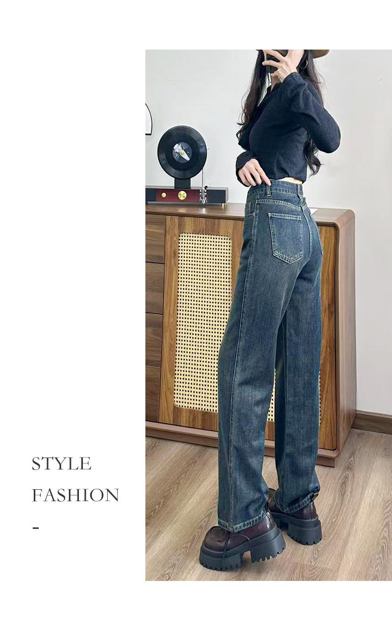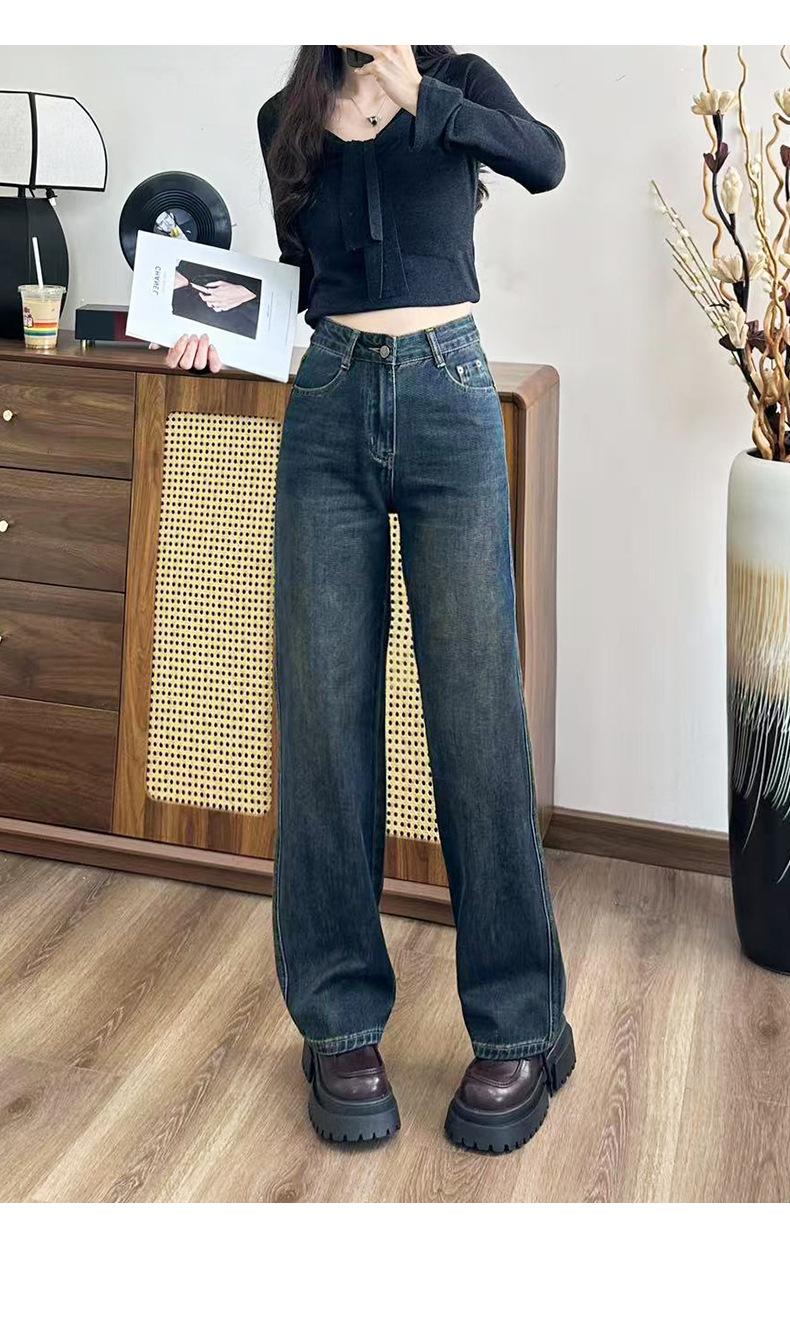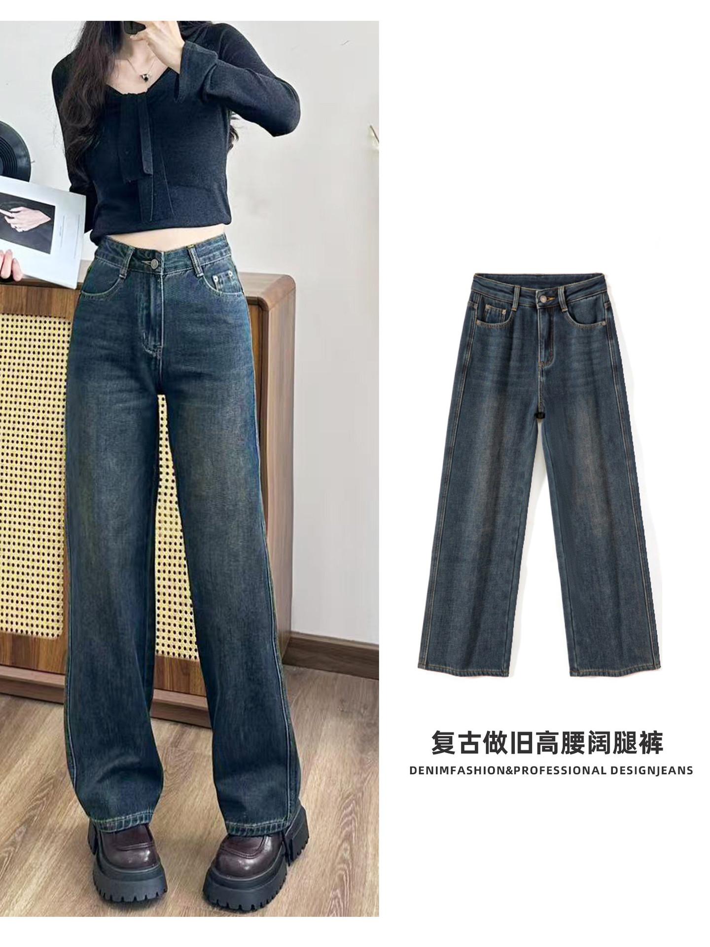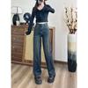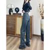 Jiawei 2025 Otoño Retro Pantalones de Mezclilla Lavados Mujer Diseño Cintura Alta Ajuste Slim Pantalones de Pierna Ancha Jeans Azul Niebla