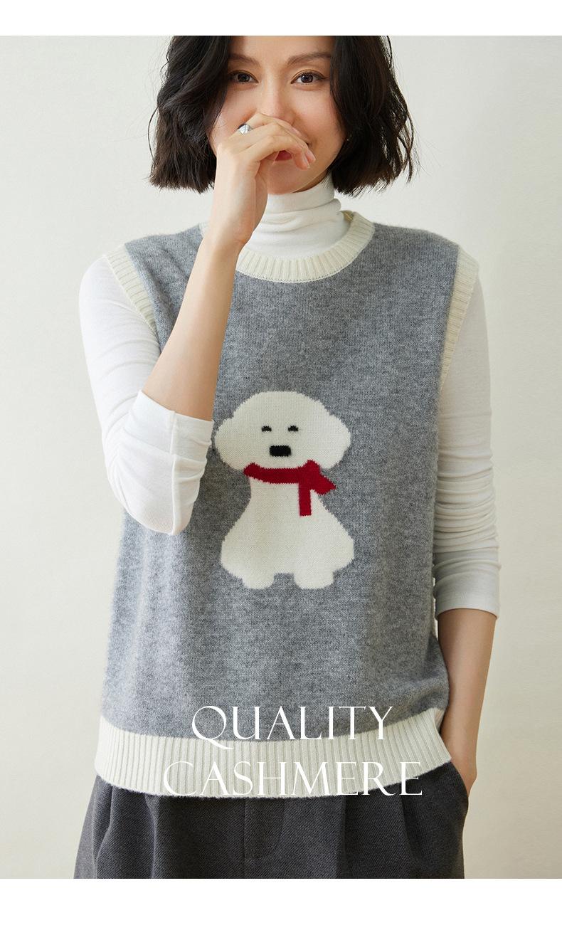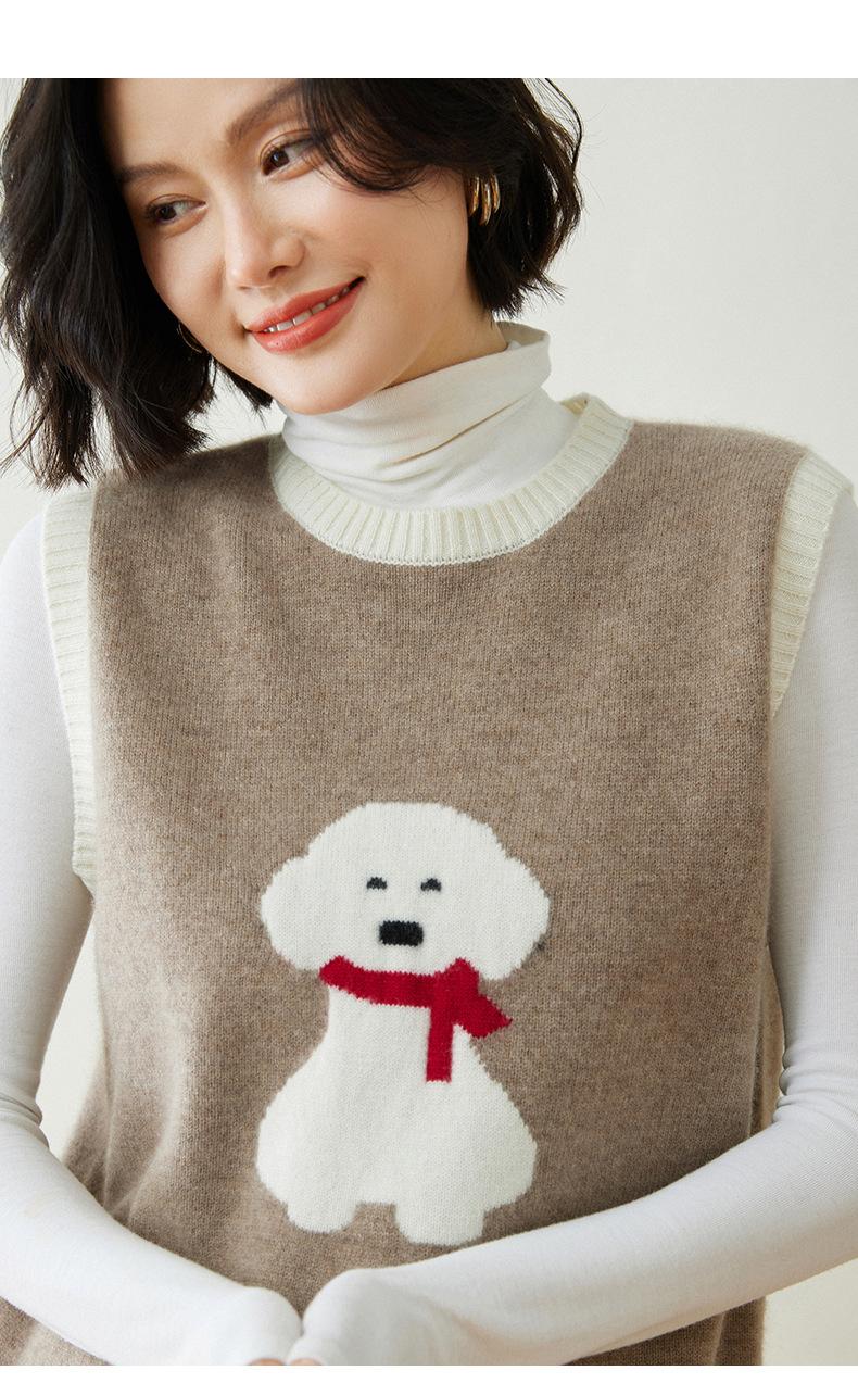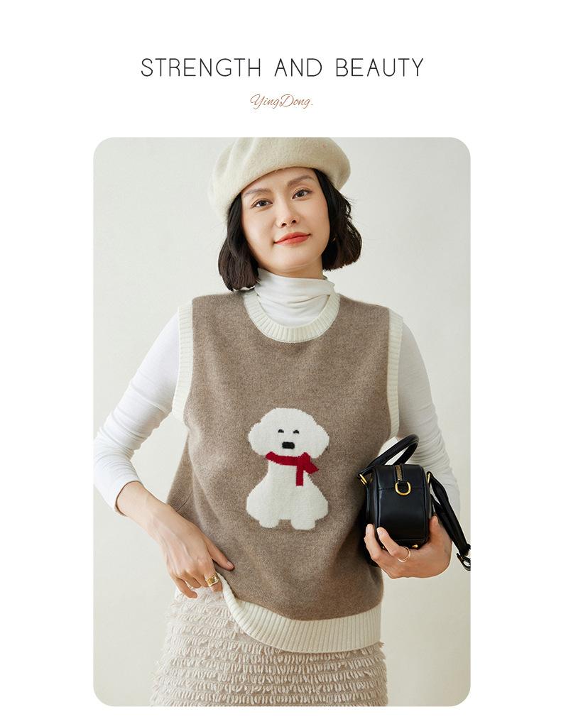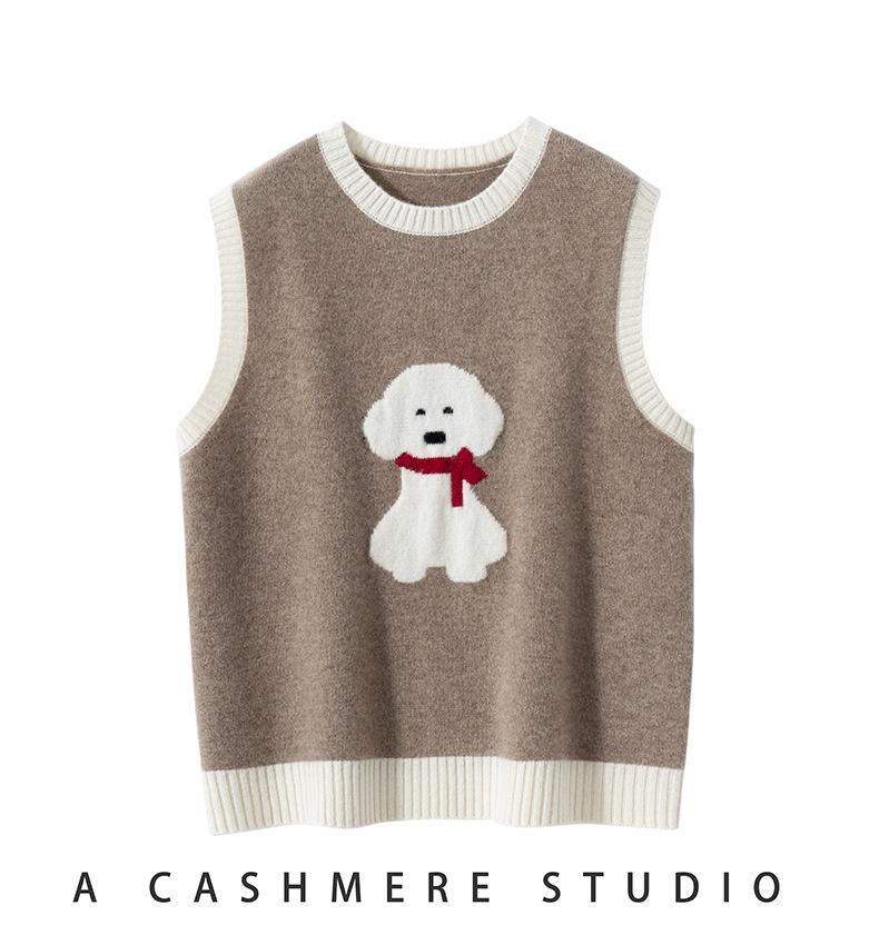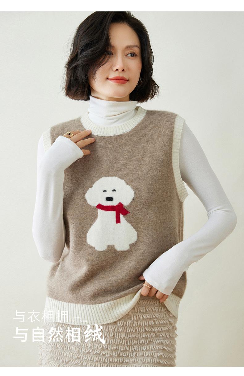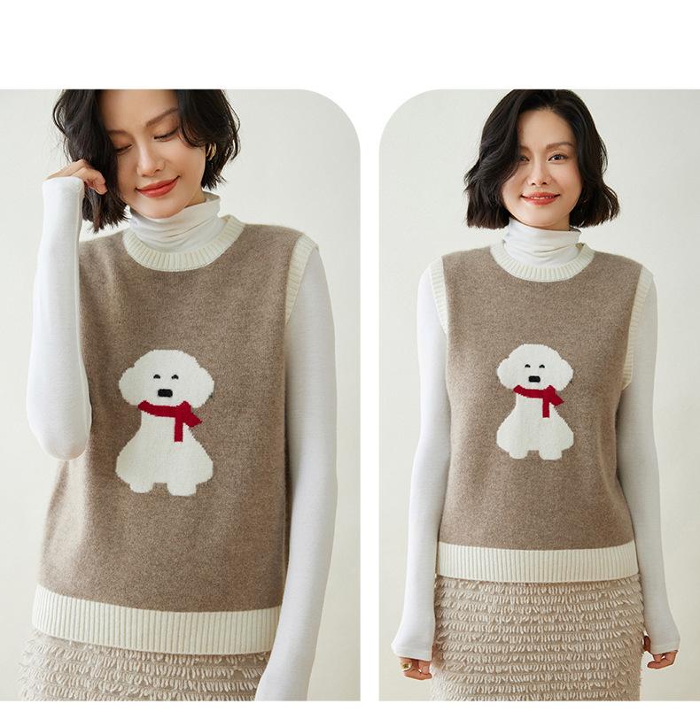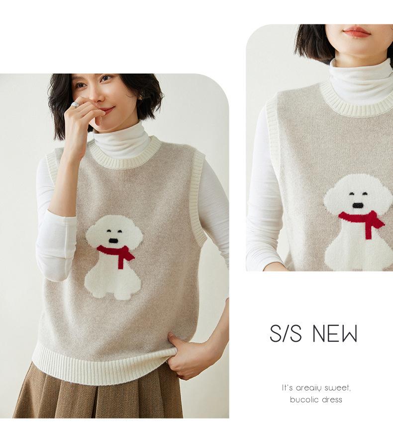 25 Otoño/Invierno Nuevo Chaleco de Cachemira sin Mangas para Mujer Cuello Redondo Jacquard de Cachorros Suéter de Punto Jersey sin Mangas Top Bloque de Color Chaleco