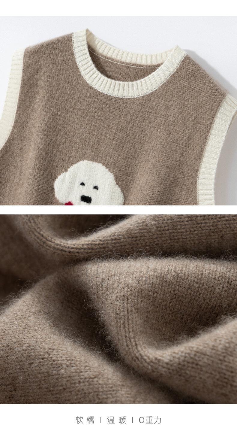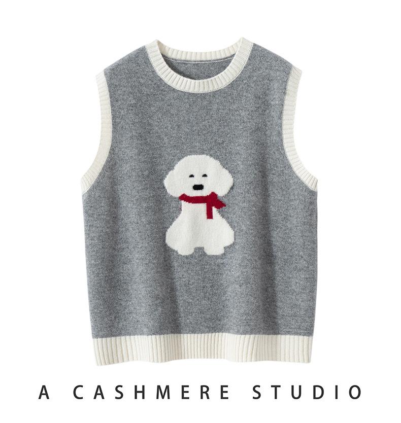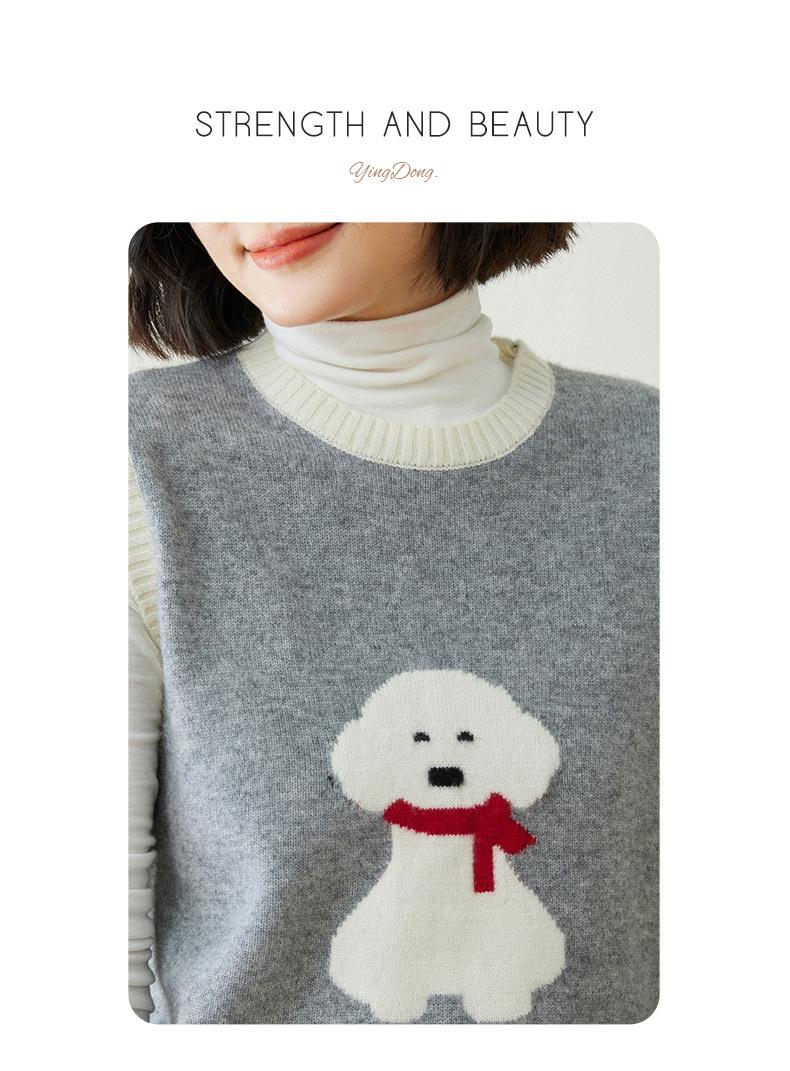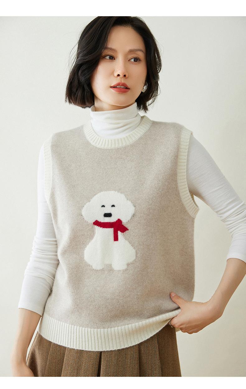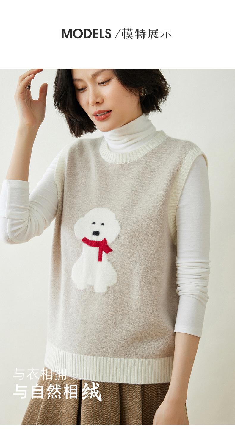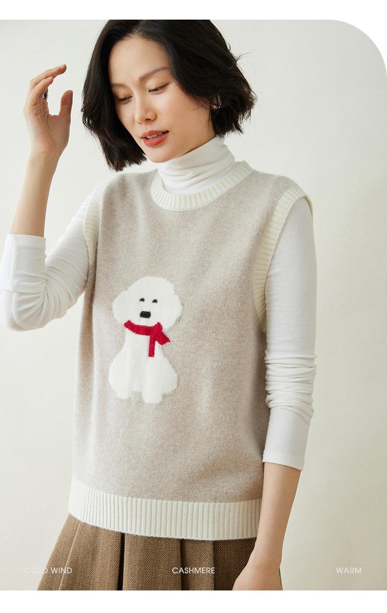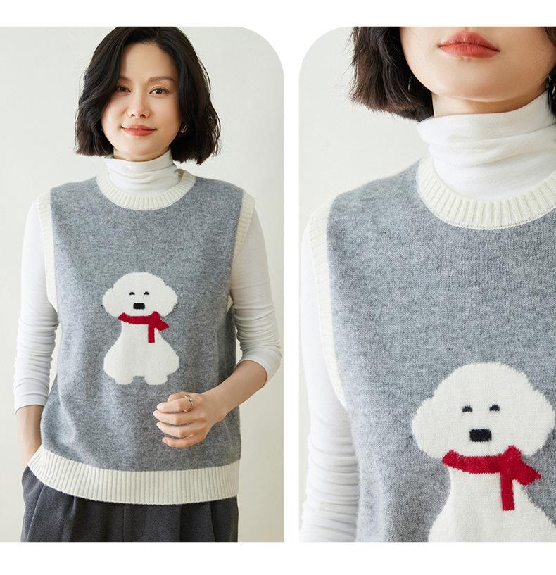 25 Otoño/Invierno Nuevo Chaleco de Cachemira sin Mangas para Mujer Cuello Redondo Jacquard de Cachorros Suéter de Punto Jersey sin Mangas Top Bloque de Color Chaleco