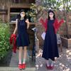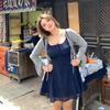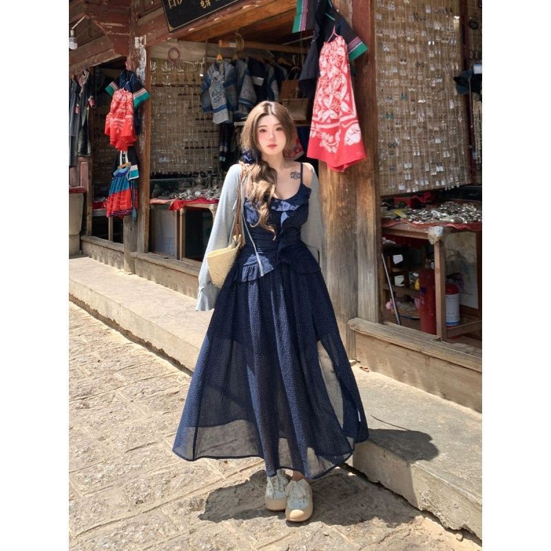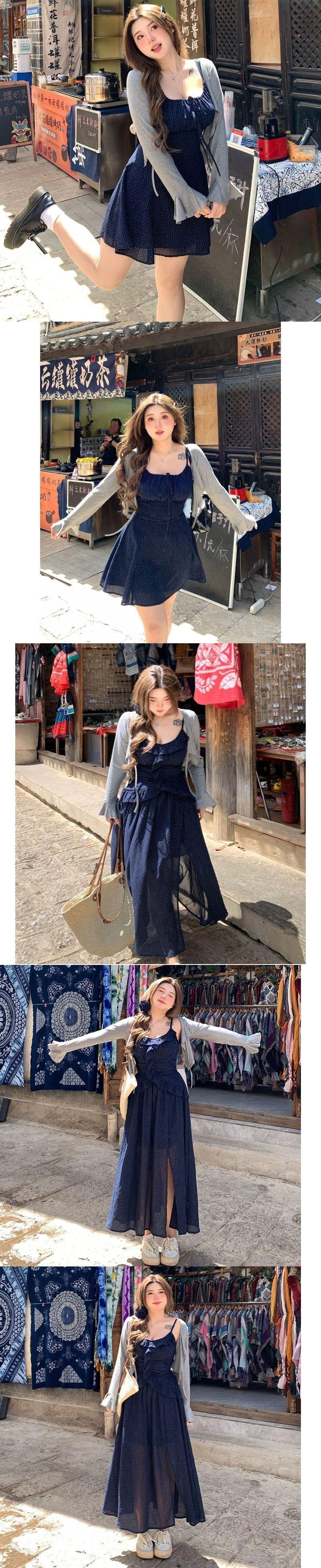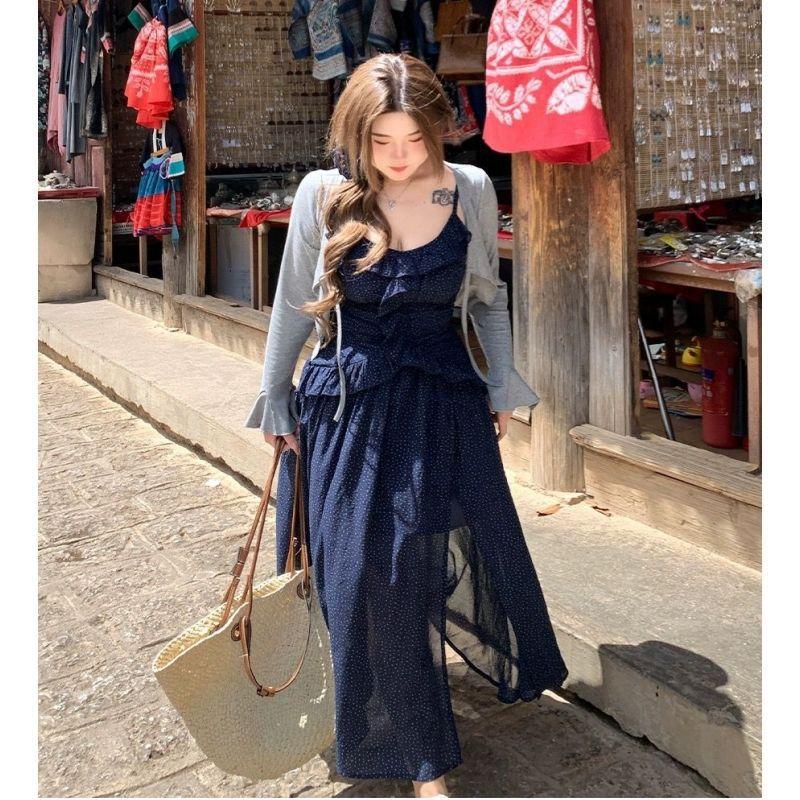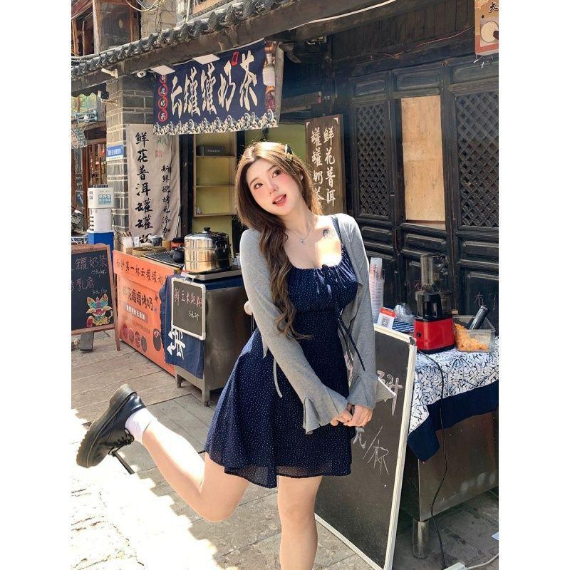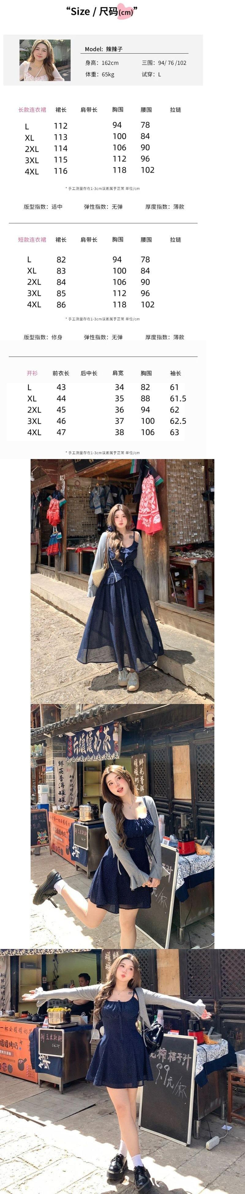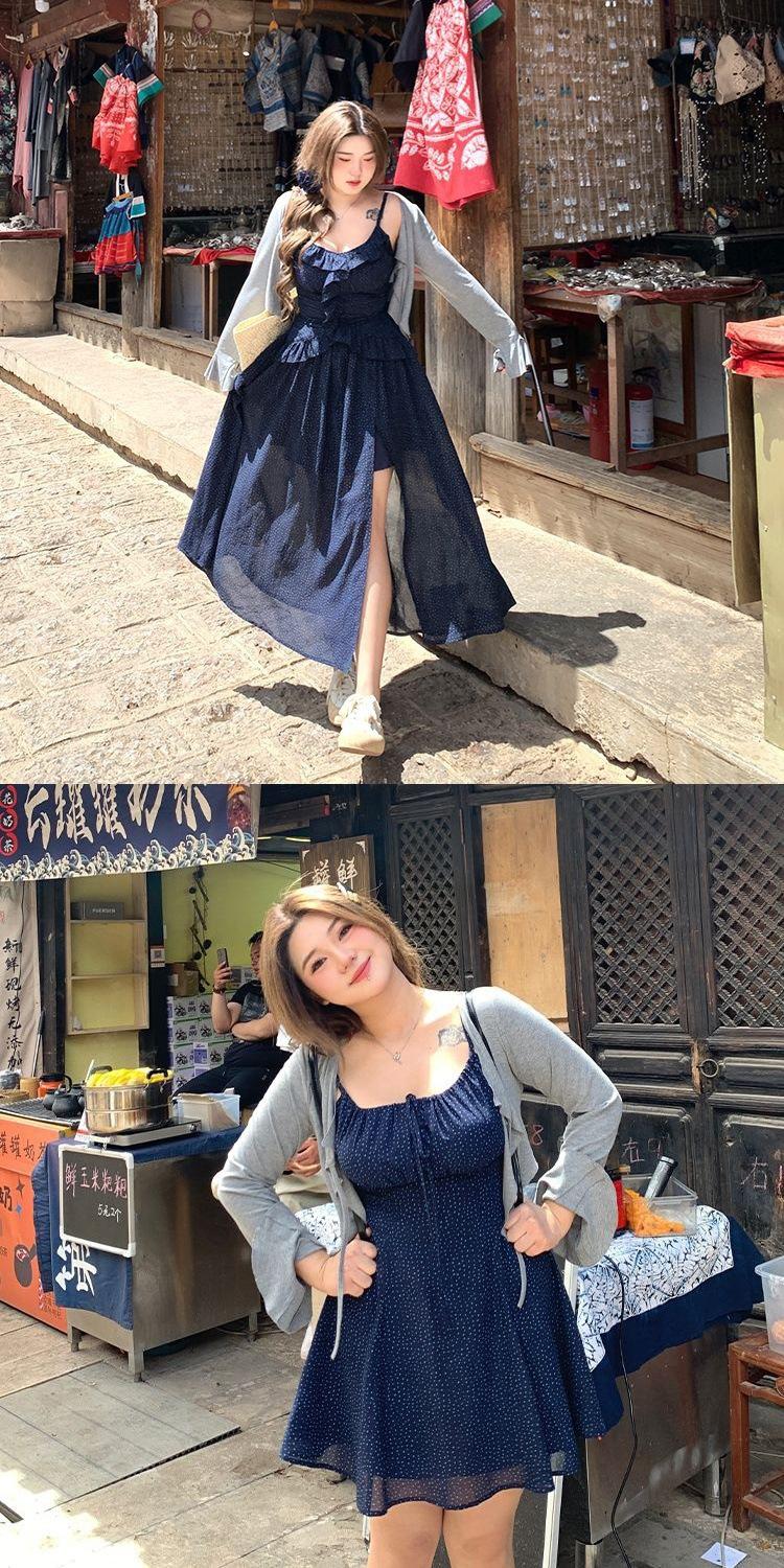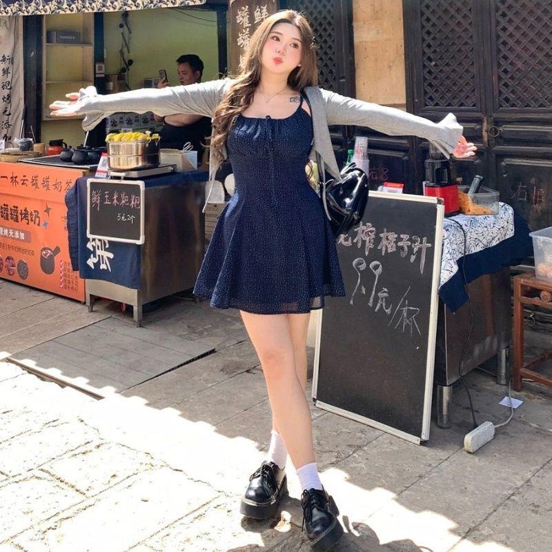 Talla Grande Ligeramente Gordita mm Cielo Estrellado Lunares Fresco Camisola Cárdigan Set Vestido Estilo Universitario Ajustado para Mujer