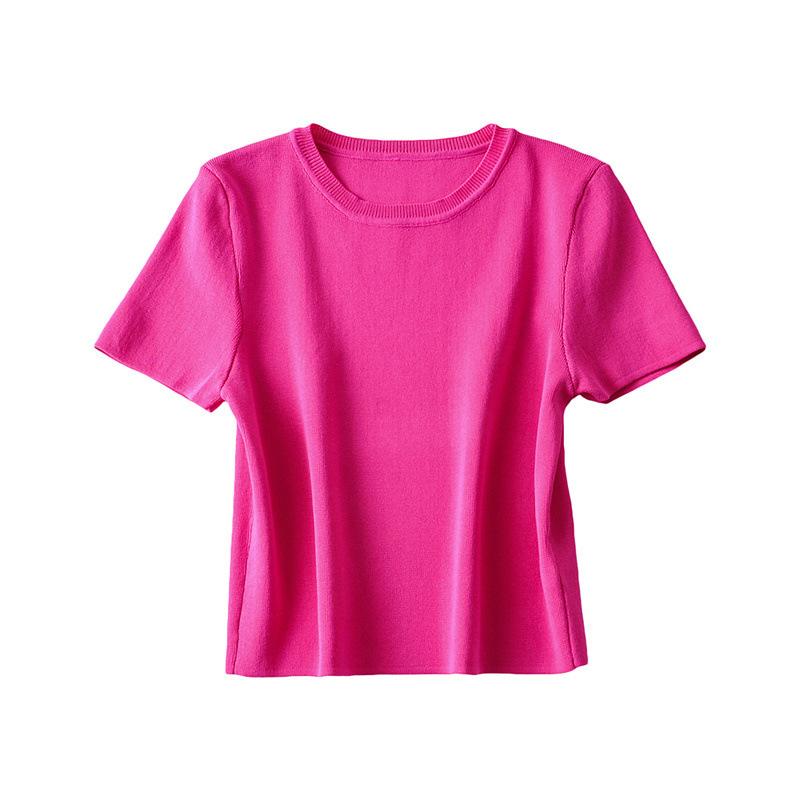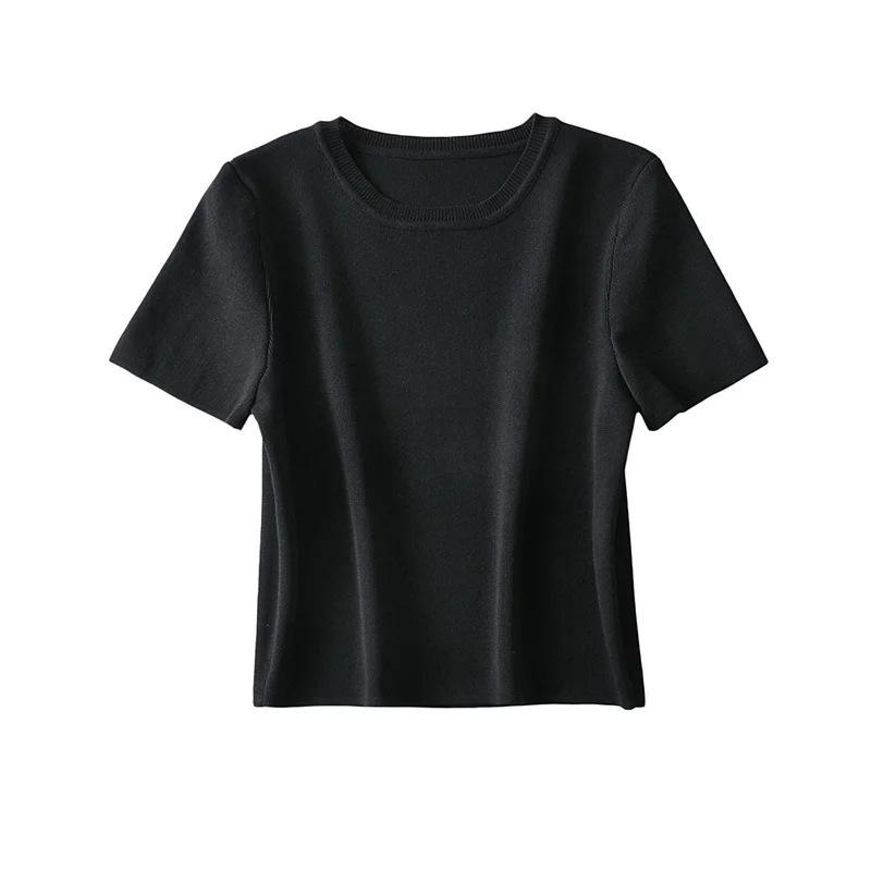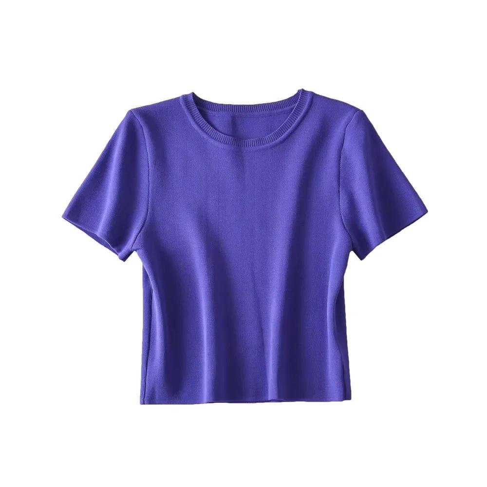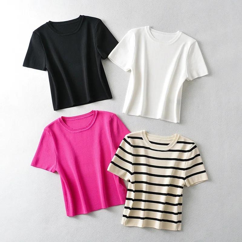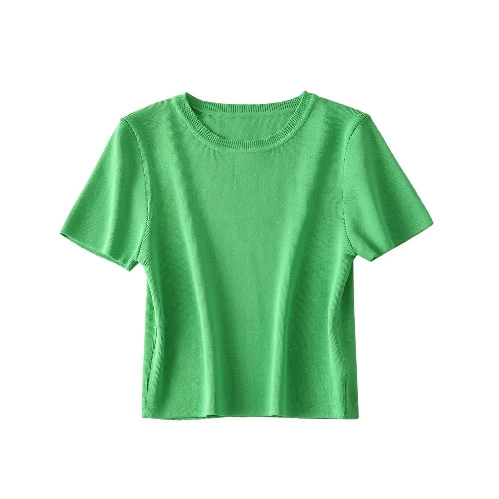 Verano 2025 para Mujer Europeo y Americano Cuello Redondo Manga Corta Slim Corto Suéter de Punto Camisetas Tops para Mujer 10 Colores