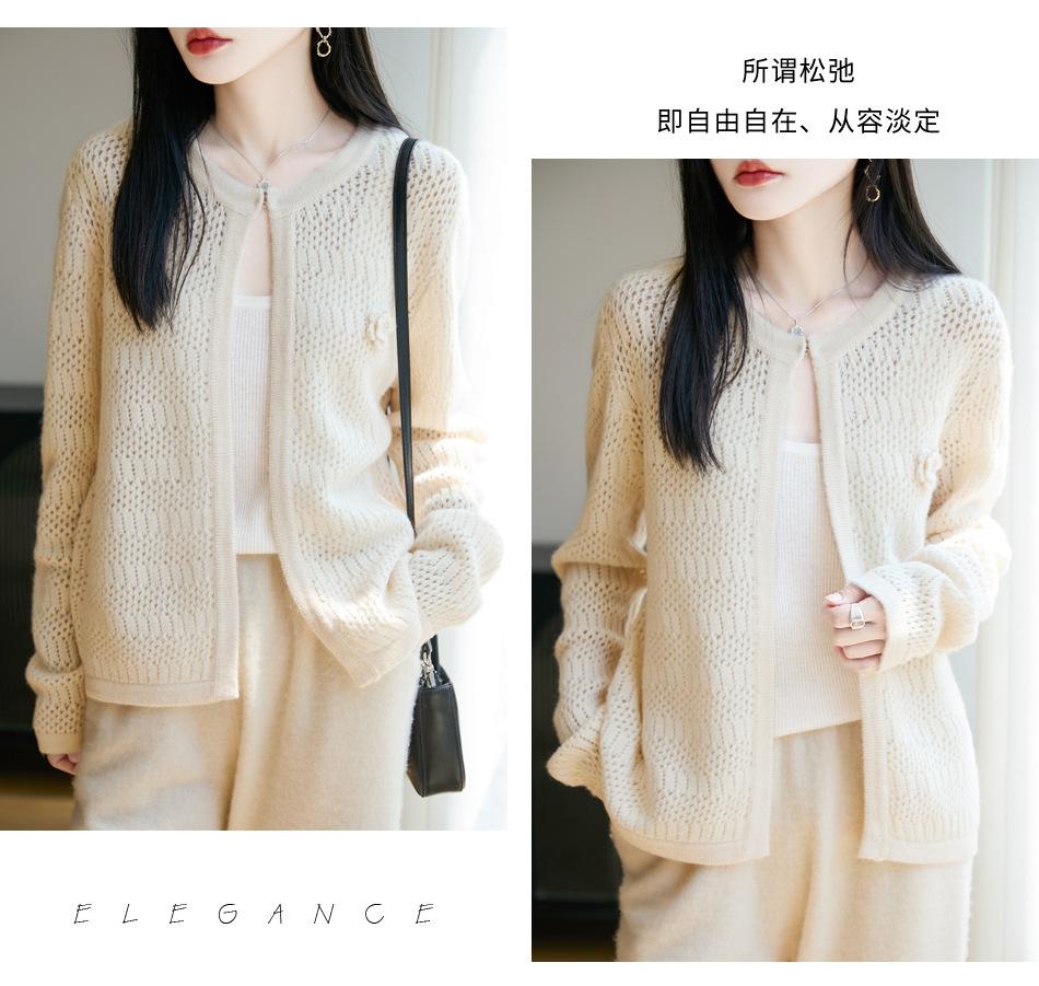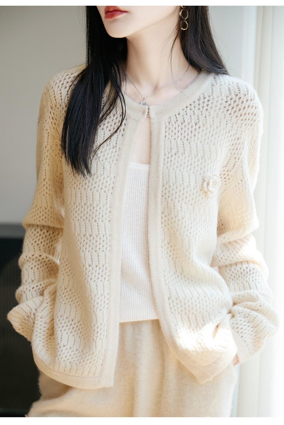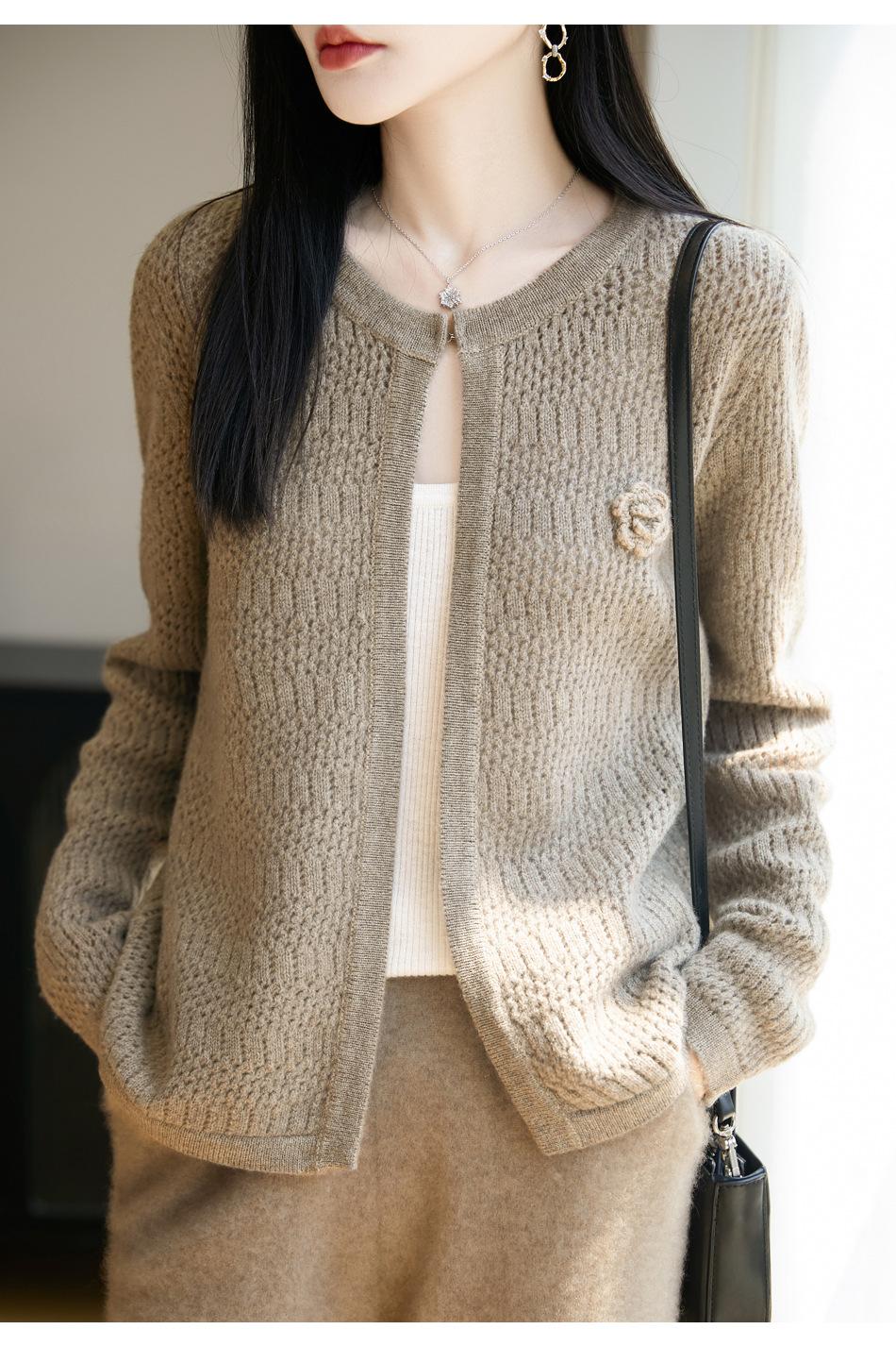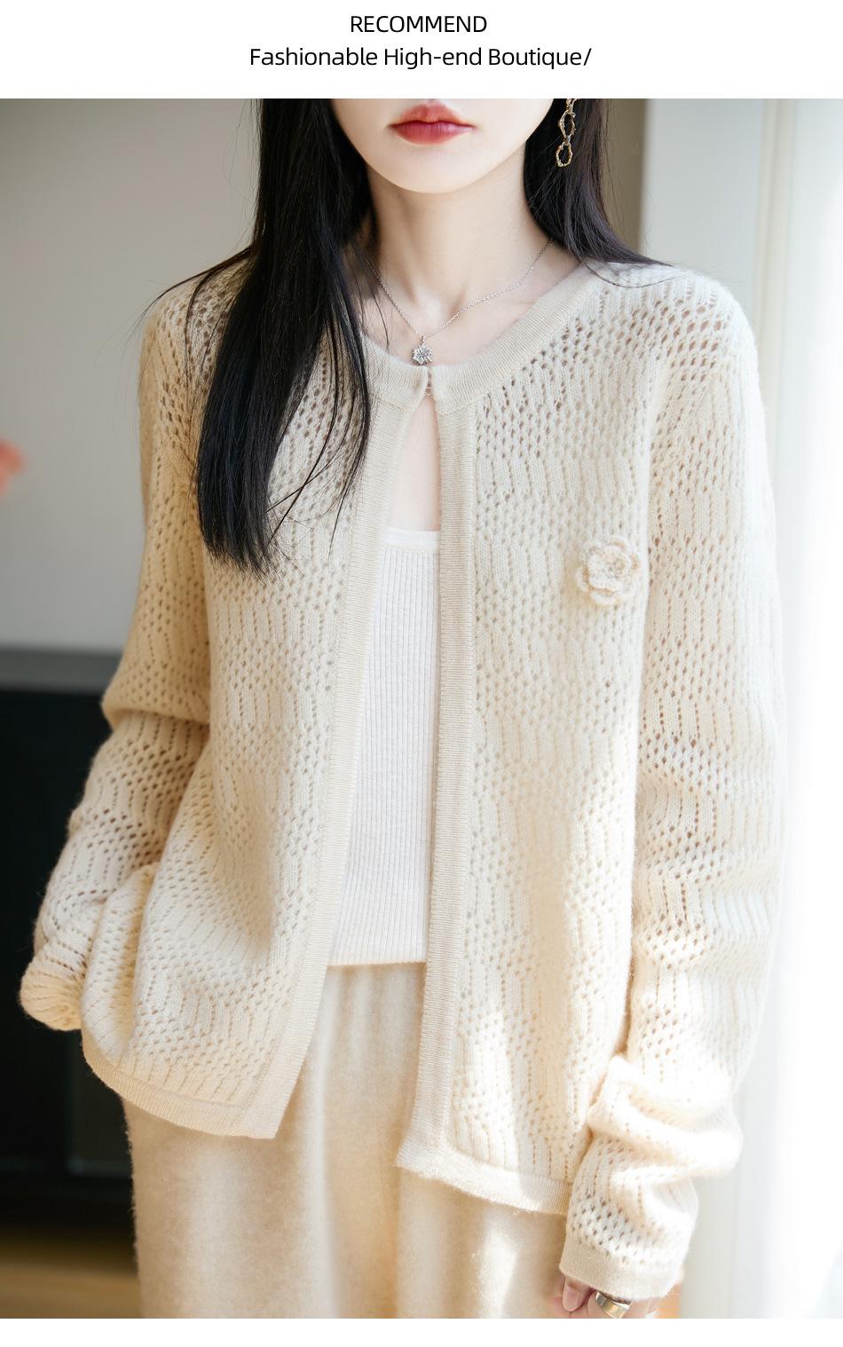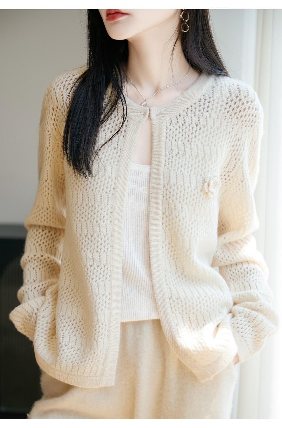 Cárdigan de Punto de Lana Pura Estilo Nuevo 2025 para Mujer Cuello Redondo Calado Flores Bordadas Sin Botones Manga Larga Suelta Abrigo Base
