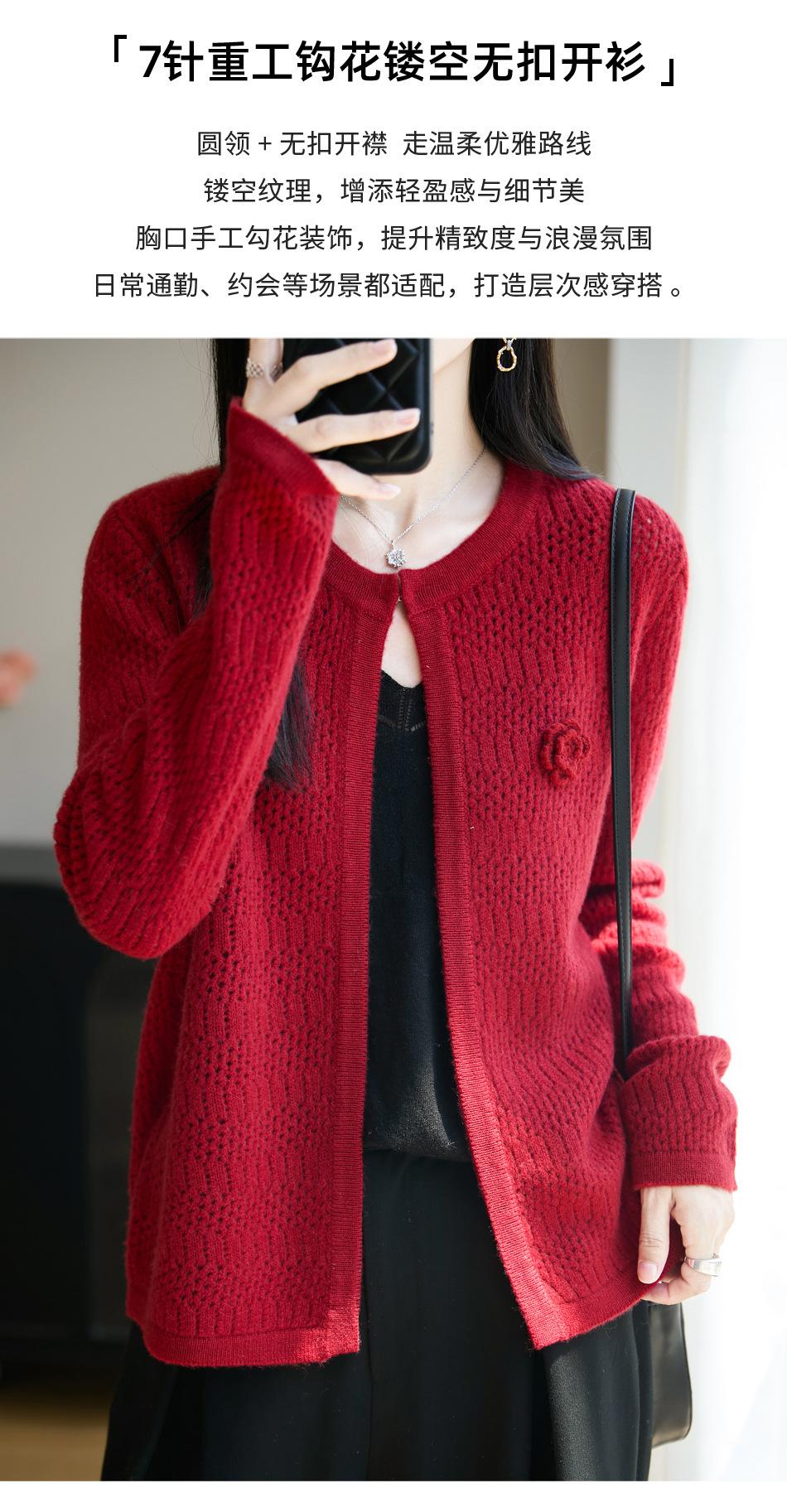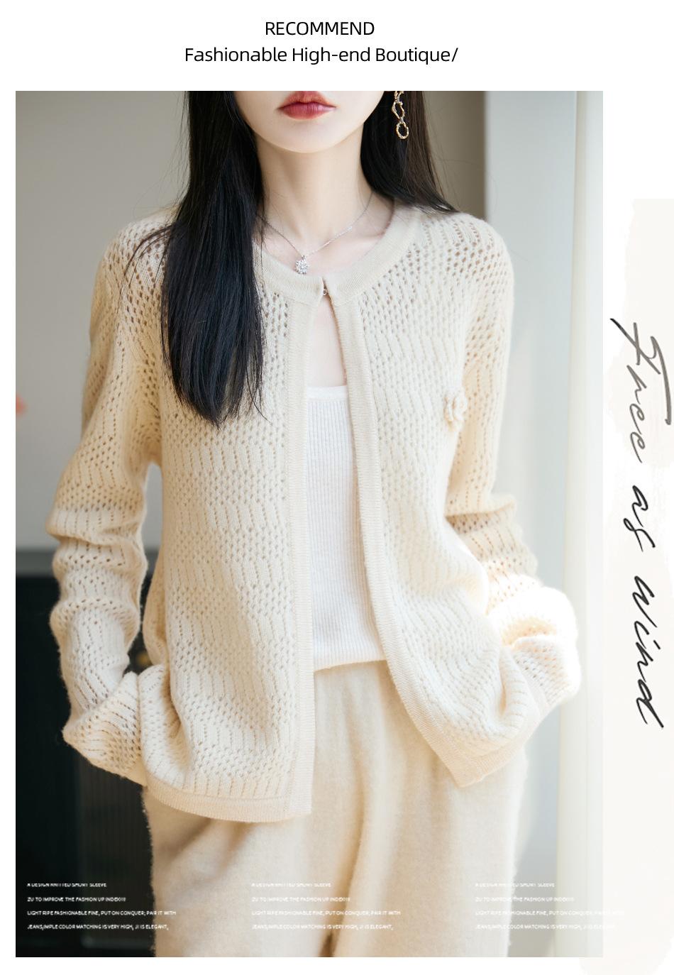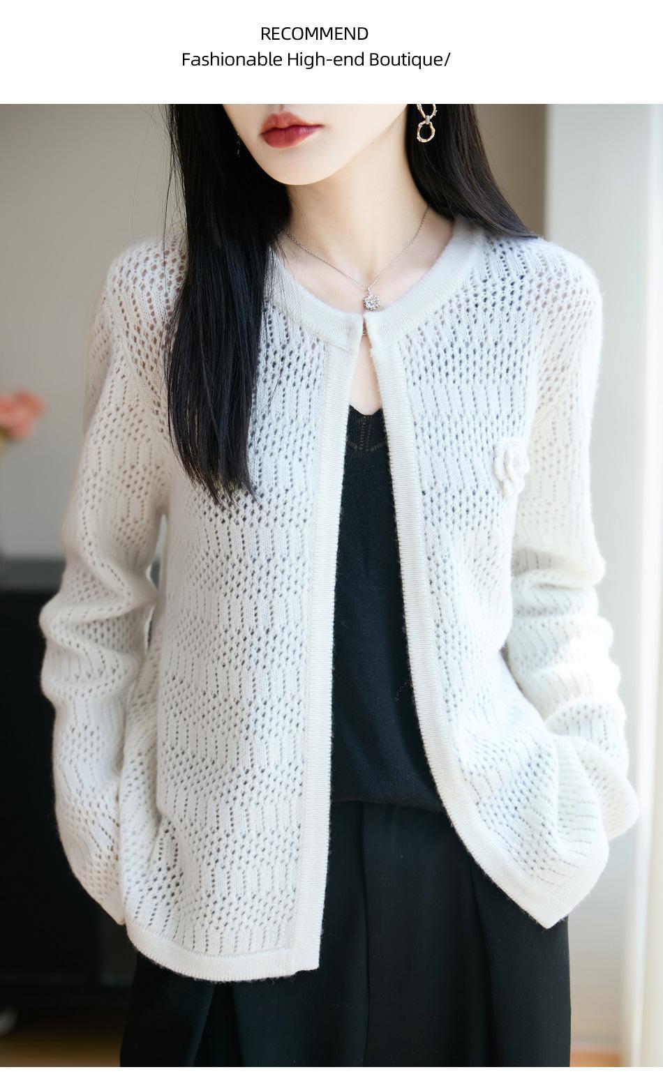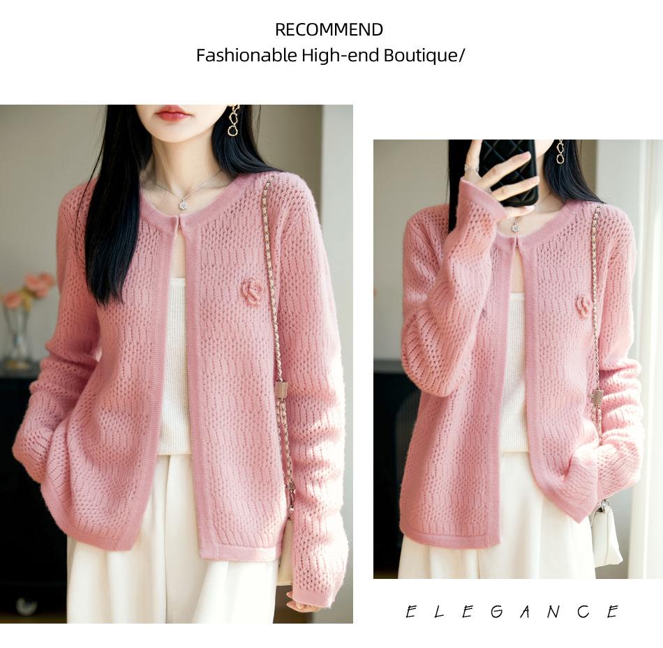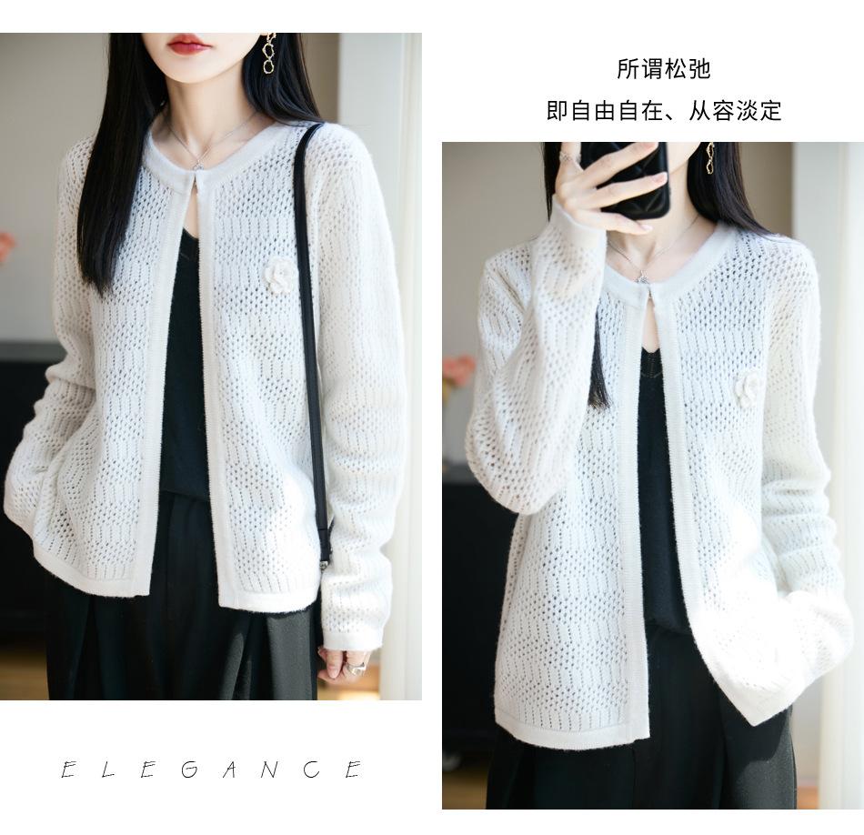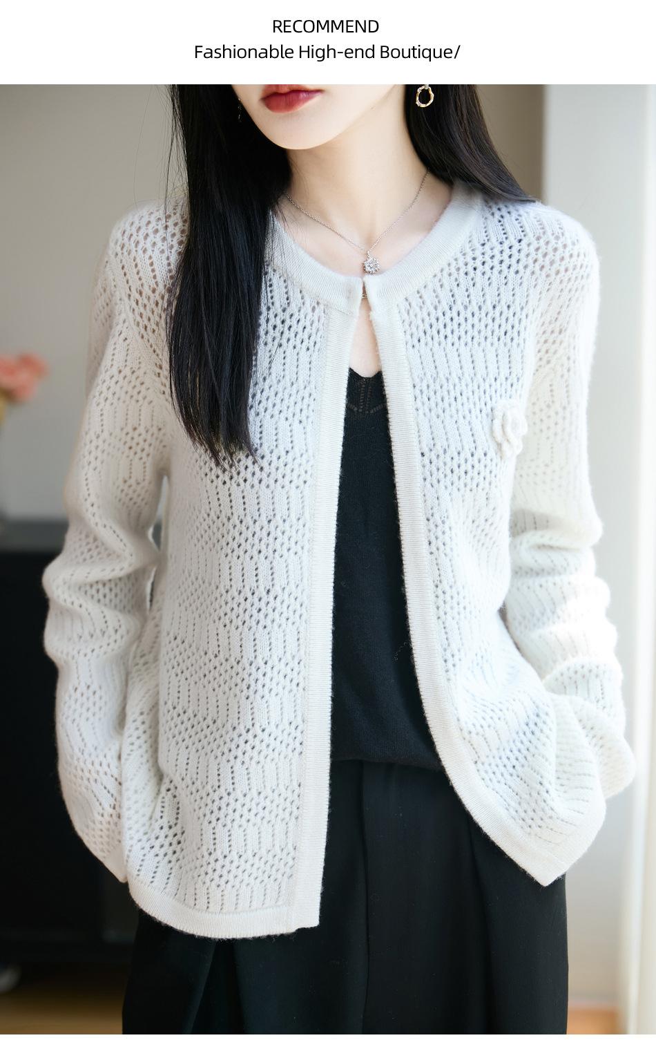 Cárdigan de Punto de Lana Pura Estilo Nuevo 2025 para Mujer Cuello Redondo Calado Flores Bordadas Sin Botones Manga Larga Suelta Abrigo Base
