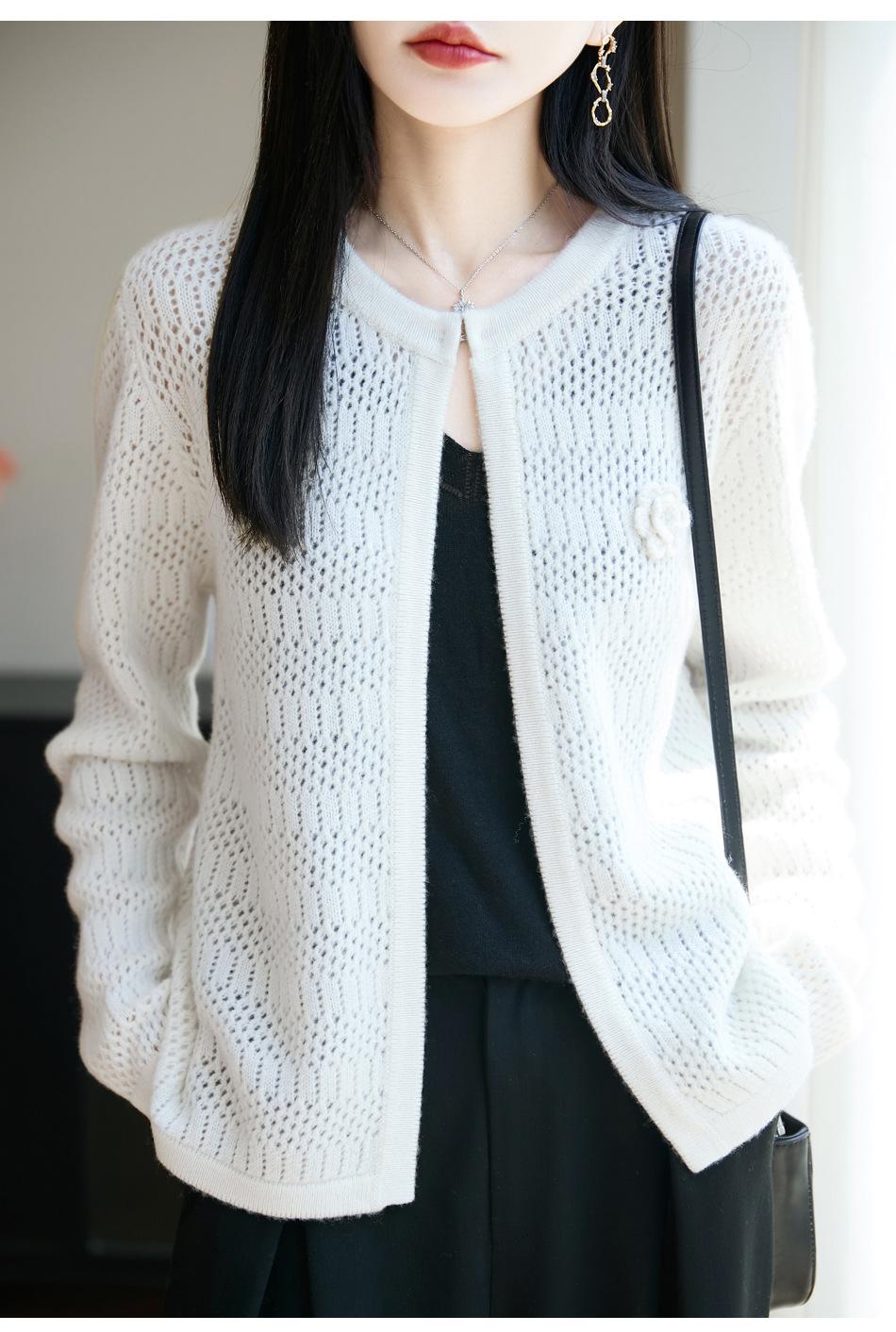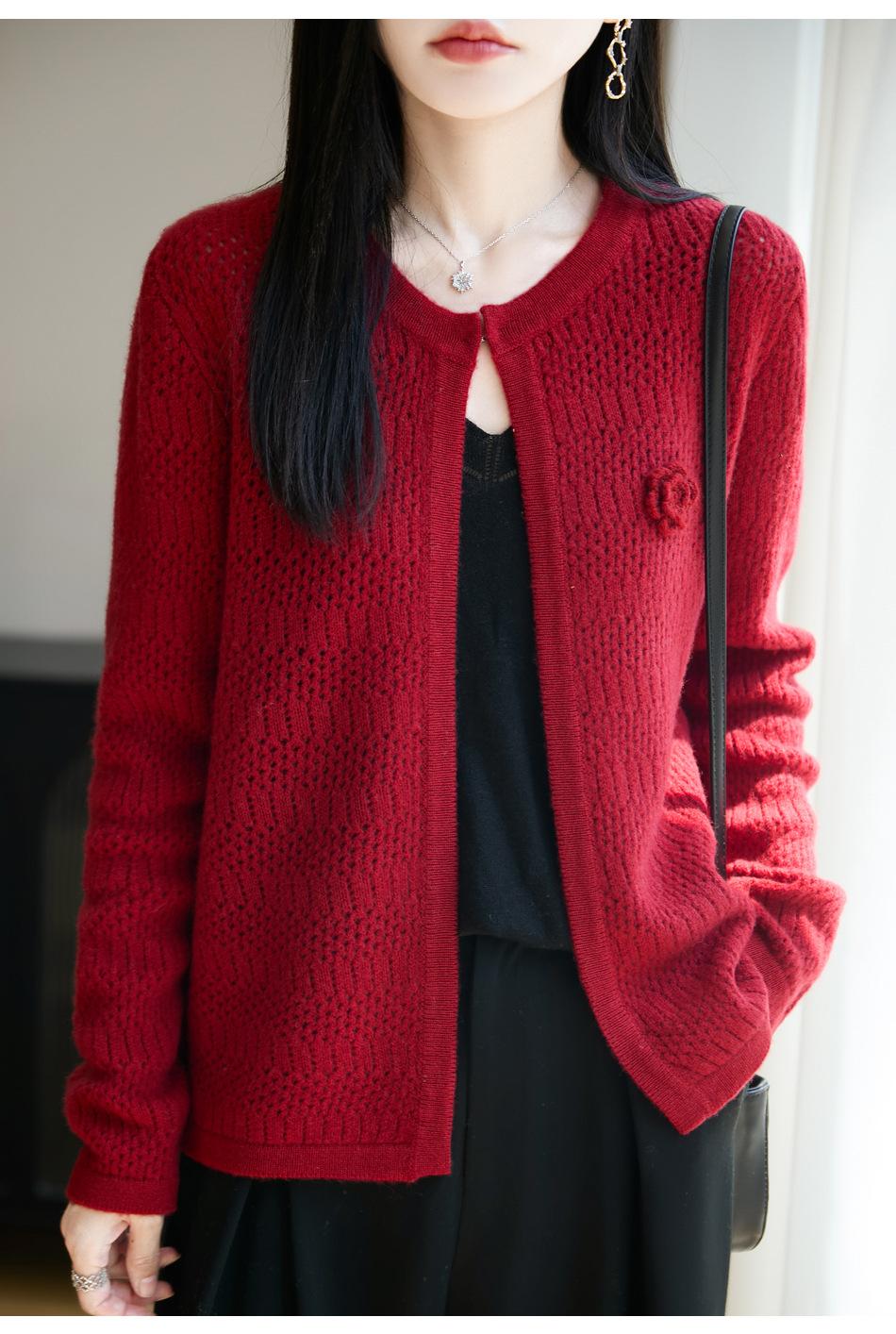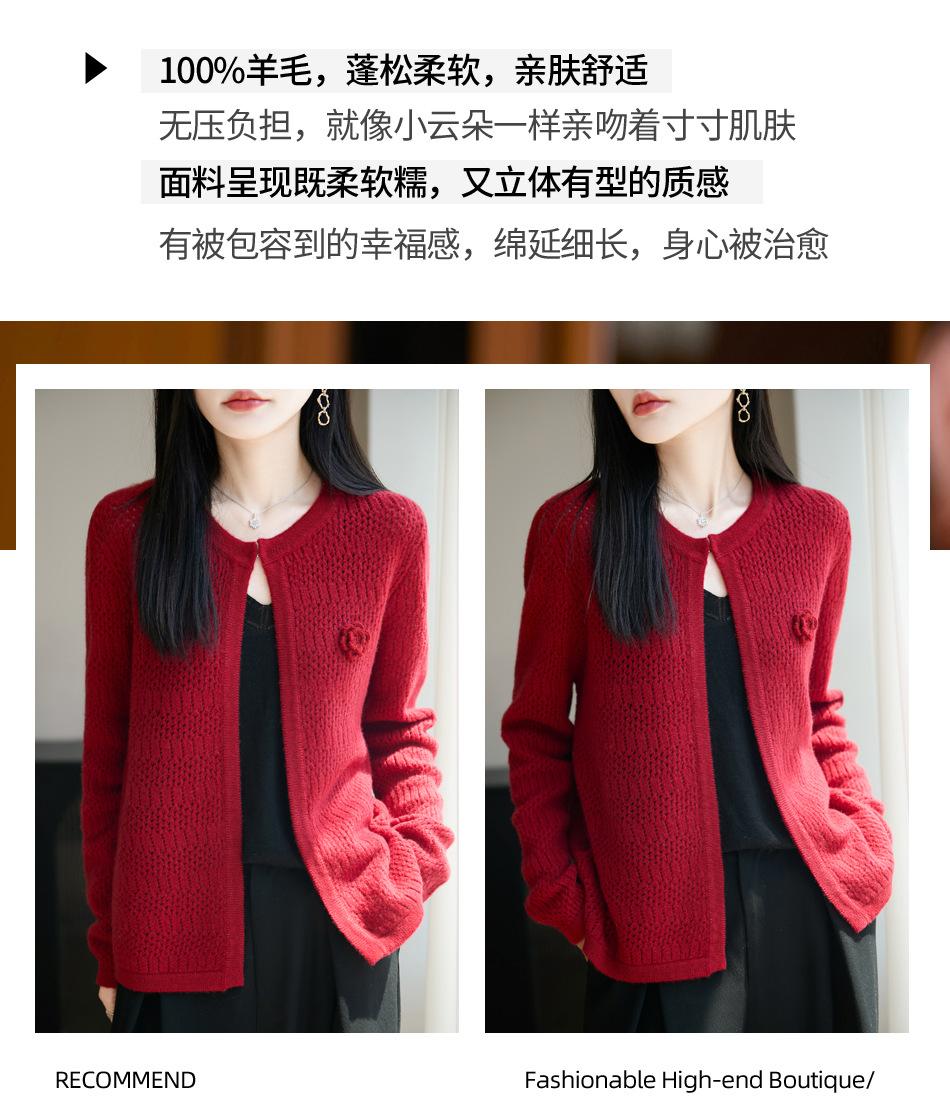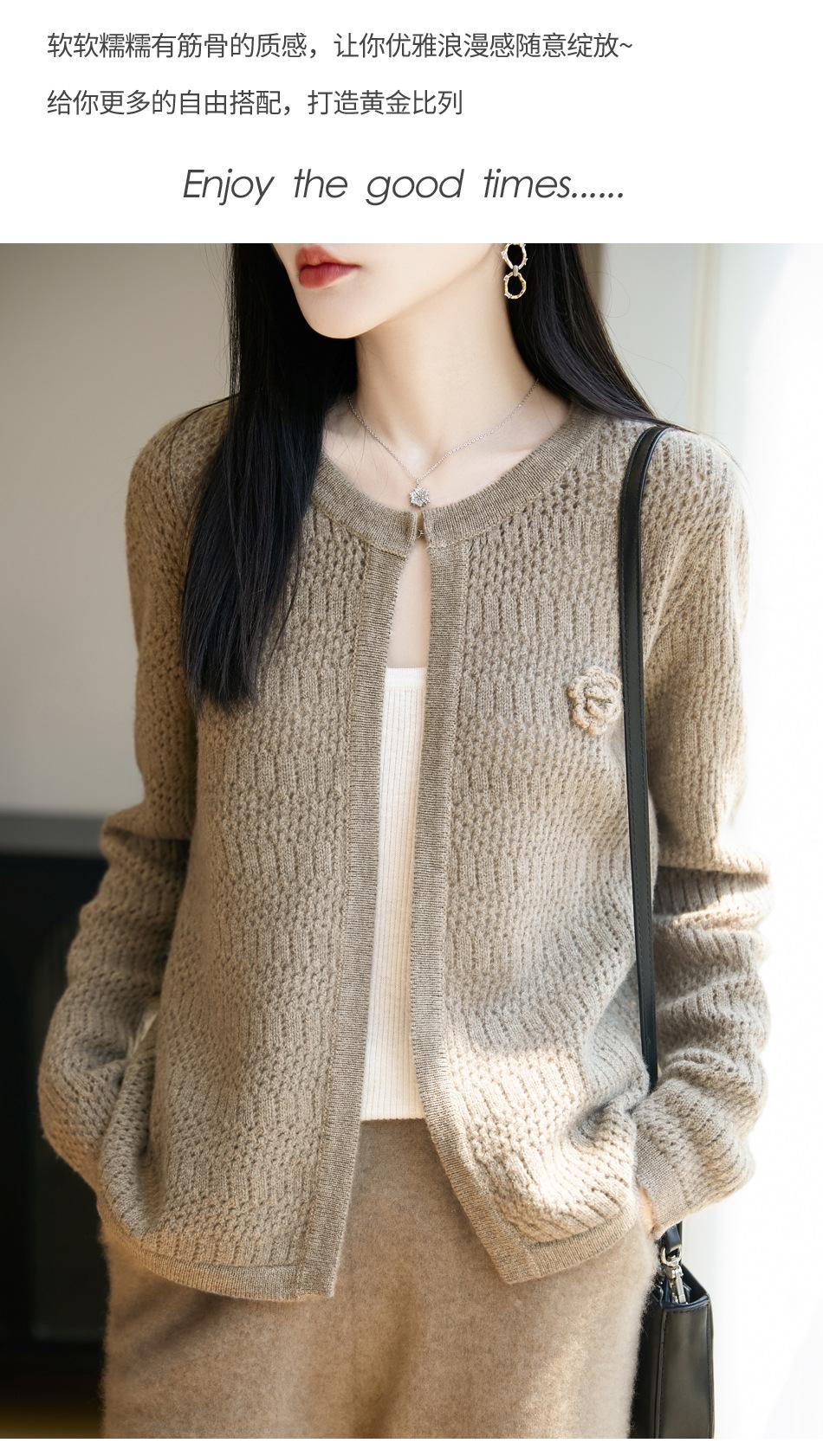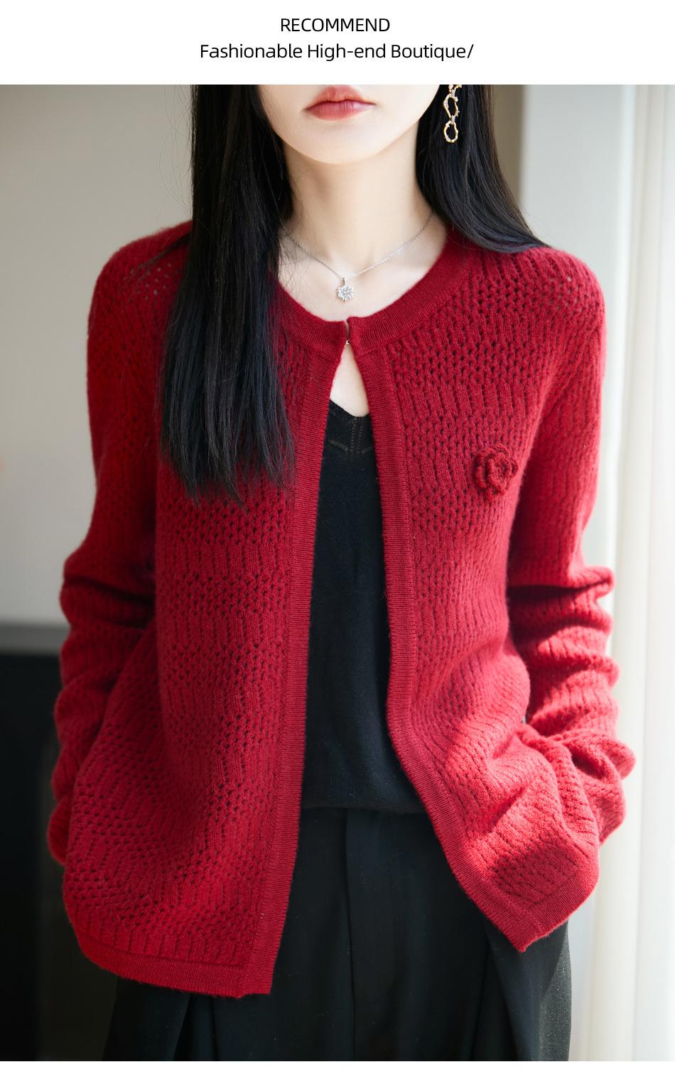 Cárdigan de Punto de Lana Pura Estilo Nuevo 2025 para Mujer Cuello Redondo Calado Flores Bordadas Sin Botones Manga Larga Suelta Abrigo Base