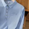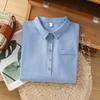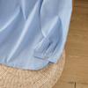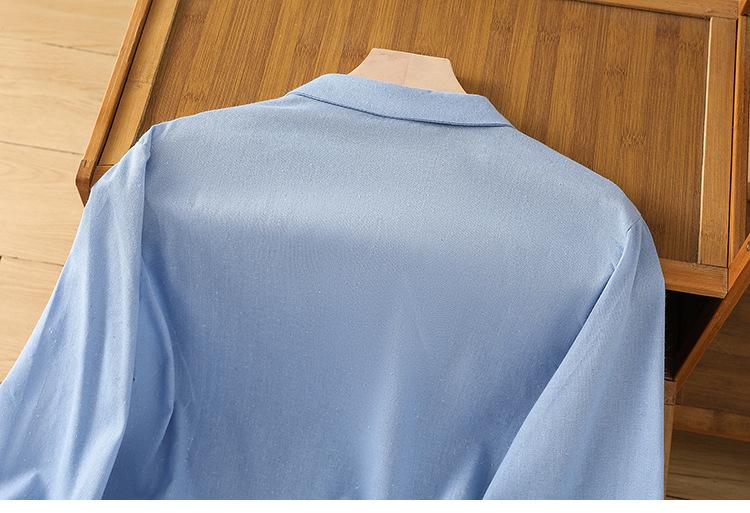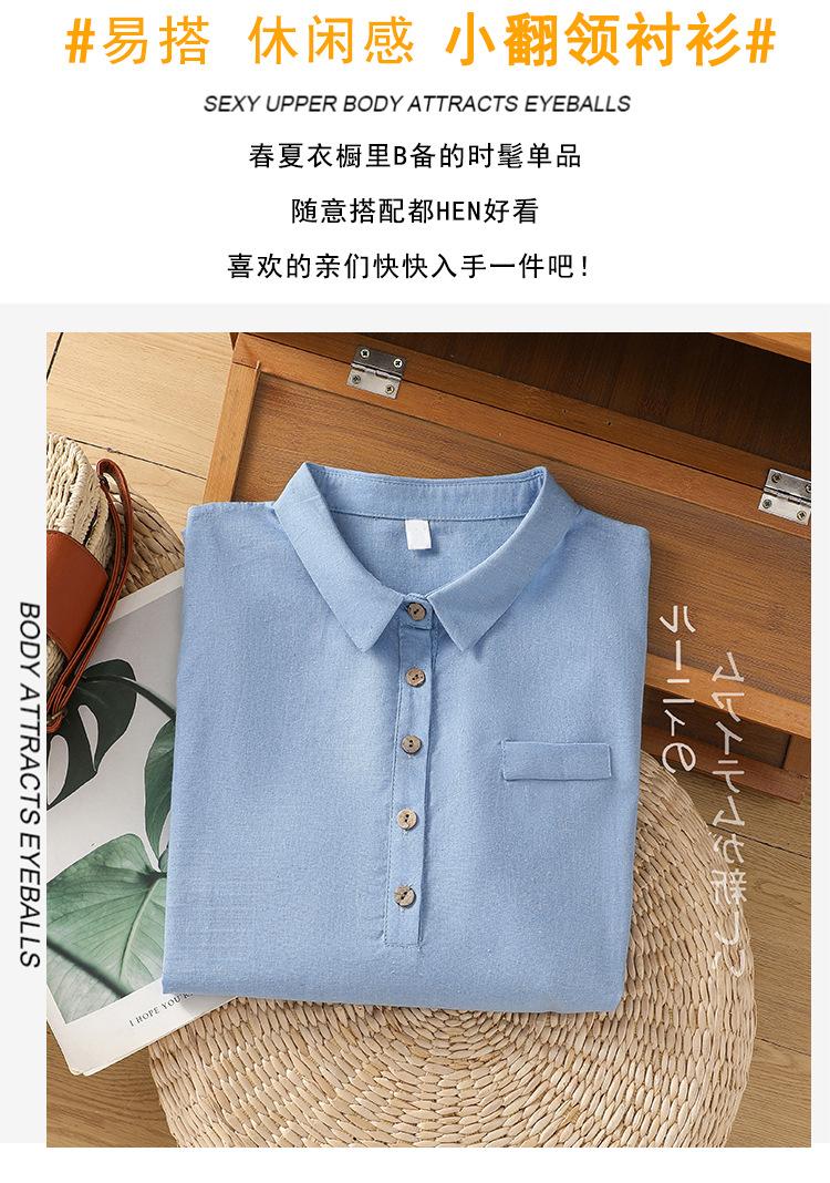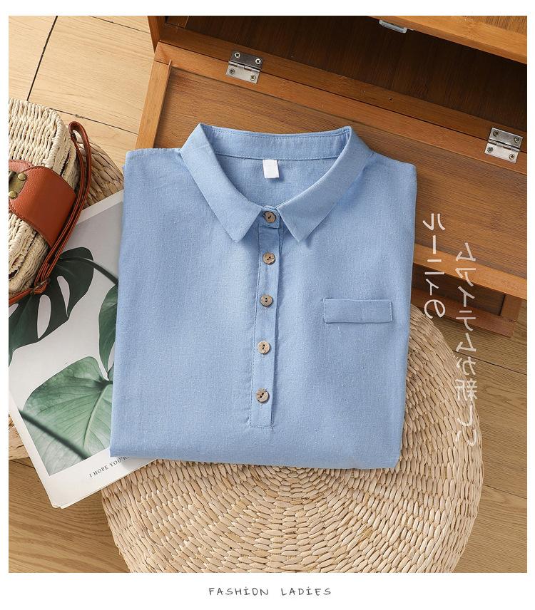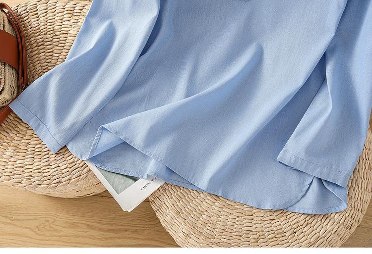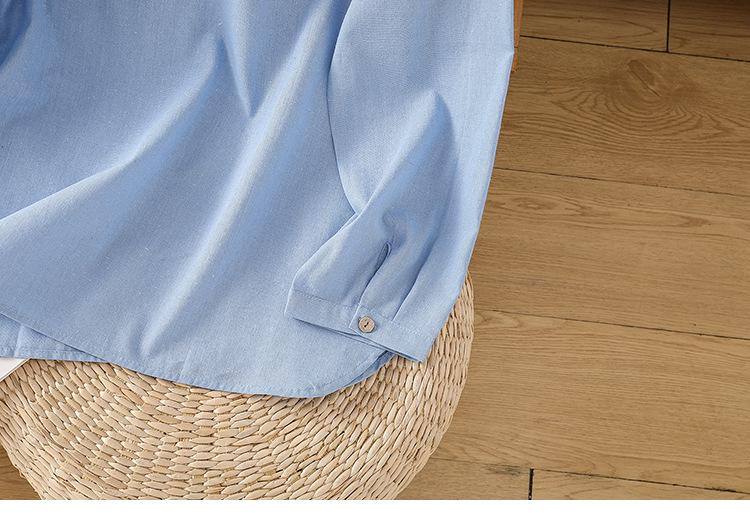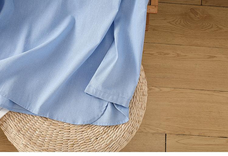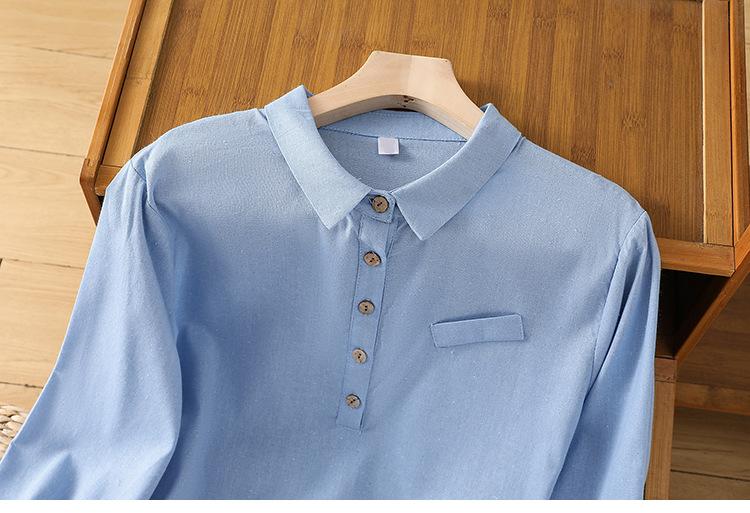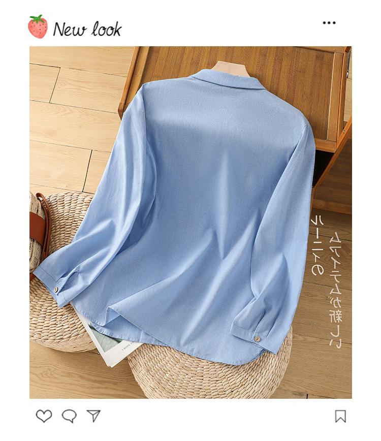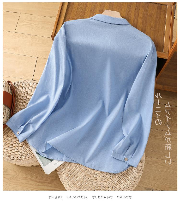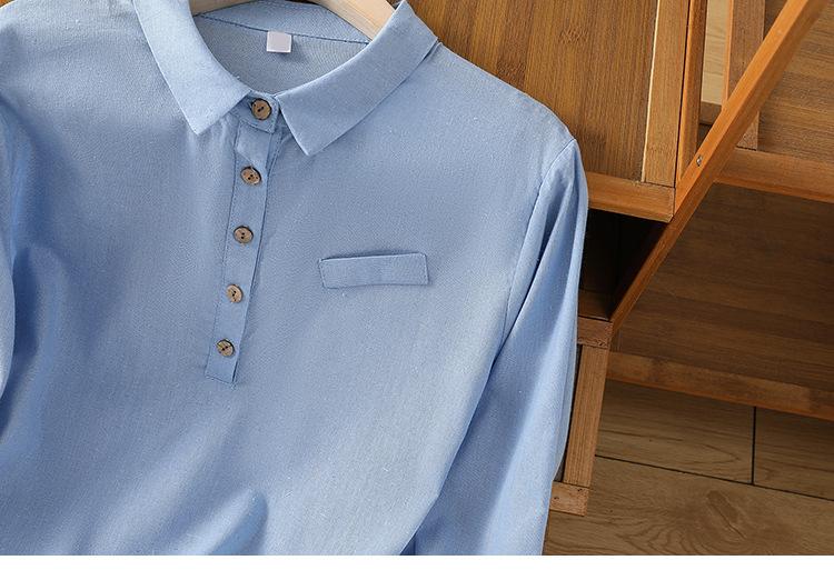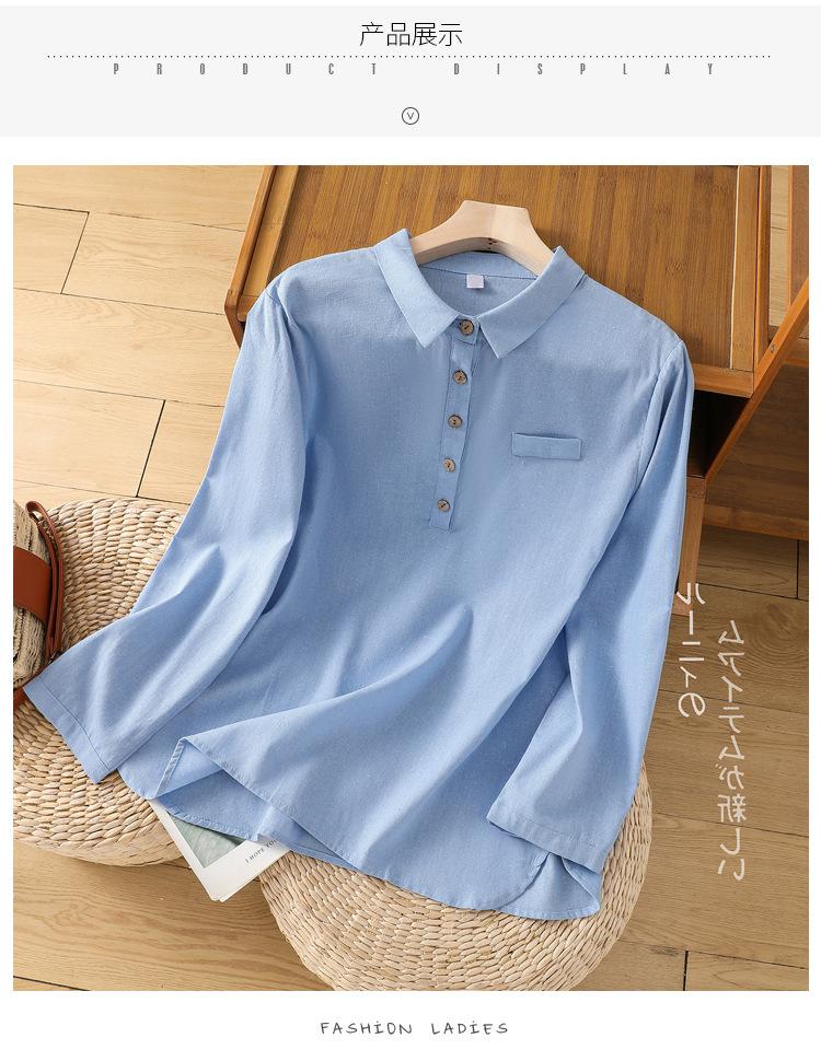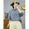 En stock 2025 nueva blusa de manga larga azul de cuadros finos cuello vuelto versátil reductora de edad camisa de algodón y lino
